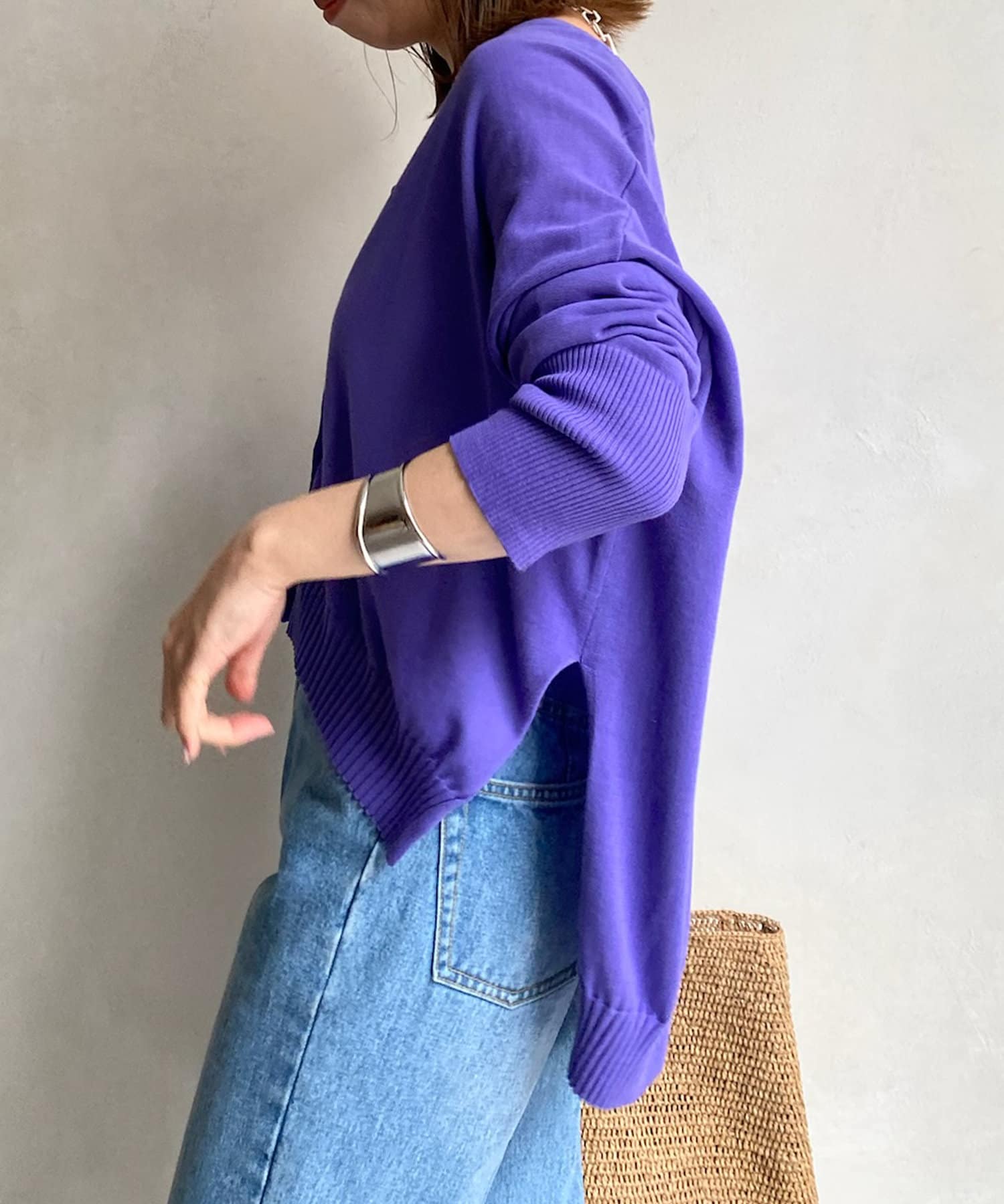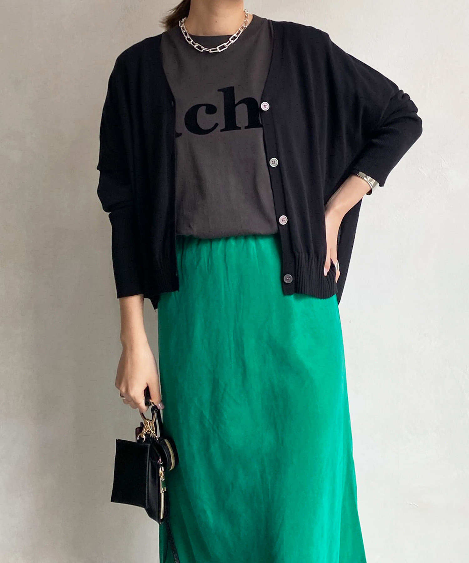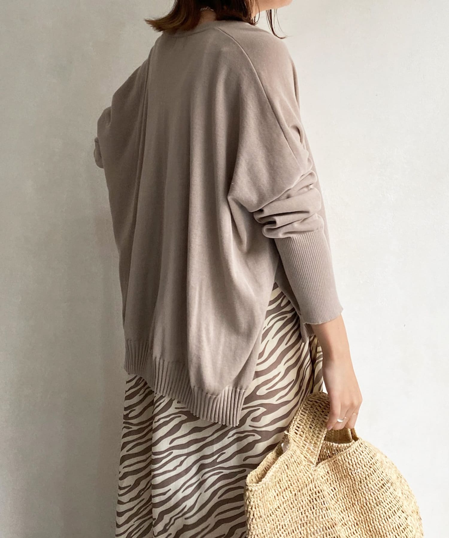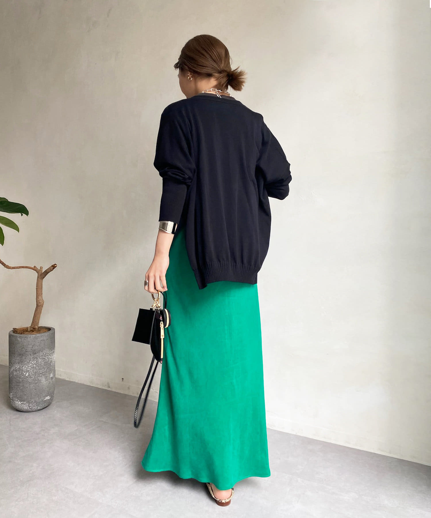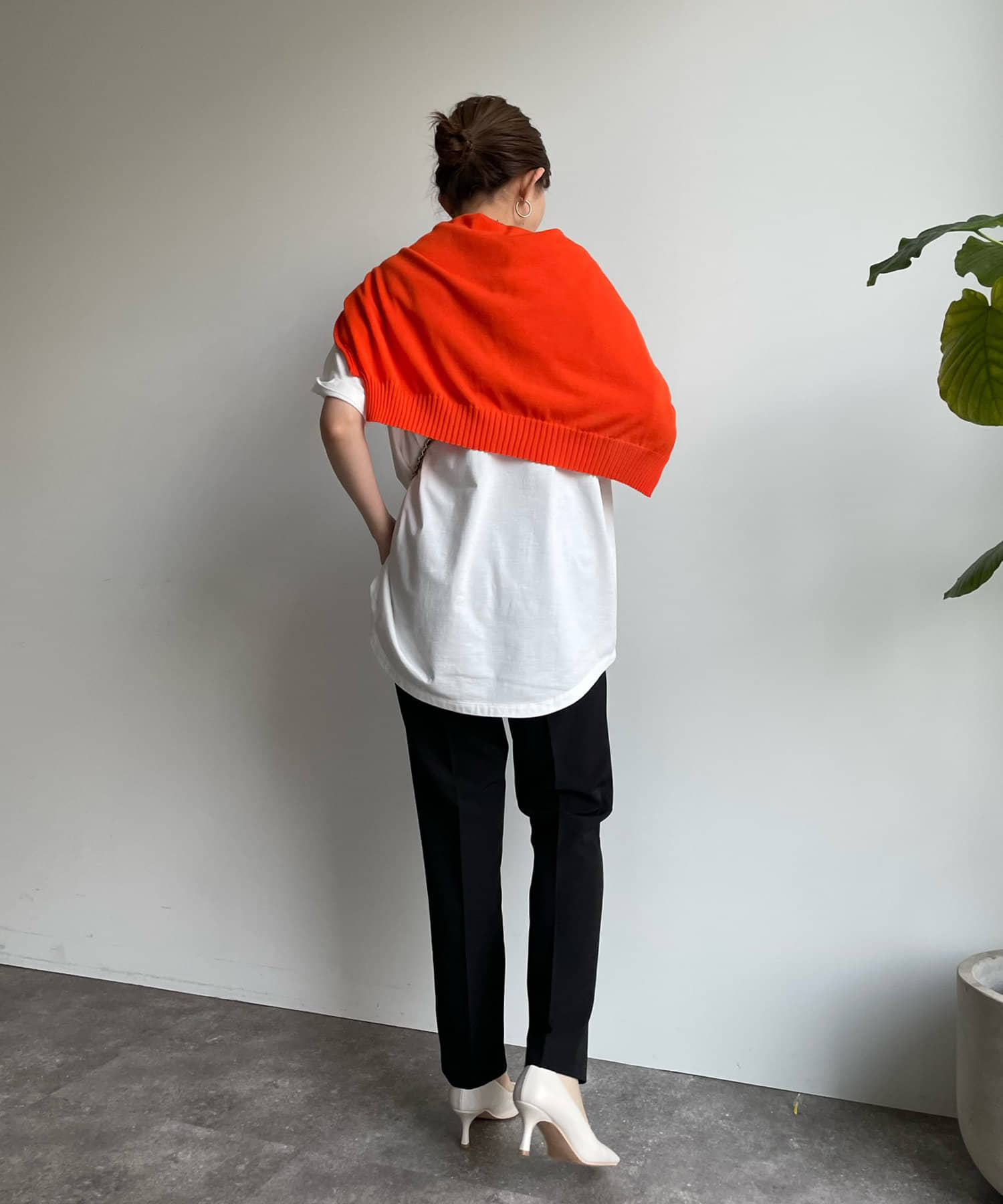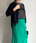 サイドにはざっくりとスリットを入れ、前後差のある丈感に。抜け感たっぷりの印象を与えます。