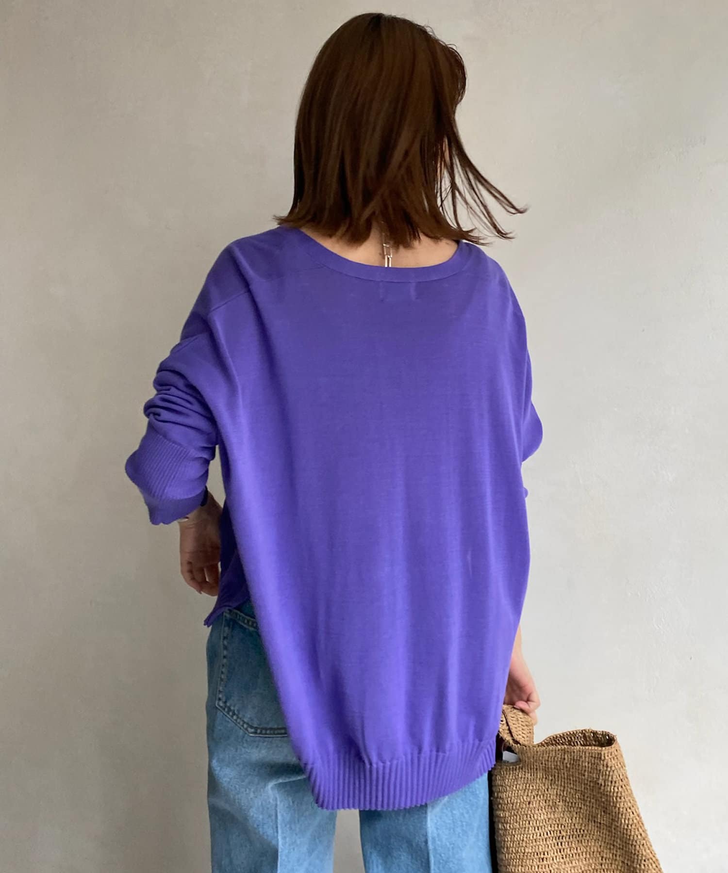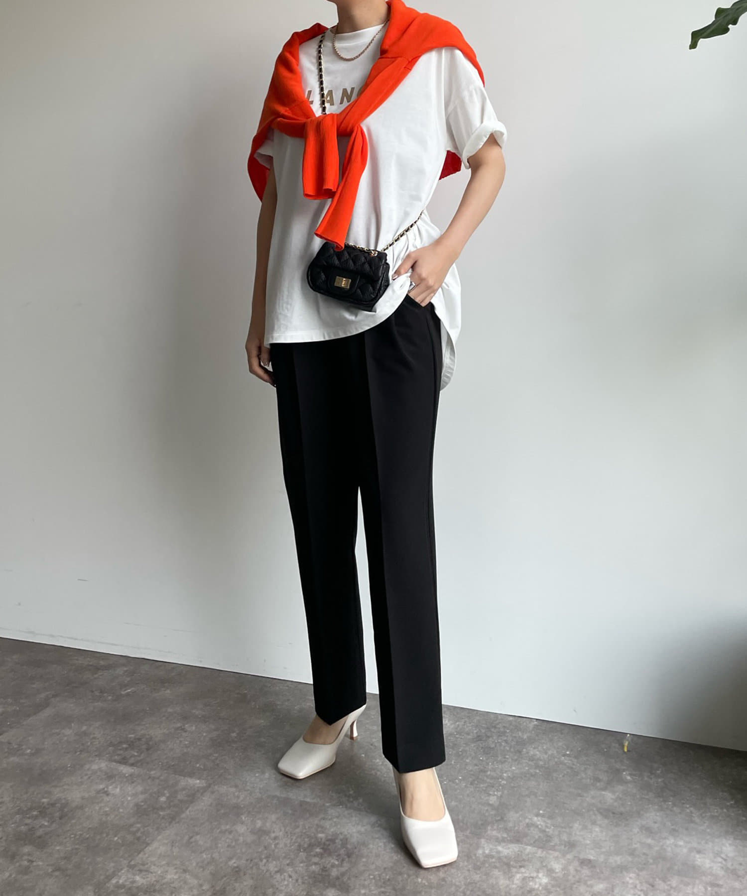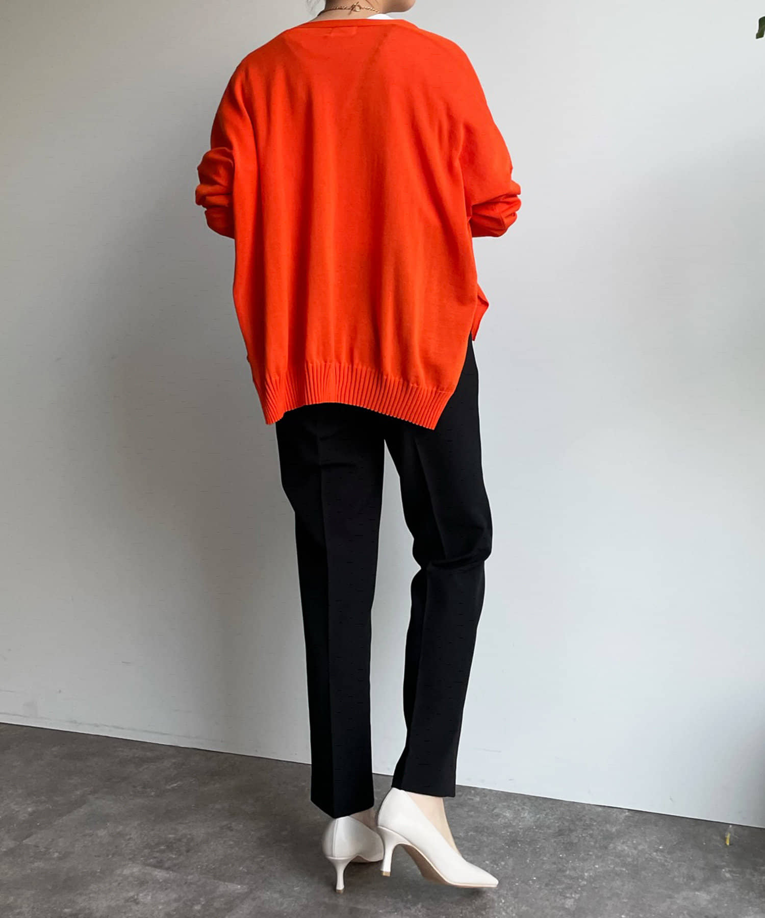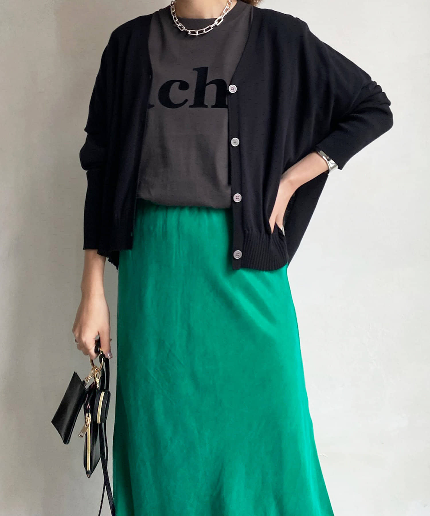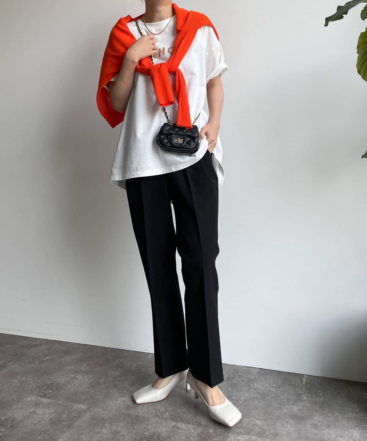 サイドにはざっくりとスリットを入れ、前後差のある丈感に。抜け感たっぷりの印象を与えます。