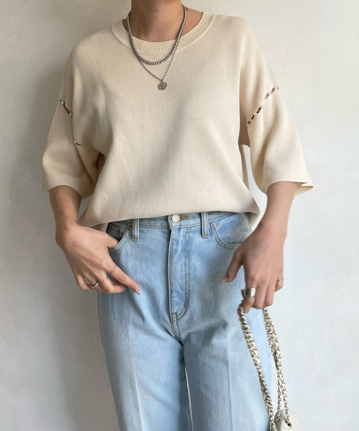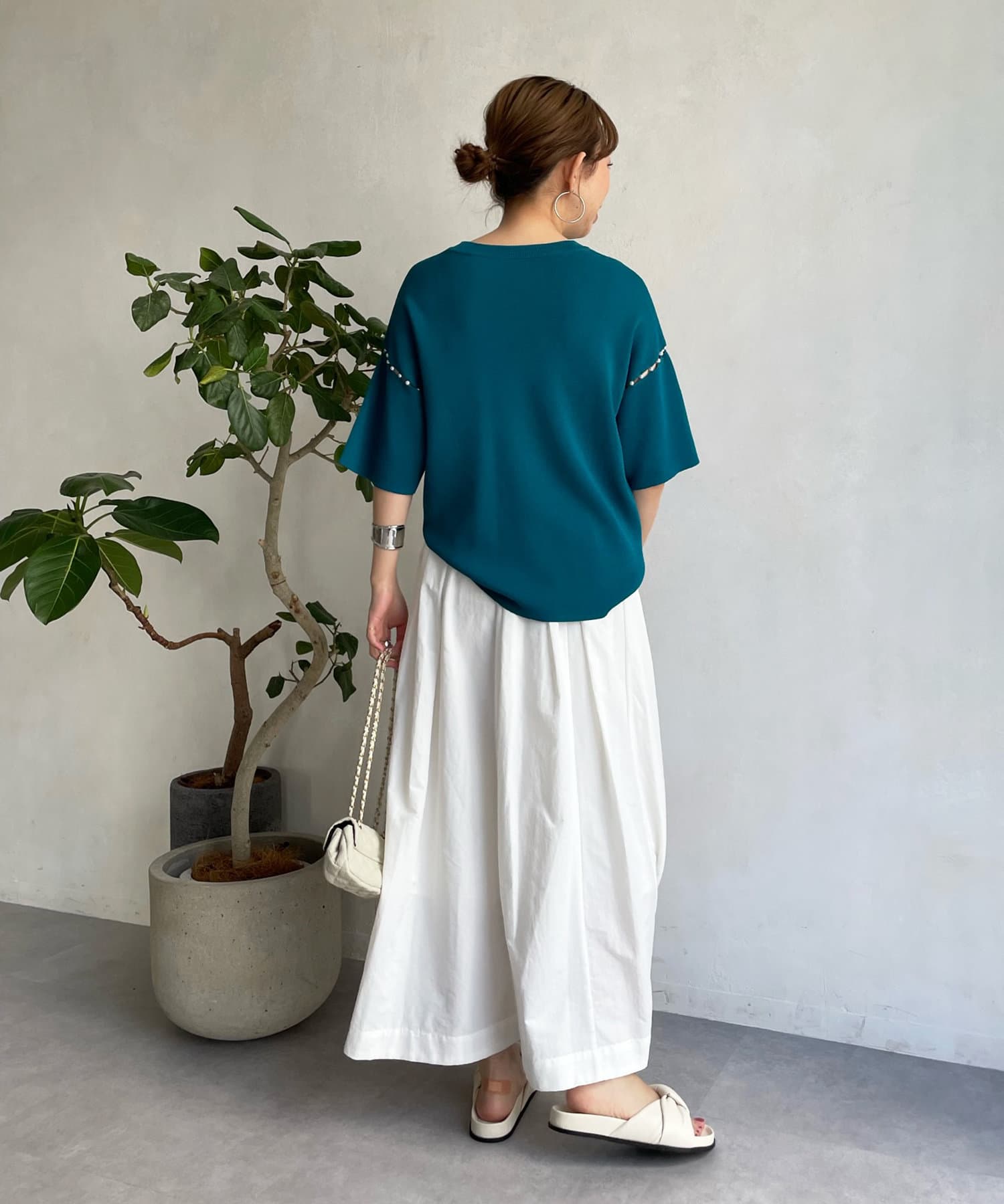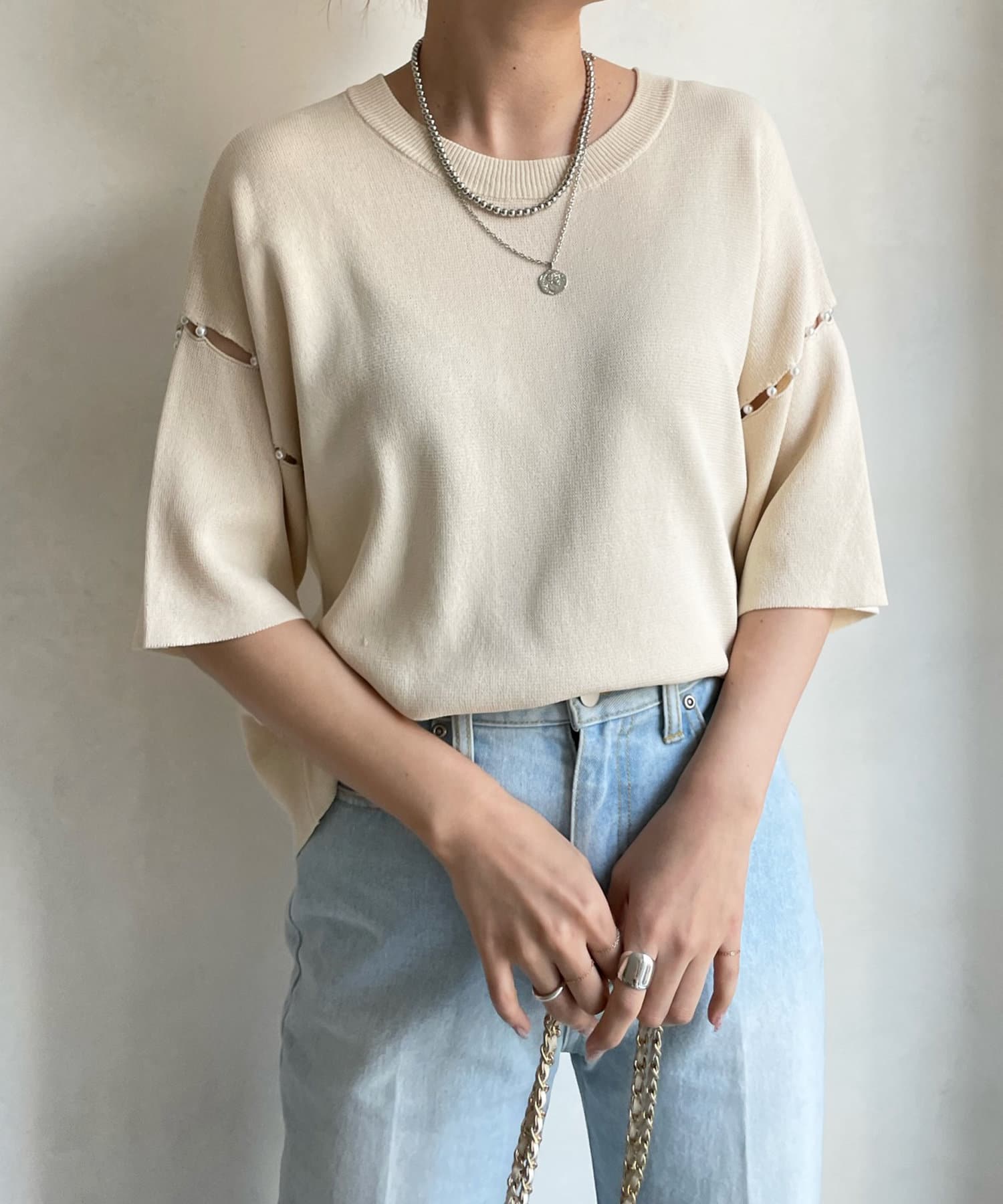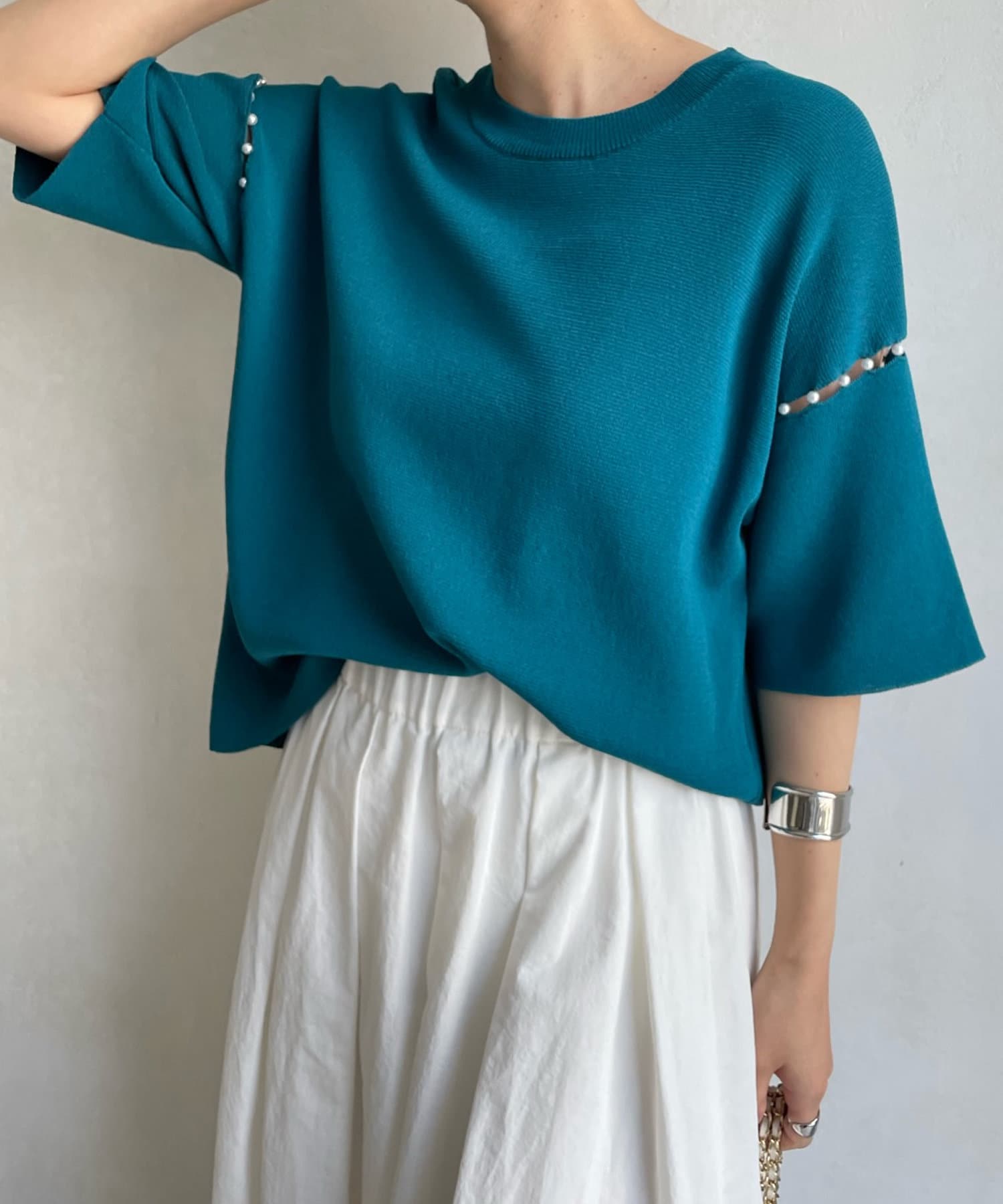 最大のポイントはお袖に。さり気ない肌見せ+トレンドのパールパーツが今らしい印象をぐっとアップさせてくれます。