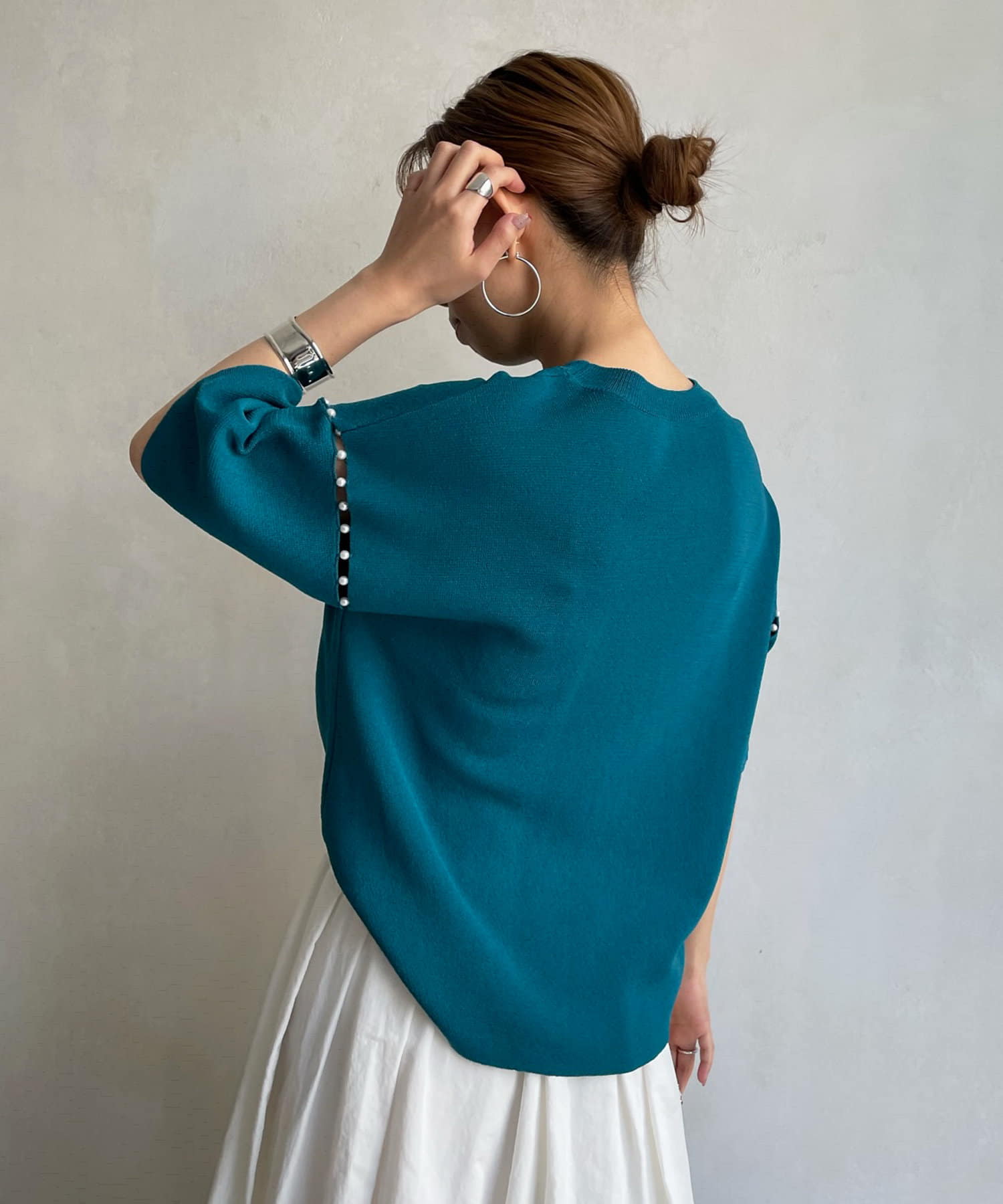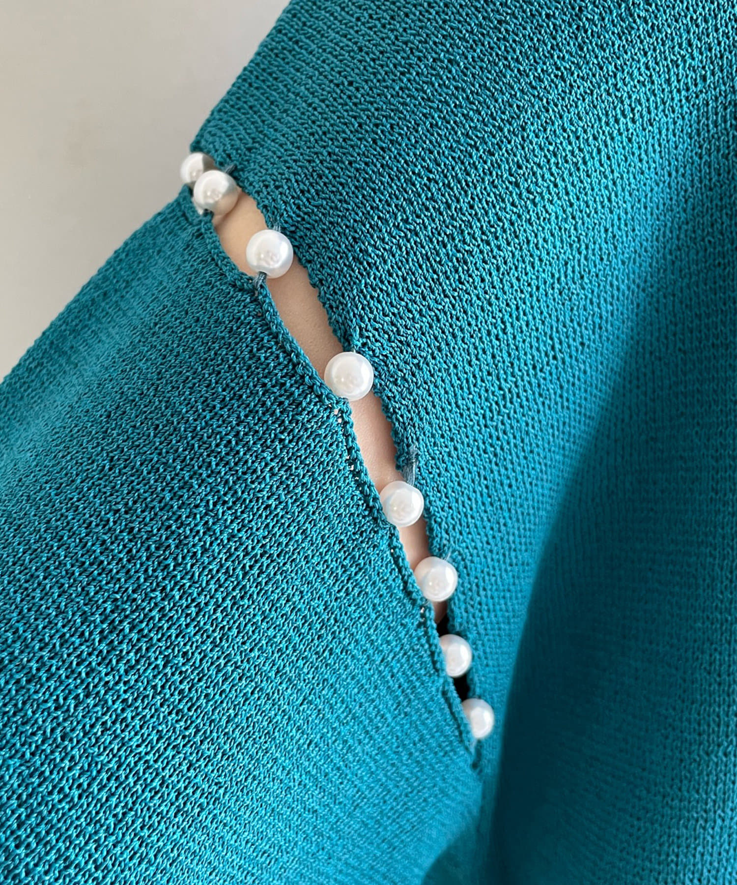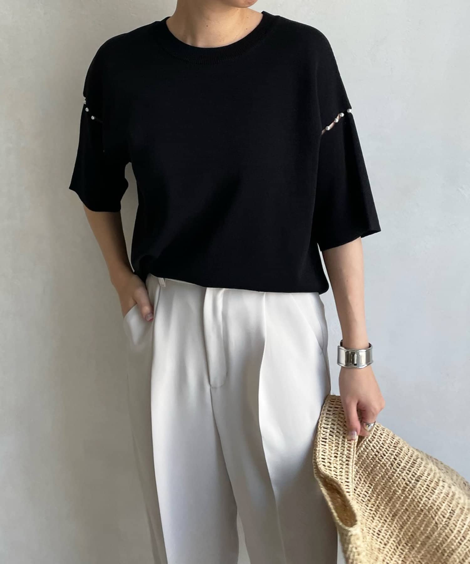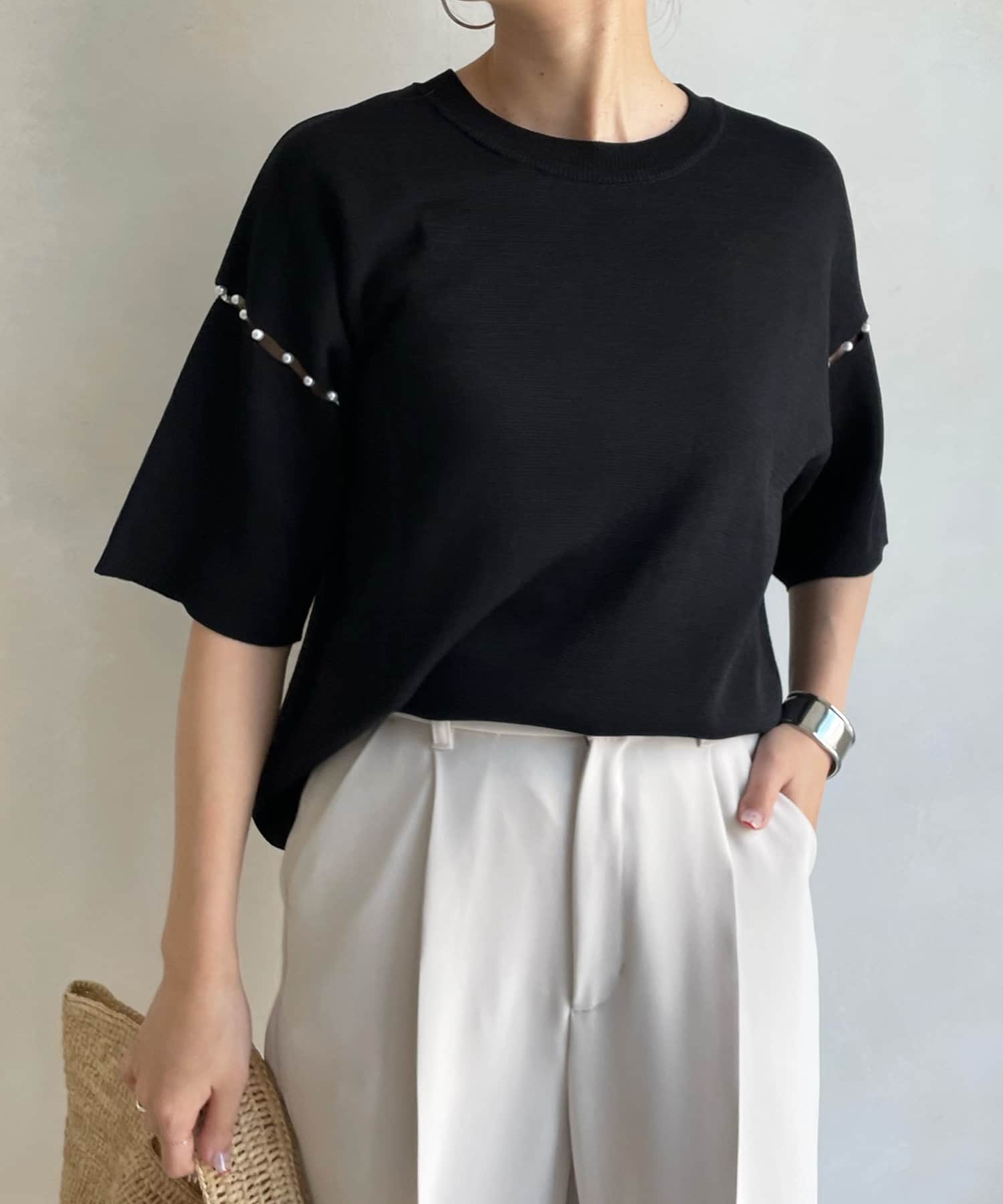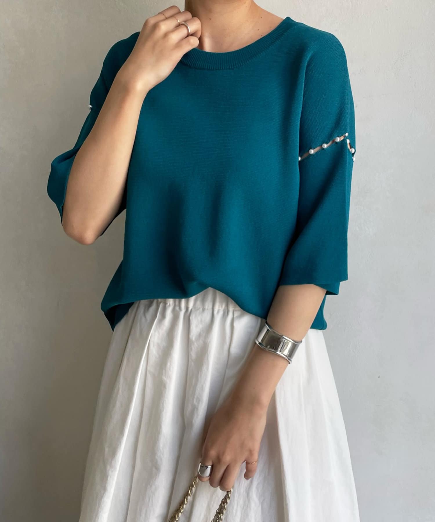 最大のポイントはお袖に。さり気ない肌見せ+トレンドのパールパーツが今らしい印象をぐっとアップさせてくれます。