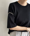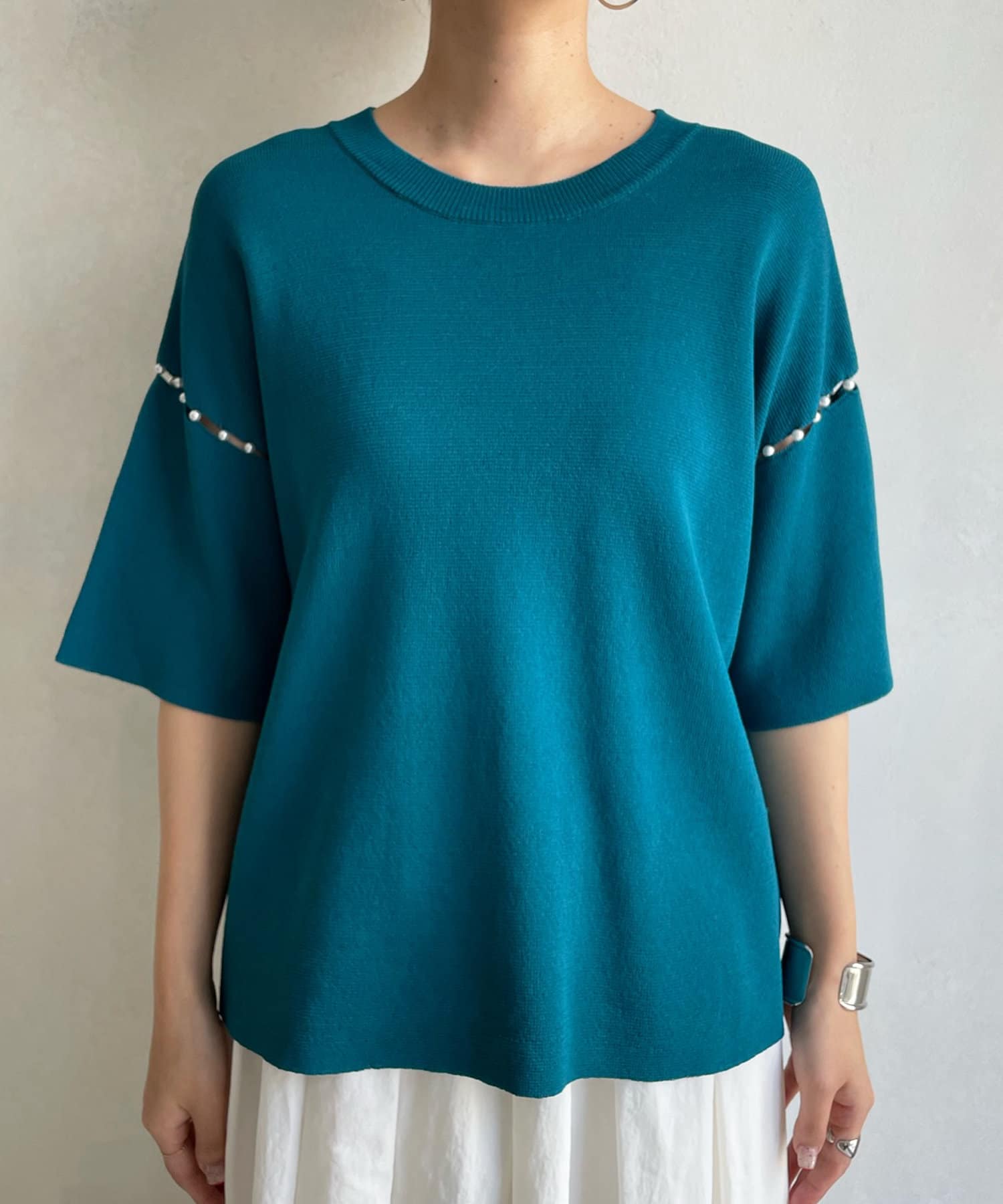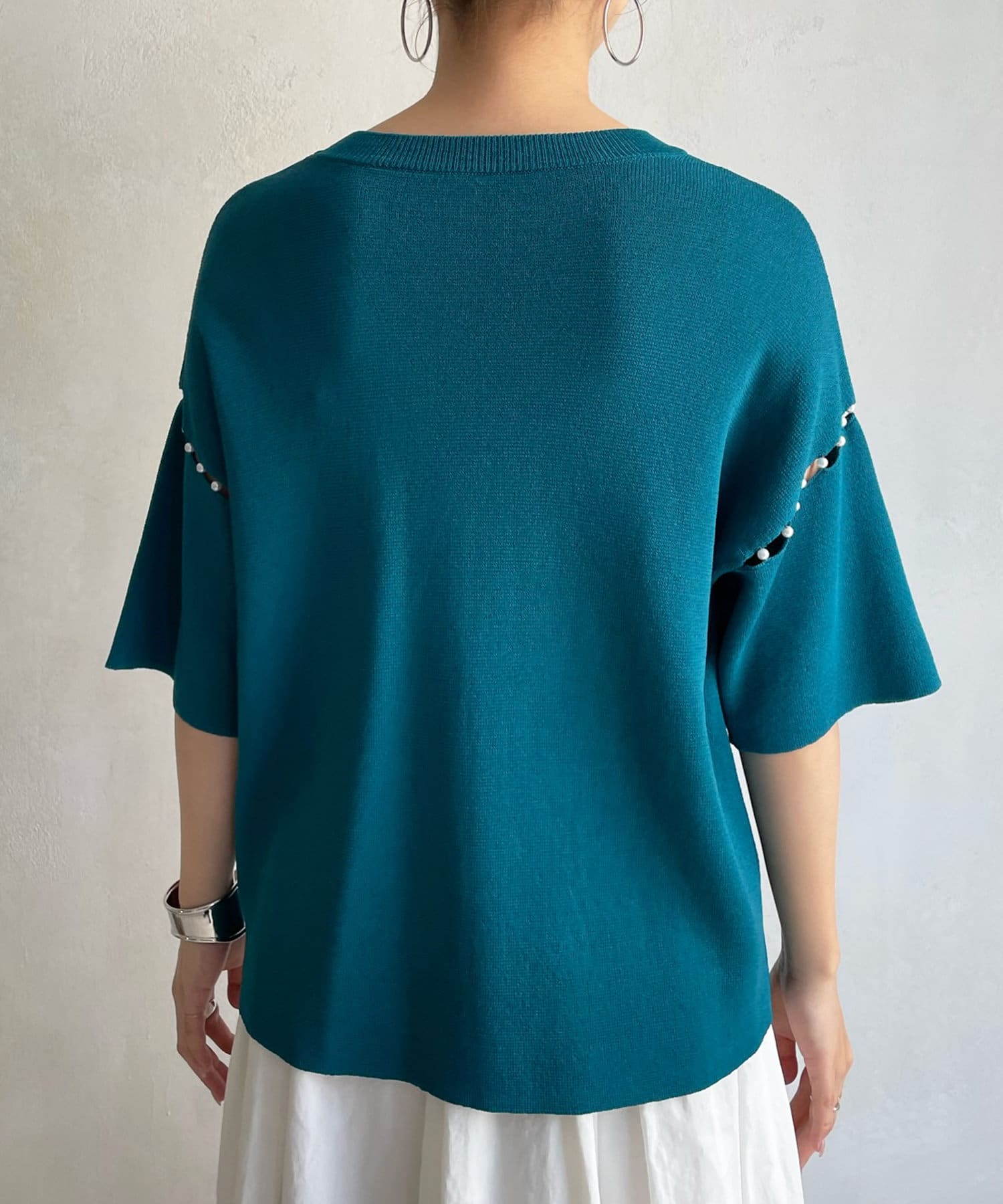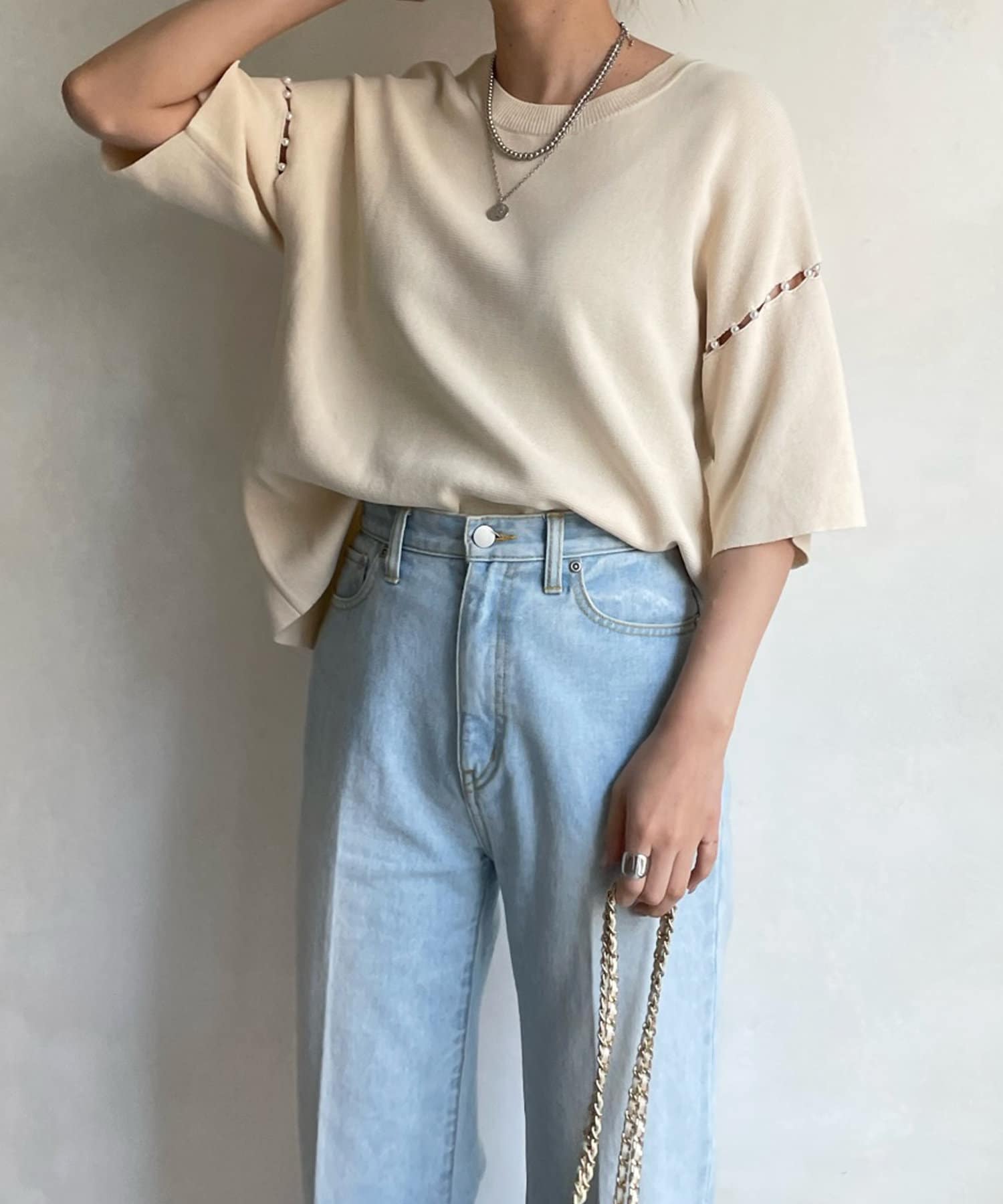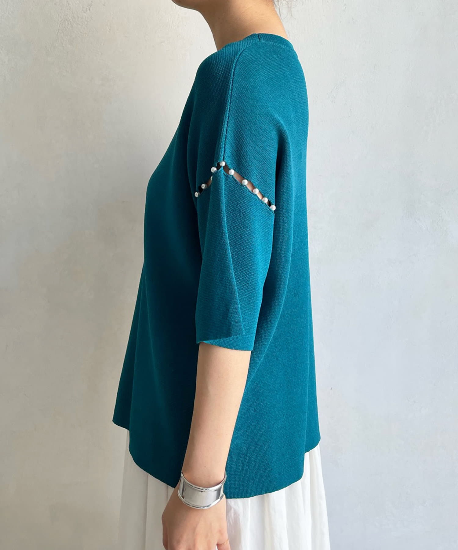 最大のポイントはお袖に。さり気ない肌見せ+トレンドのパールパーツが今らしい印象をぐっとアップさせてくれます。