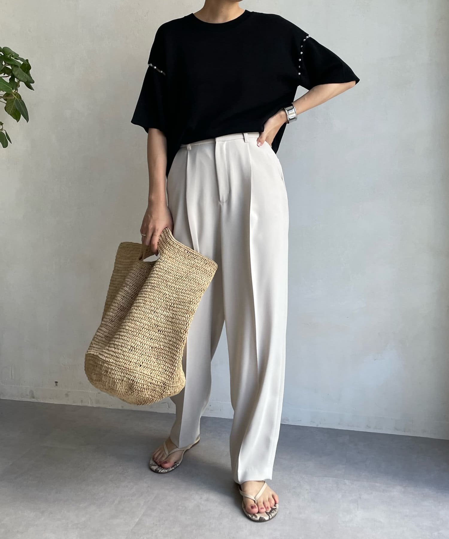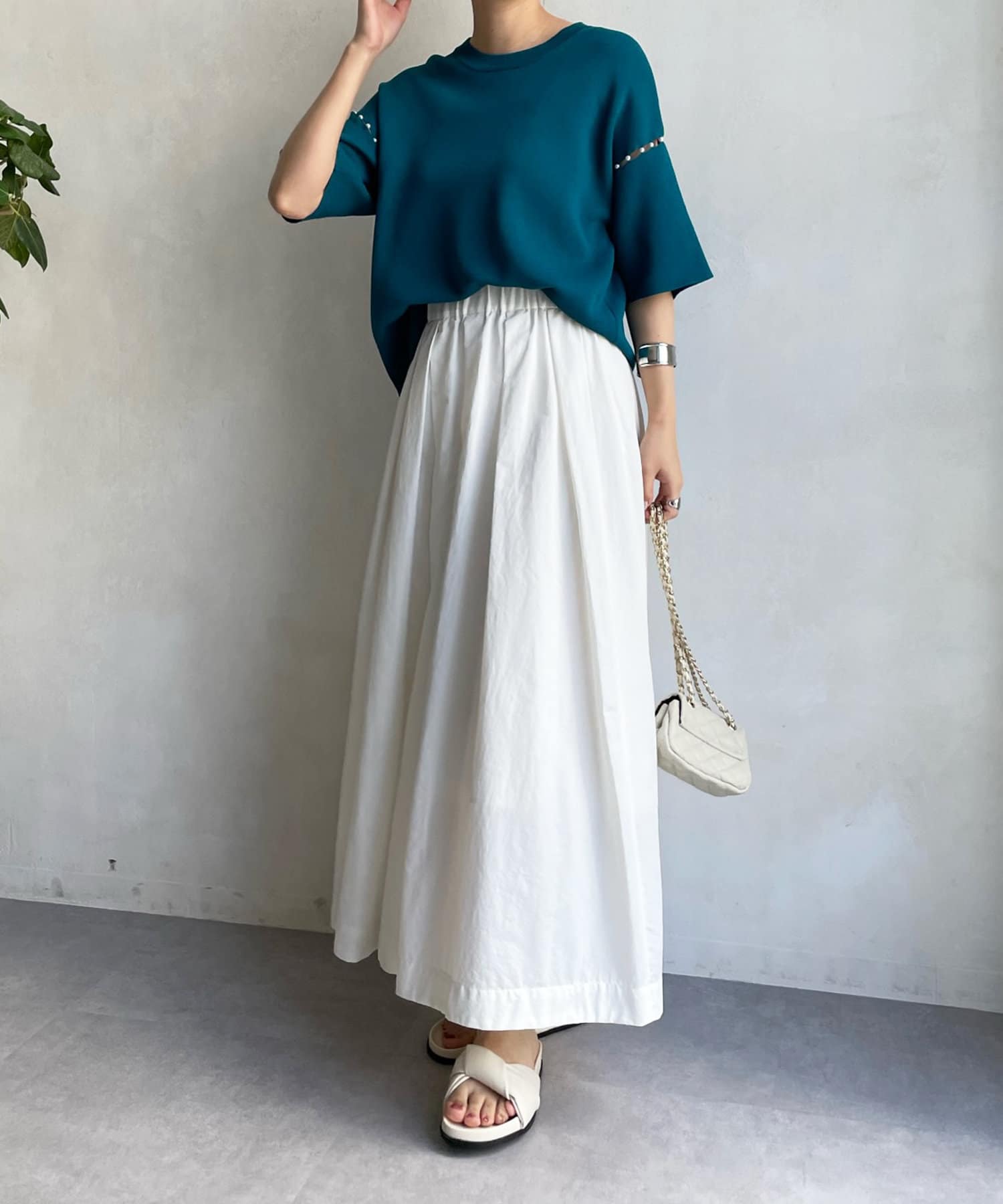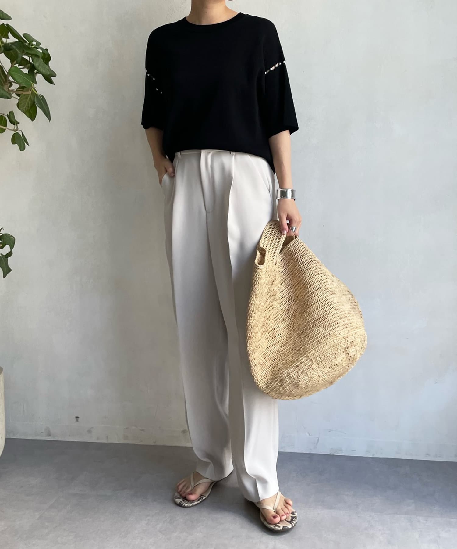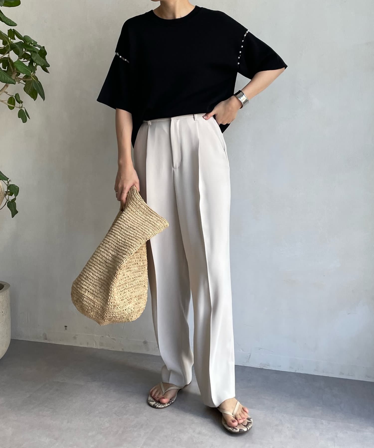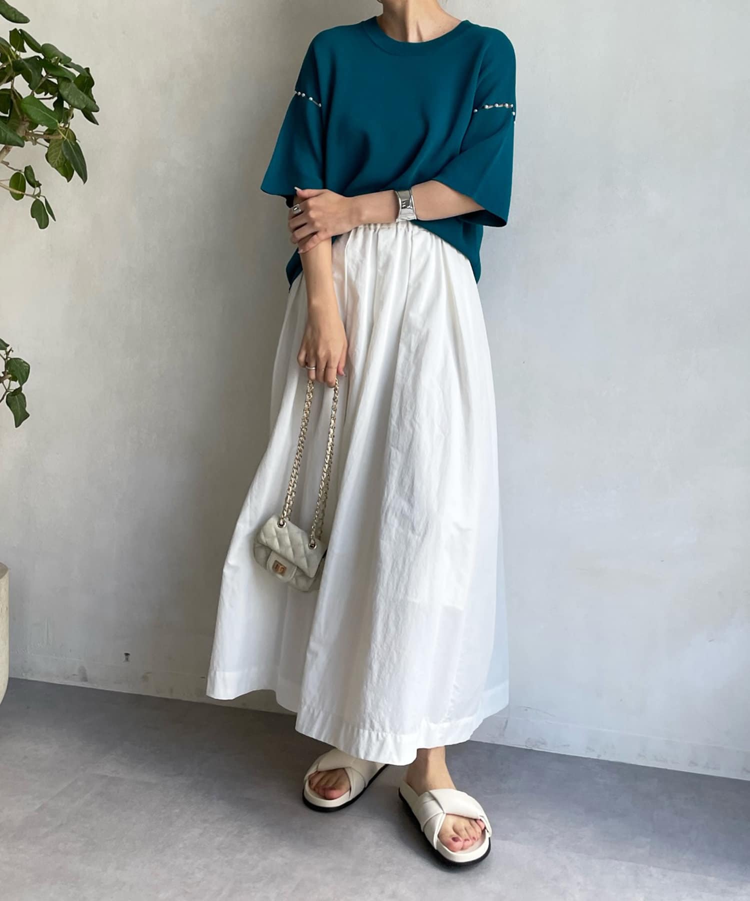 最大のポイントはお袖に。さり気ない肌見せ+トレンドのパールパーツが今らしい印象をぐっとアップさせてくれます。