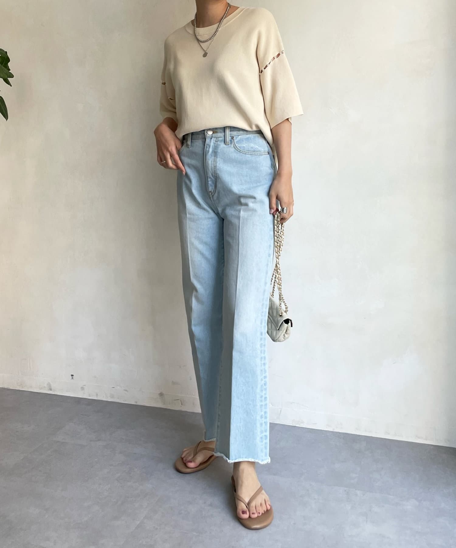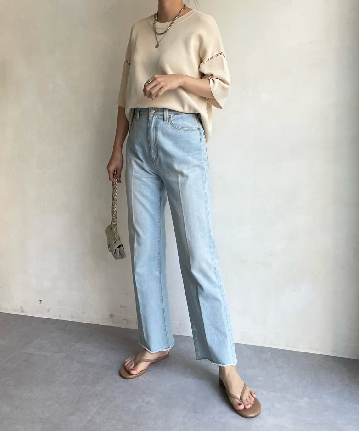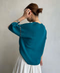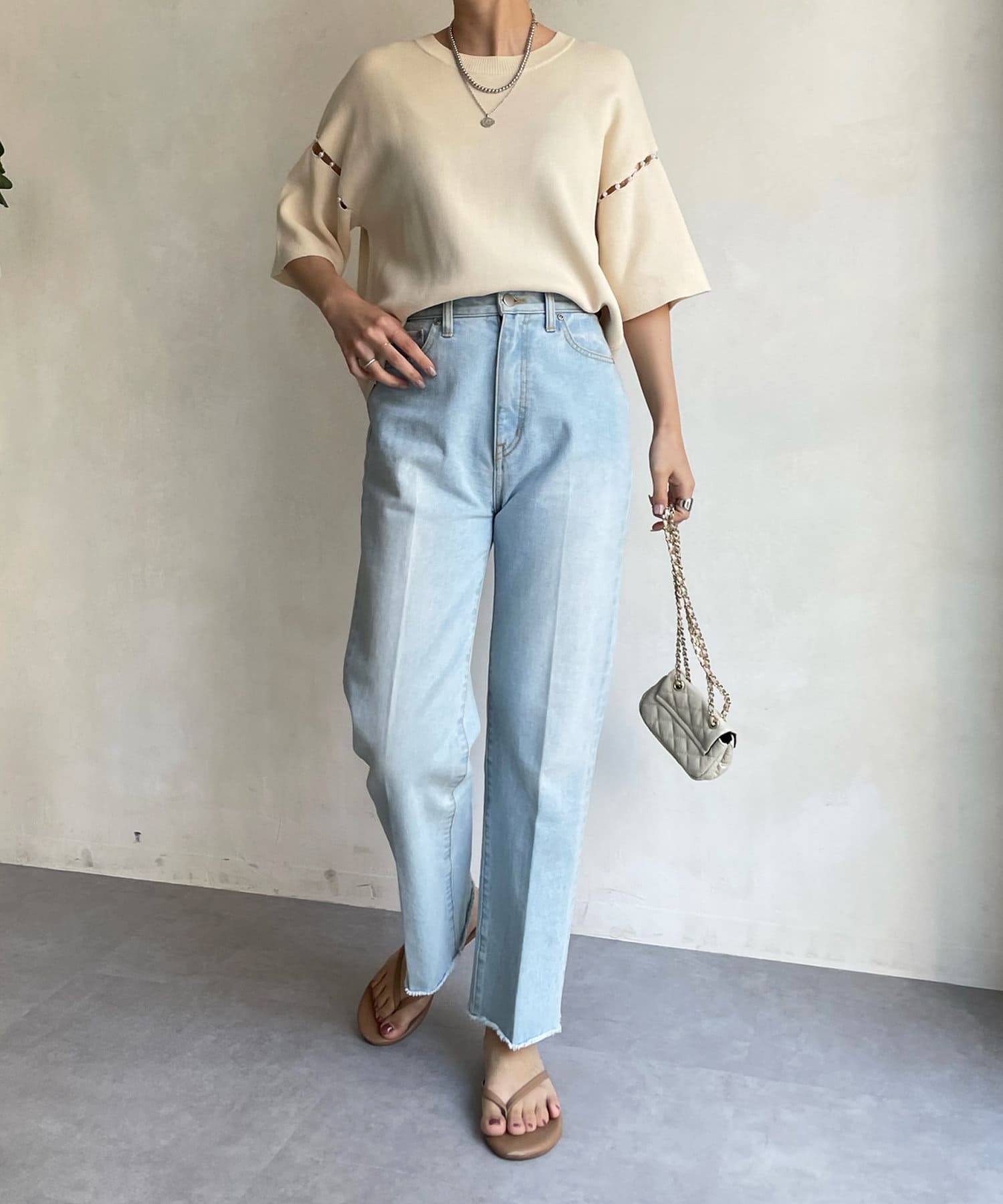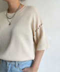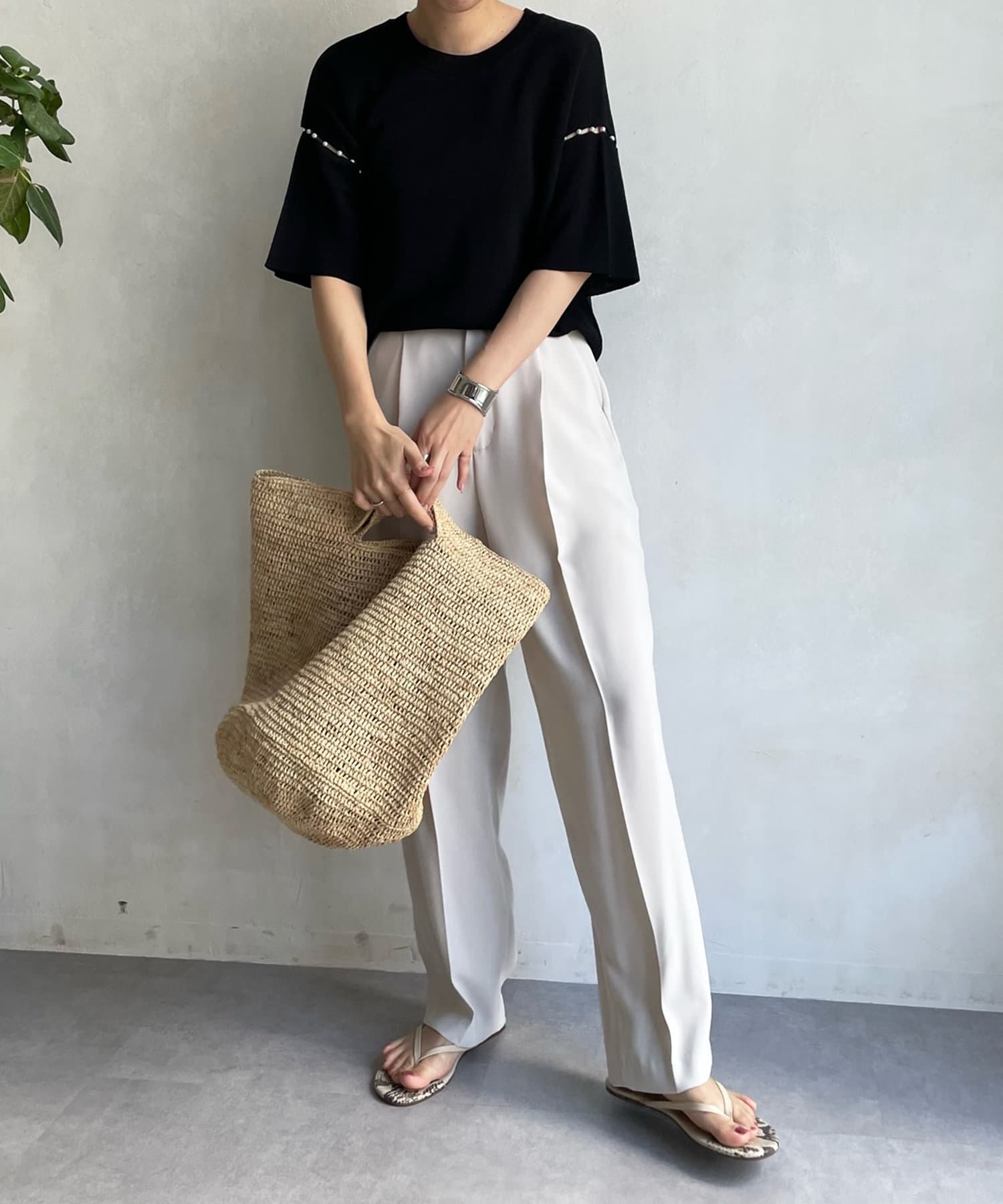 最大のポイントはお袖に。さり気ない肌見せ+トレンドのパールパーツが今らしい印象をぐっとアップさせてくれます。