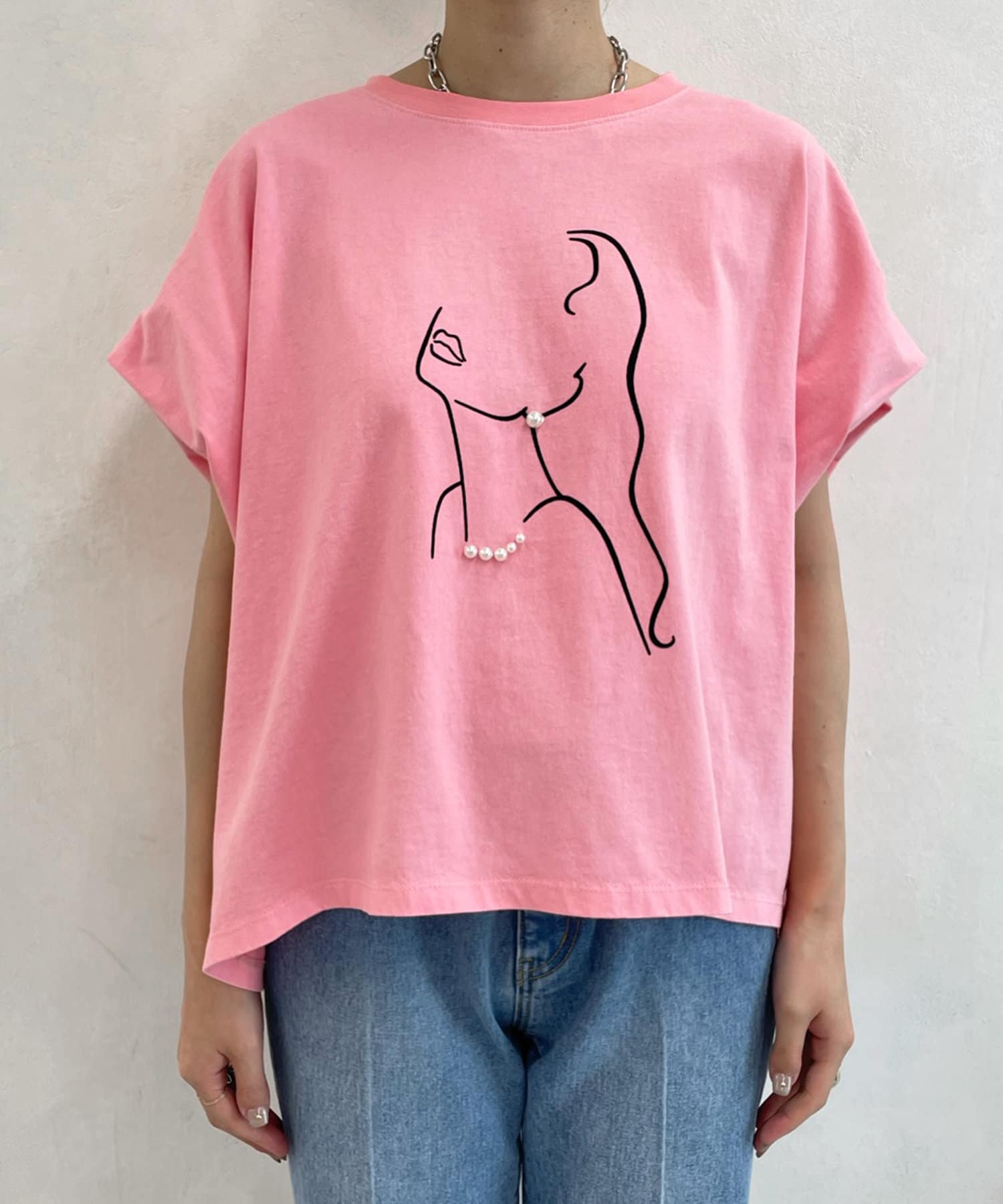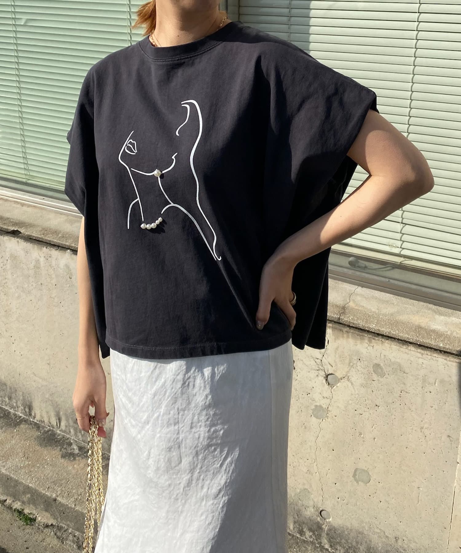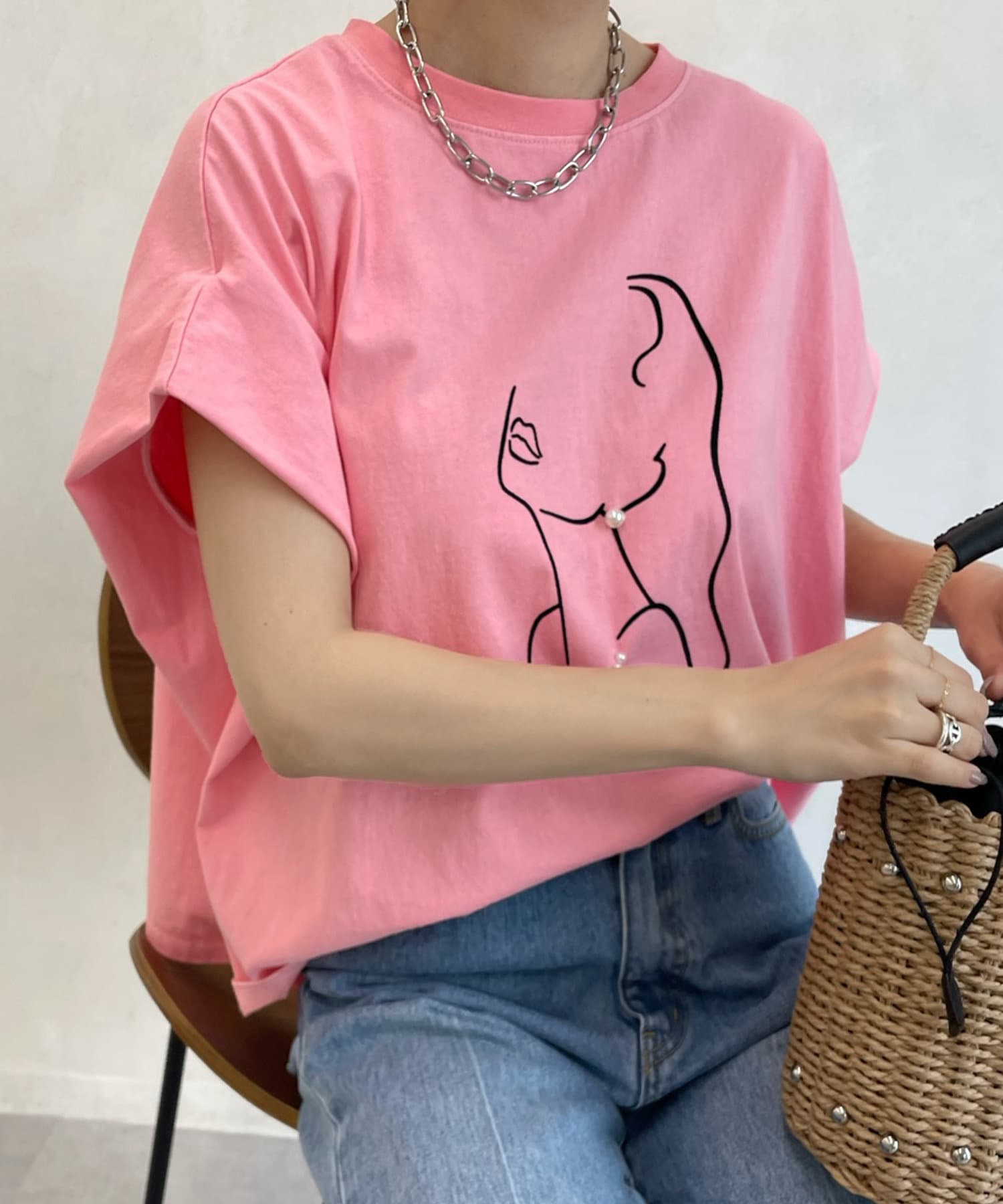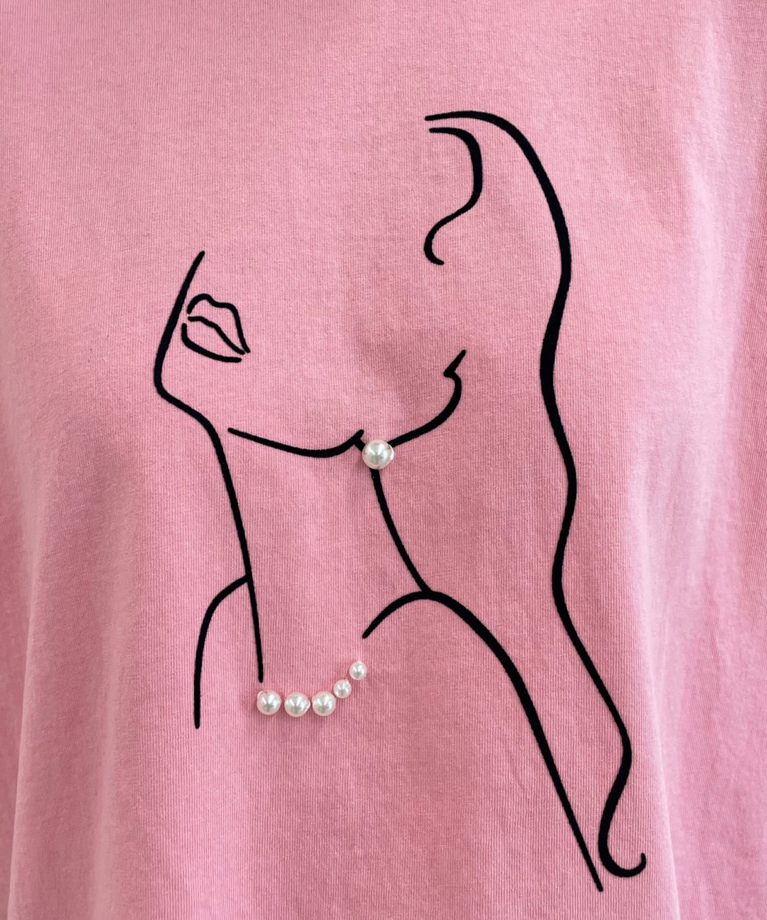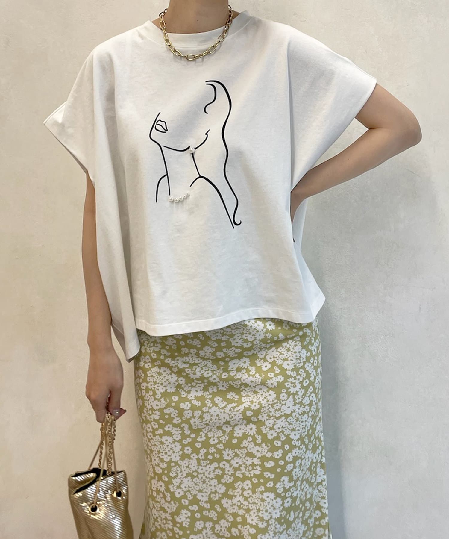 手描き風のプリントに立体的なパールのパーツで、フェミニンな要素をプラス。