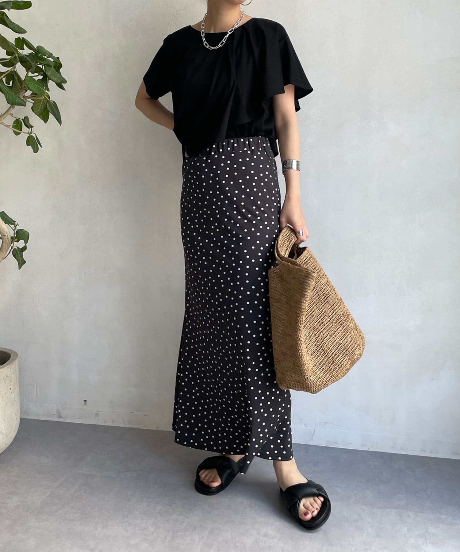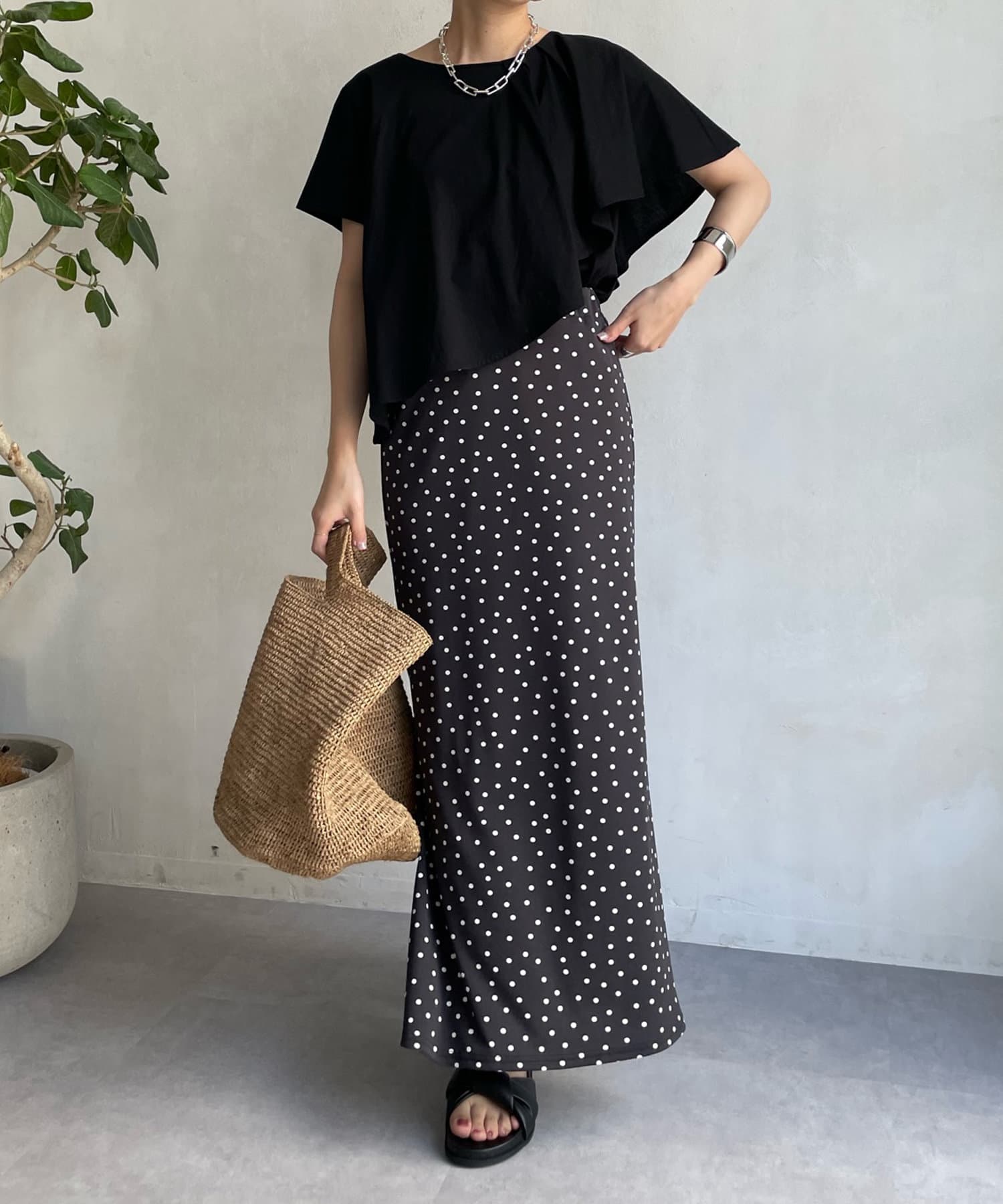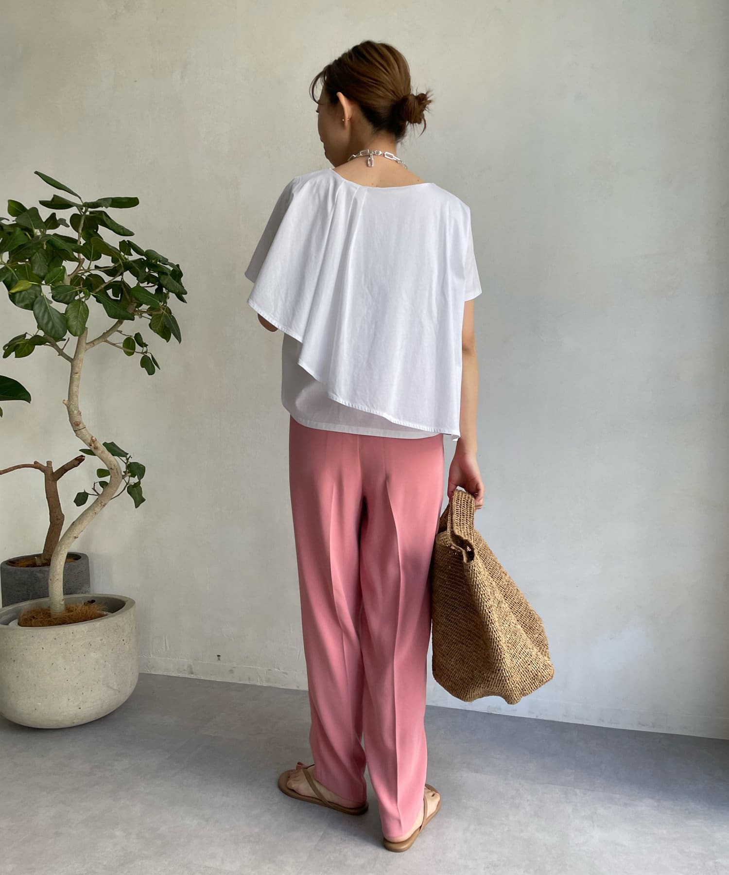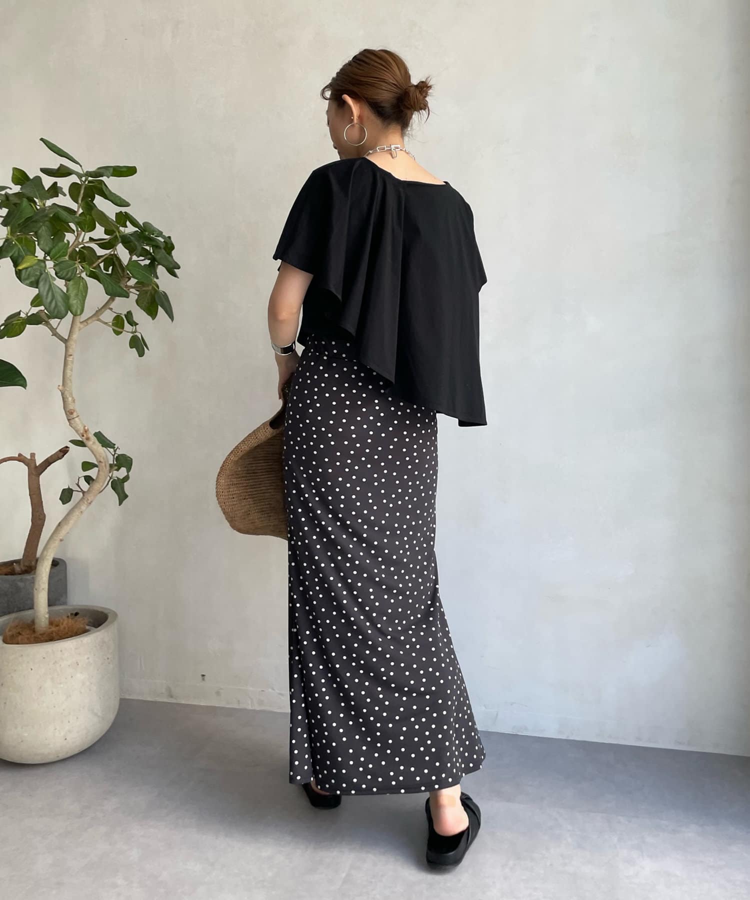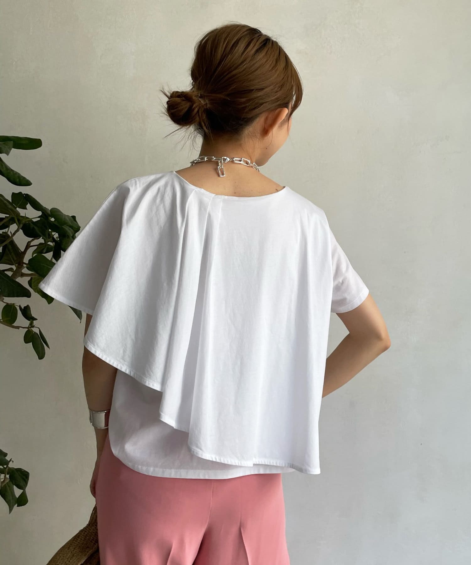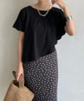 アシンメトリーのケープデザインがポイントで、どこから見てもかわいい揺れ感が女性らしい印象を与えてくれます。
