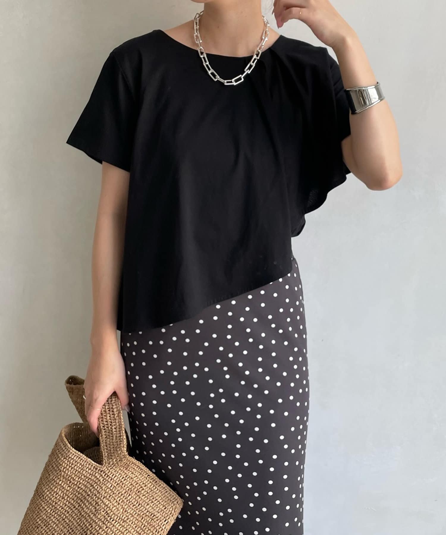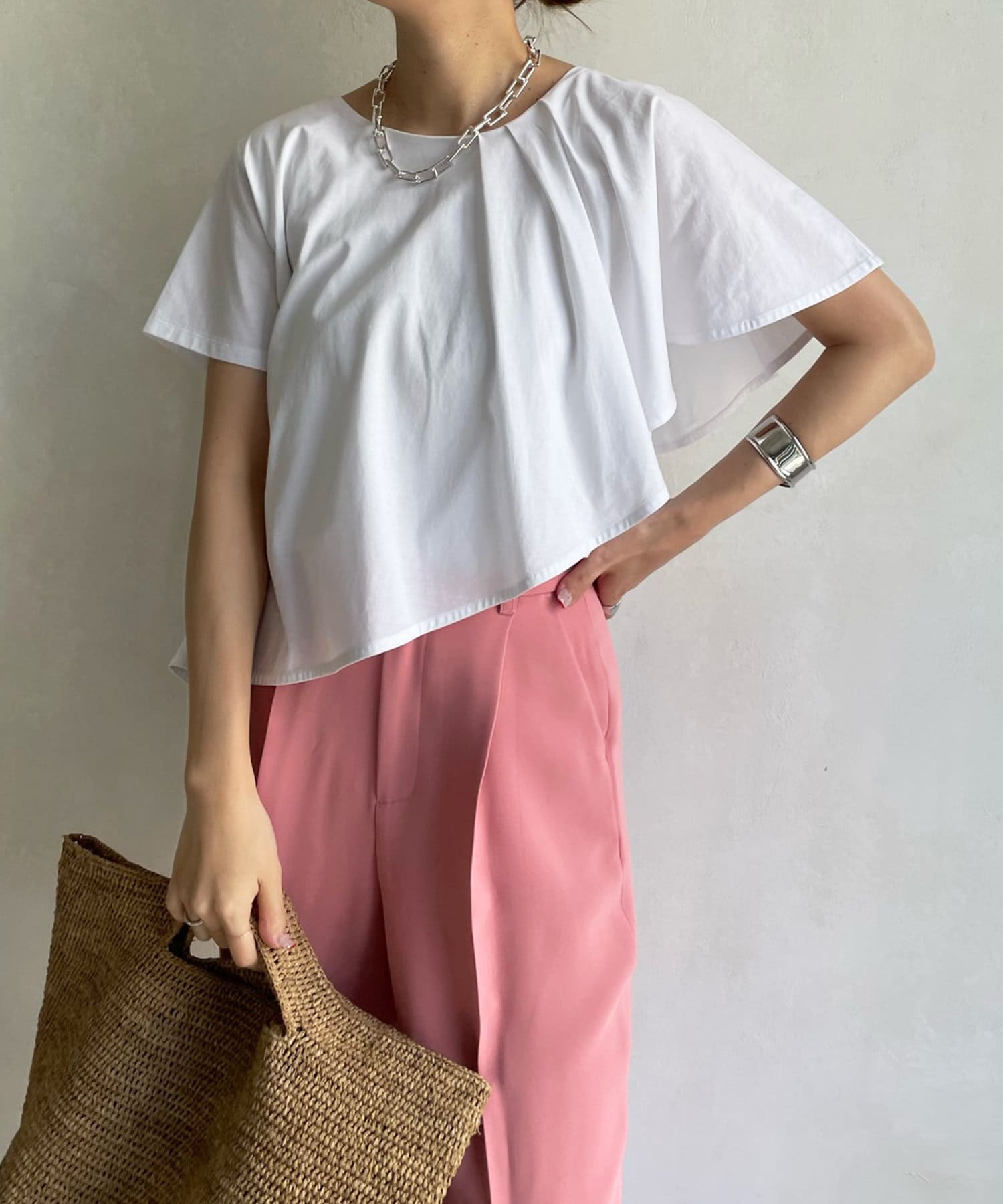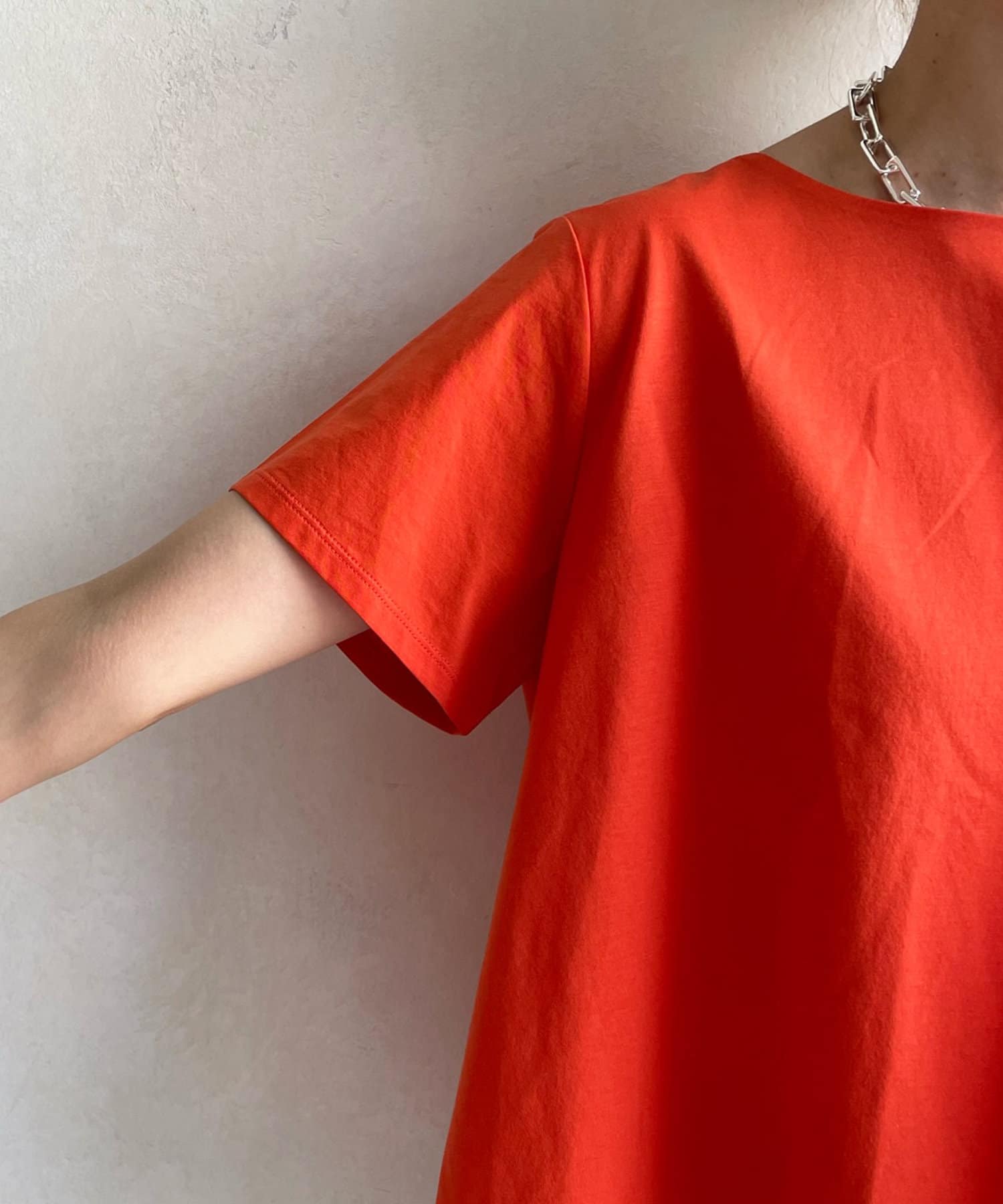 綿100%のカットソー素材で仕上げた綺麗見え抜群の1着。