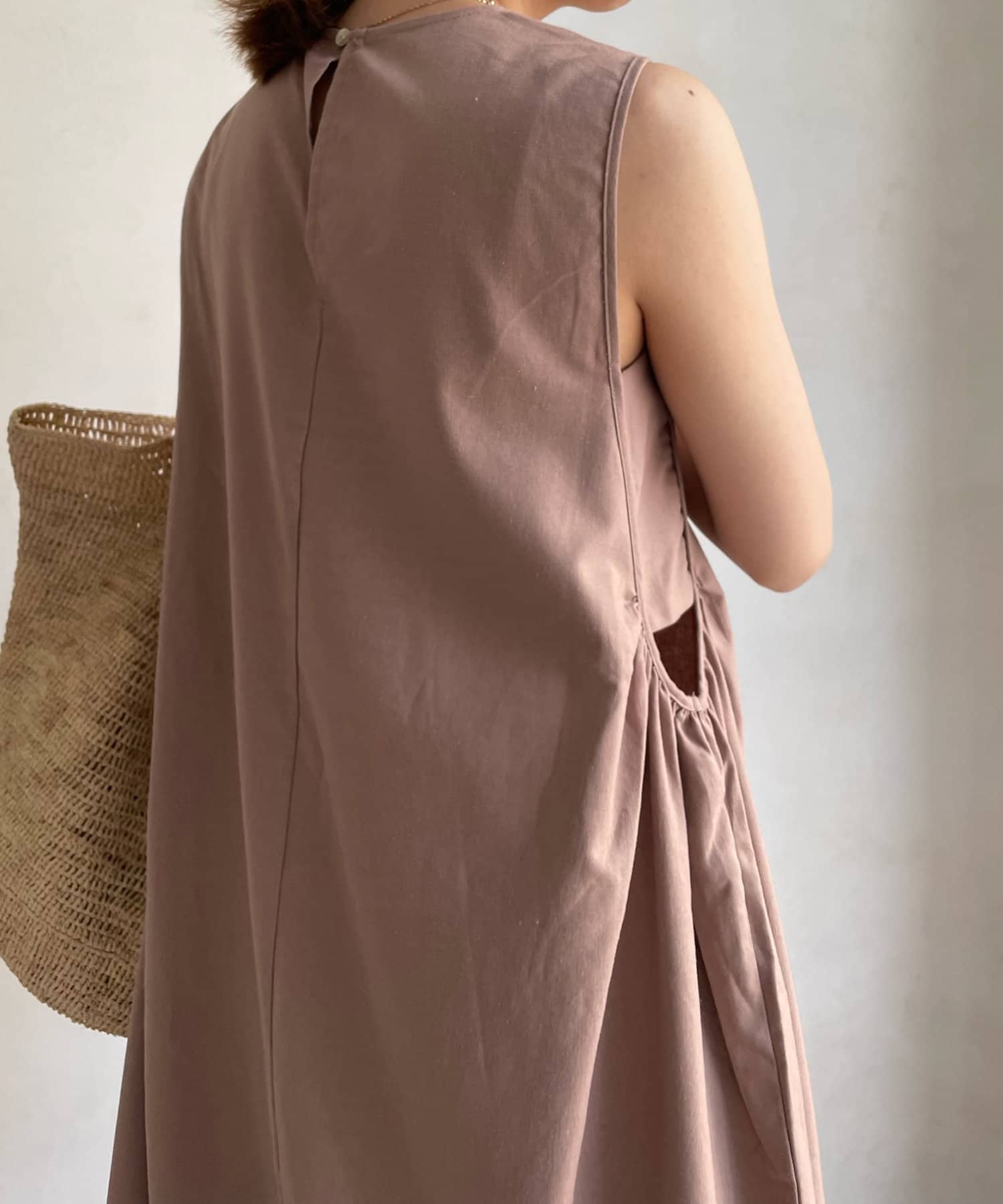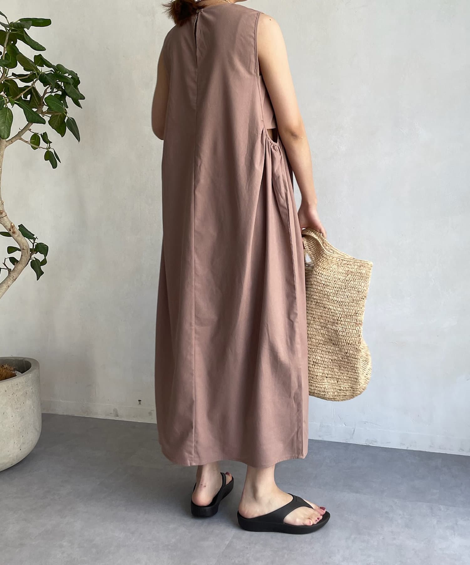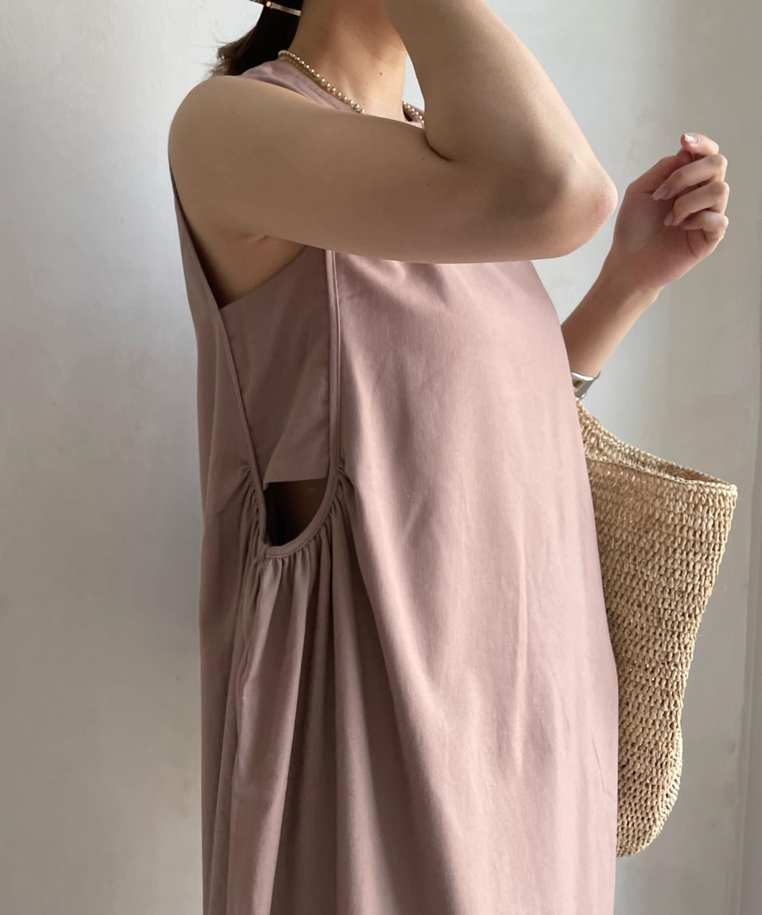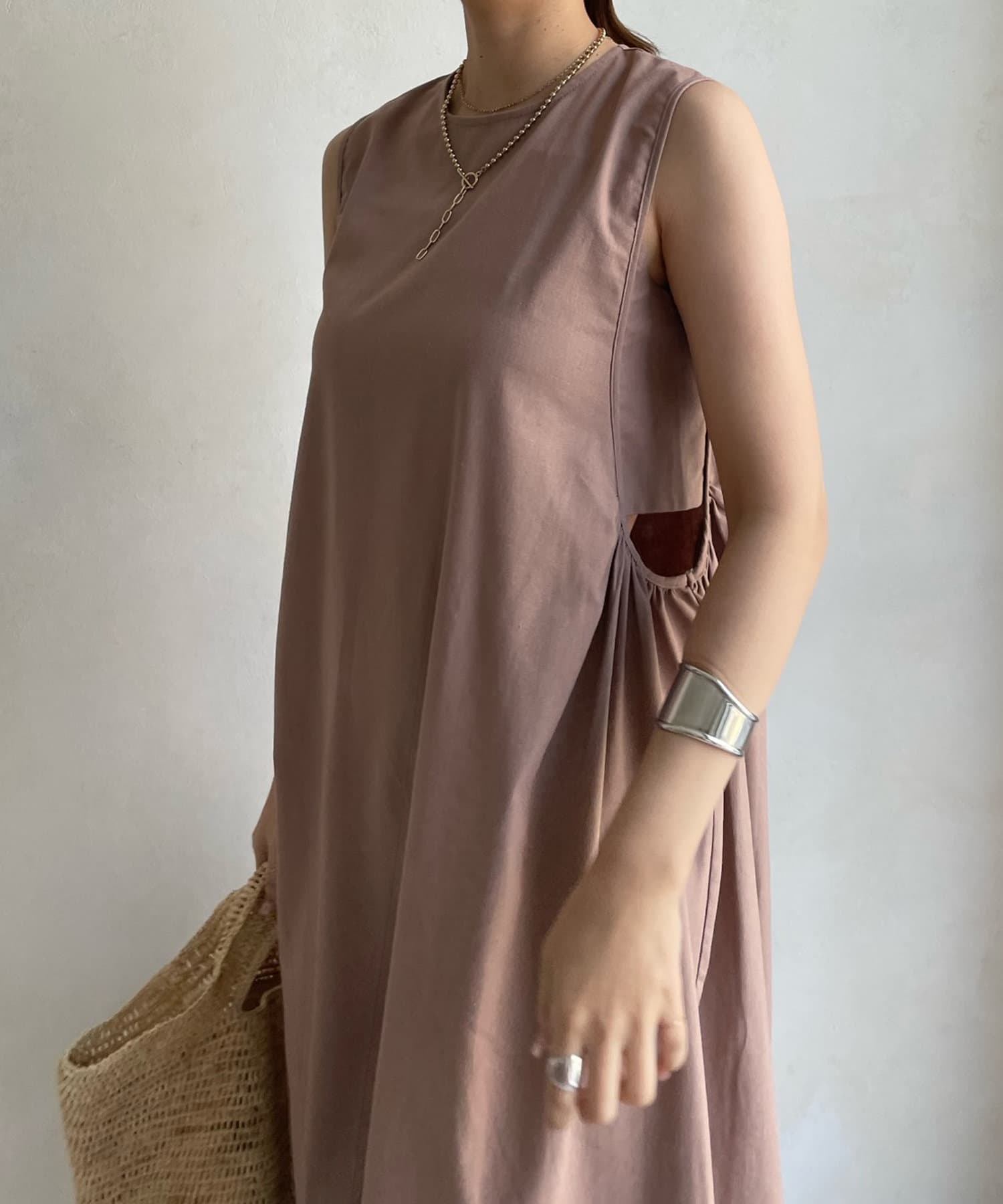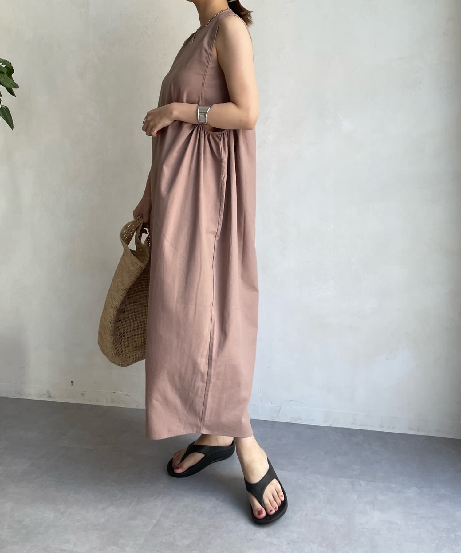 サイドにギャザーもあり、ボディーラインを拾わないシルエットが春夏に着心地の良いワンピースです。