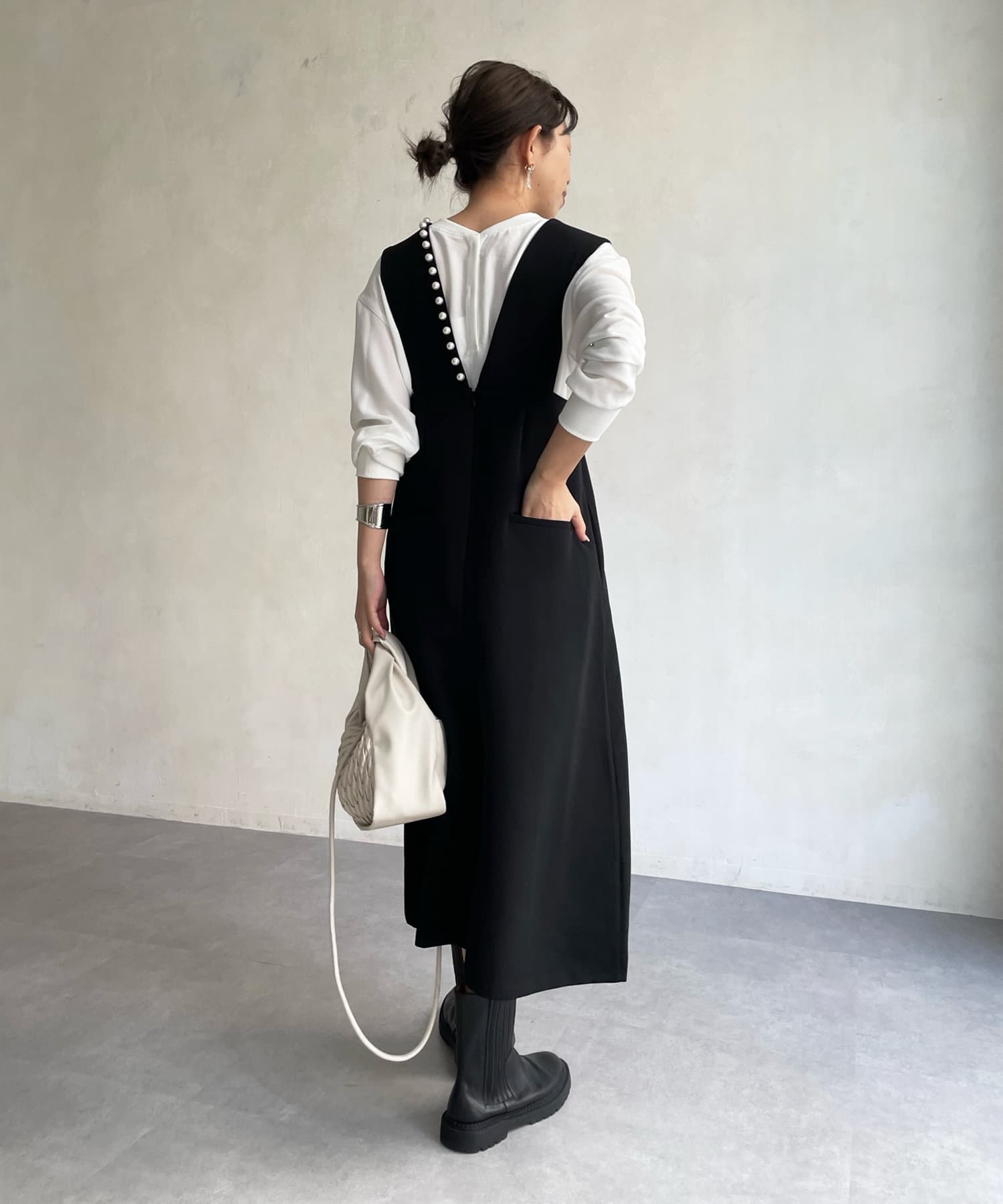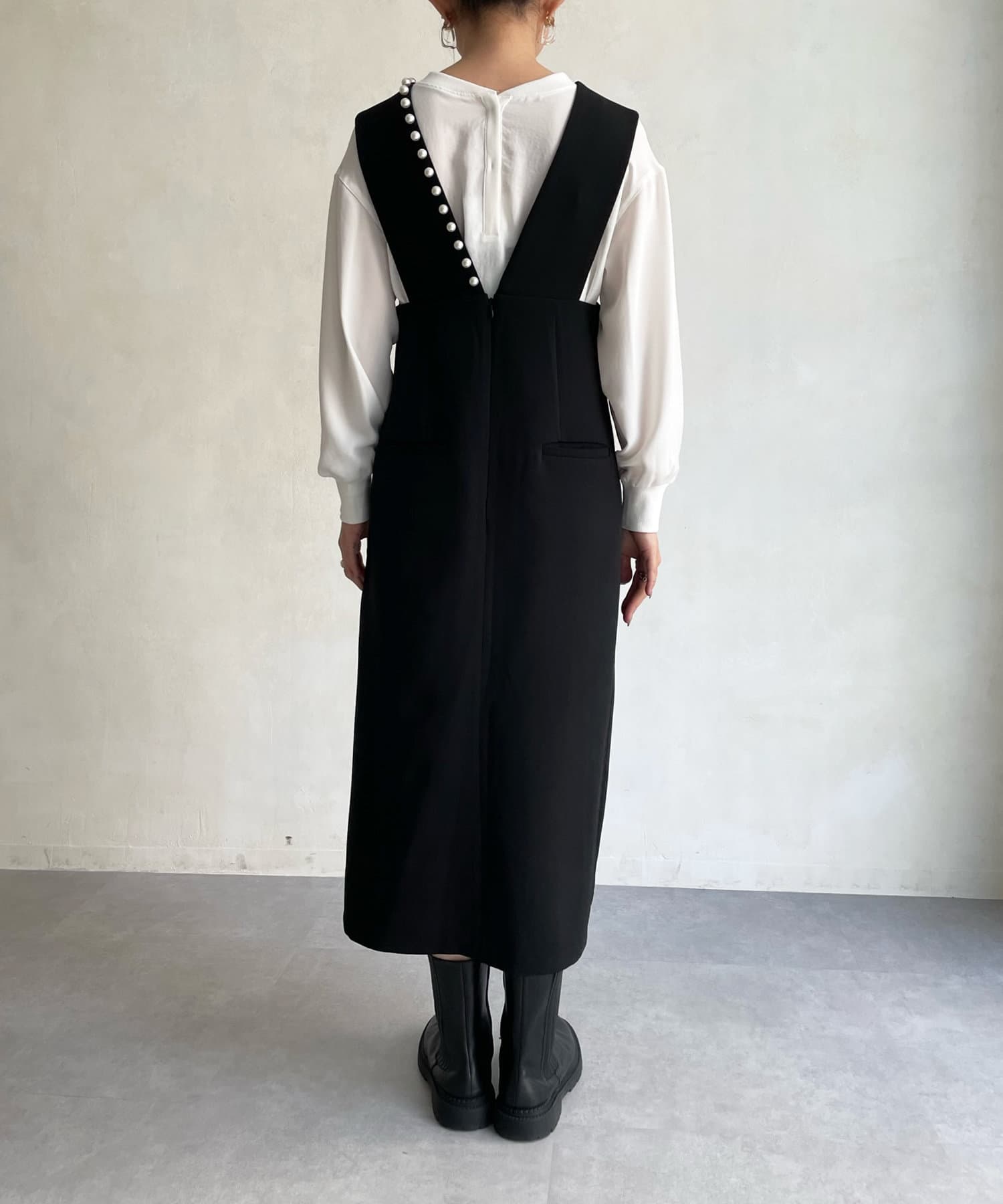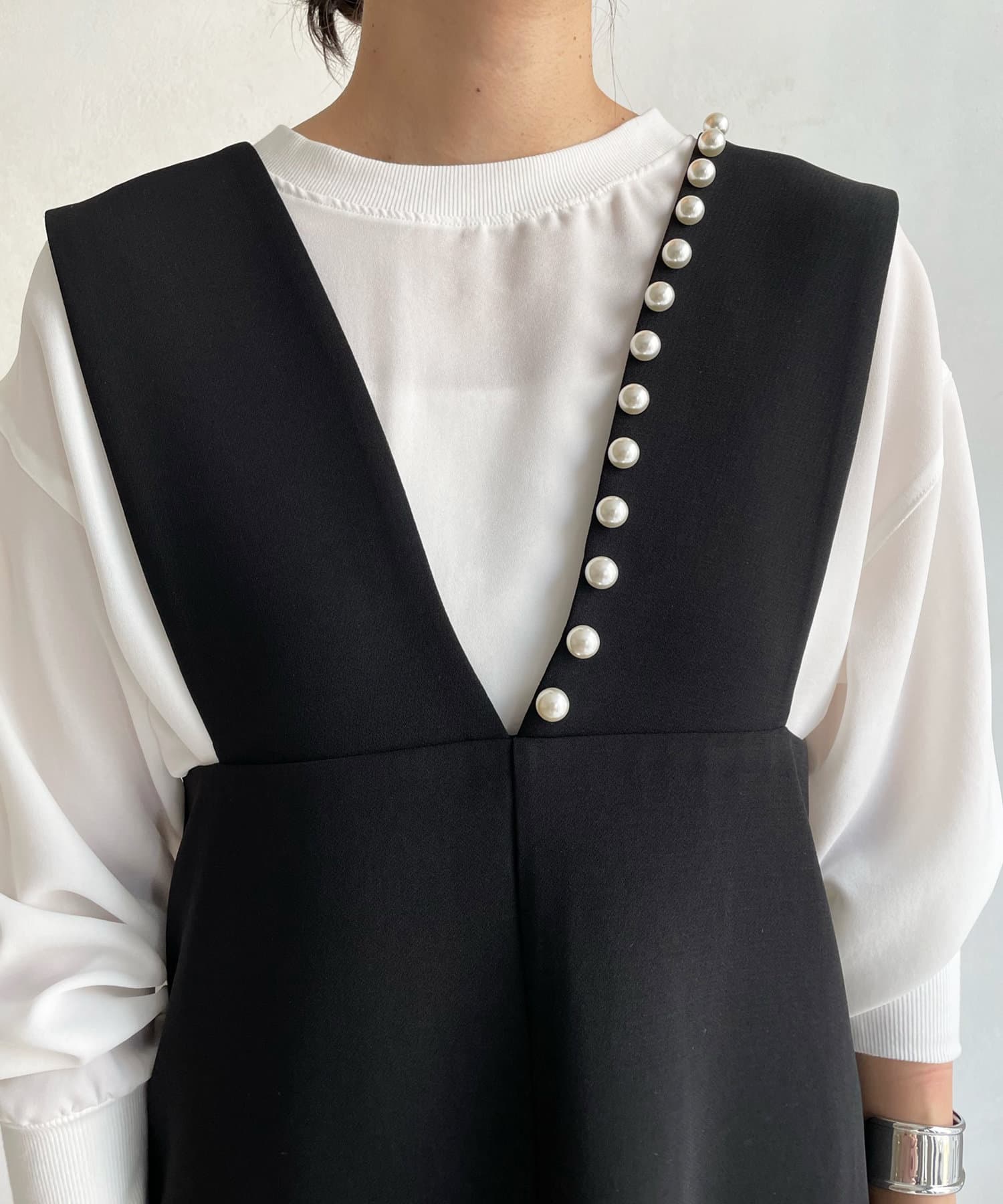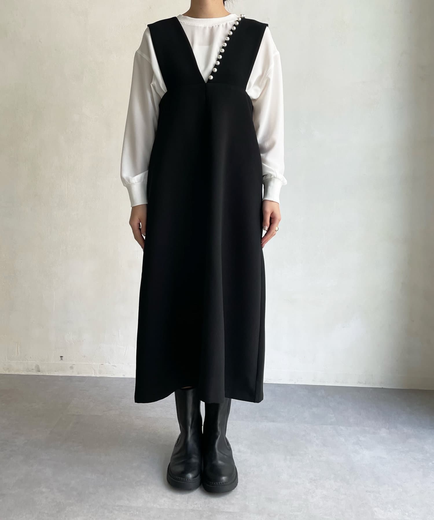 深めのVネックと、前後左側のみに施されたパールデザインが魅力の大人可愛いジャンスカが登場。