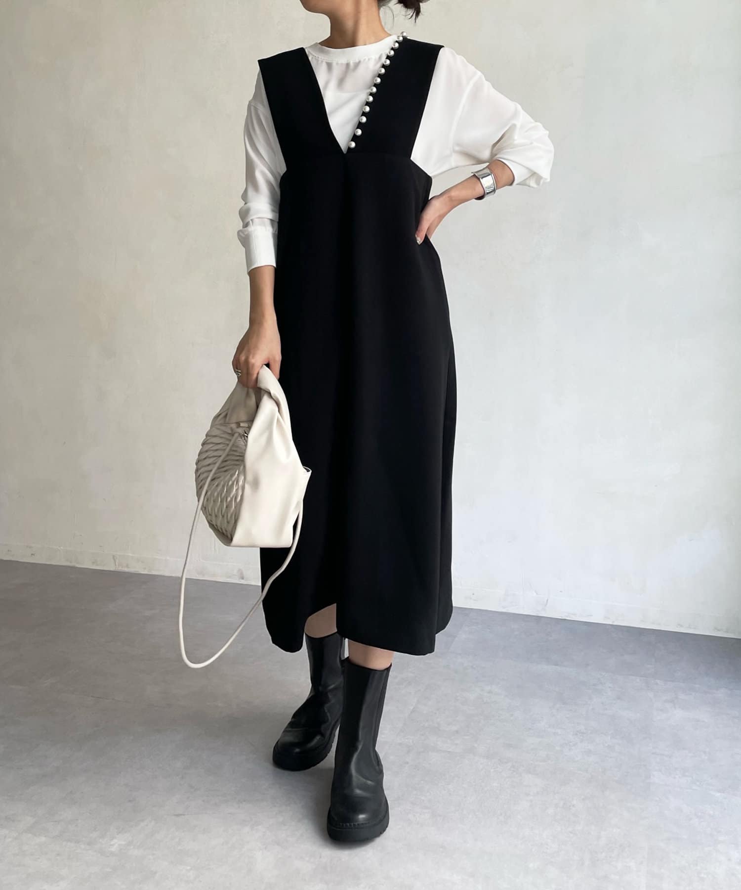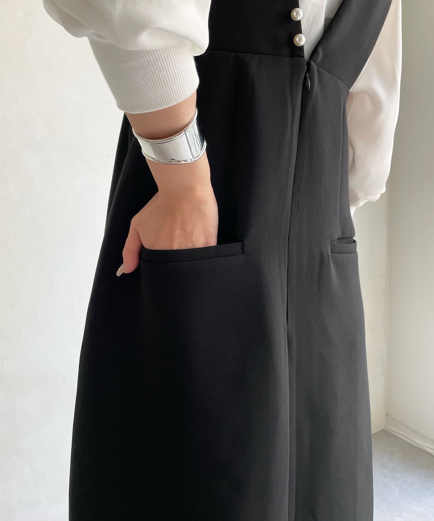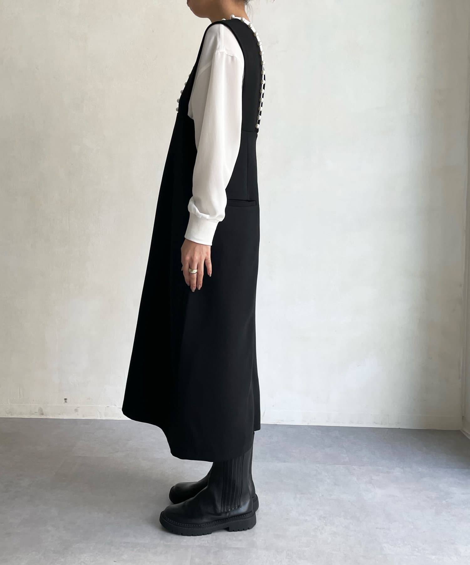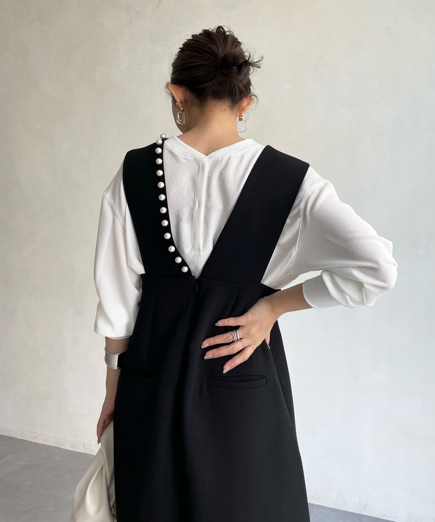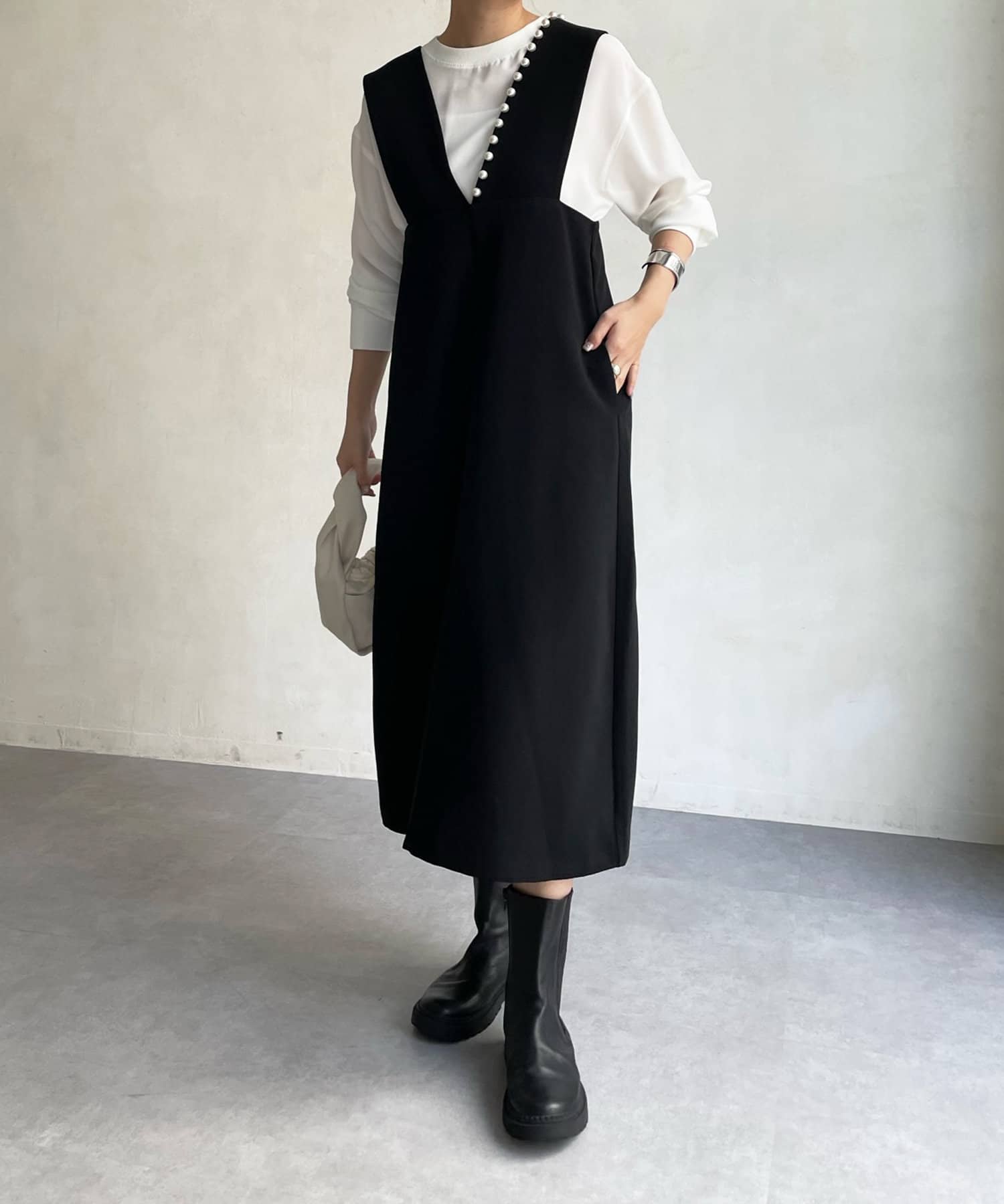 深めのVネックと、前後左側のみに施されたパールデザインが魅力の大人可愛いジャンスカが登場。