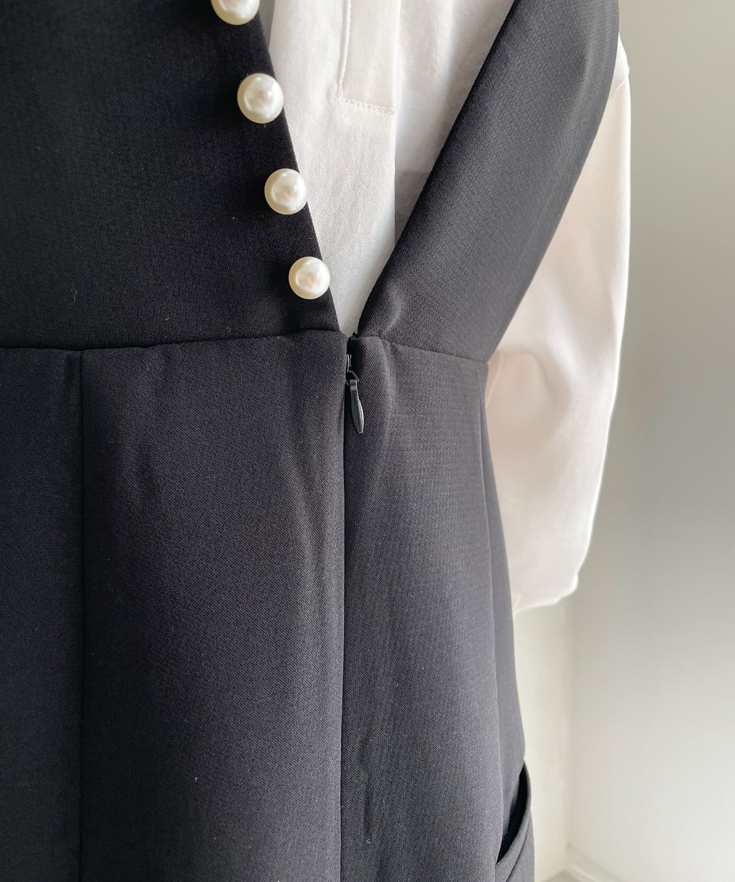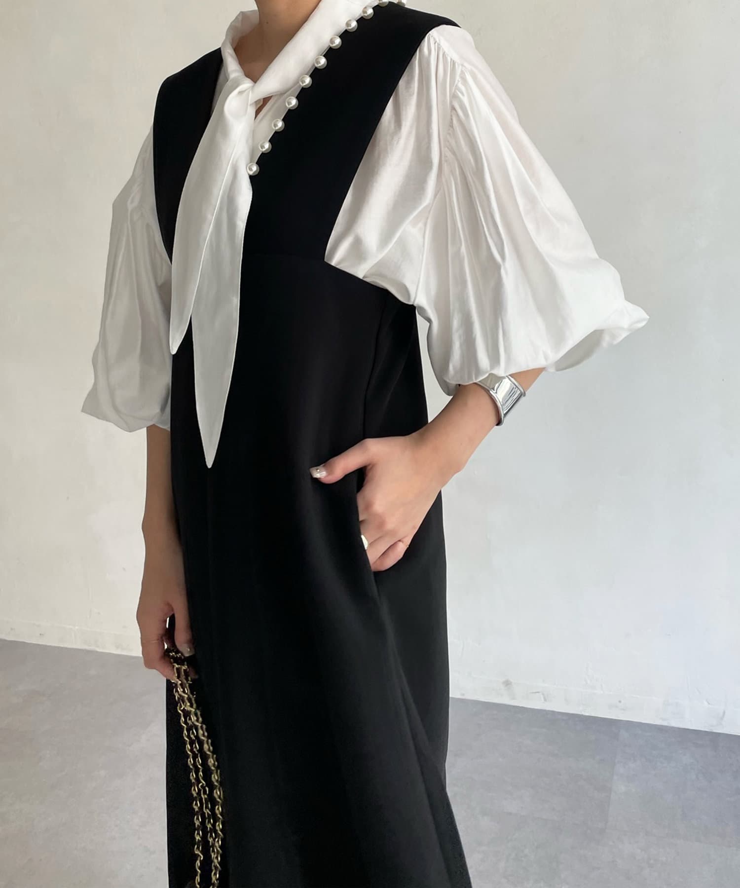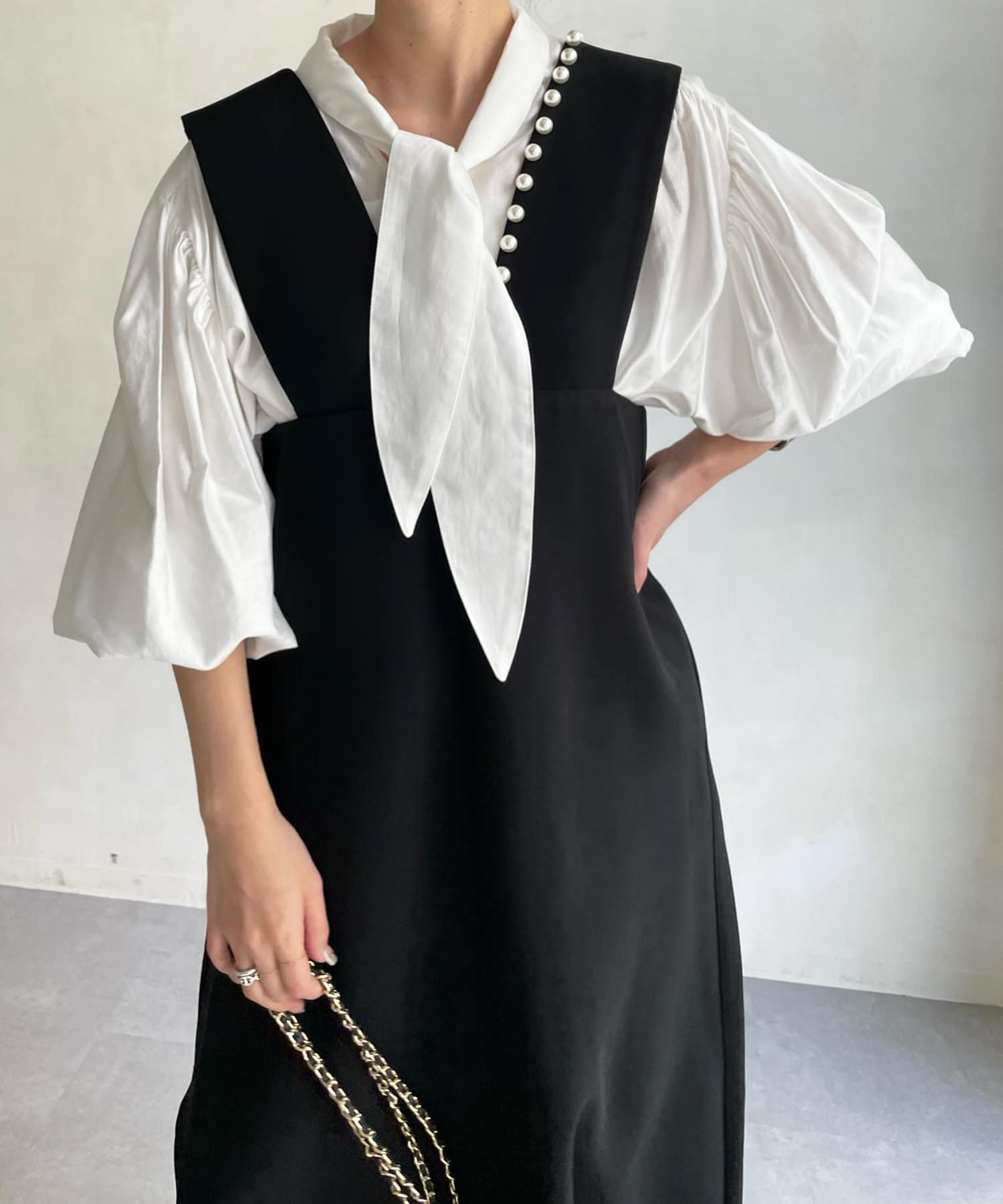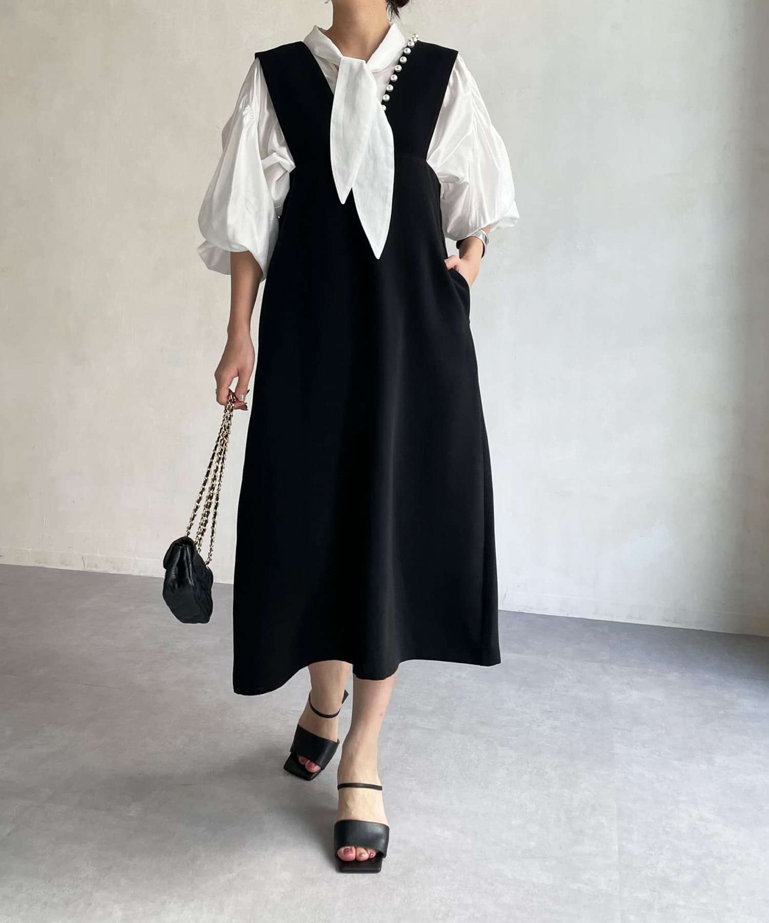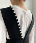 深めのVネックと、前後左側のみに施されたパールデザインが魅力の大人可愛いジャンスカが登場。