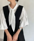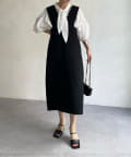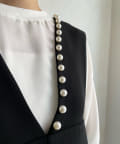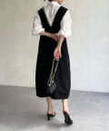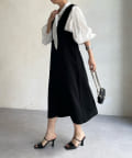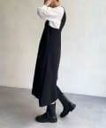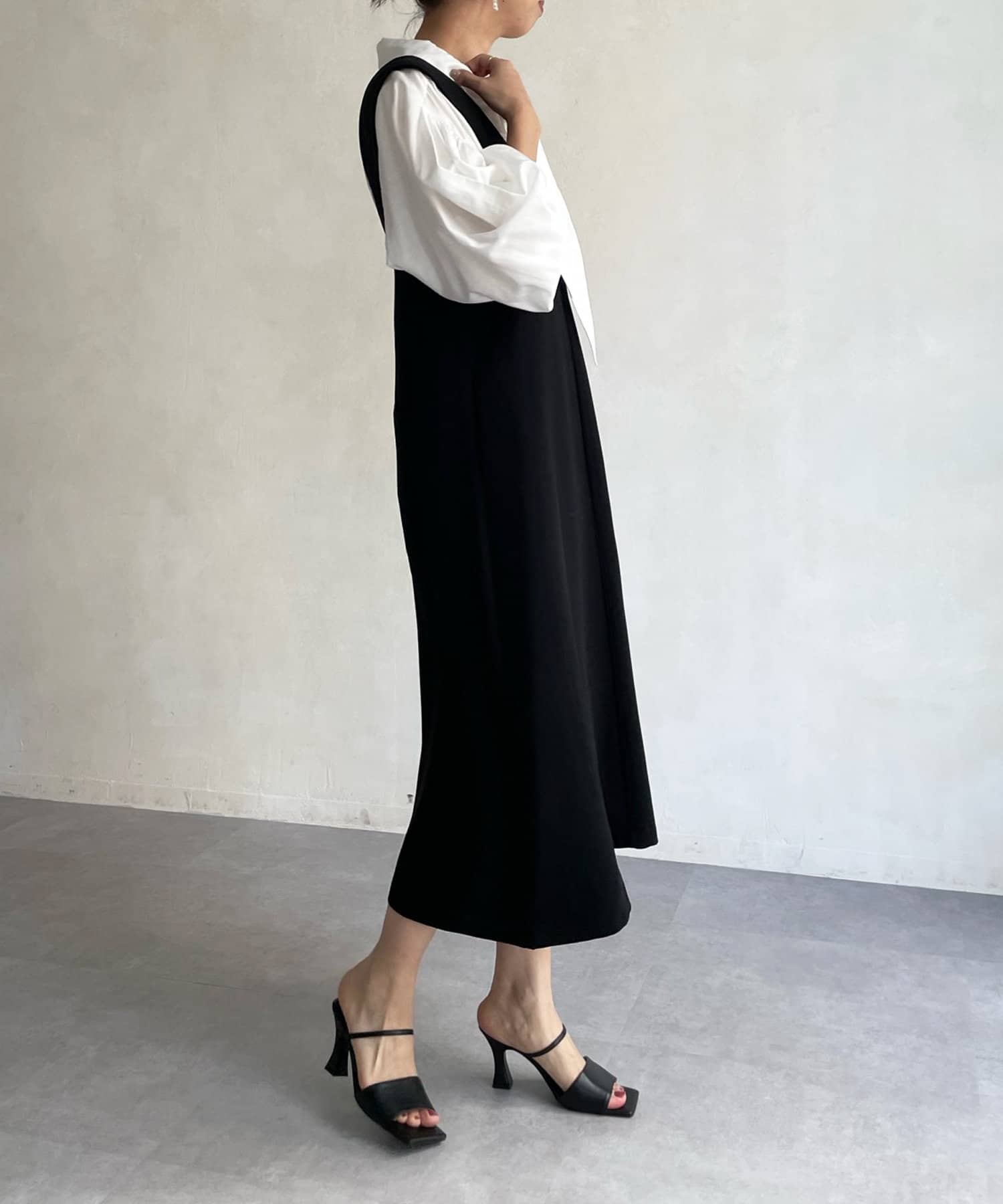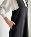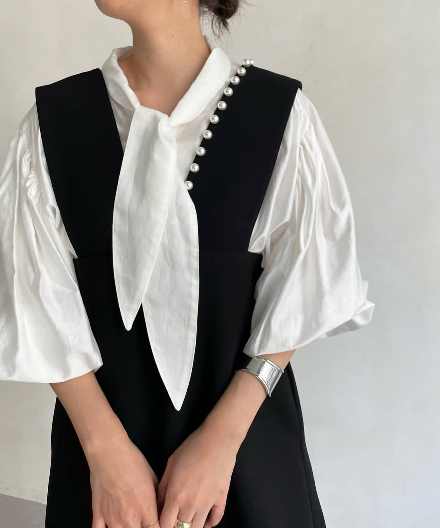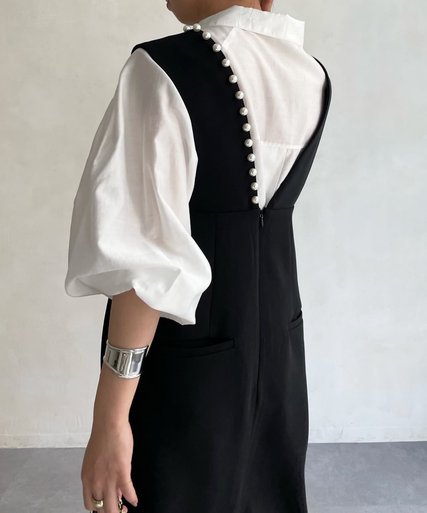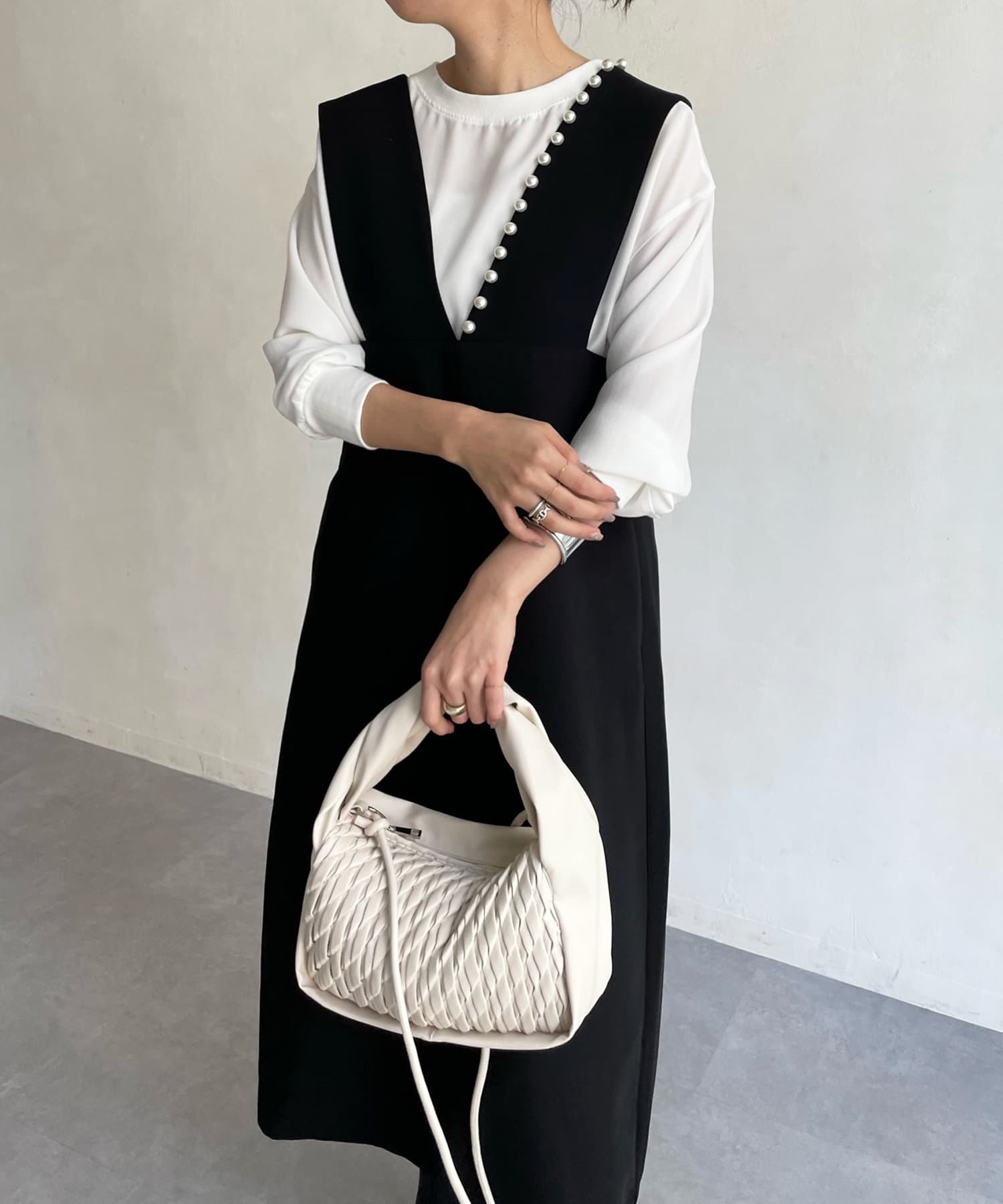 深めのVネックと、前後左側のみに施されたパールデザインが魅力の大人可愛いジャンスカが登場。