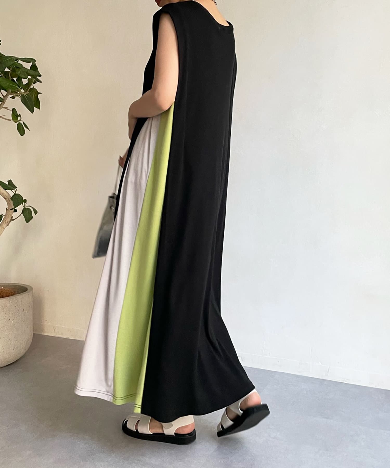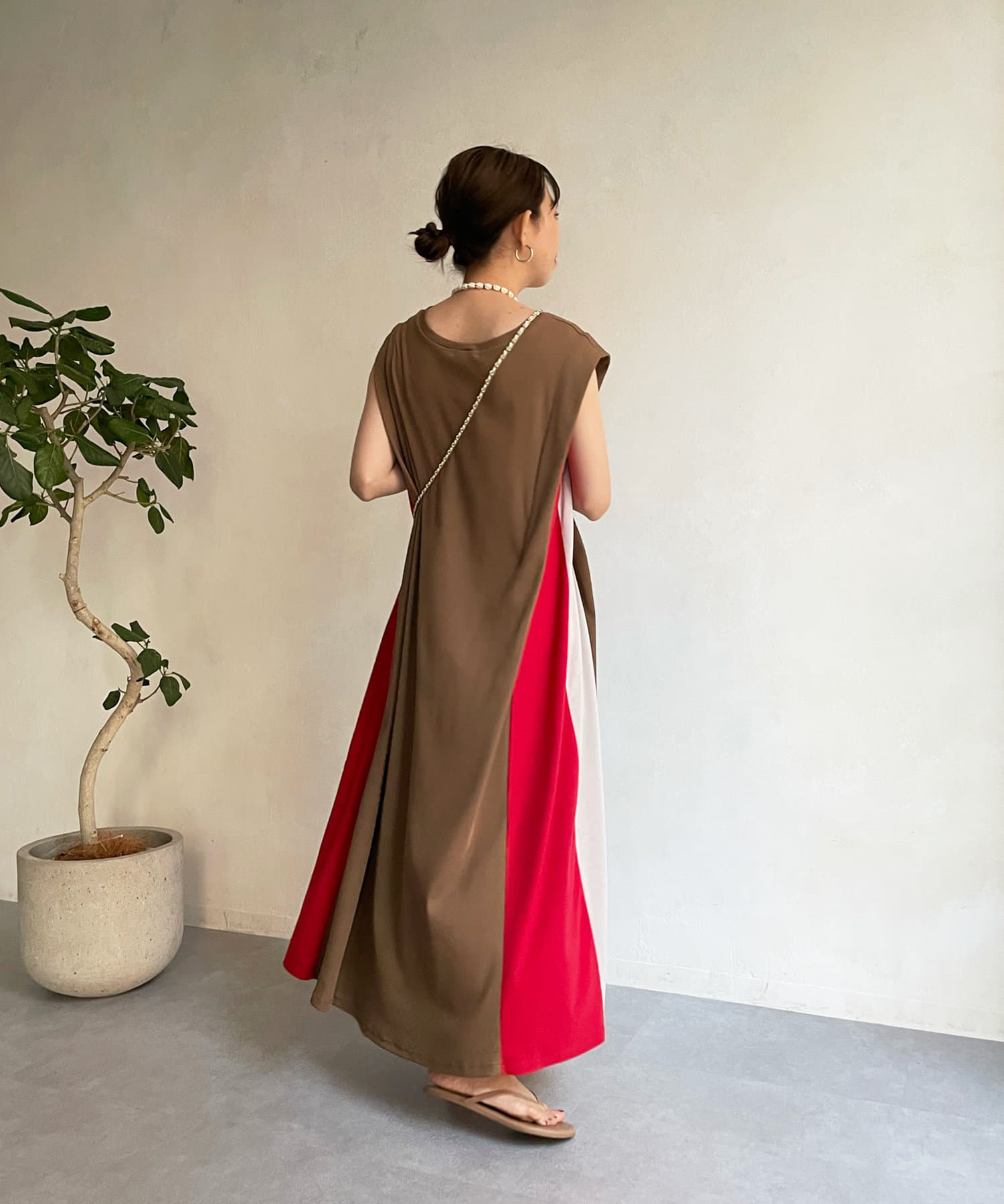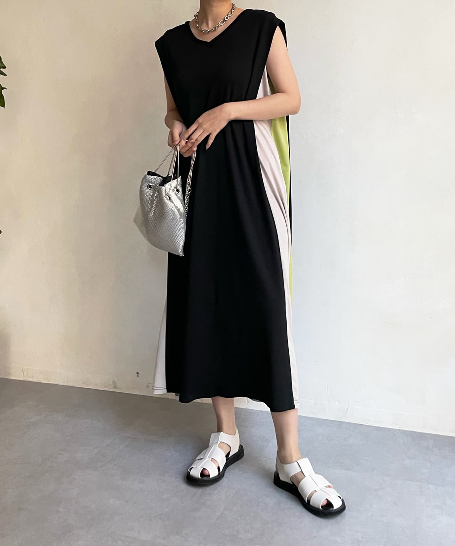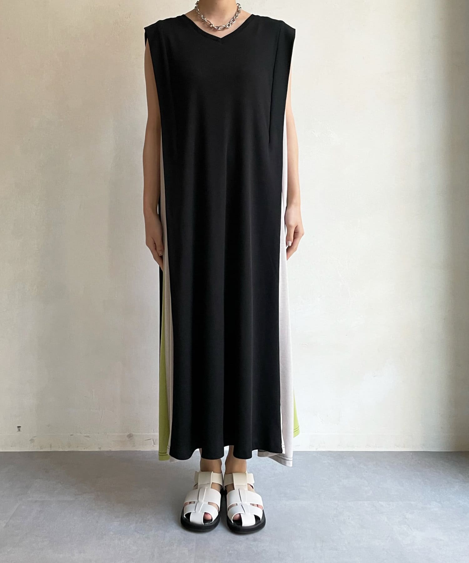 前後身頃はシンプルですが、サイドの配色に切り替えられたカラーが目を惹くデザインワンピース。