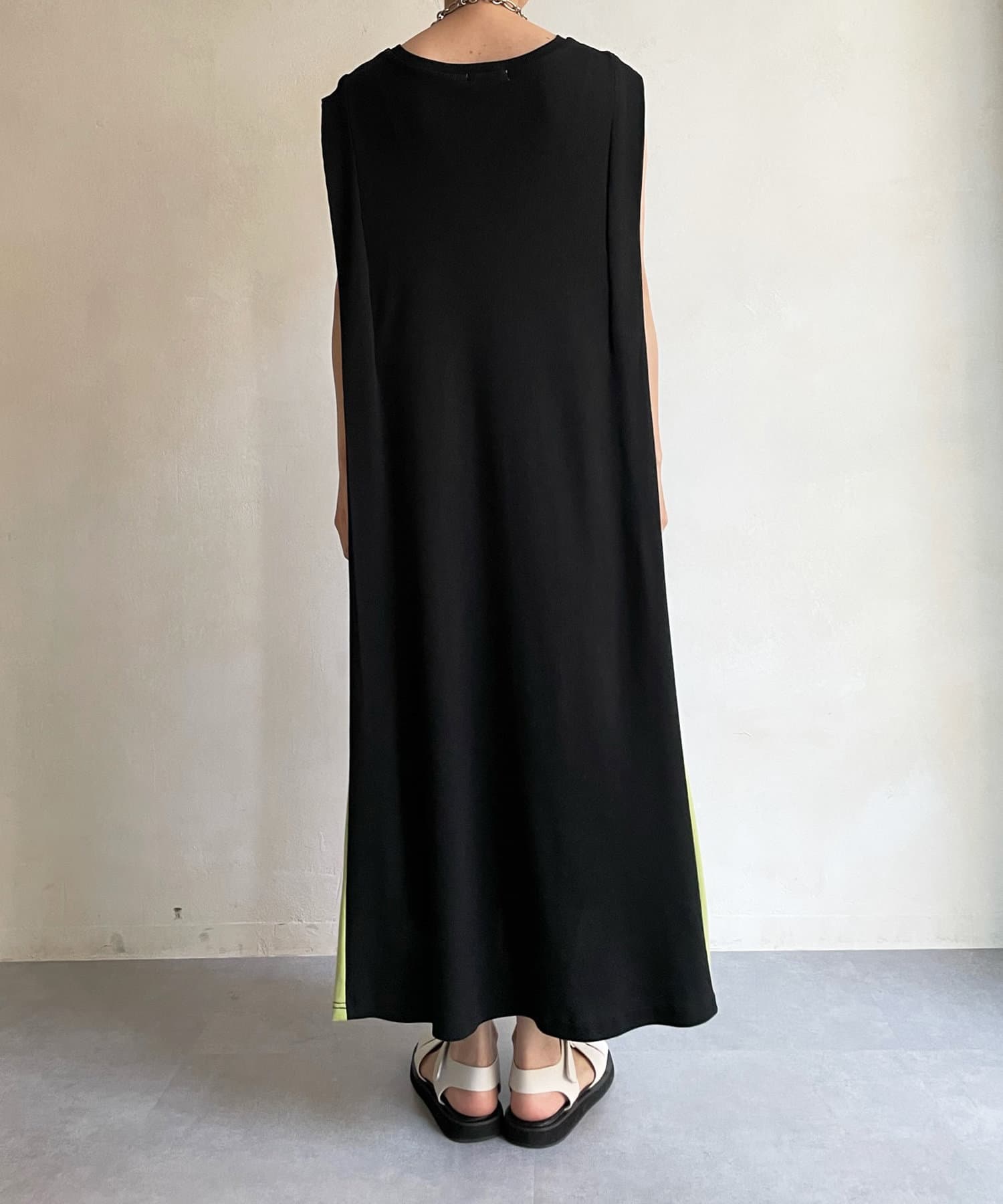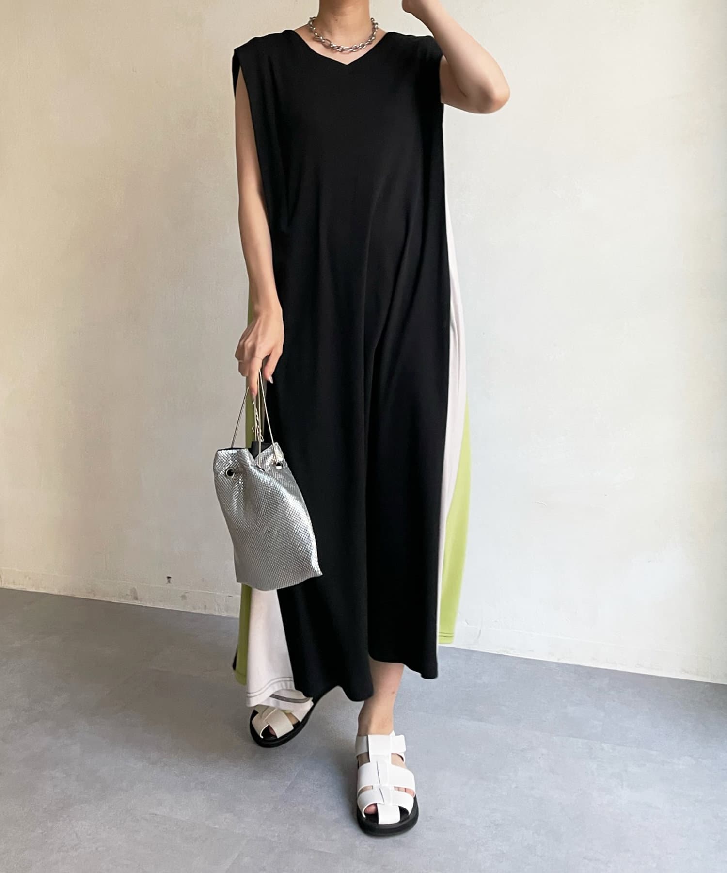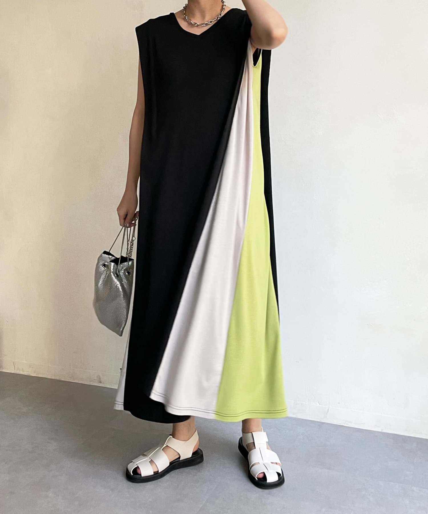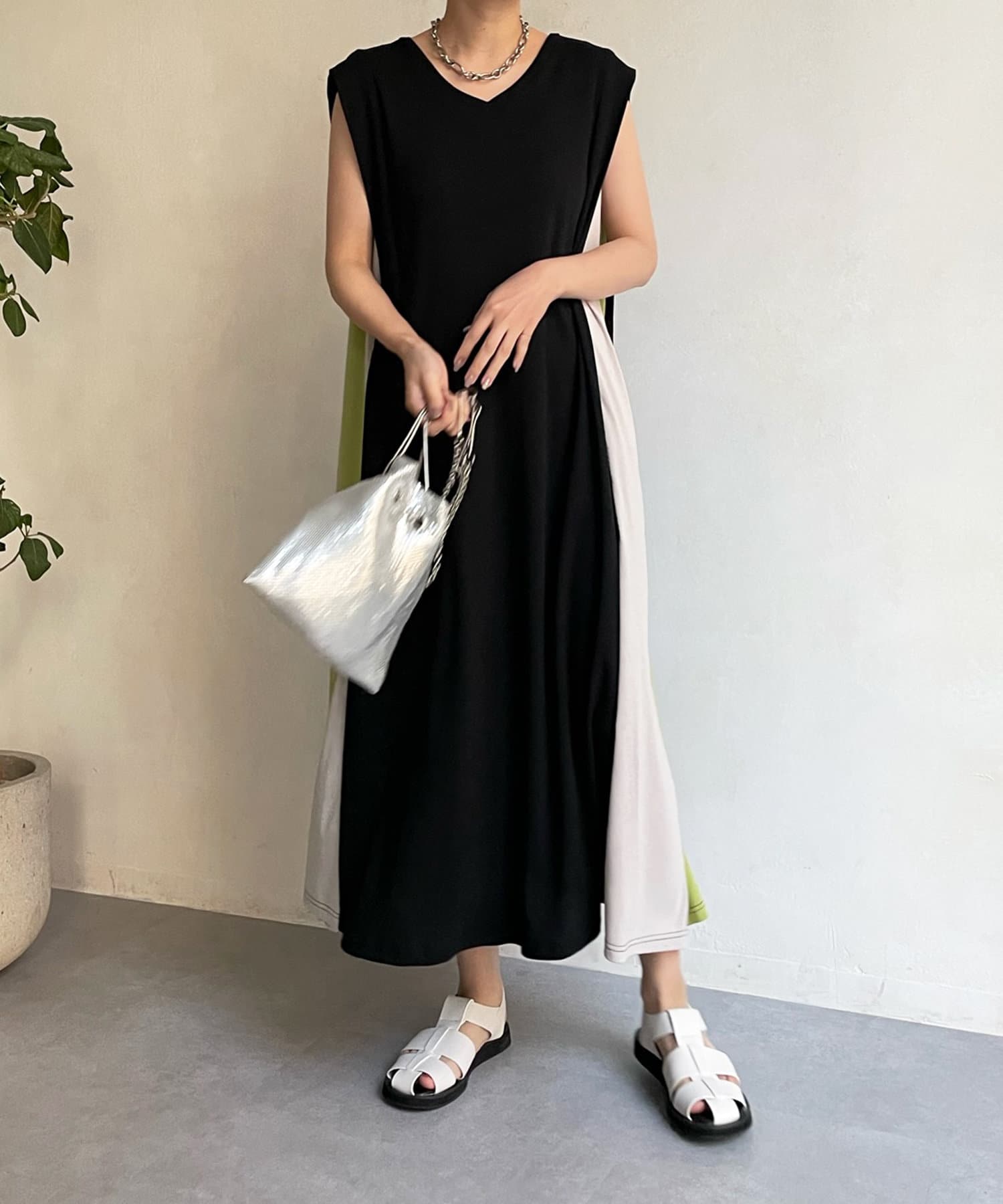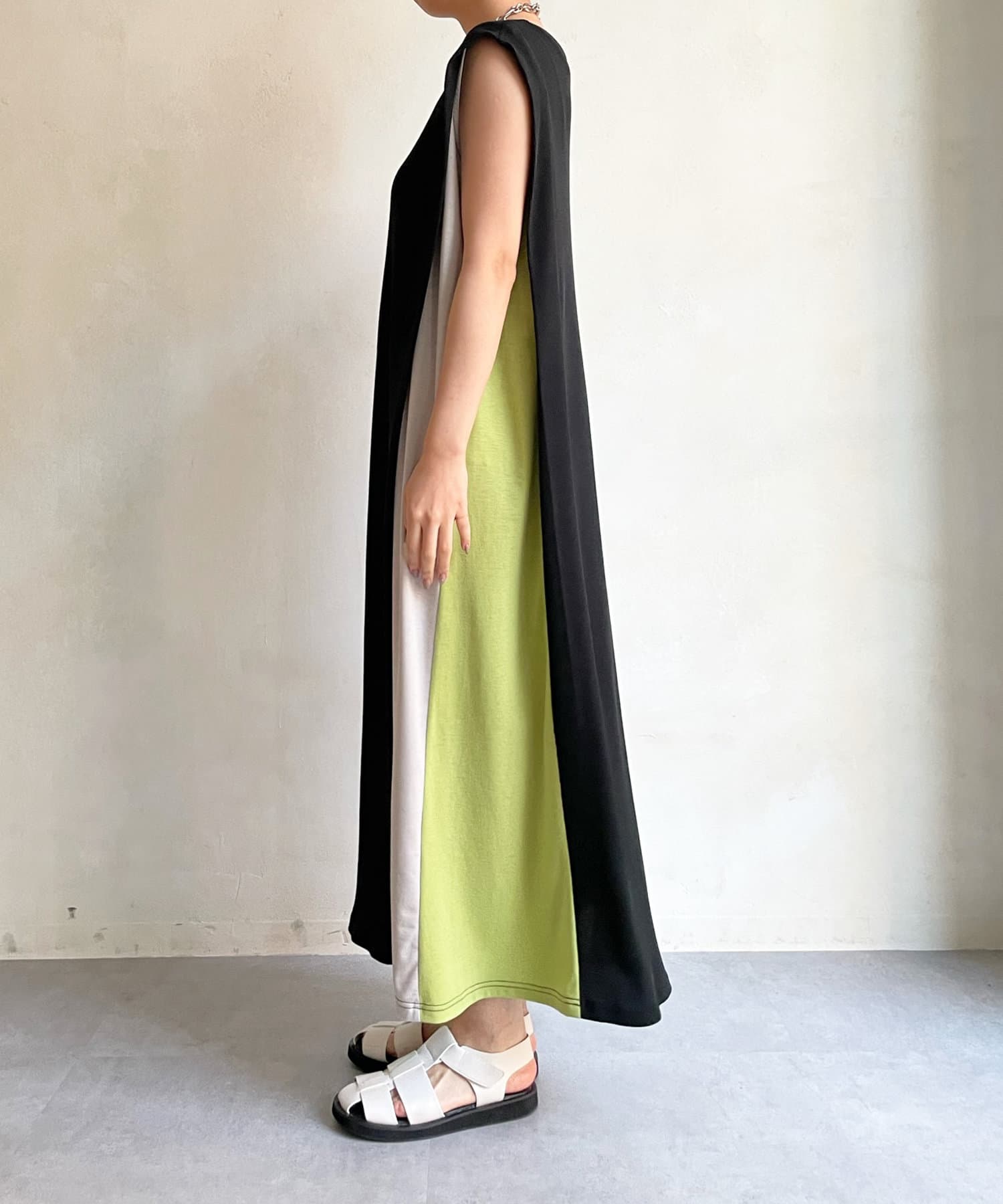 前後身頃はシンプルですが、サイドの配色に切り替えられたカラーが目を惹くデザインワンピース。