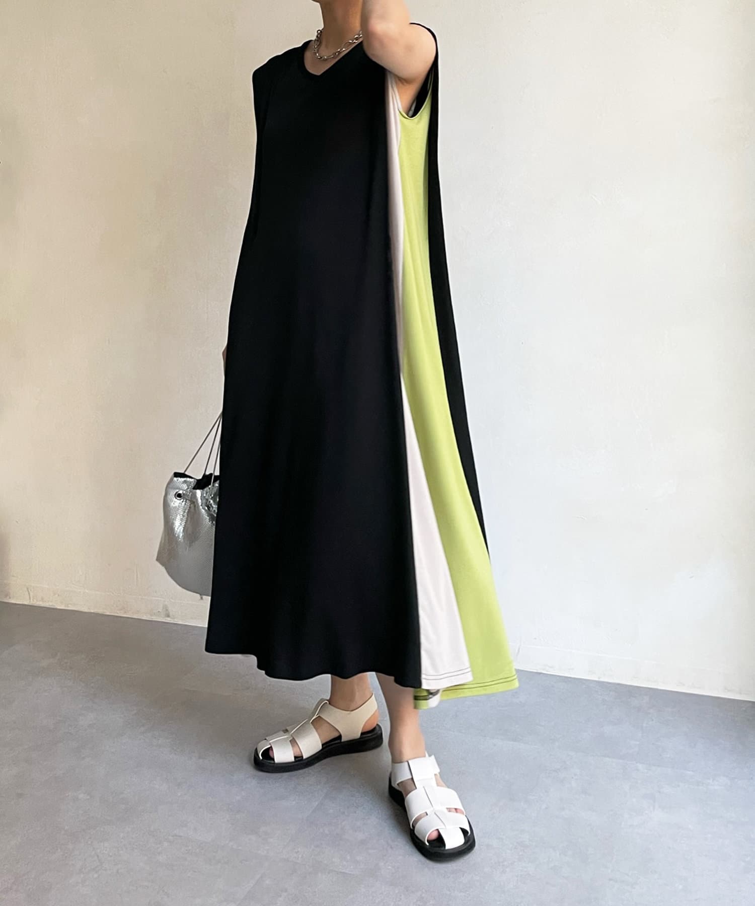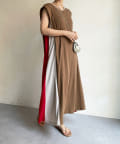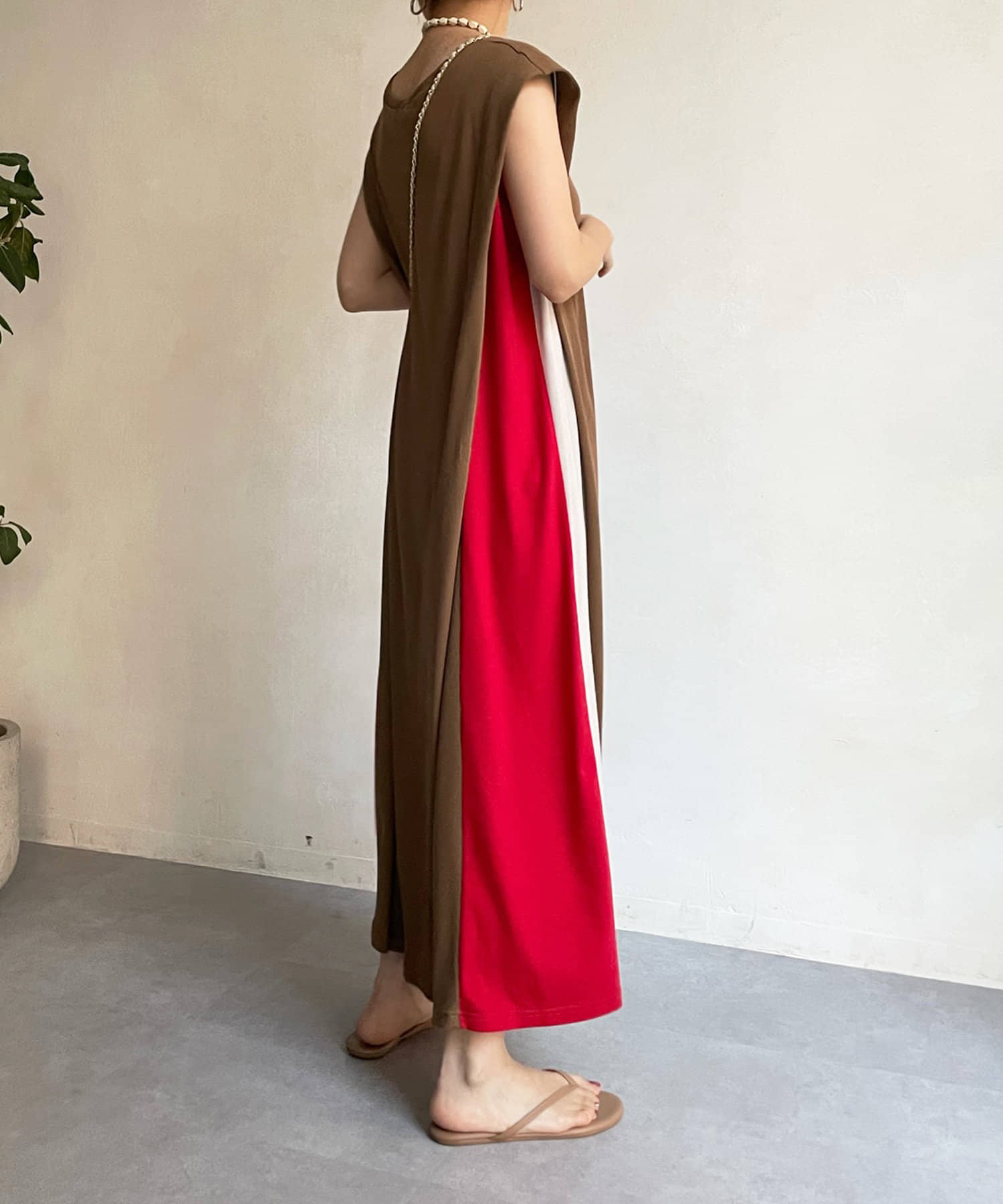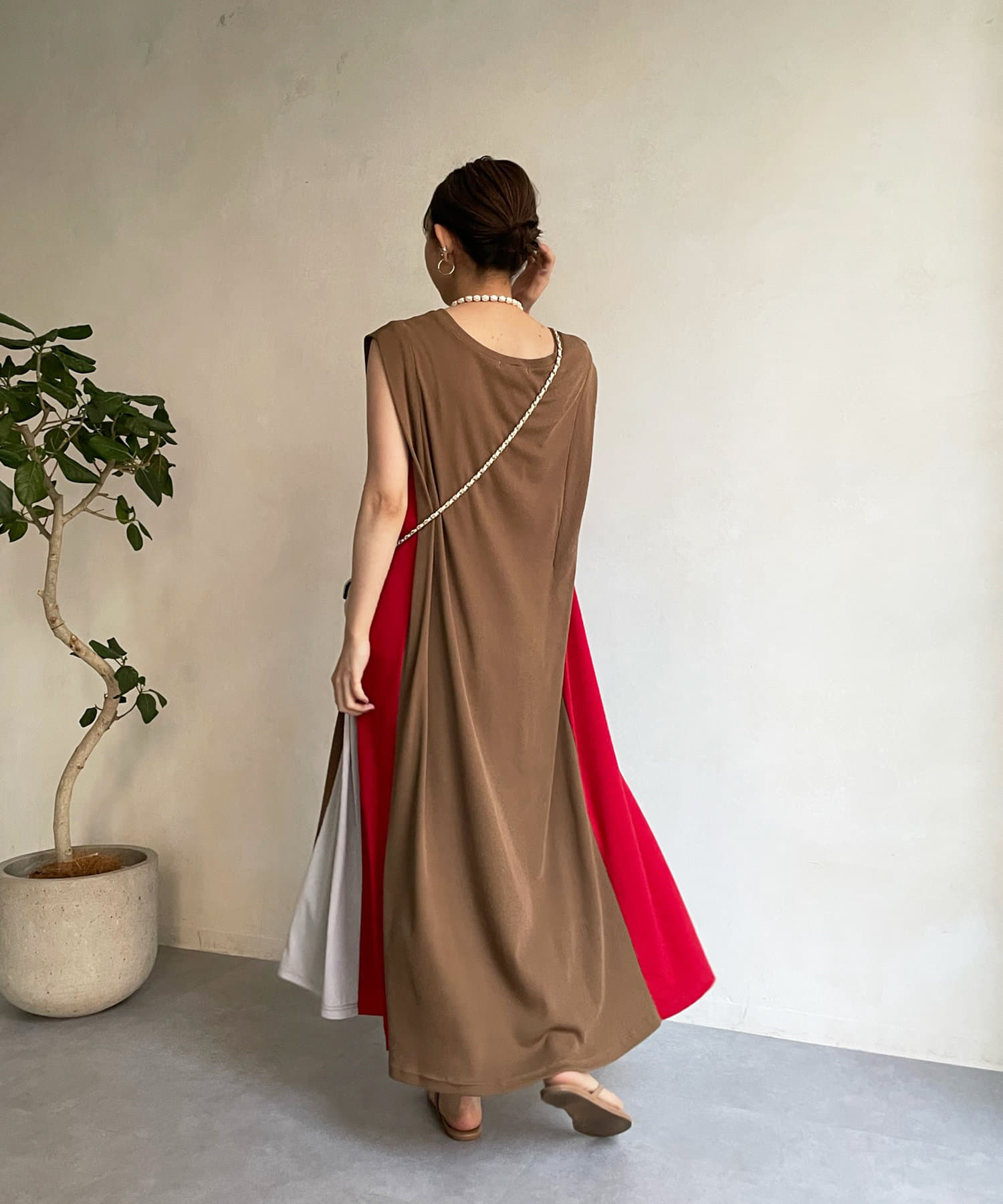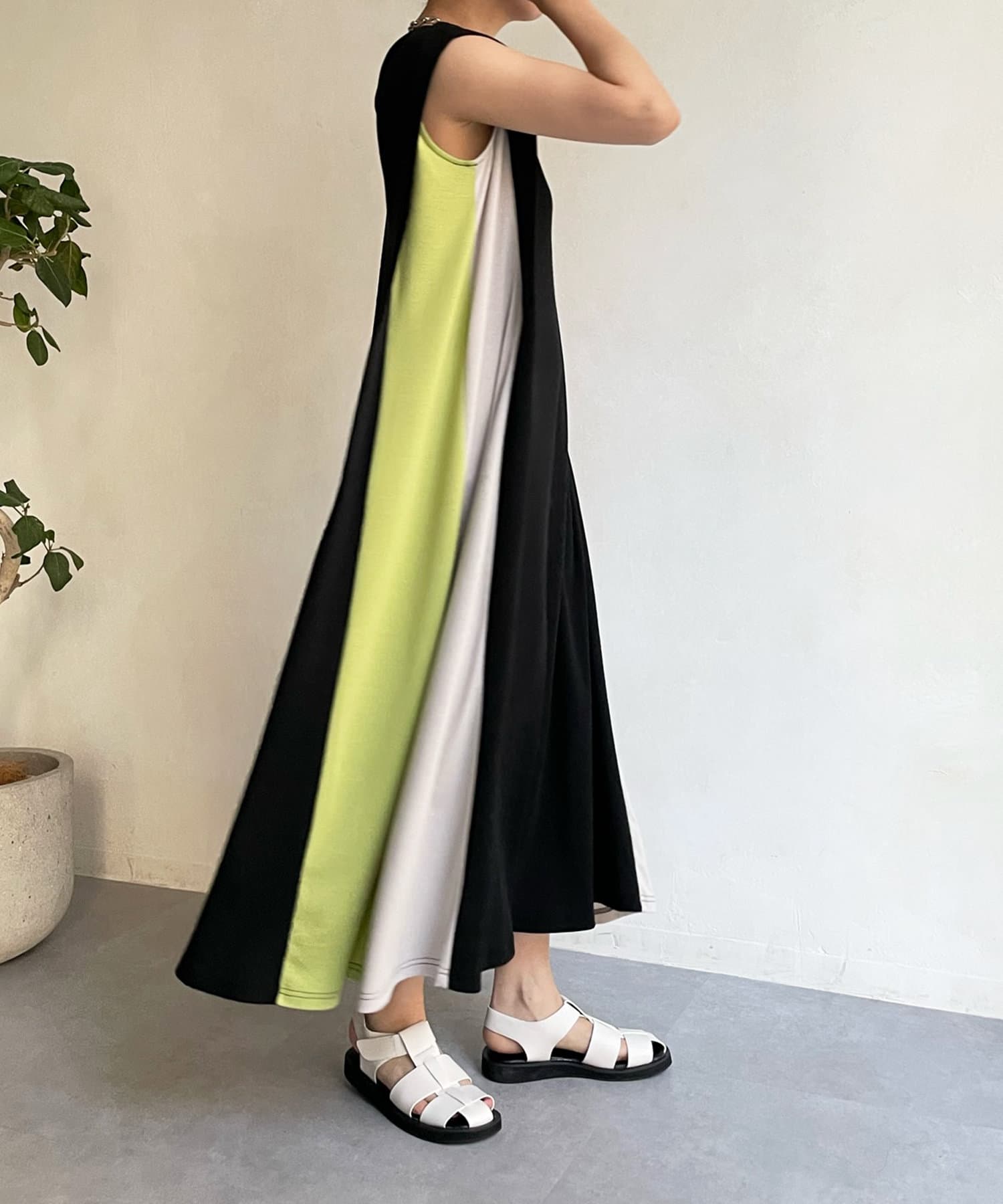前後身頃はシンプルですが、サイドの配色に切り替えられたカラーが目を惹くデザインワンピース。