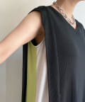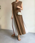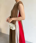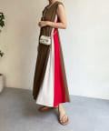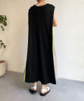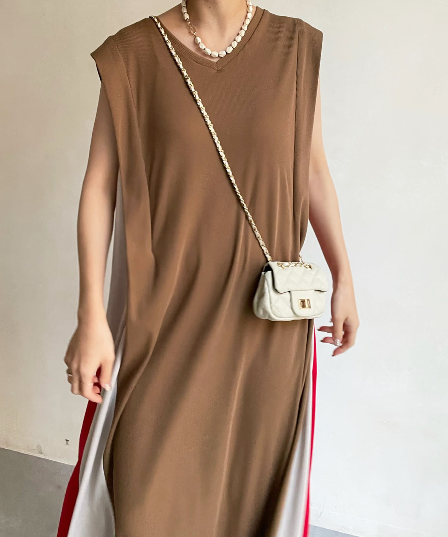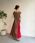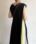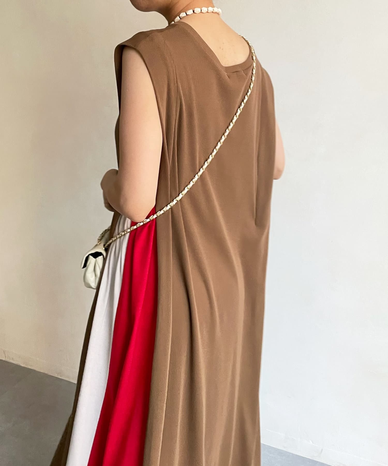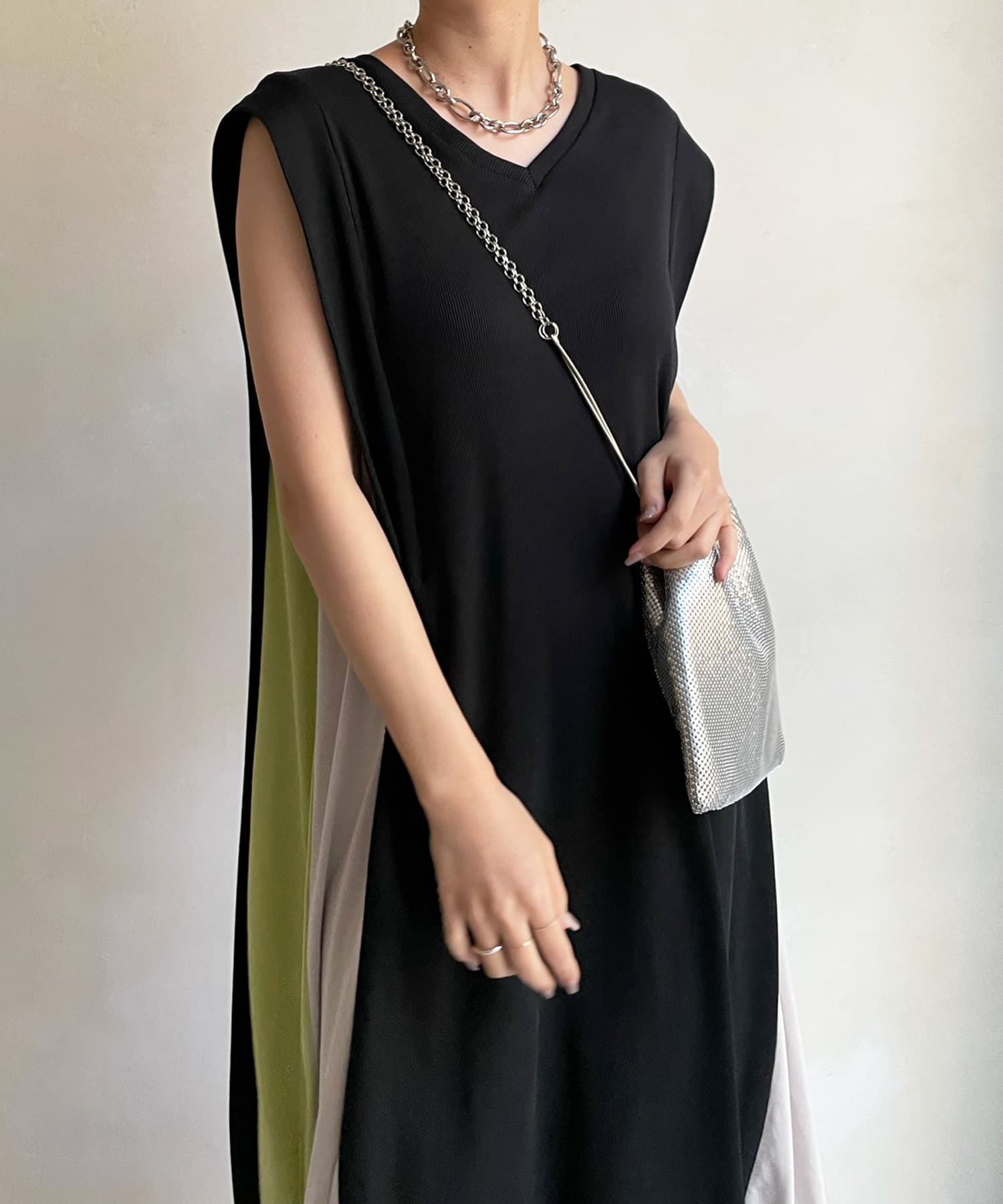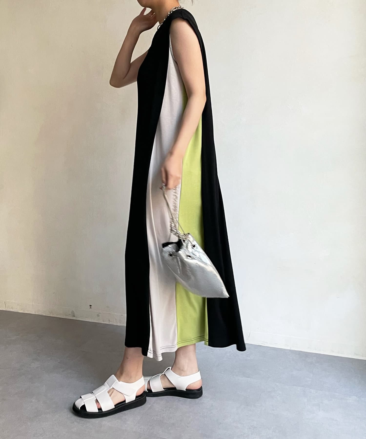 前後身頃はシンプルですが、サイドの配色に切り替えられたカラーが目を惹くデザインワンピース。