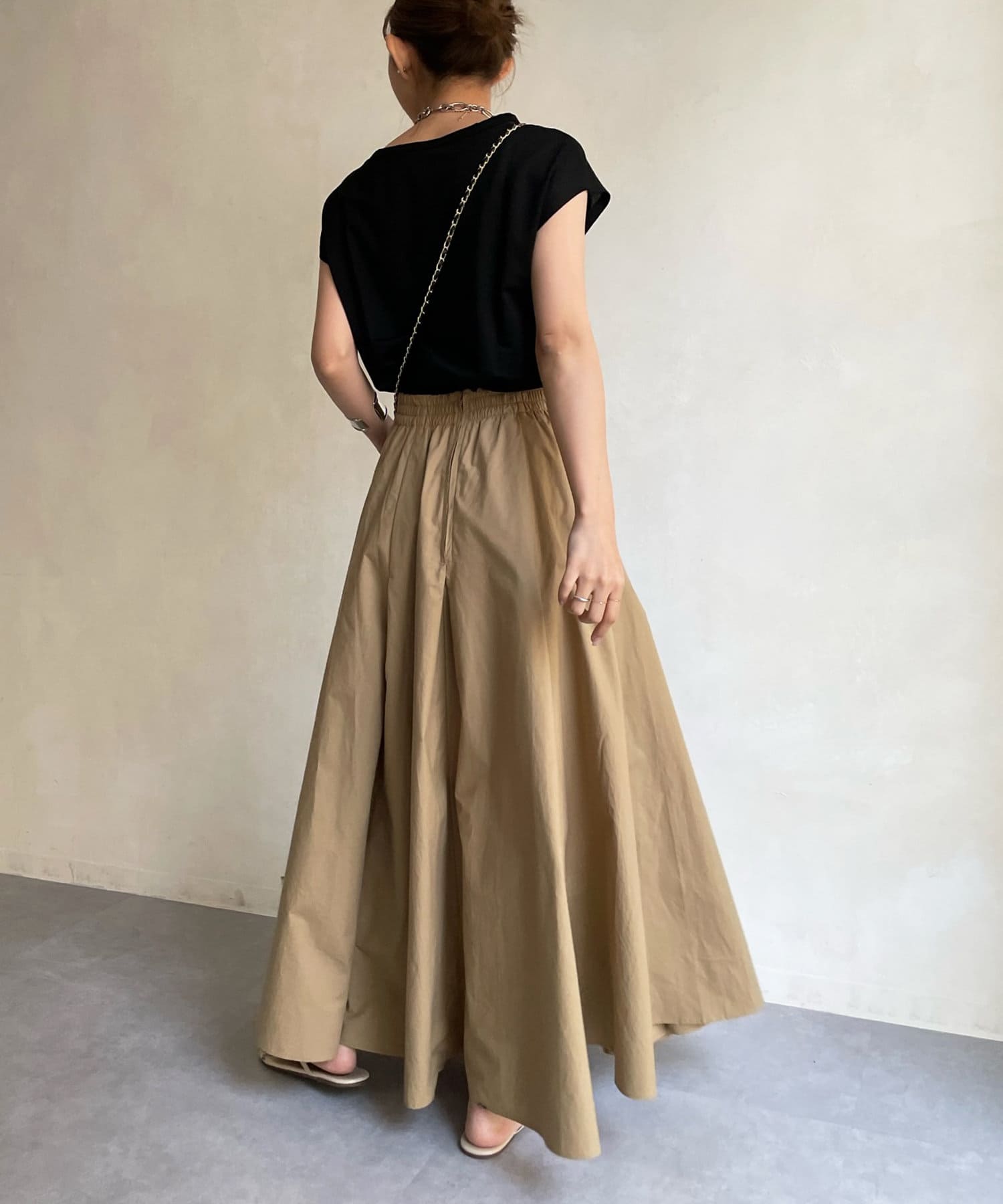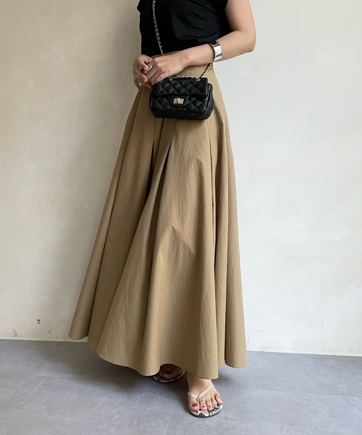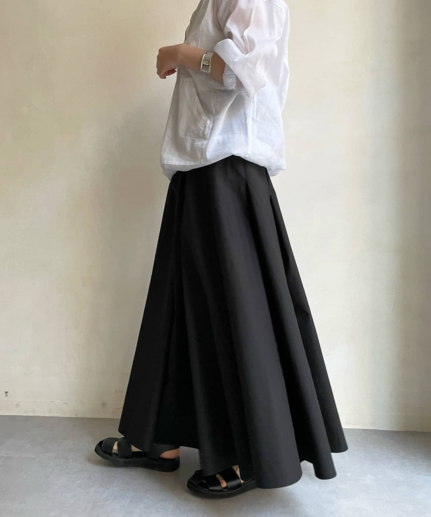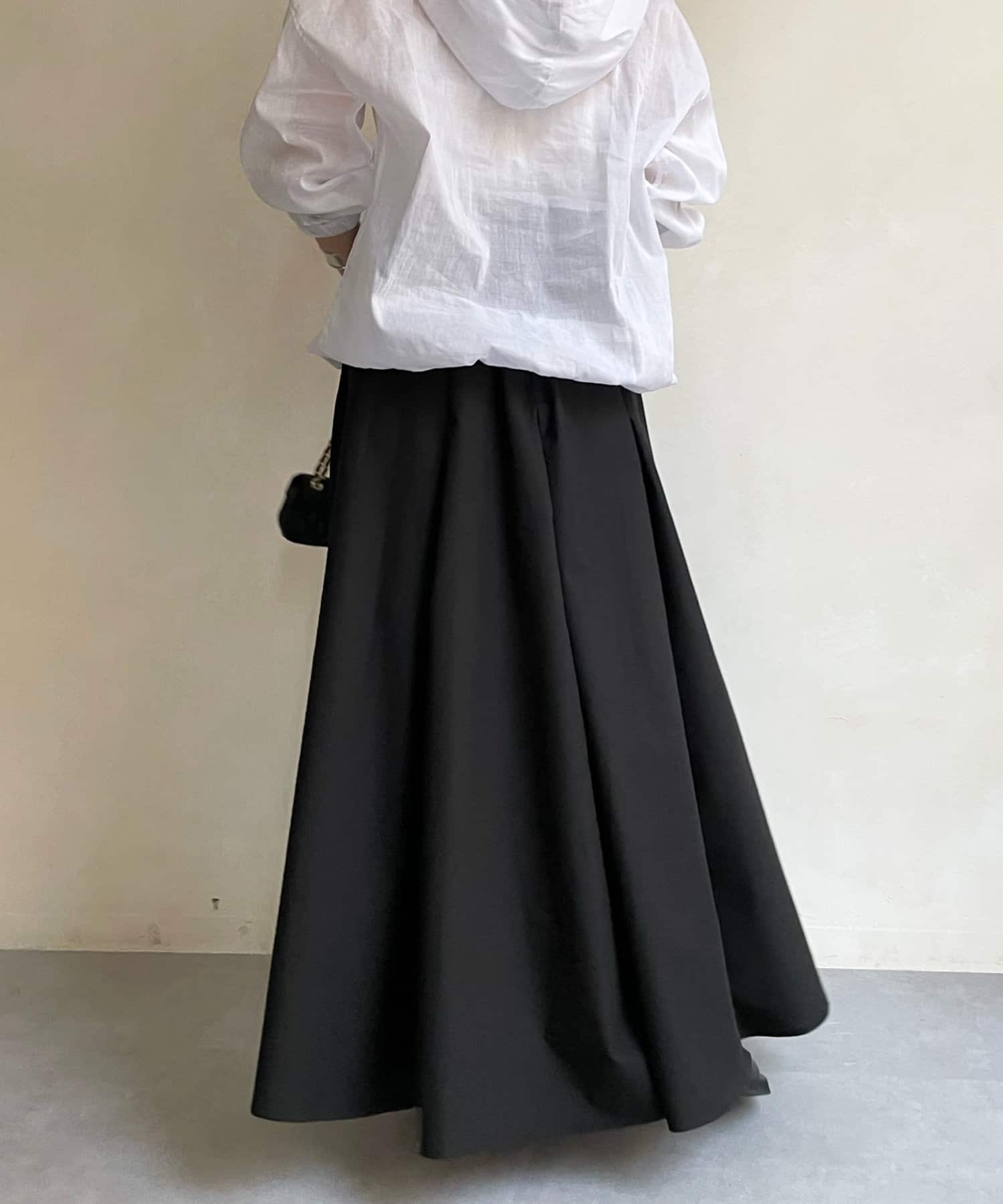 生地をふんだんに使い、タックを入れることで生まれるフレアシルエットが最大の魅力です。