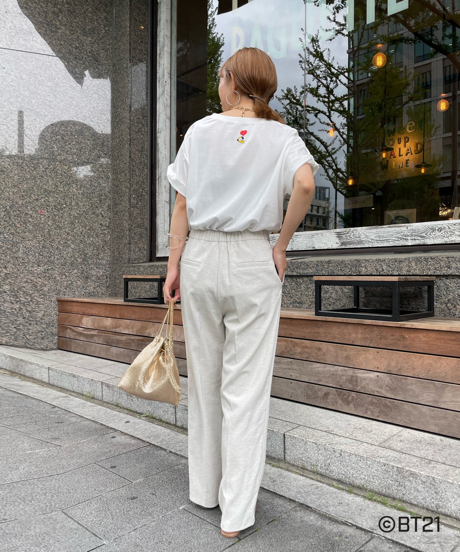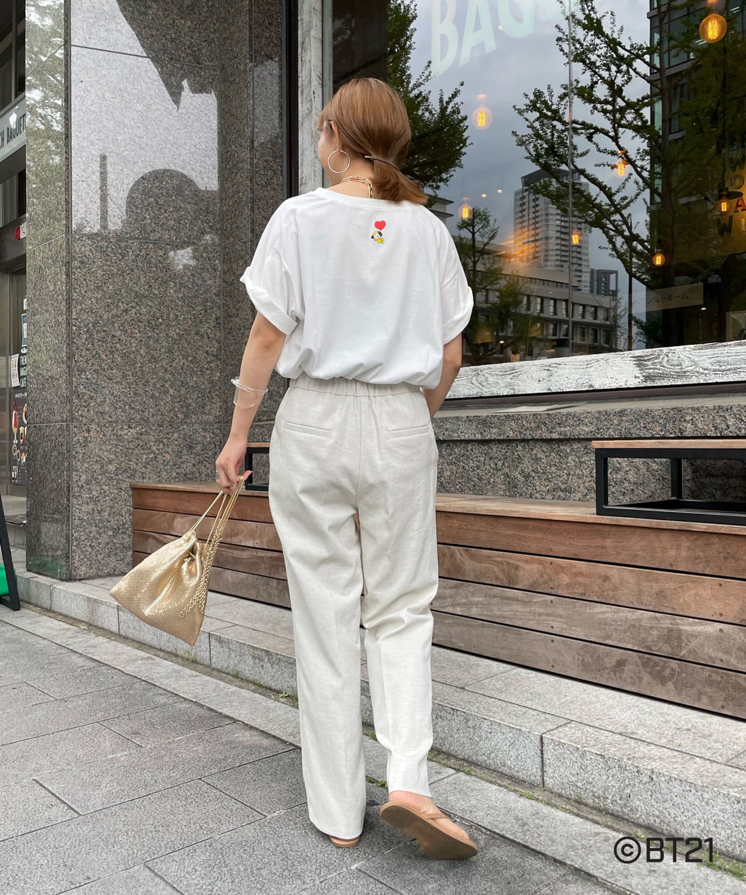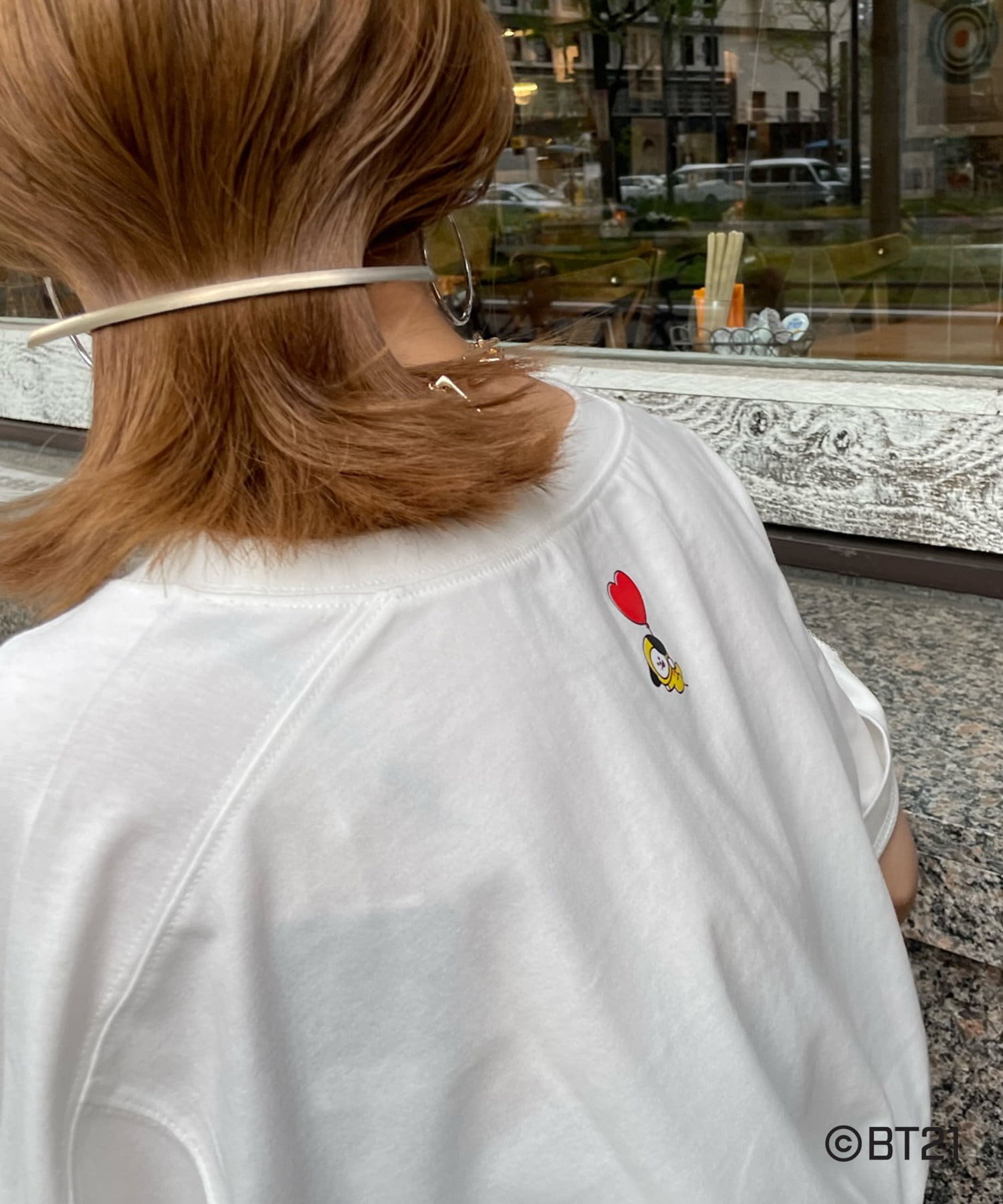 BT21のキャラクターが背中にさり気なくプリントされたオトナの方も着やすいロゴTシャツ。