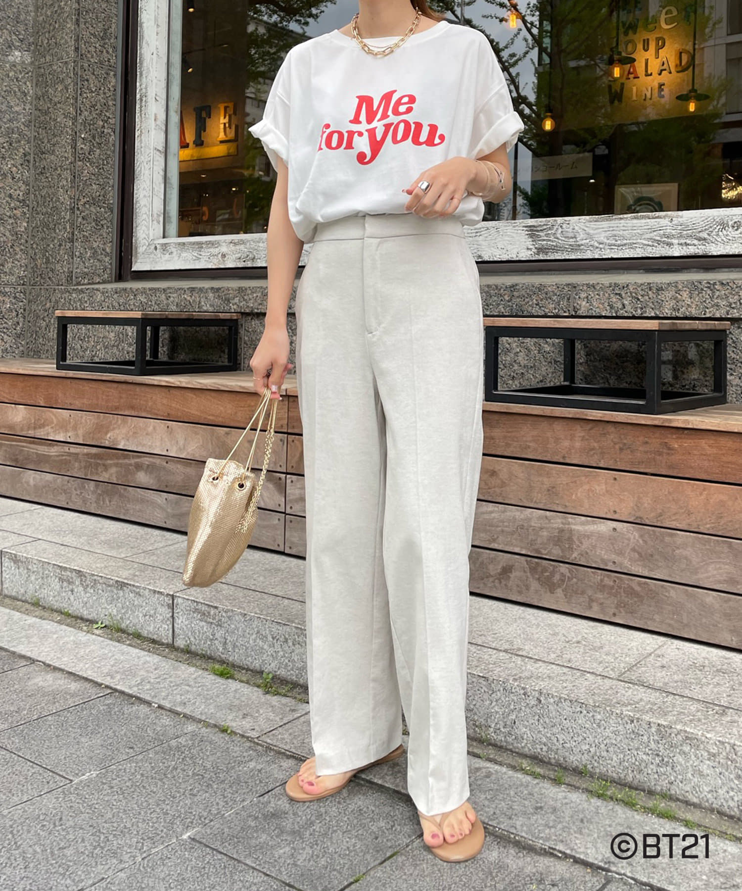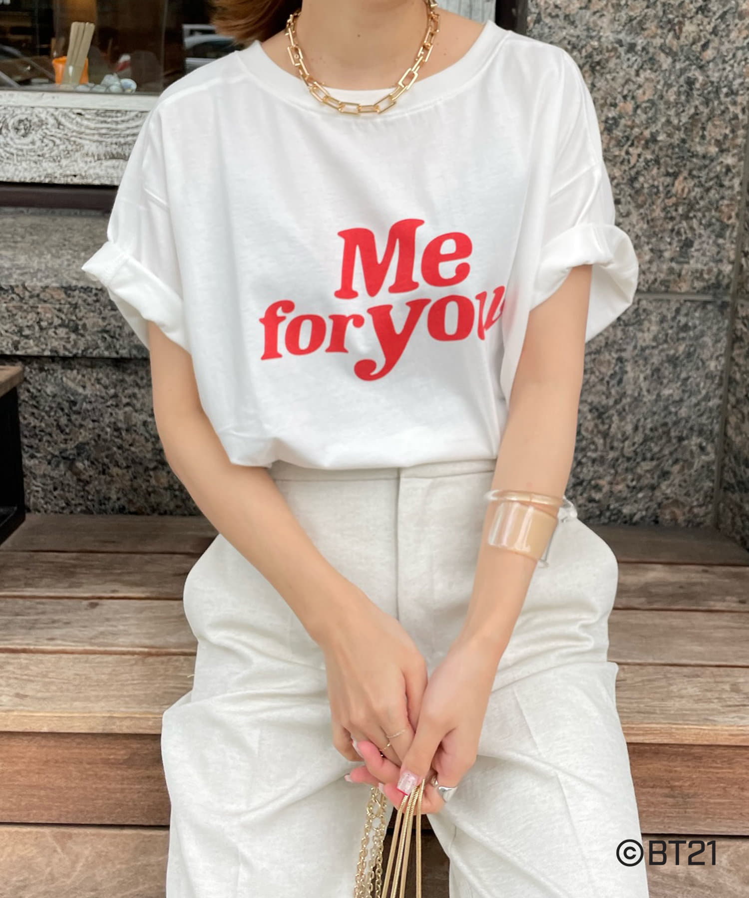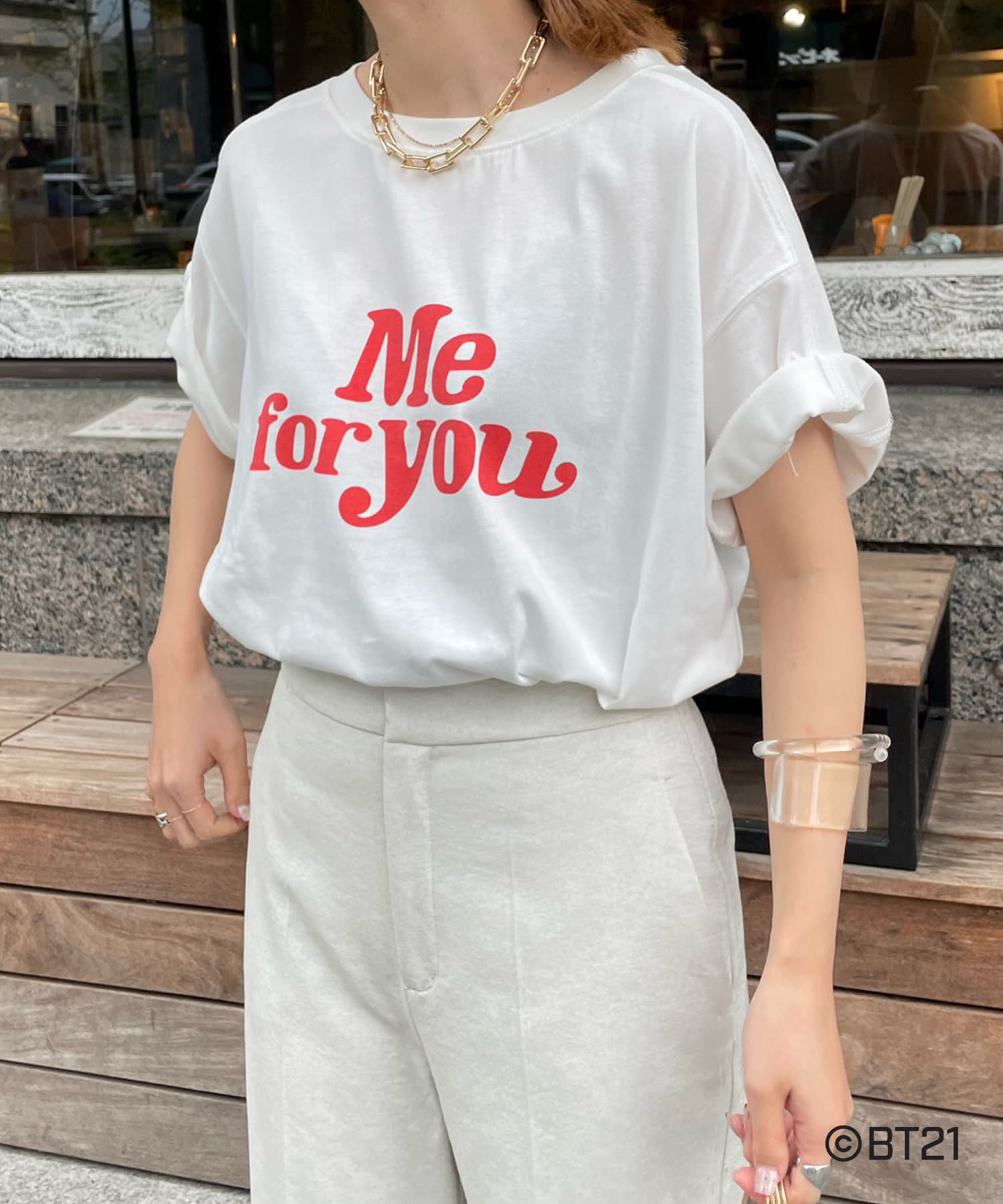 BT21のキャラクターが背中にさり気なくプリントされたオトナの方も着やすいロゴTシャツ。