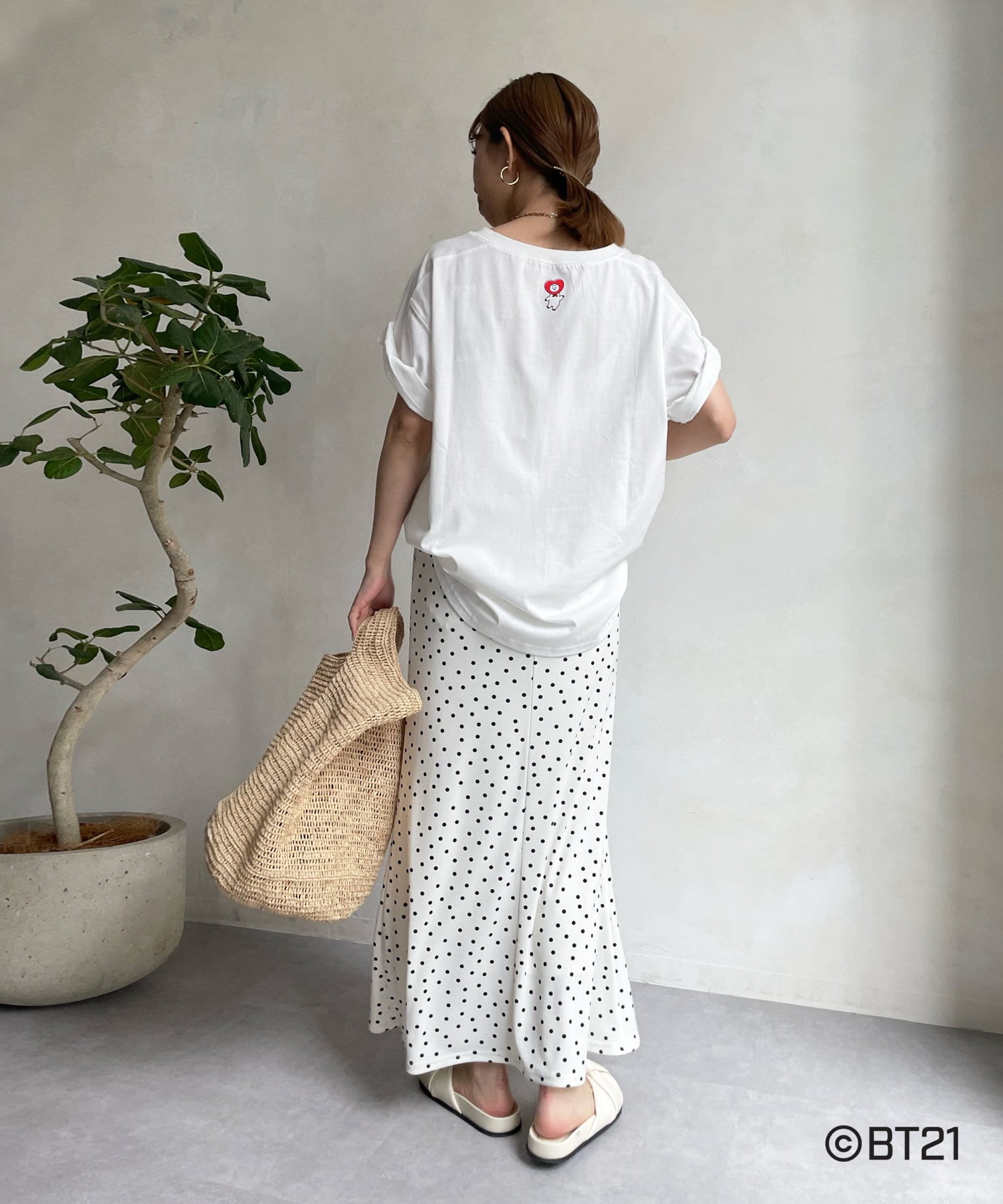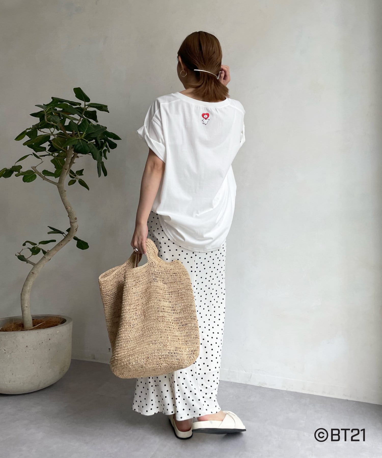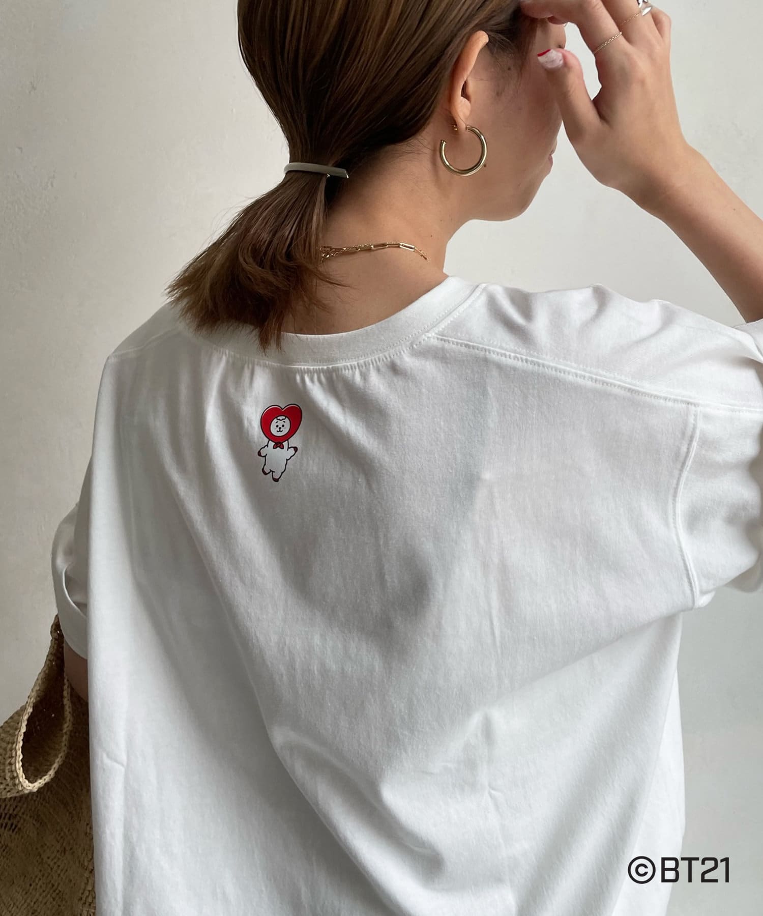 BT21のキャラクターが背中にさり気なくプリントされたオトナの方も着やすいロゴTシャツ。