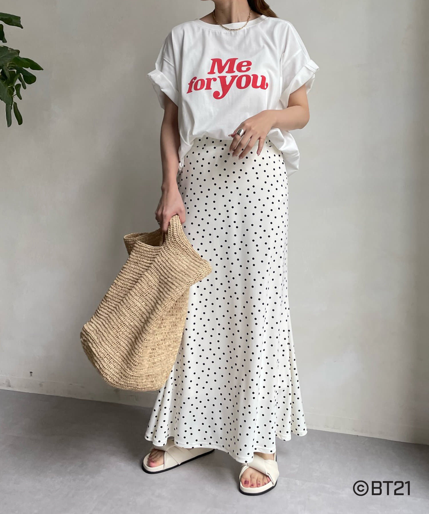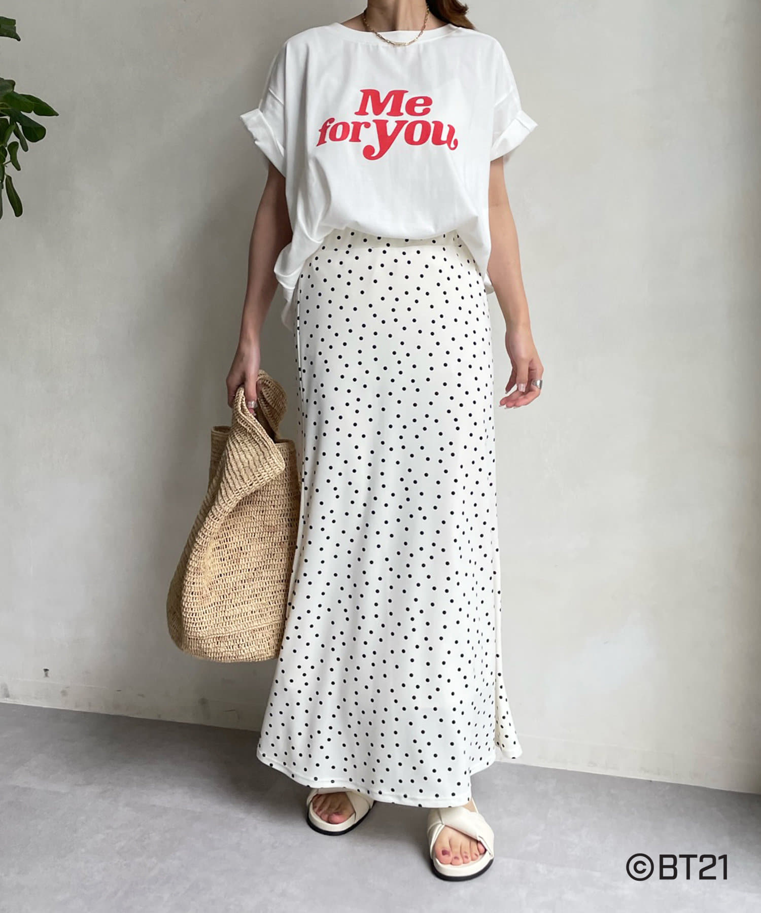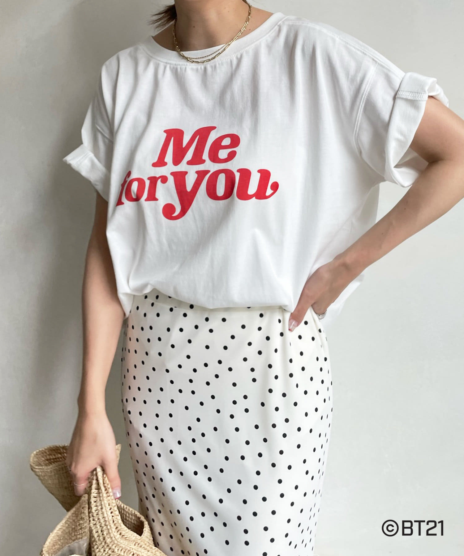 BT21のキャラクターが背中にさり気なくプリントされたオトナの方も着やすいロゴTシャツ。