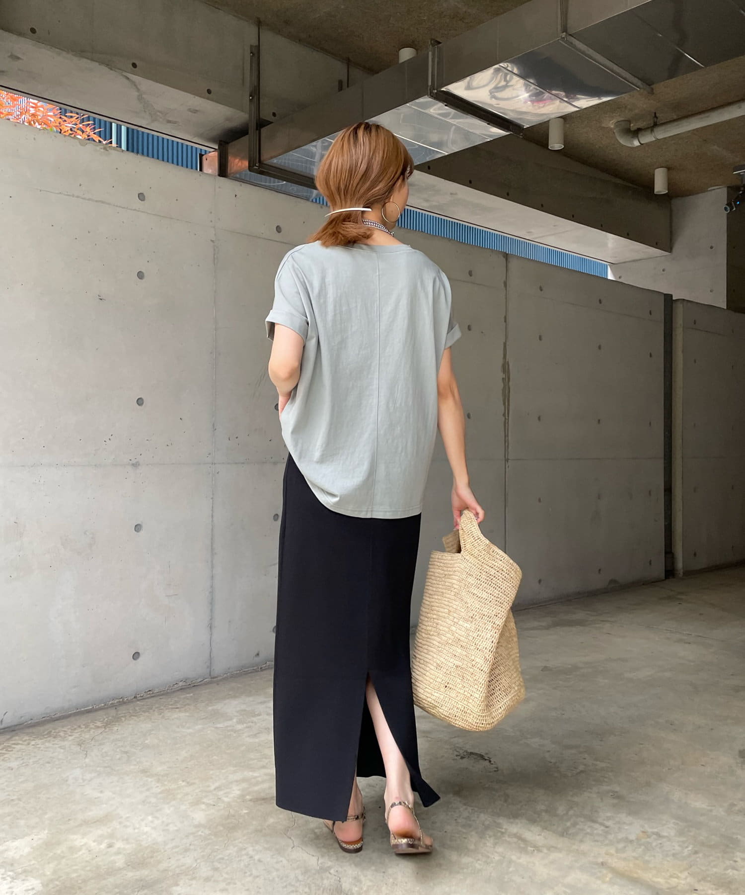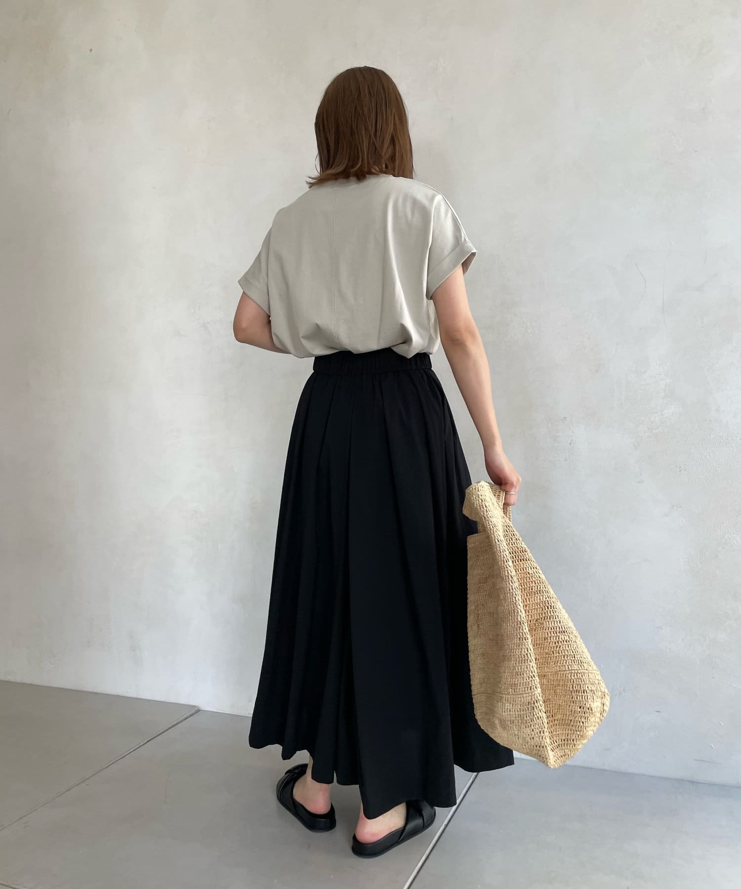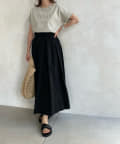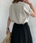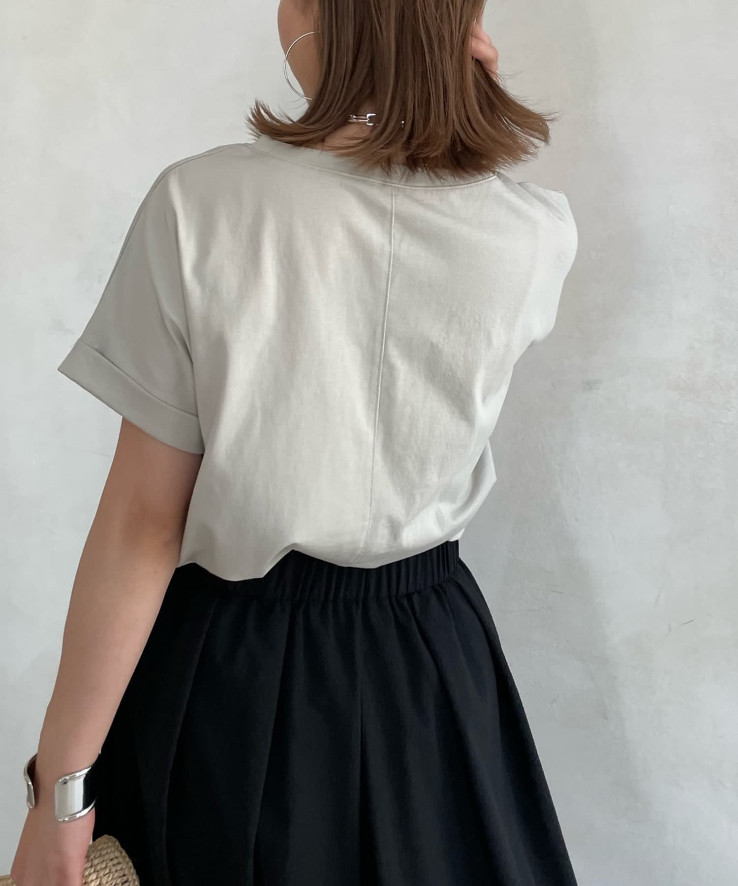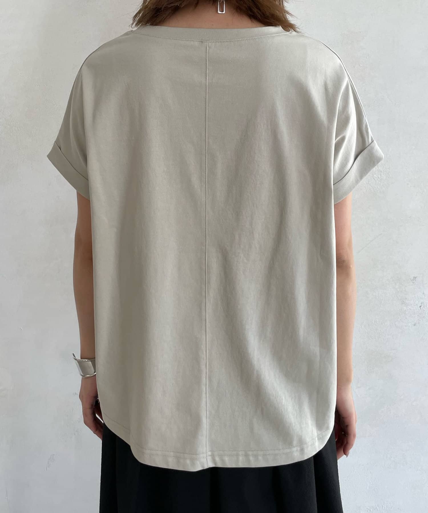 前後で丈感に差が少しあり、後ろはさりげなくラウンドカットになっているので、アウトスタイルでも可愛く着て頂けます。ロールアップされた袖がこなれ感も◎