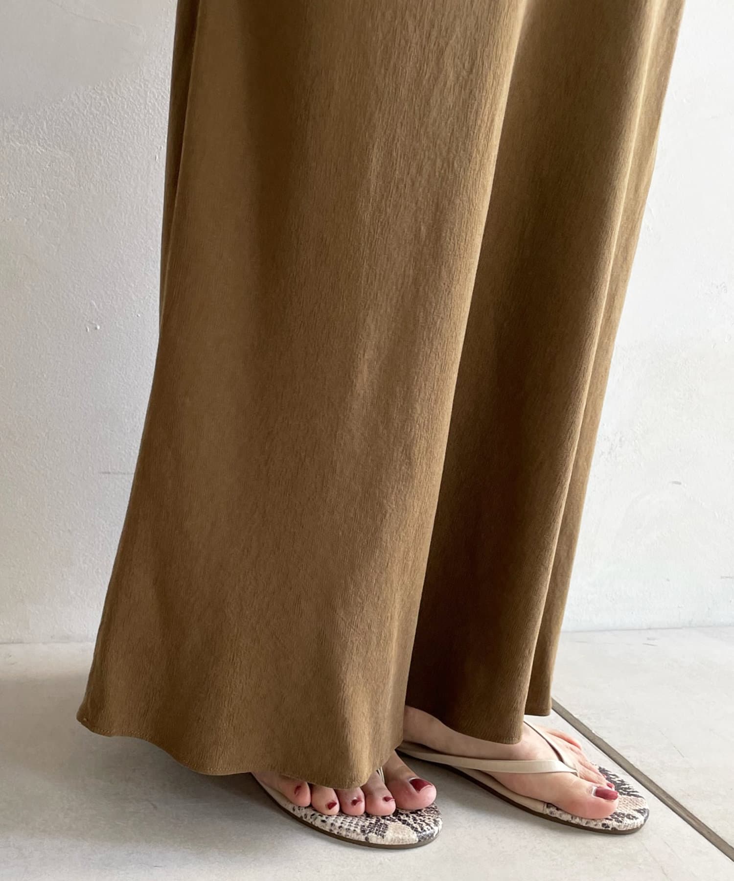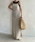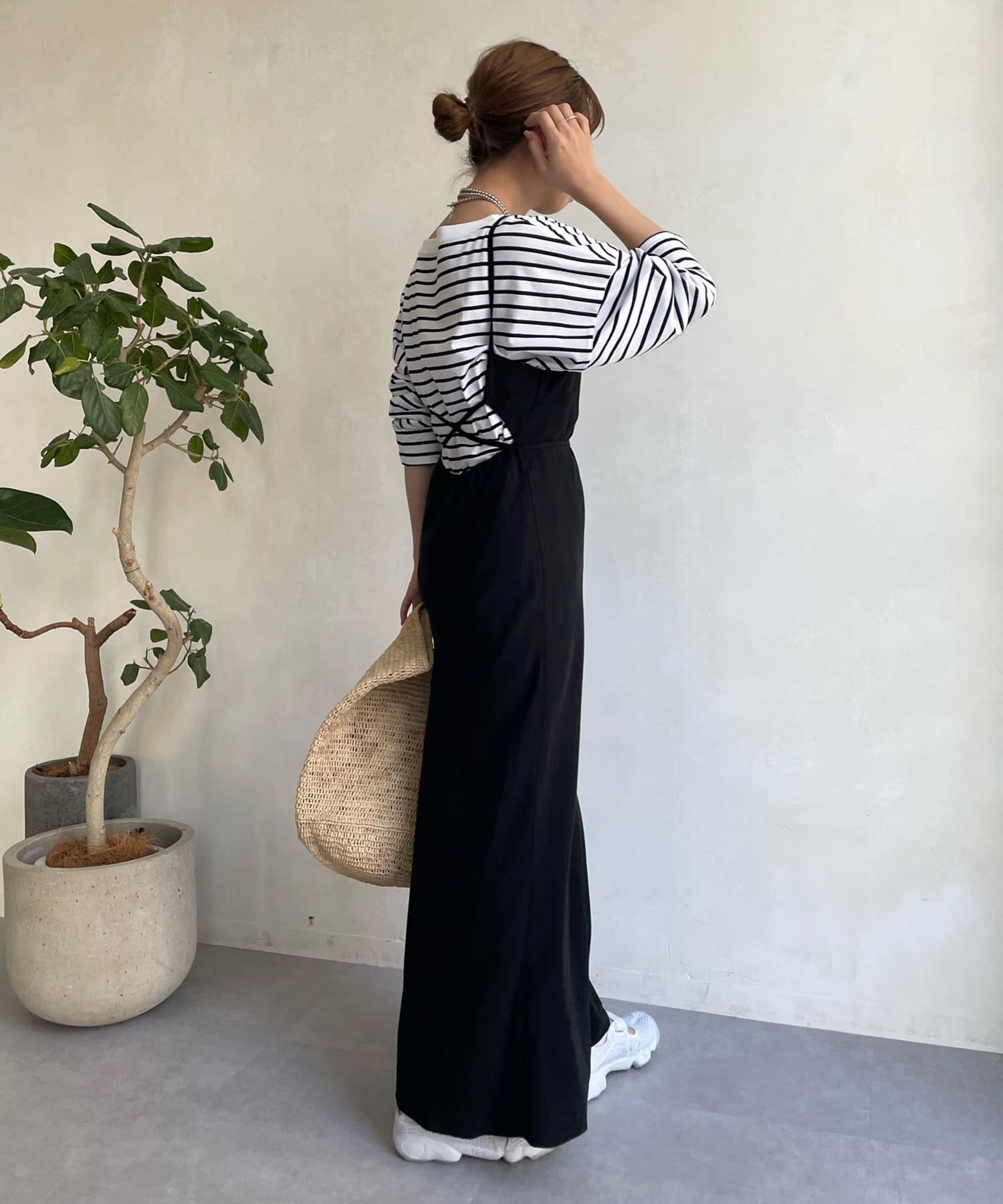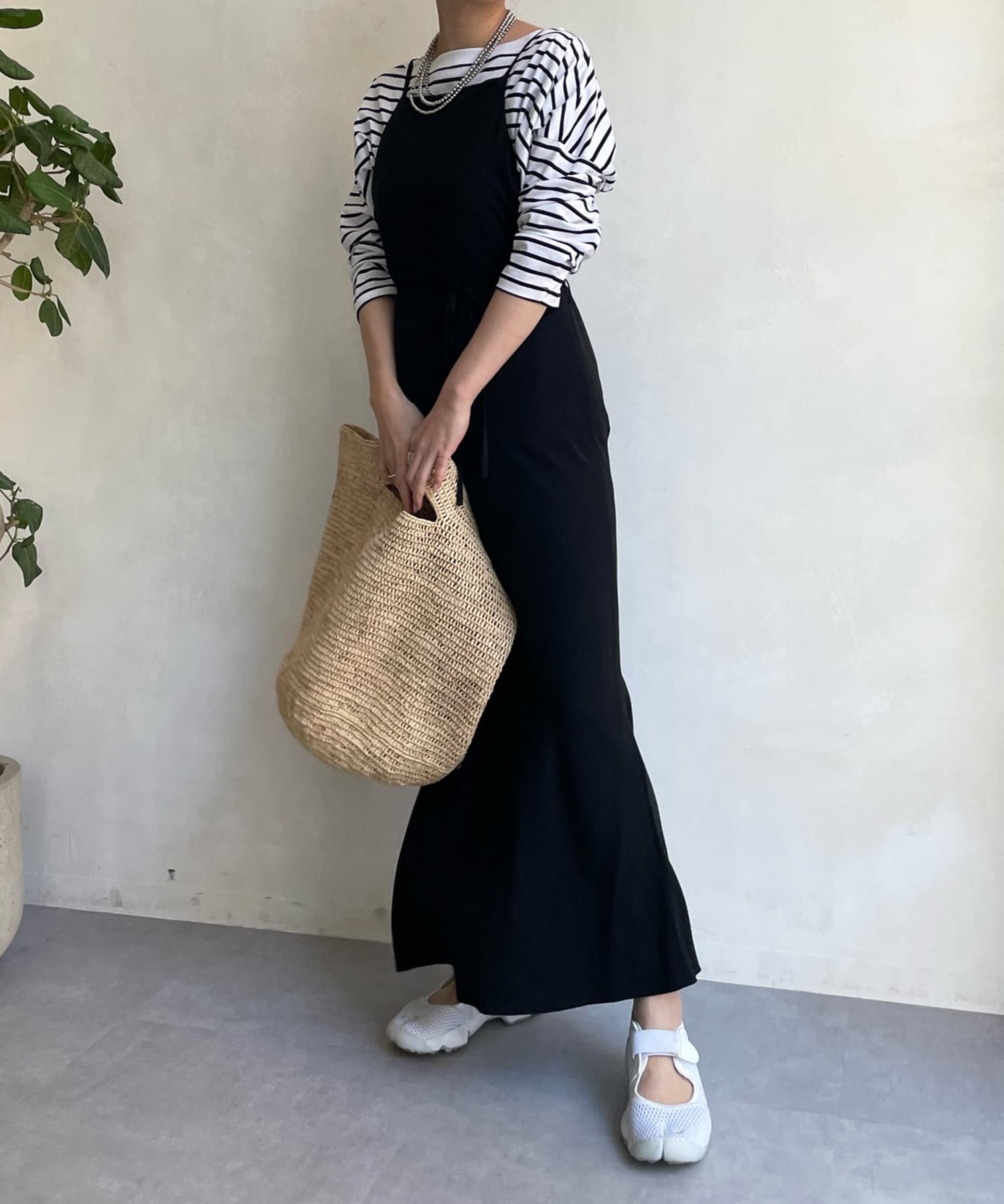 まだ涼しい季節には、ジャケットやブルゾンとのスタイル。夏は涼し気にアメスリタンクや、コンパクトなトップスと合わせて楽しみたい1着です。
