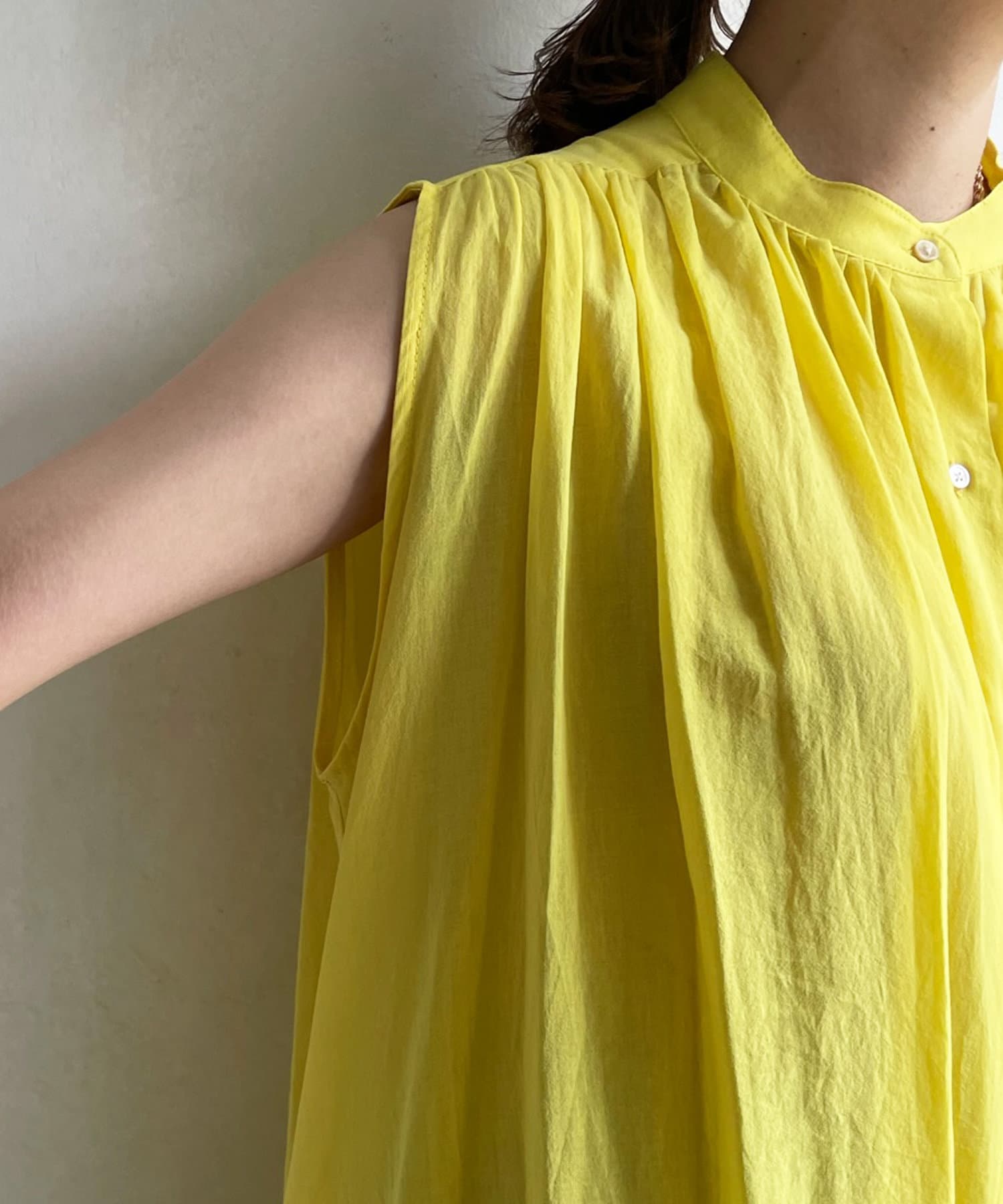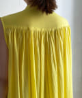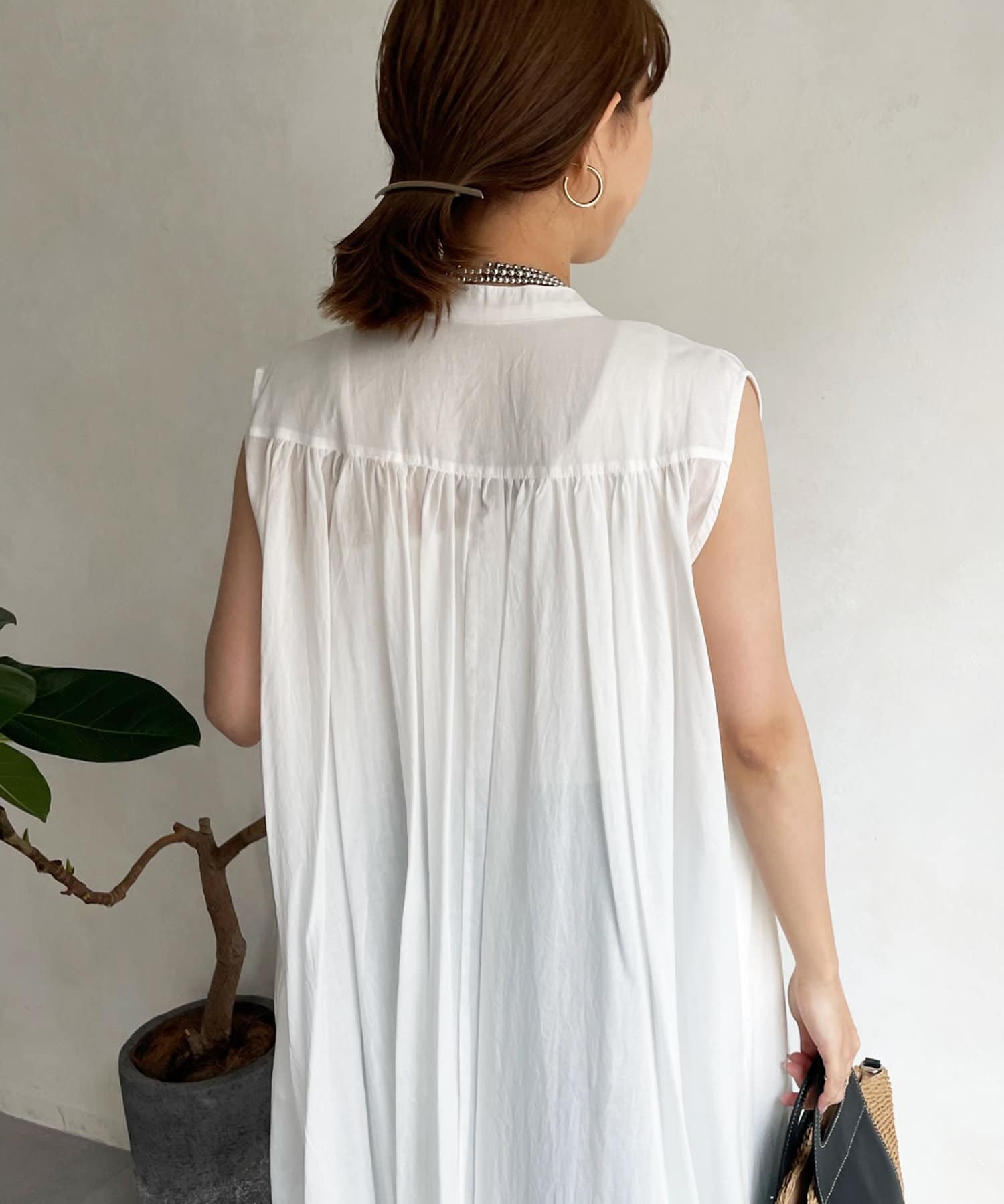 最大のポイントは、ショルダーのラインとバックにたっぷりと入ったギャザー。どこから見ても着映えるデザインです。