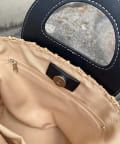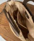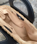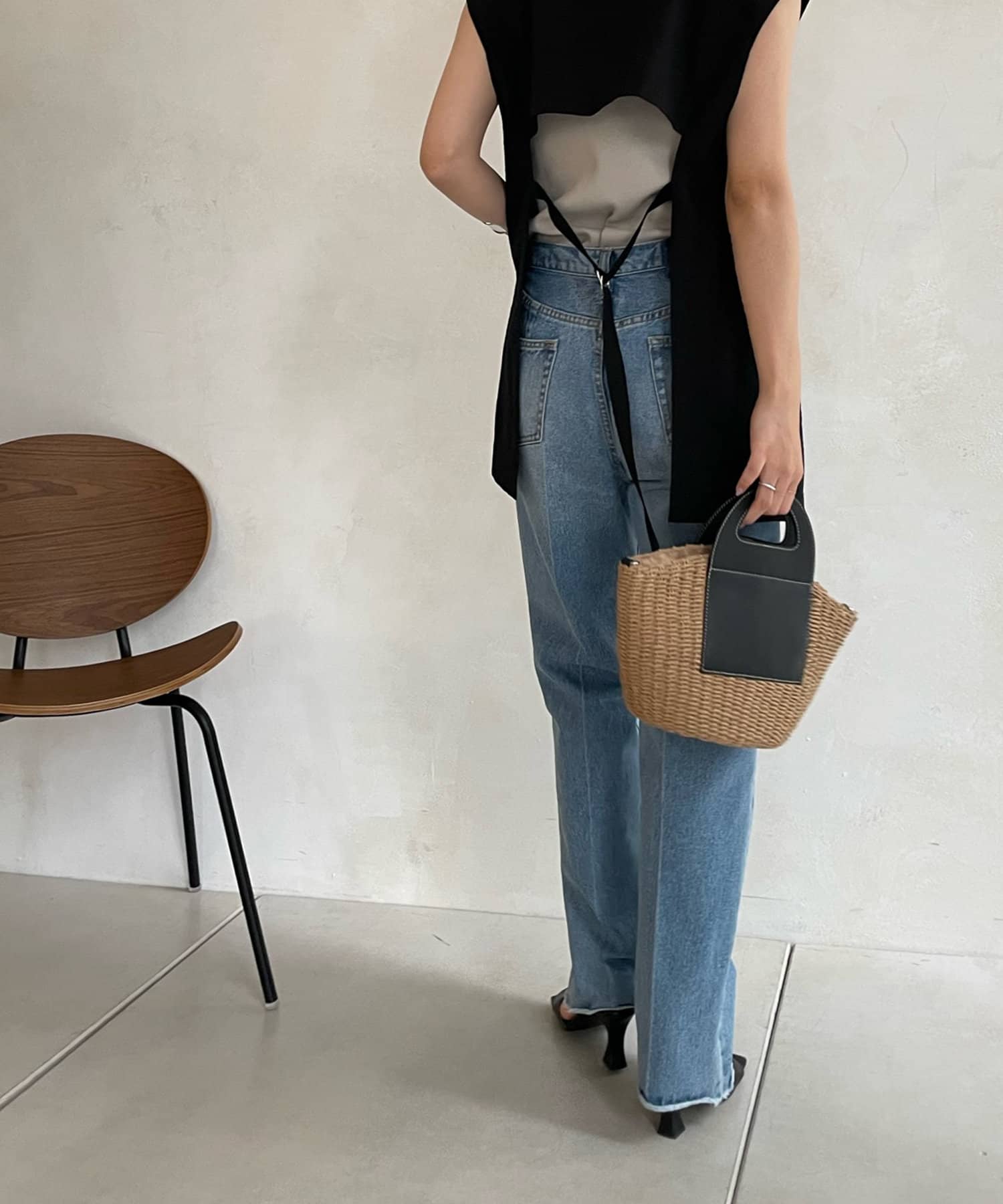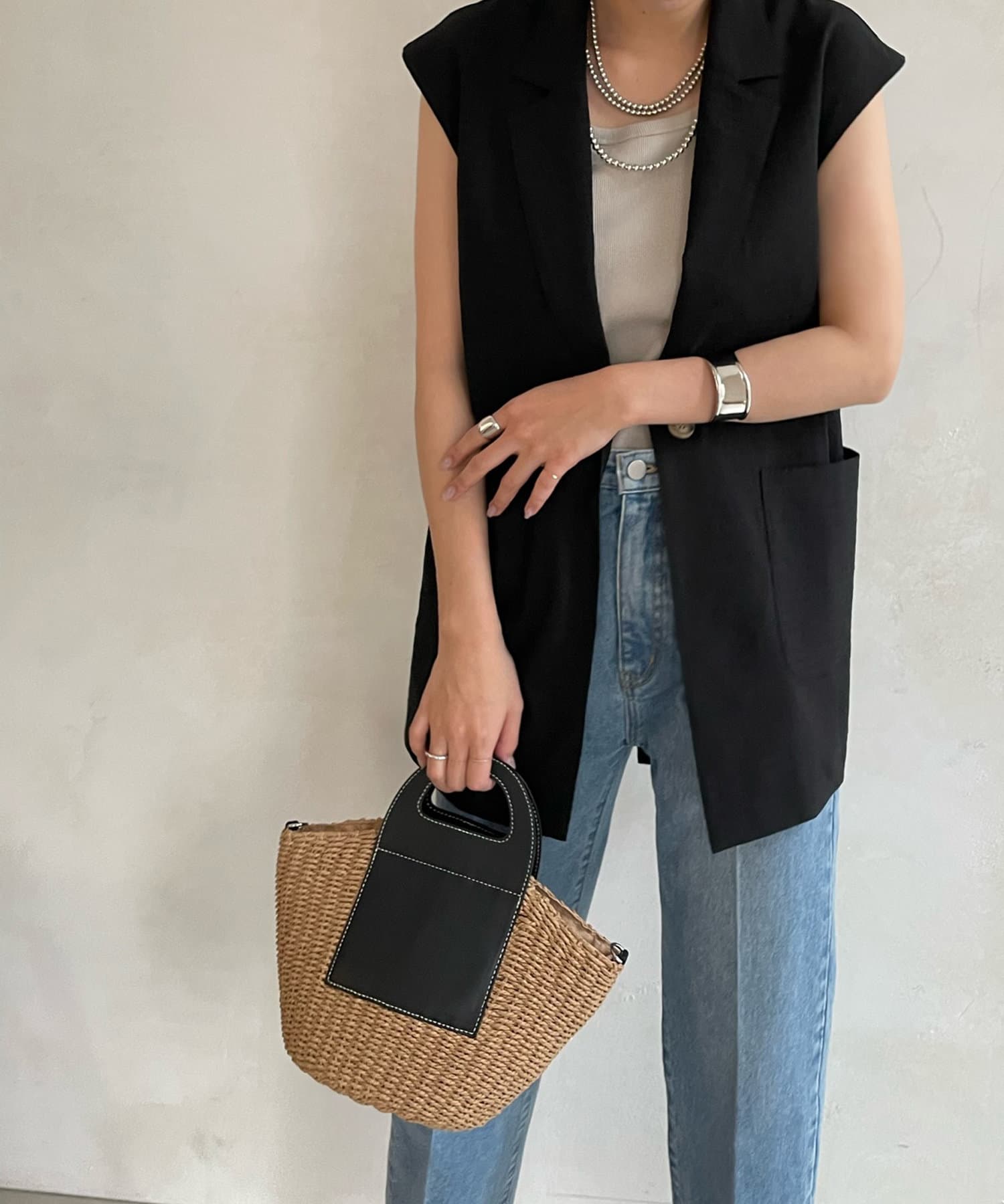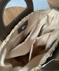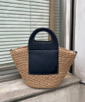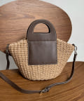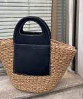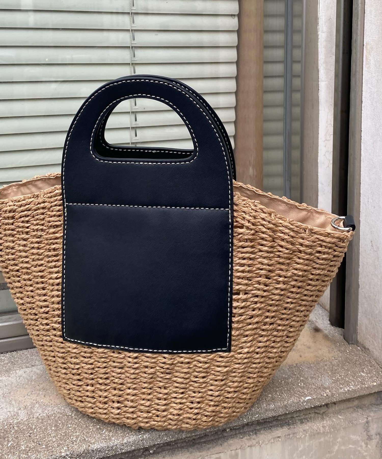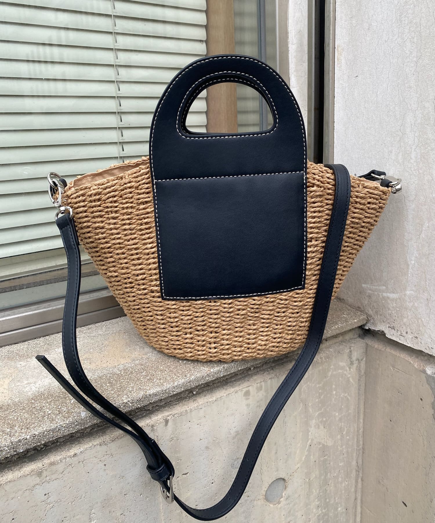 半月型のクリ手ハンドルとレザー調に切り替えられたデザインがコーディネートのアクセントになるカゴバック。