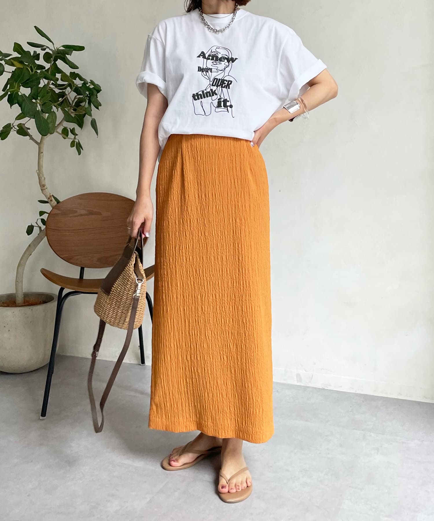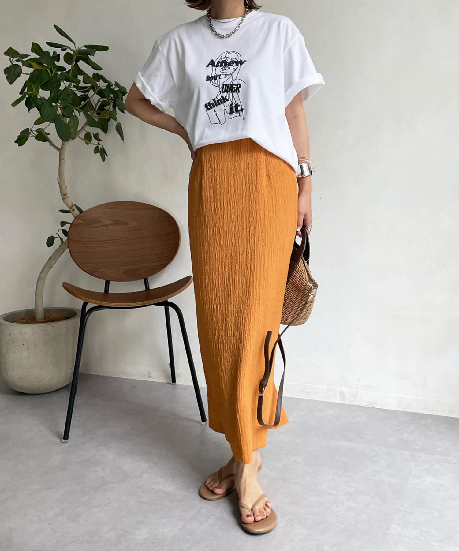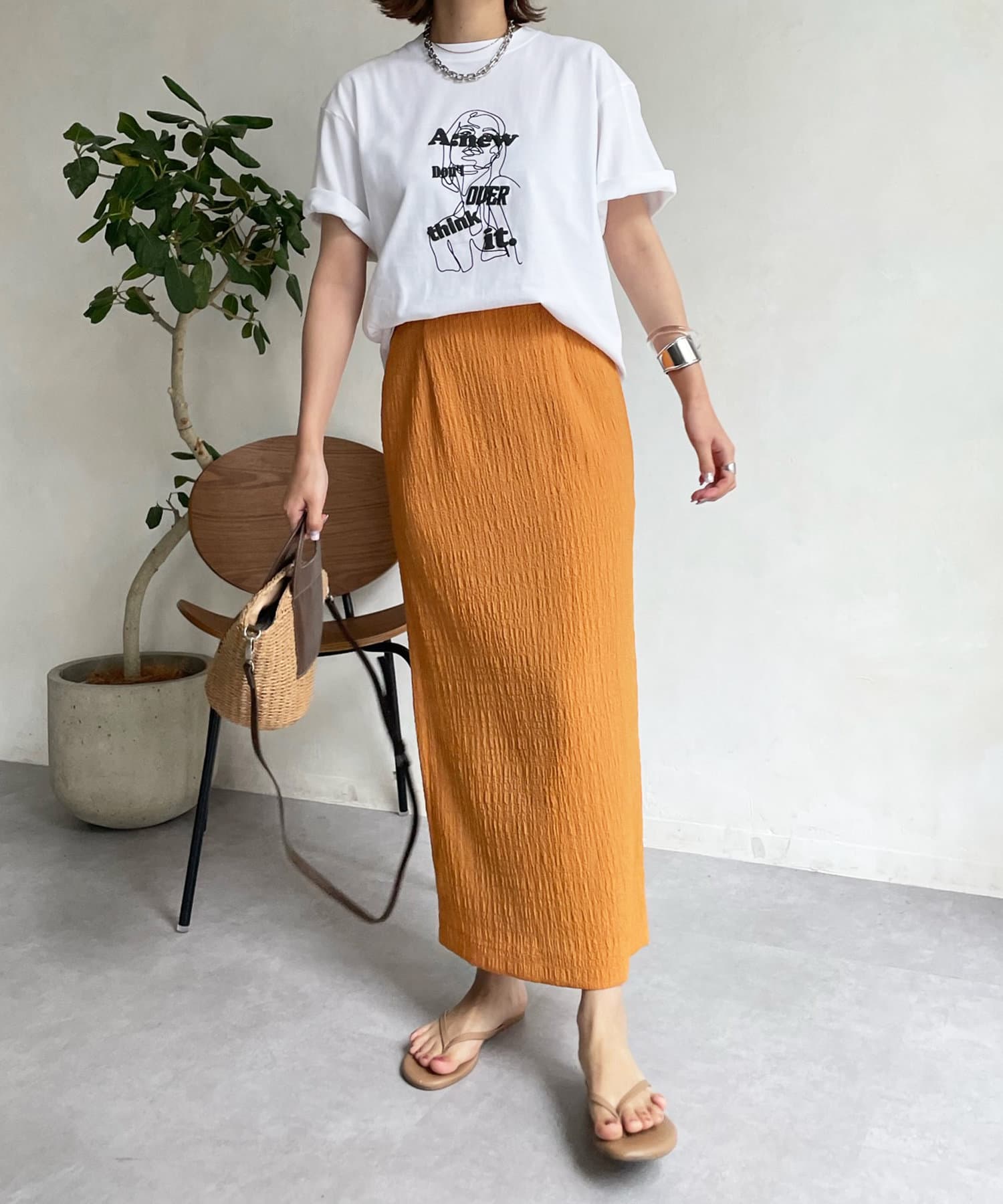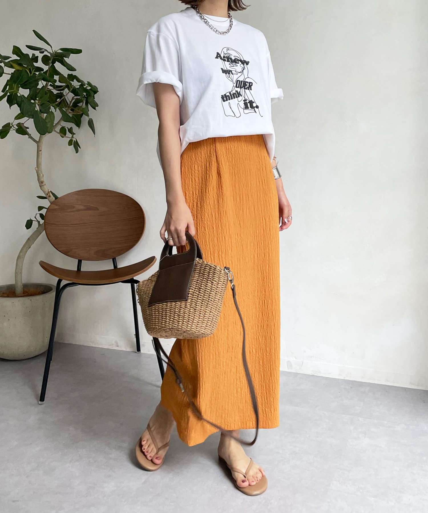 Tシャツとスタイリングしてもカジュアルになり過ぎずに、きれいめな印象を与えてくれます。