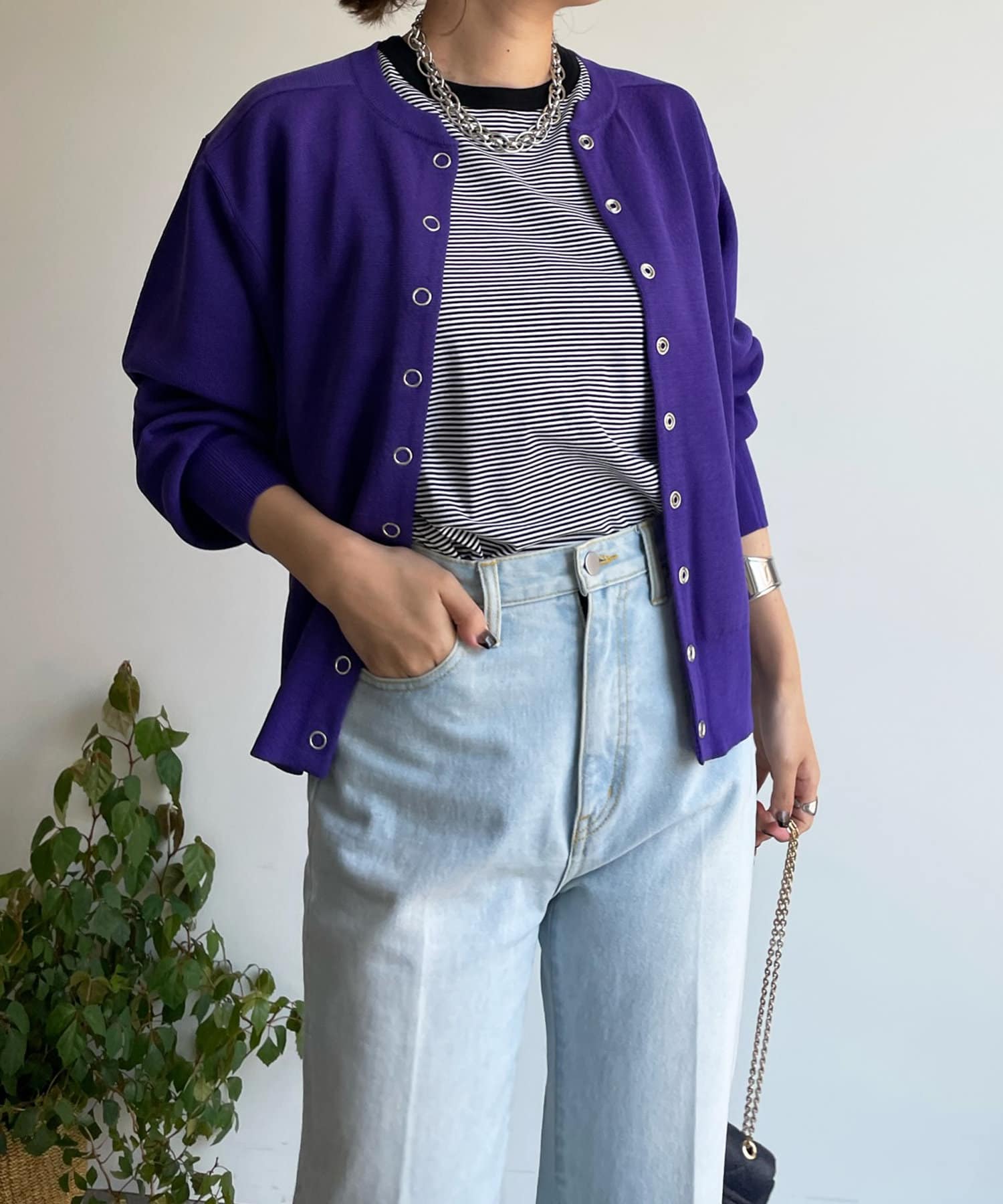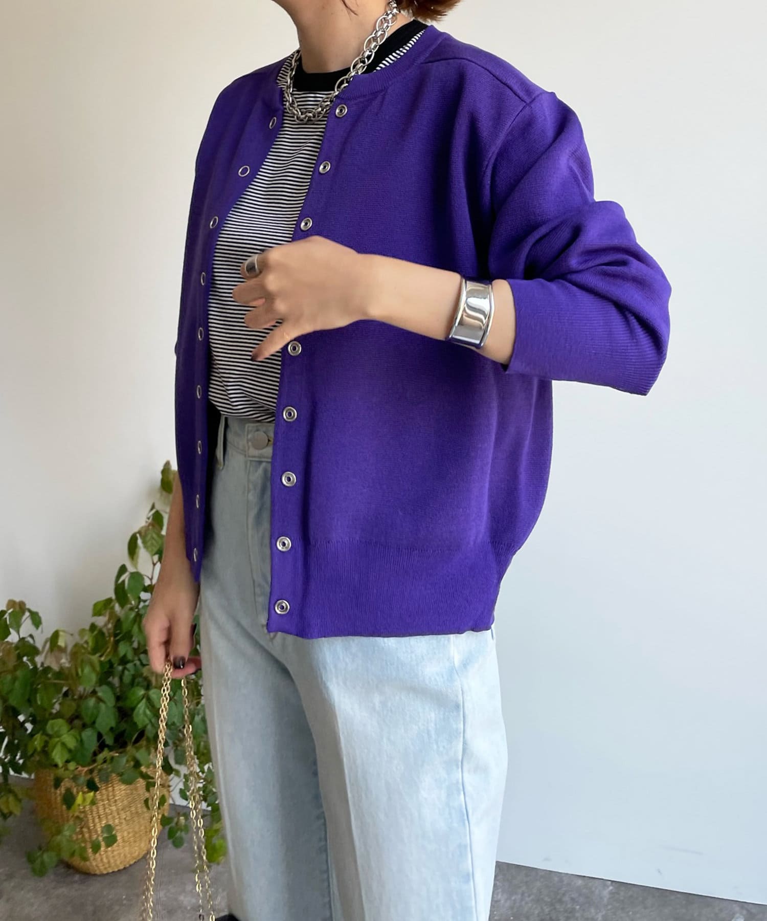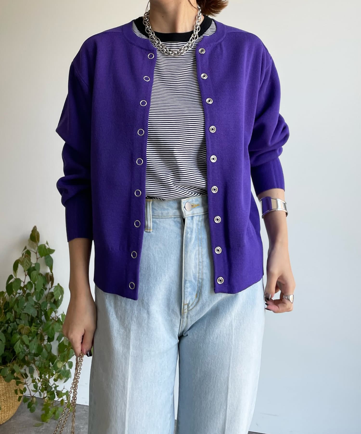 カジュアルになり過ぎず、おしゃれ見えしてくれるドットボタンのカーディガン。