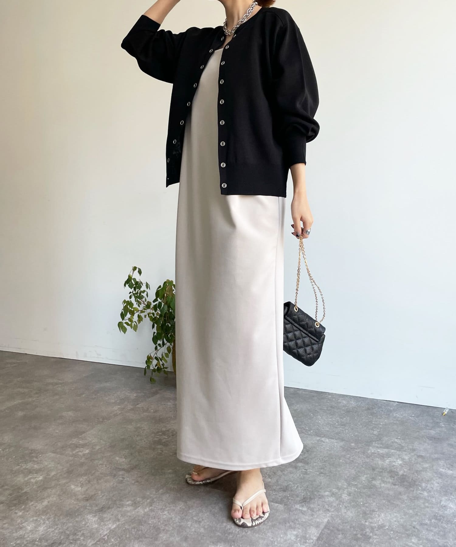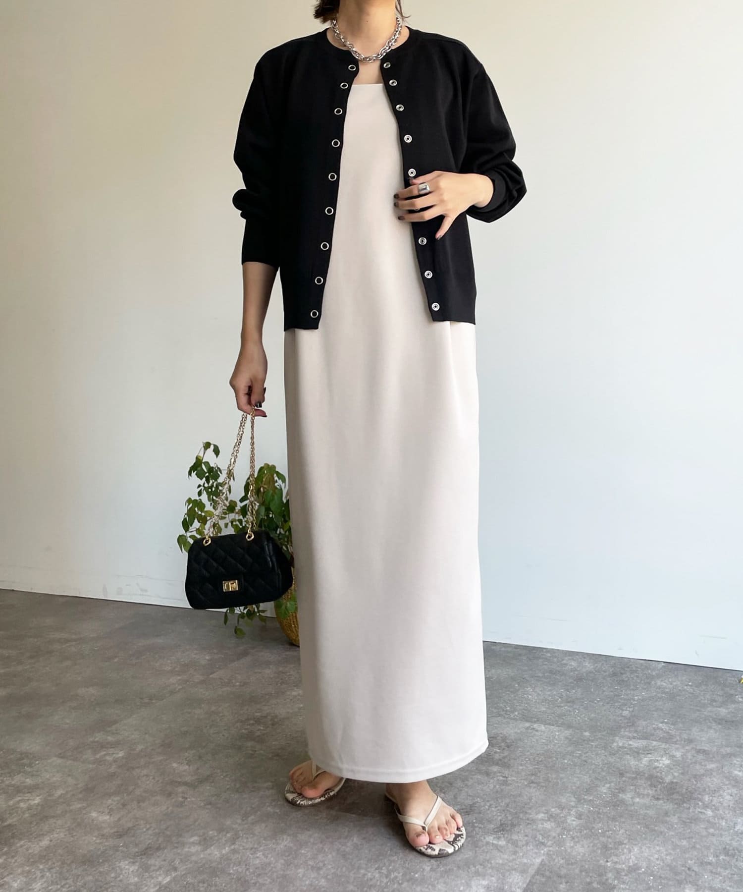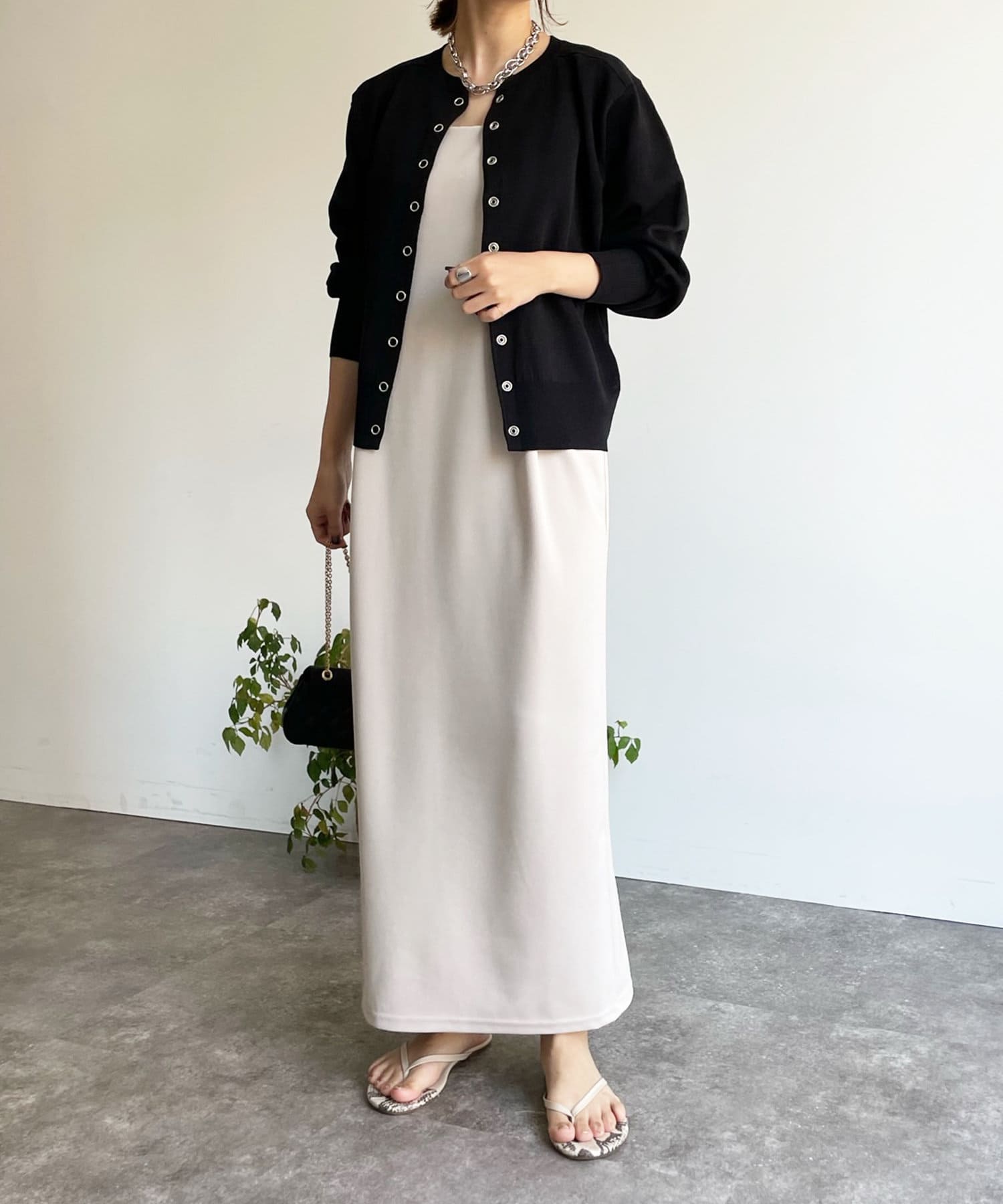 カジュアルになり過ぎず、おしゃれ見えしてくれるドットボタンのカーディガン。