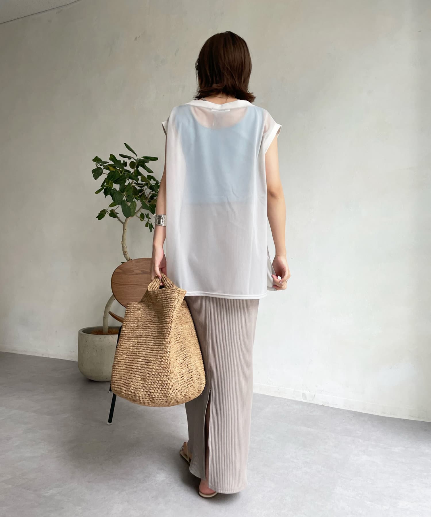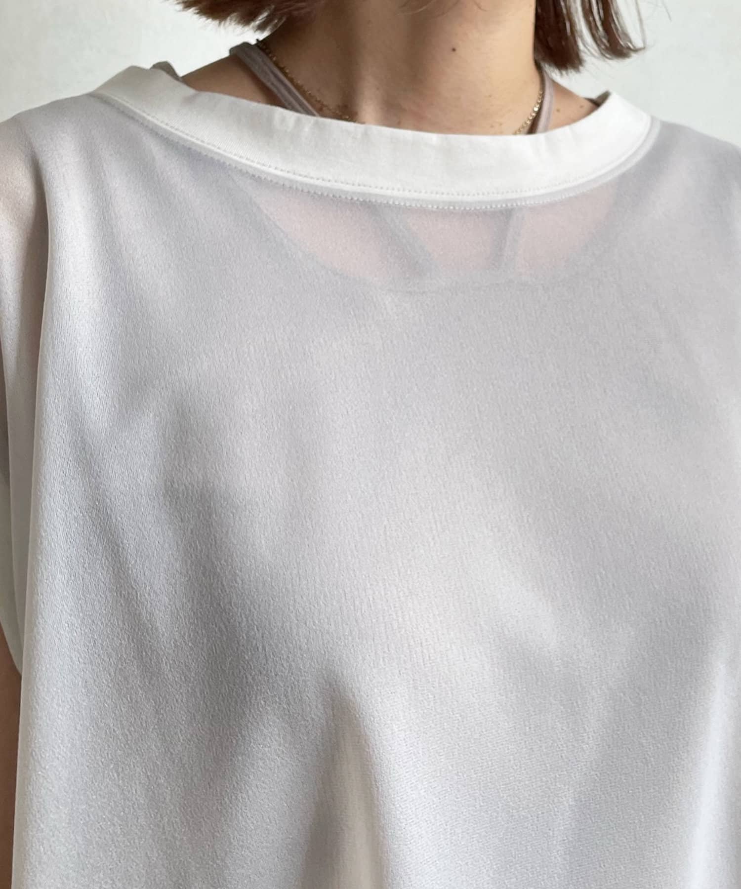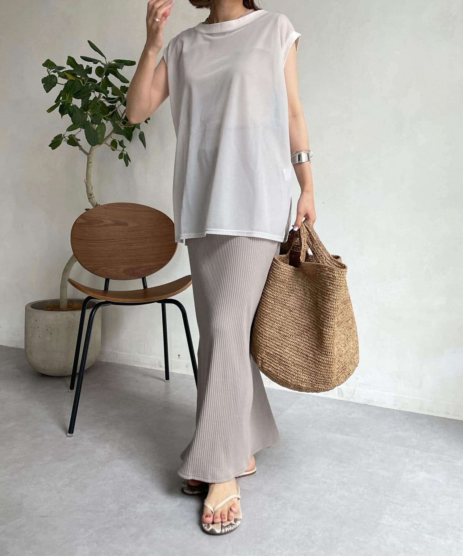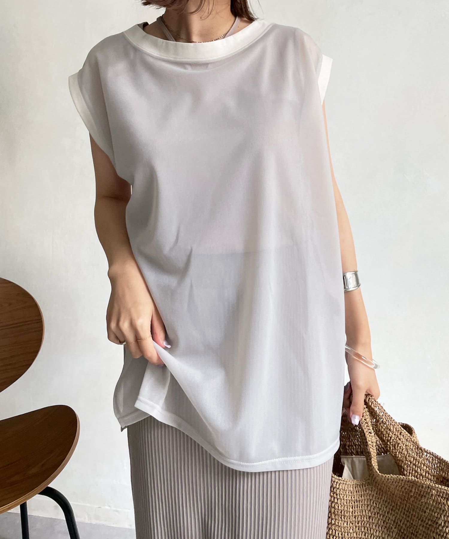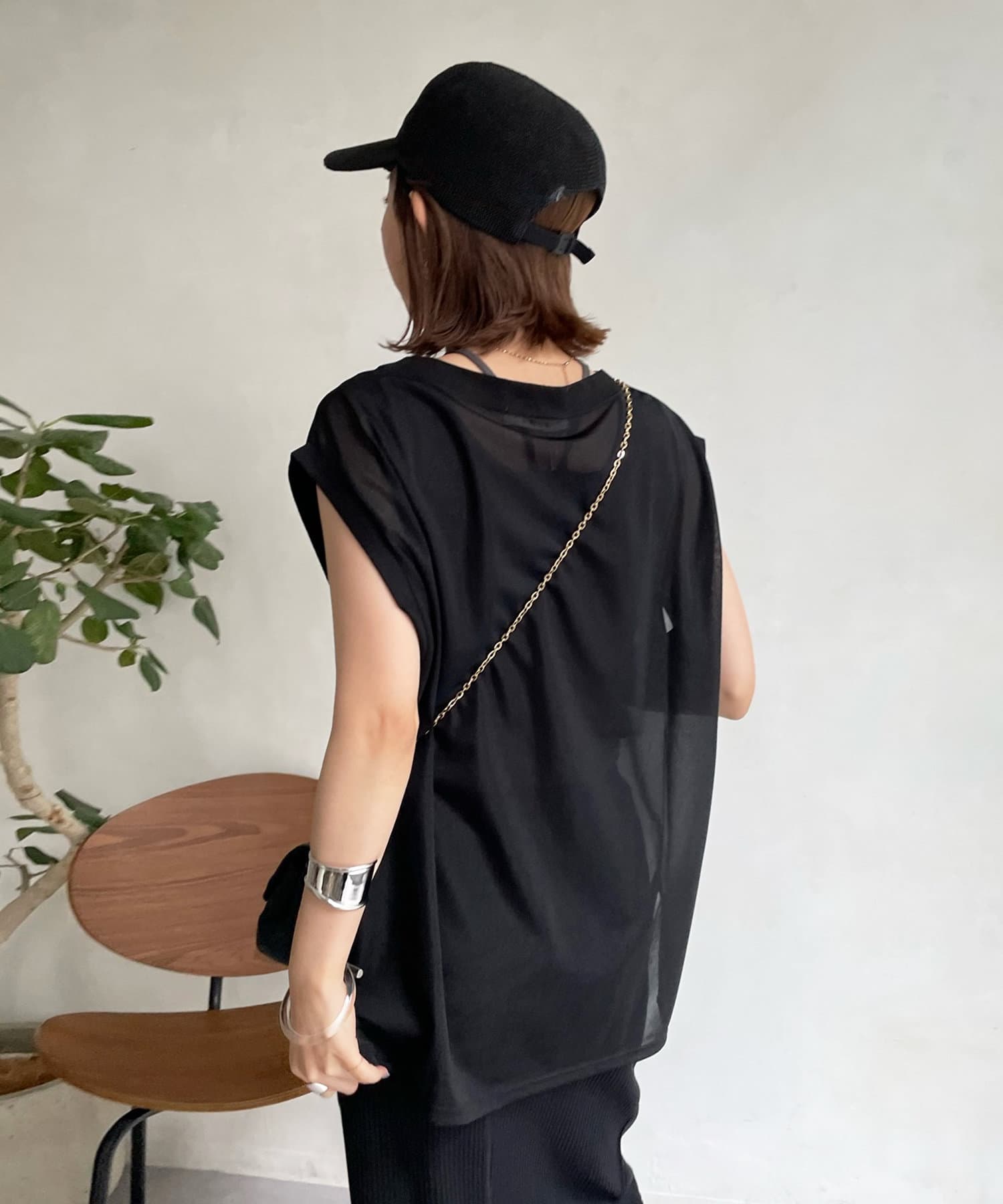 トップスはシアー素材で仕上げたフレンチtee。余裕感のあるサイジングで、抜け感たっぷりの印象を与えます。