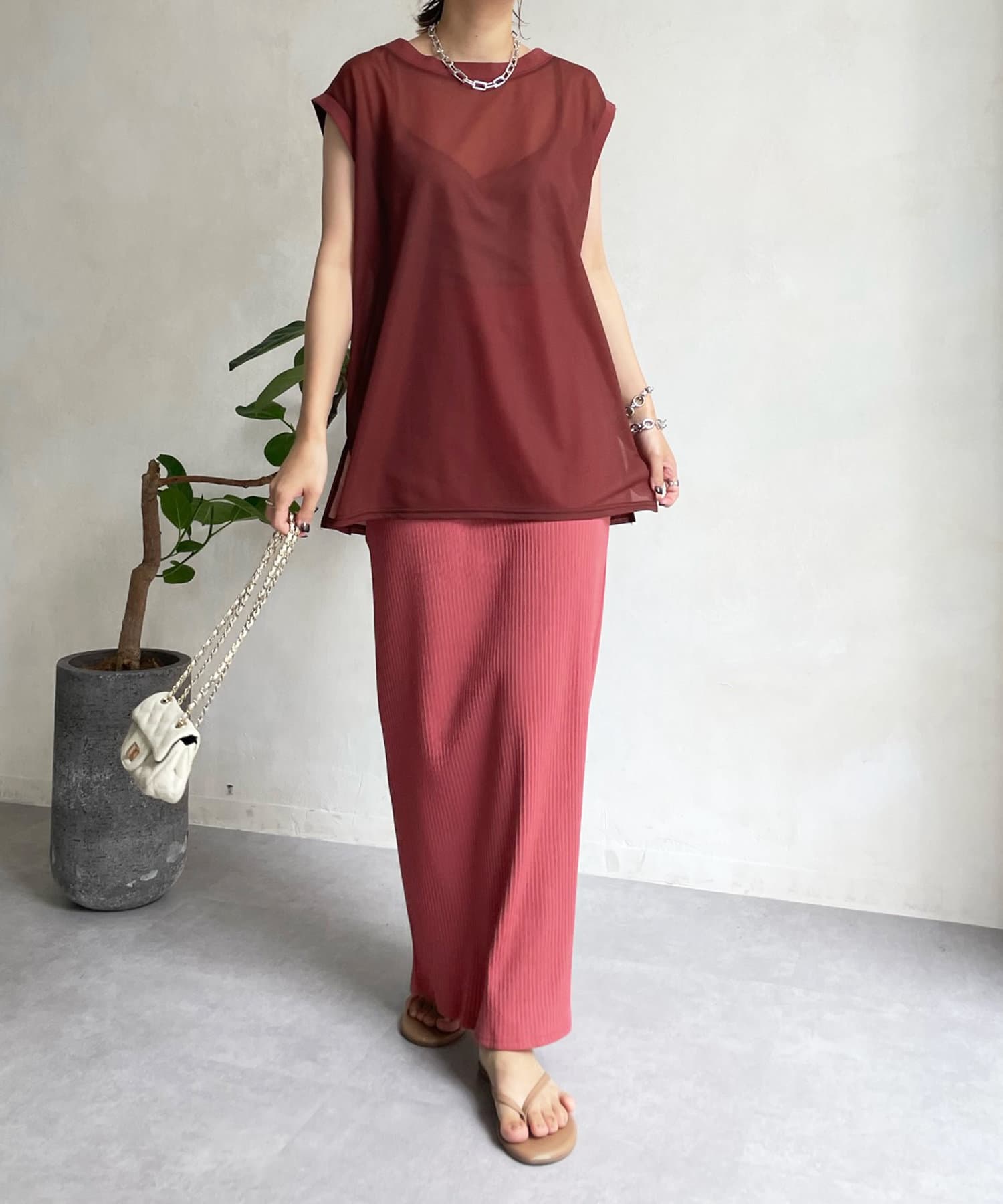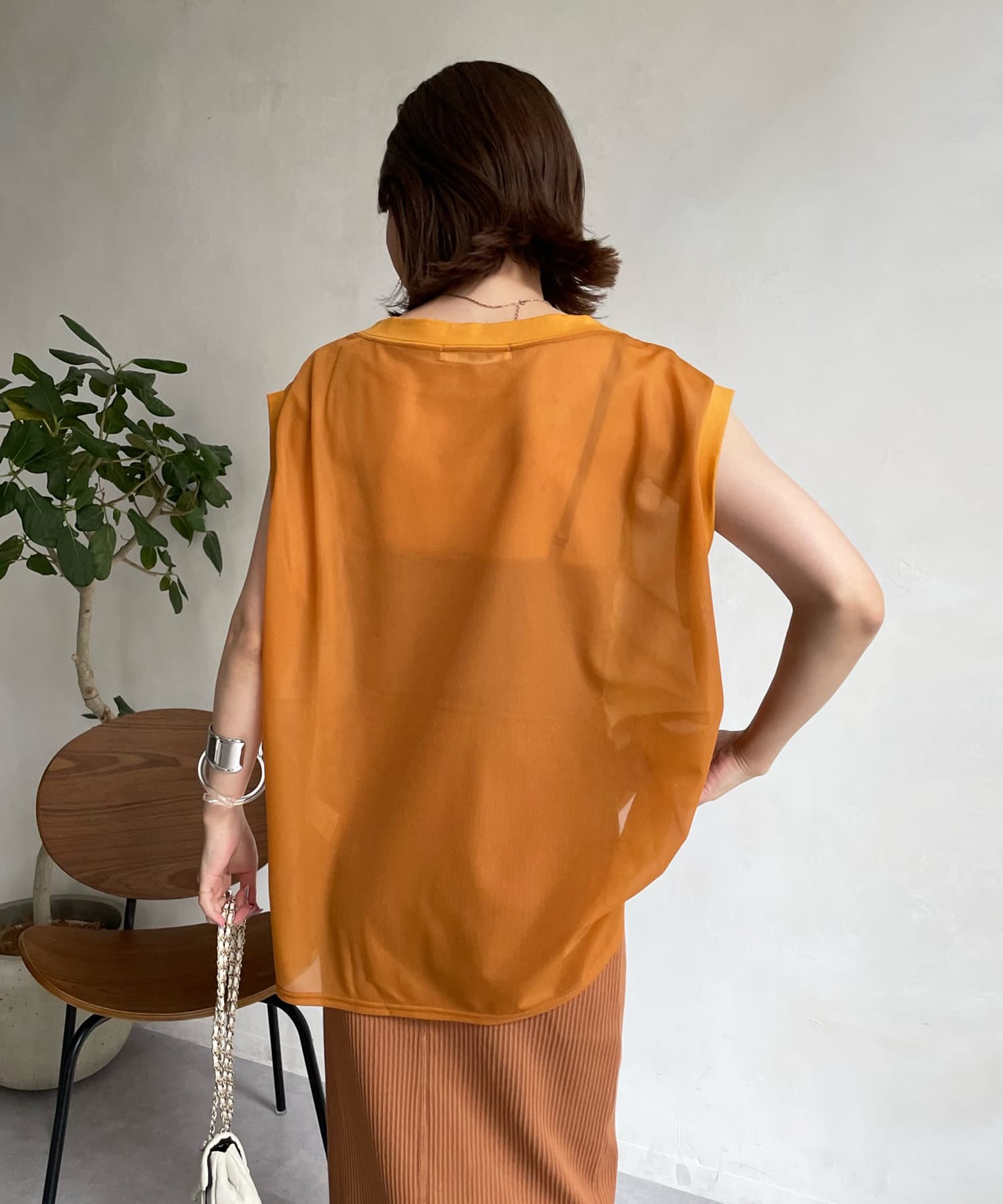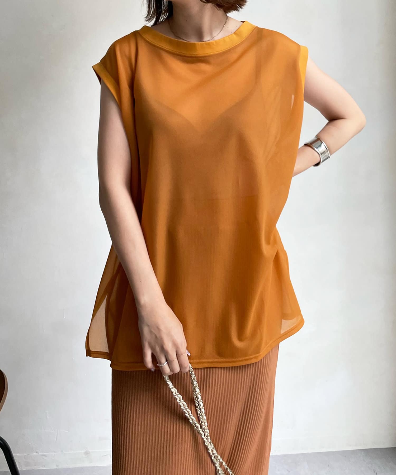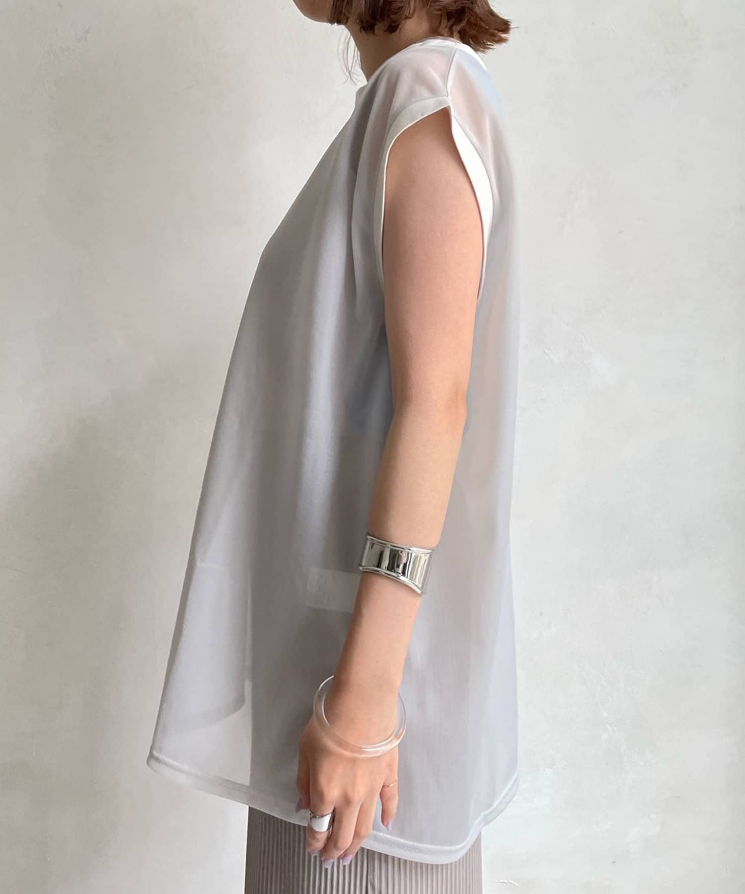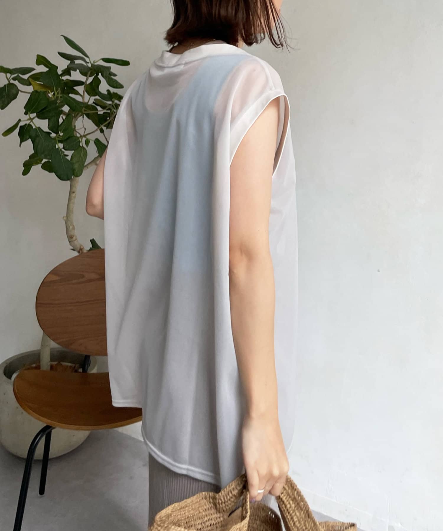 トップスはシアー素材で仕上げたフレンチtee。余裕感のあるサイジングで、抜け感たっぷりの印象を与えます。