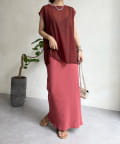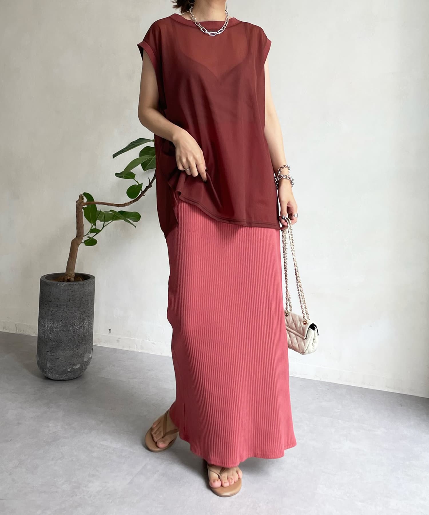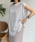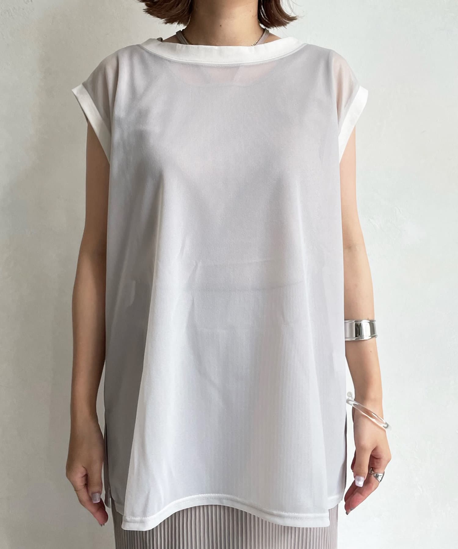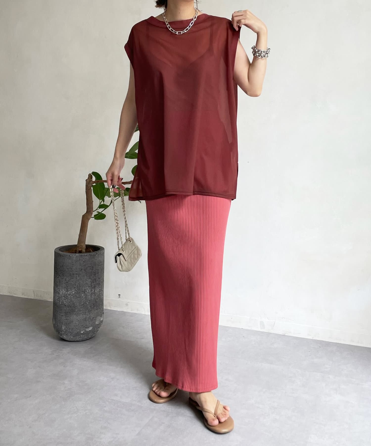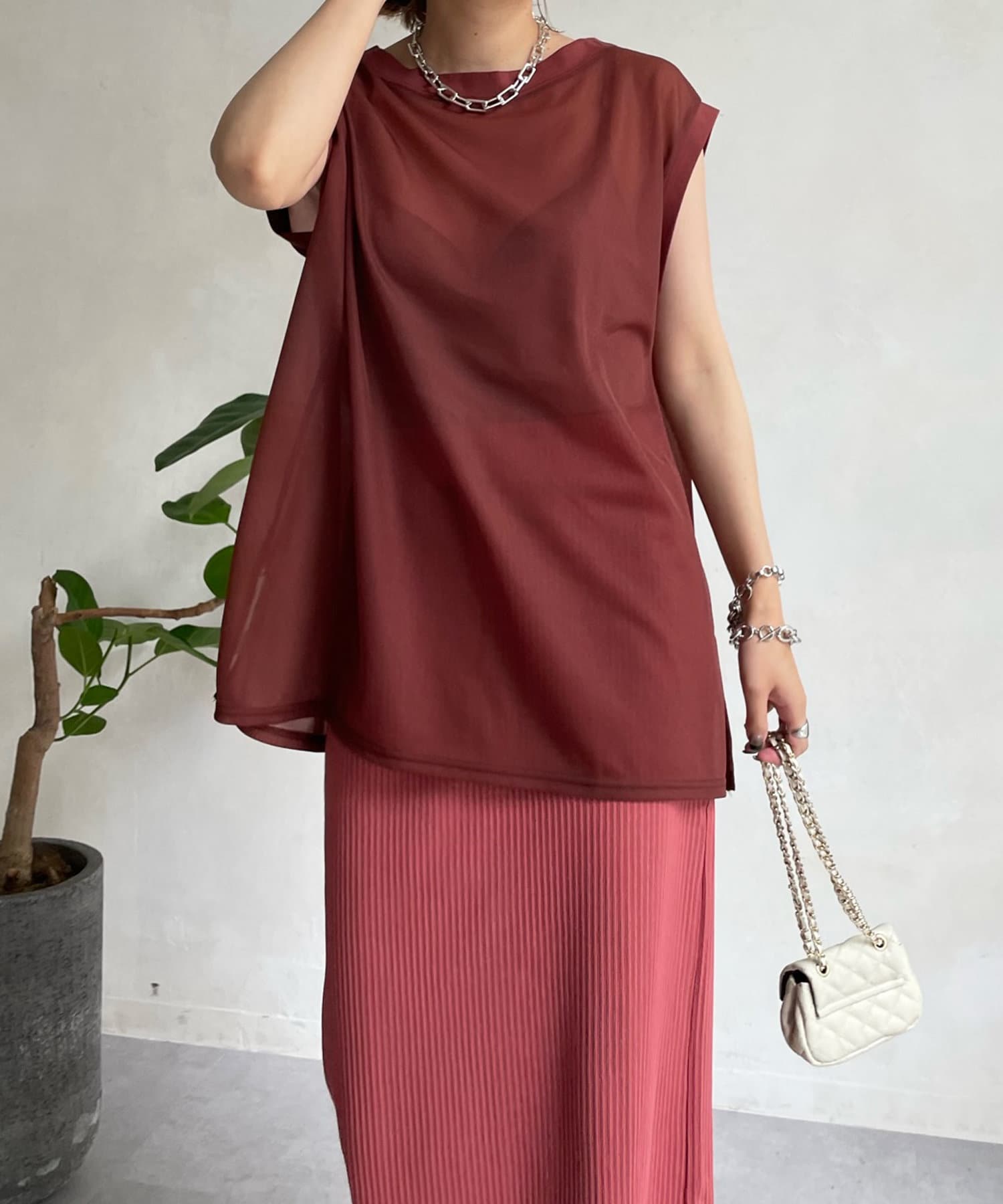 トップスはシアー素材で仕上げたフレンチtee。余裕感のあるサイジングで、抜け感たっぷりの印象を与えます。