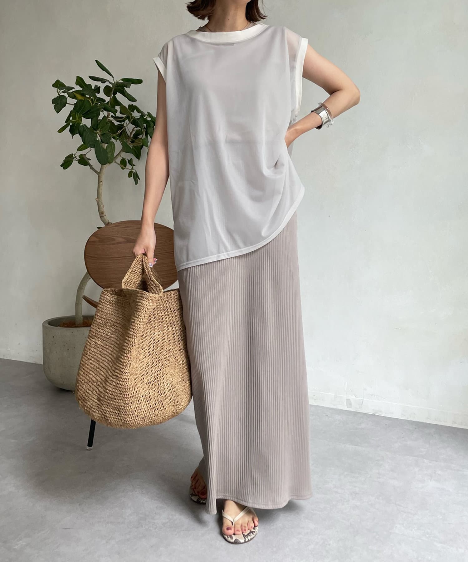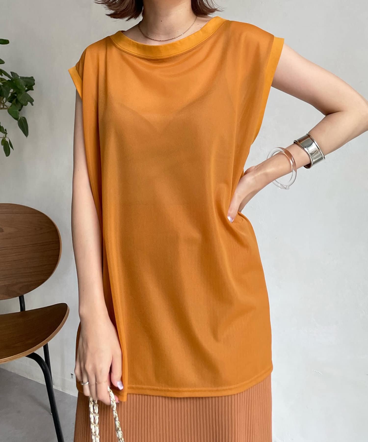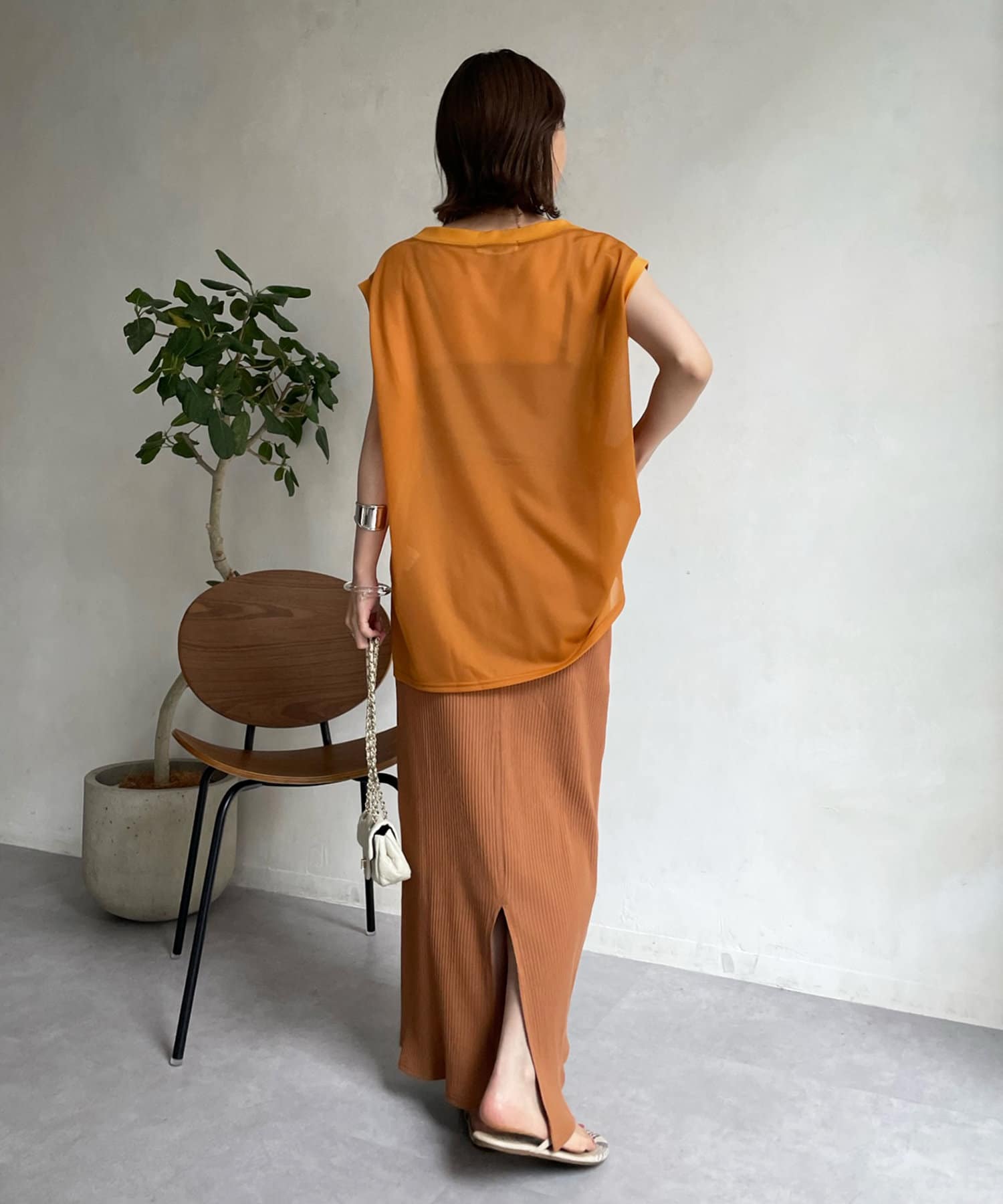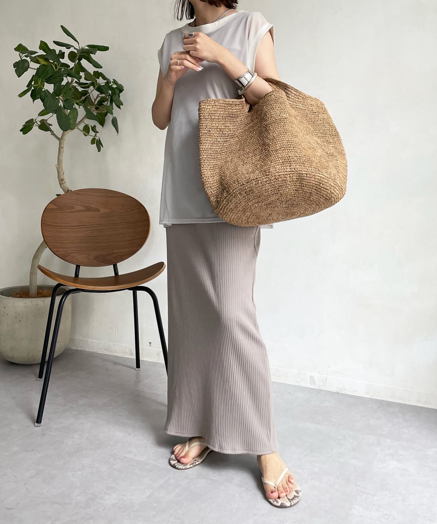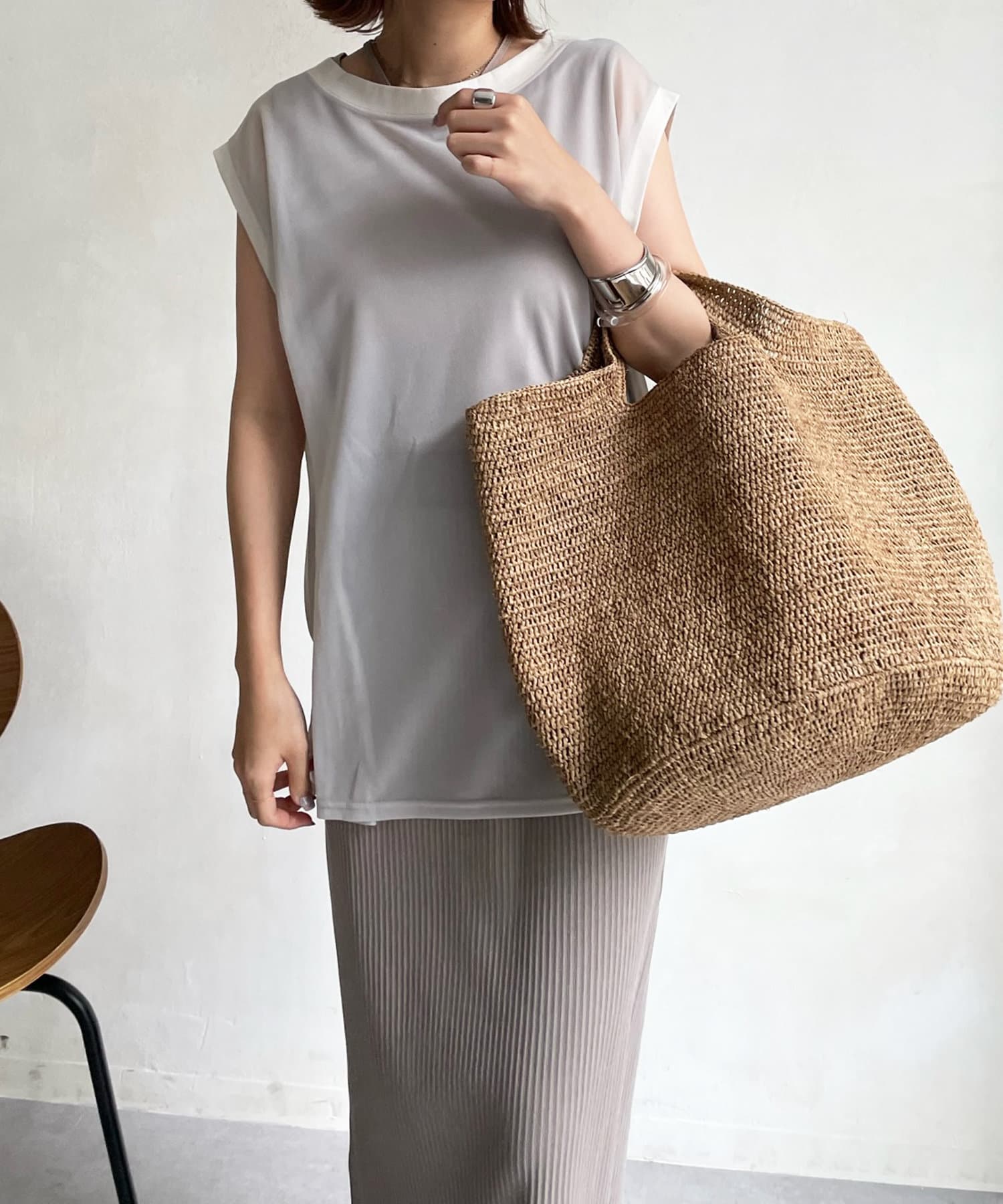 トップスはシアー素材で仕上げたフレンチtee。余裕感のあるサイジングで、抜け感たっぷりの印象を与えます。