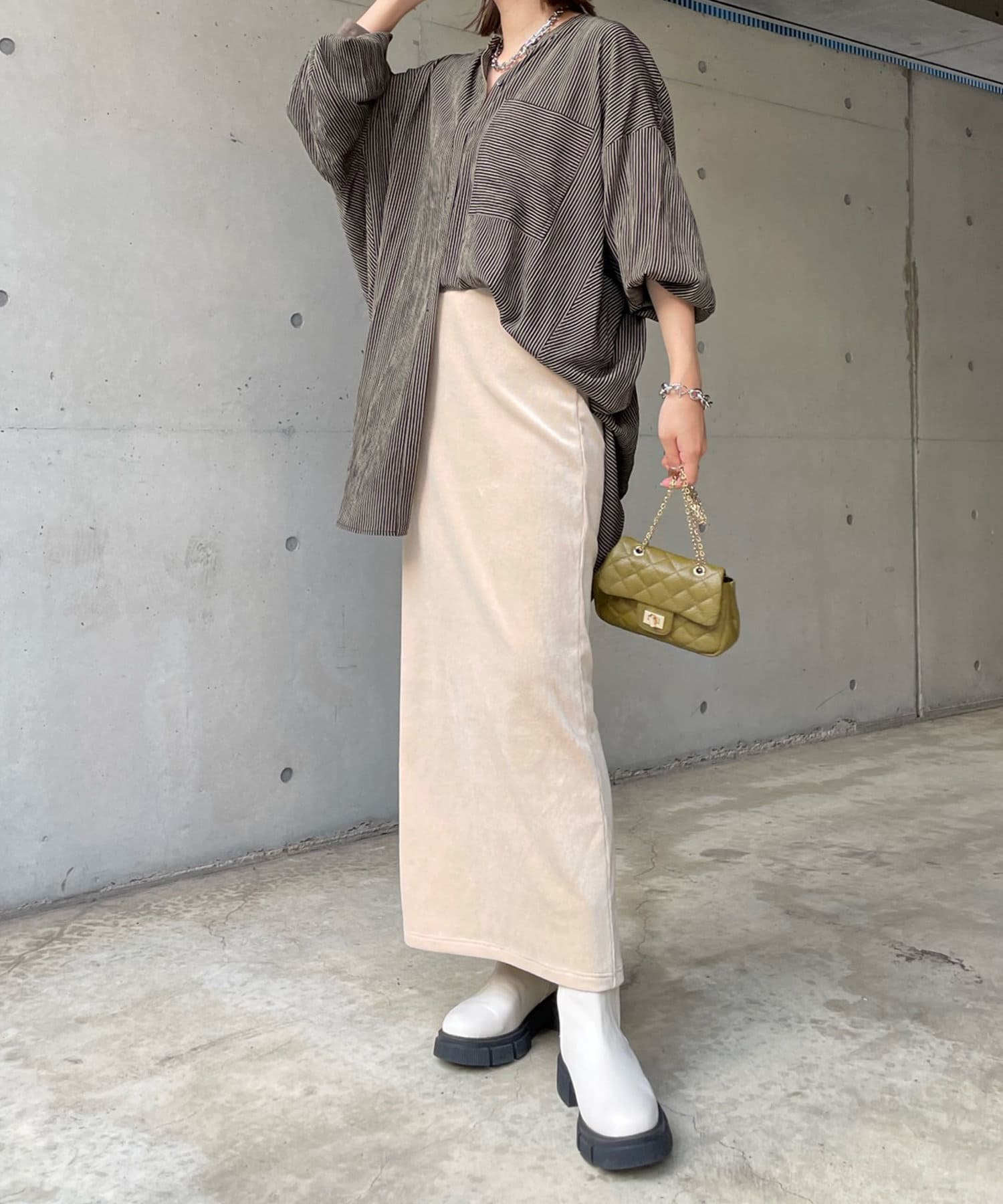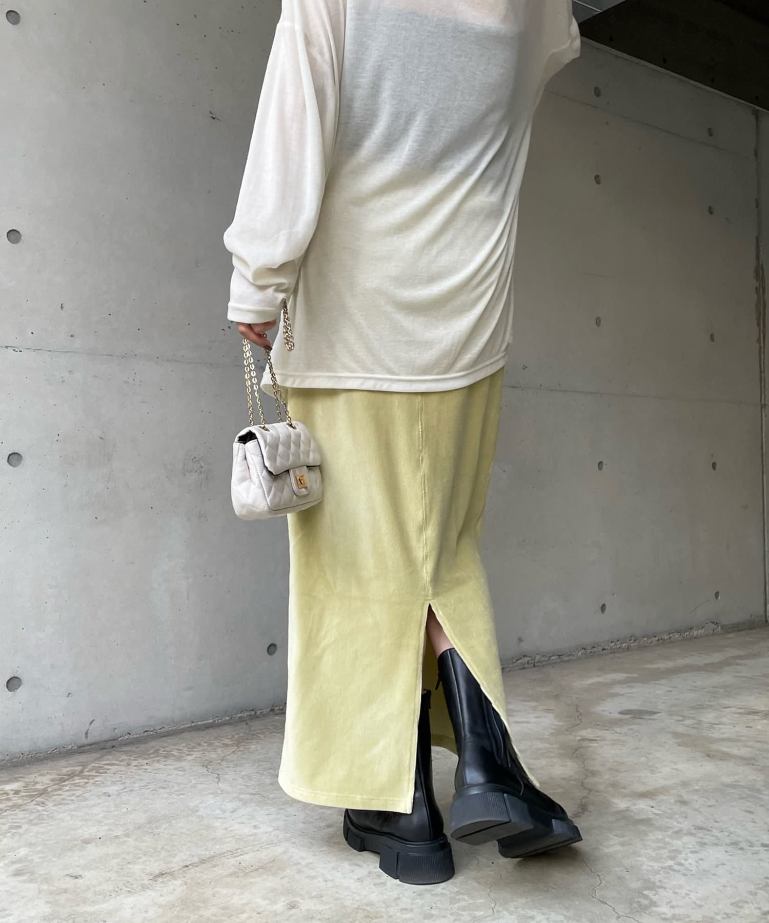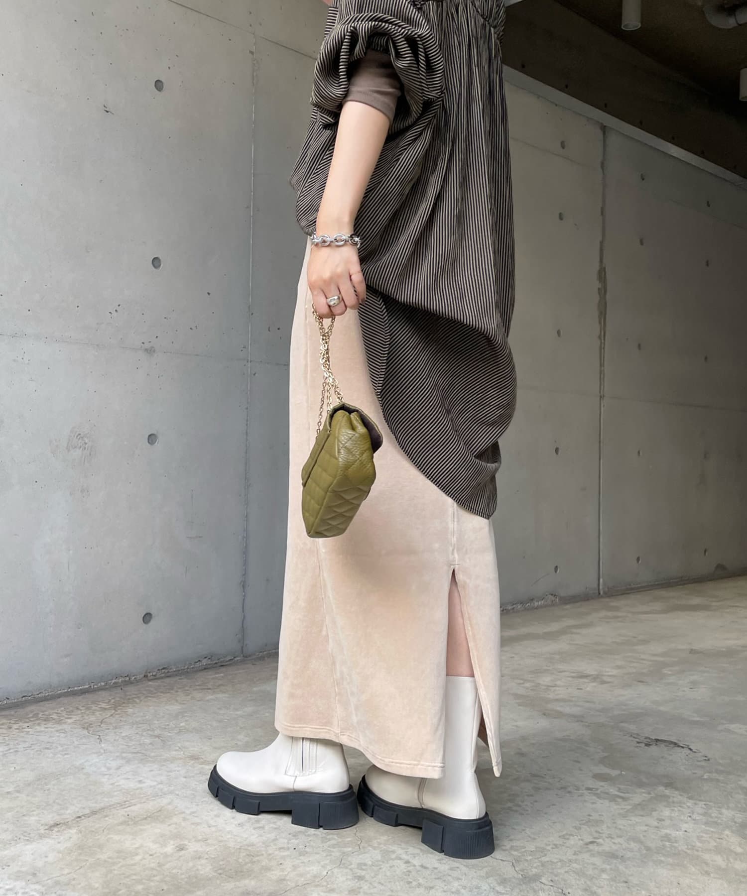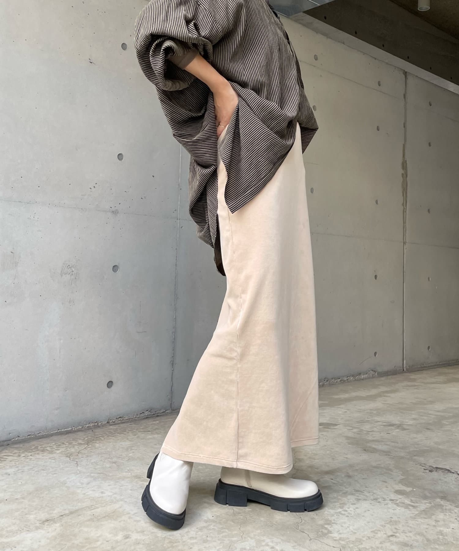 楽々な素材ですが、Iラインのシルエットに仕上げることですっきりとした印象をプラス。また、バックスリットをプラスすることで歩きやすさもアシストしてくれますよ◎