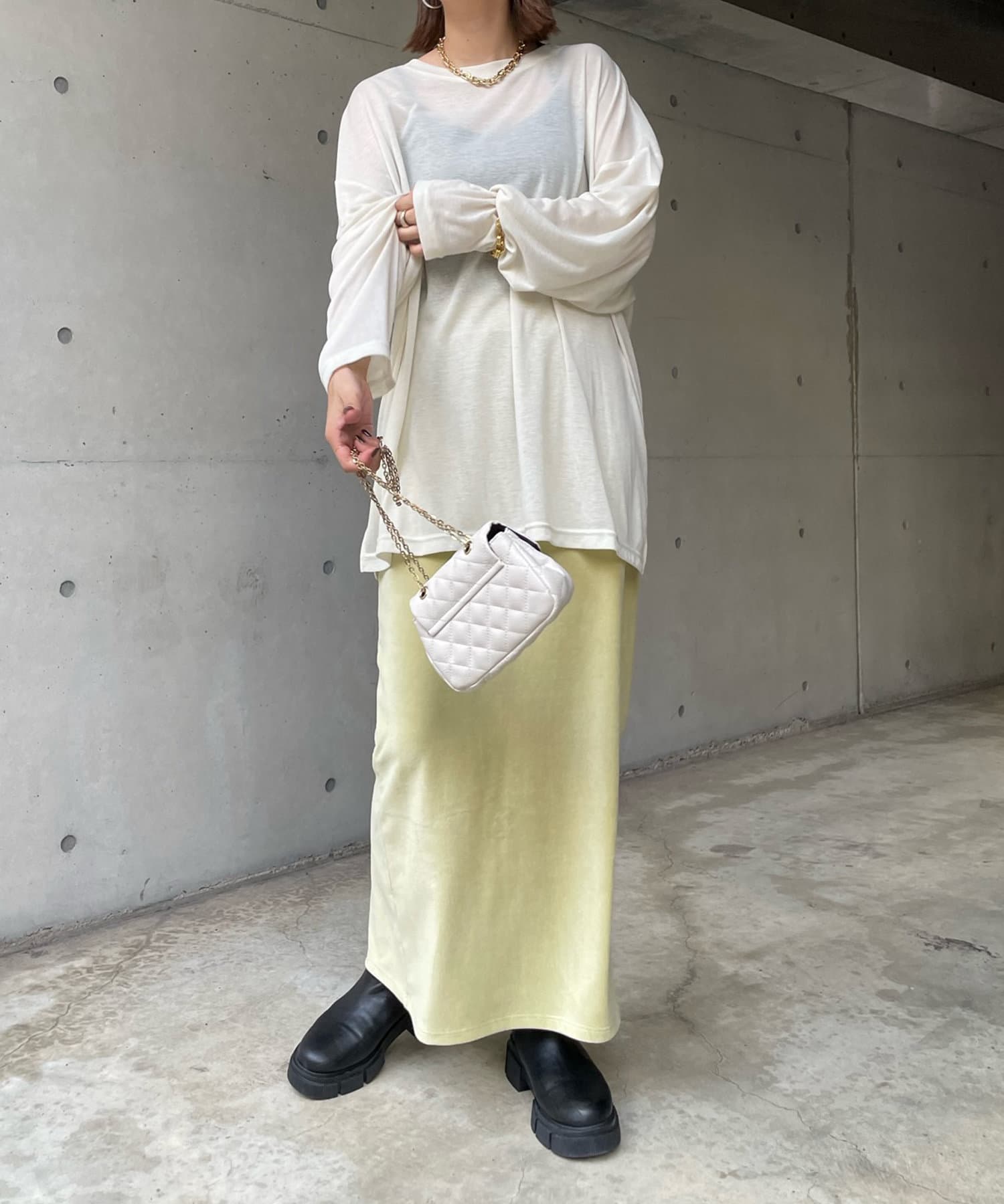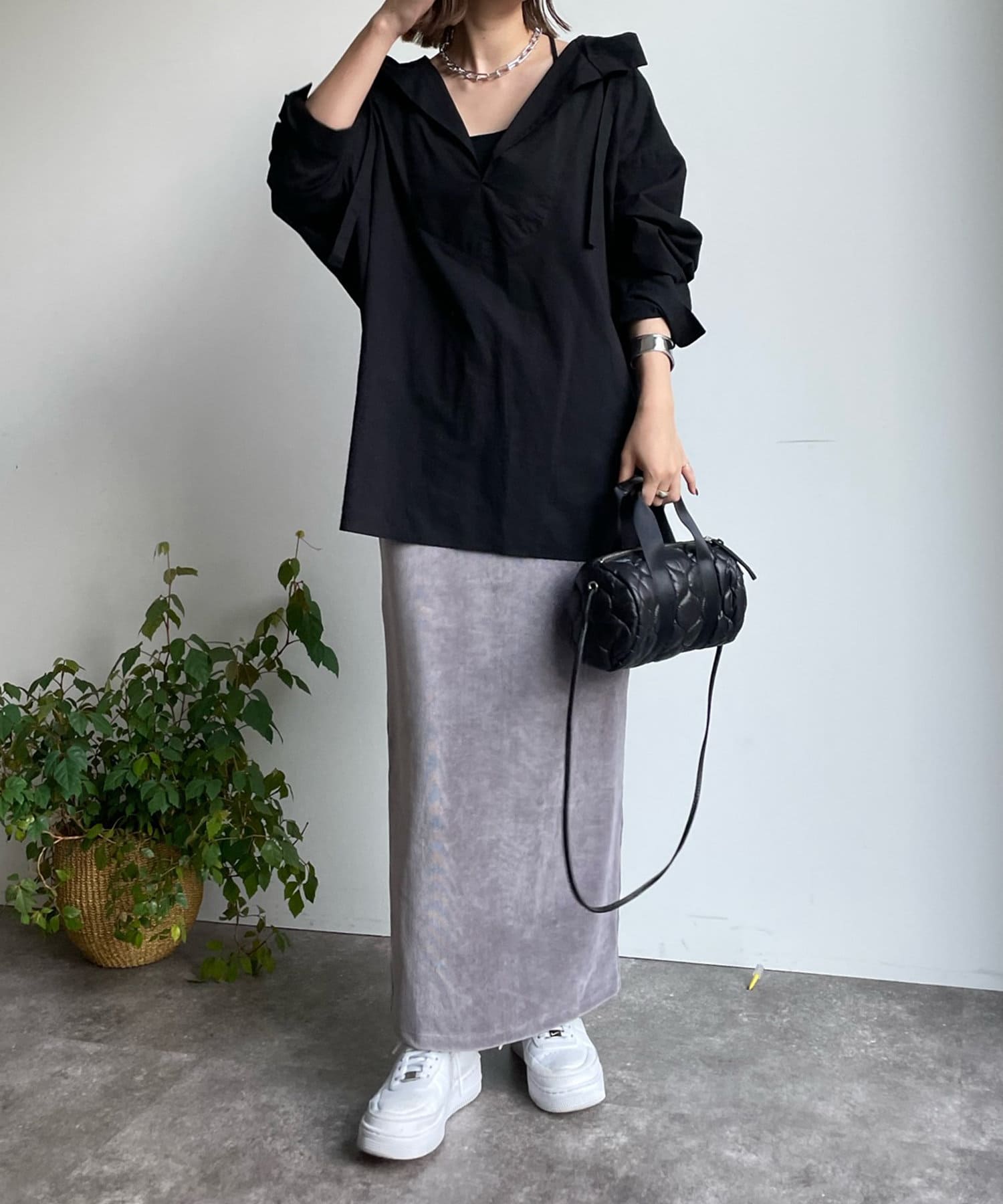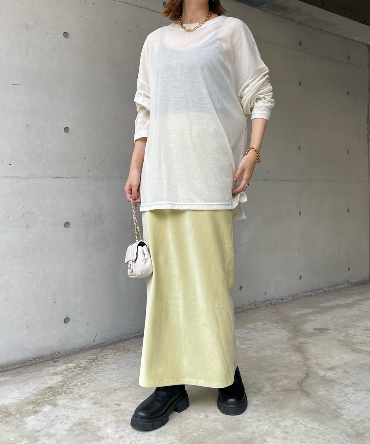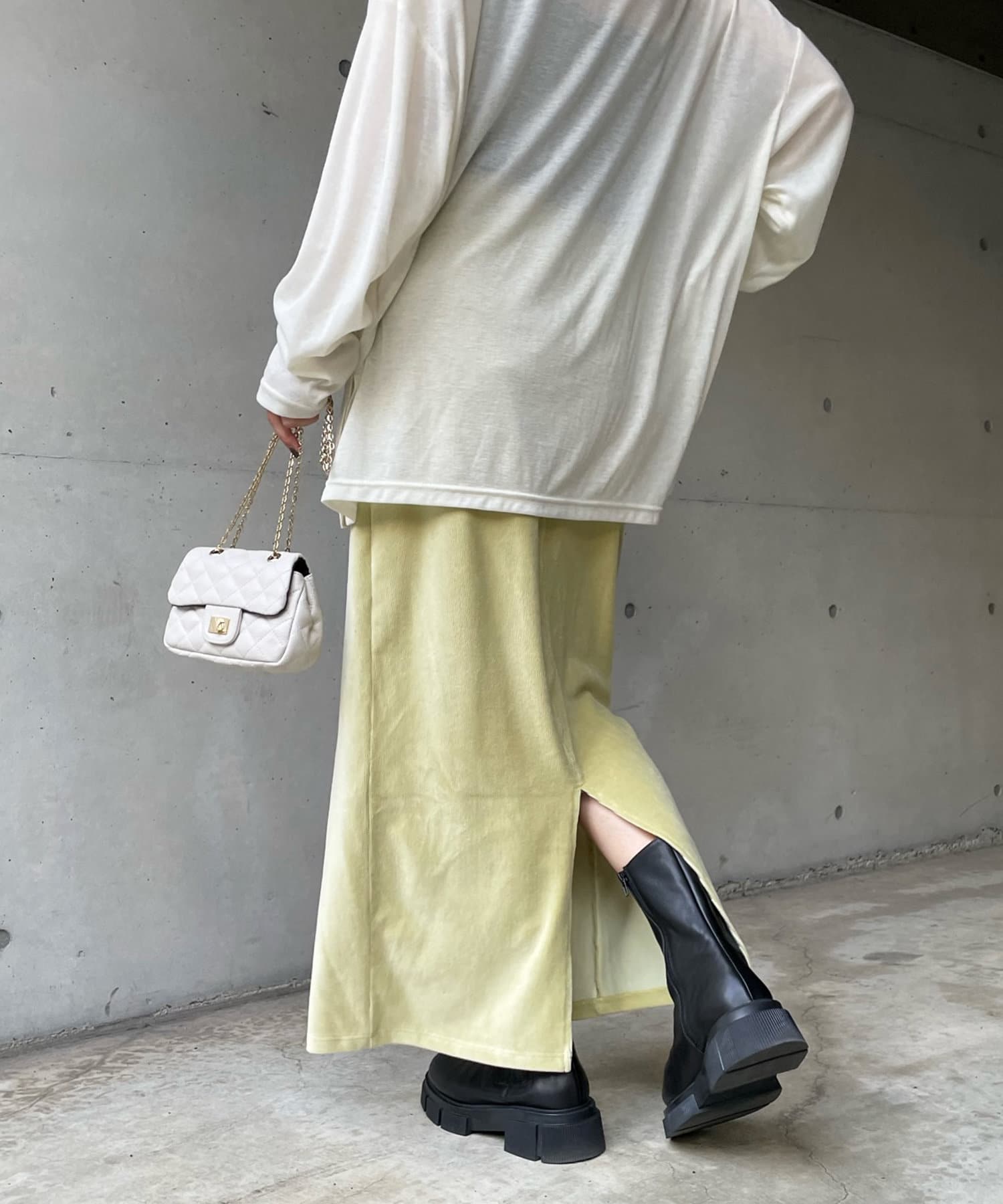 楽々な素材ですが、Iラインのシルエットに仕上げることですっきりとした印象をプラス。また、バックスリットをプラスすることで歩きやすさもアシストしてくれますよ◎