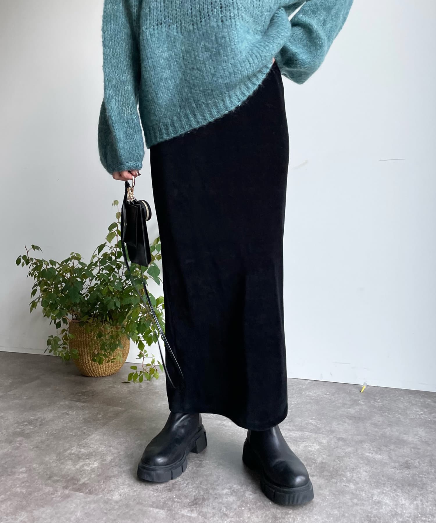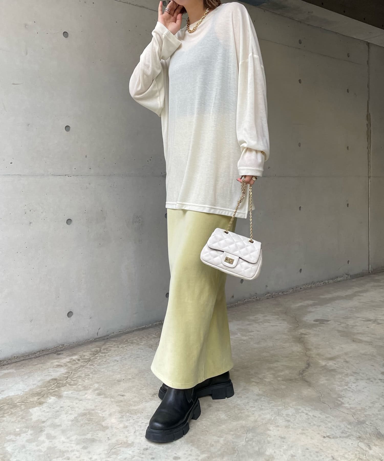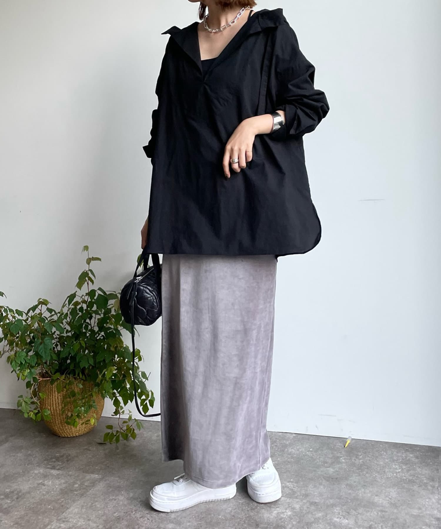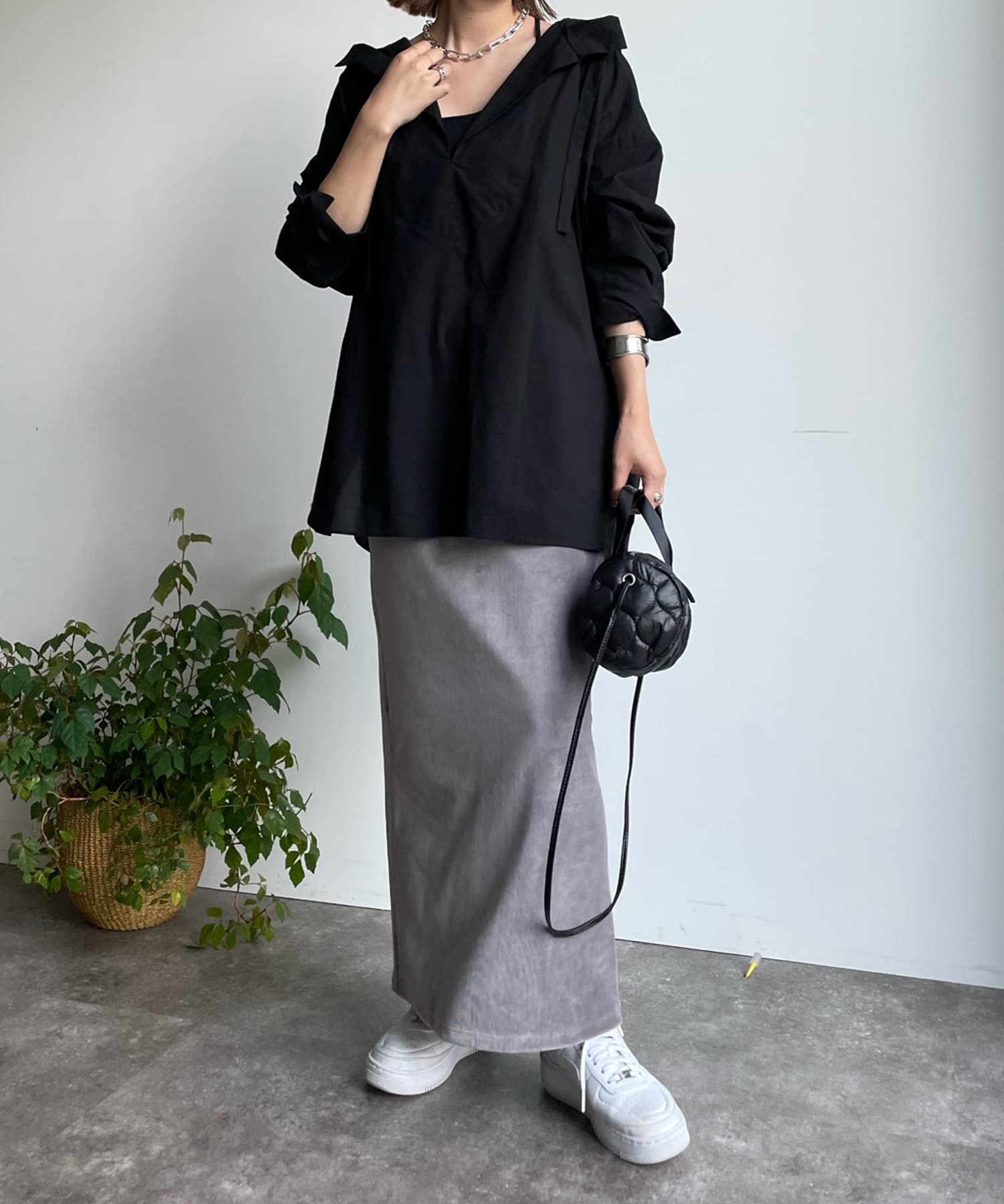 楽々な素材ですが、Iラインのシルエットに仕上げることですっきりとした印象をプラス。また、バックスリットをプラスすることで歩きやすさもアシストしてくれますよ◎