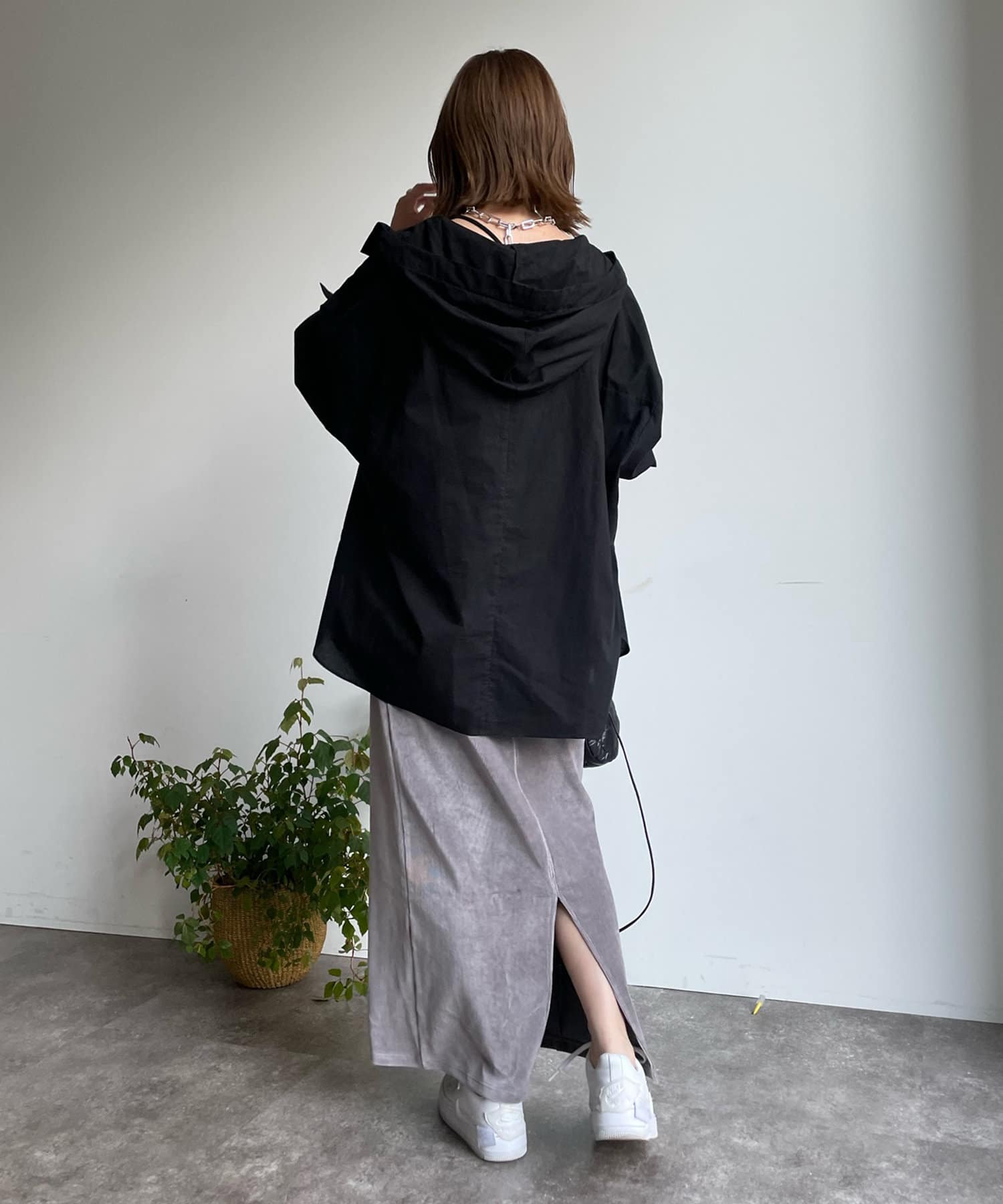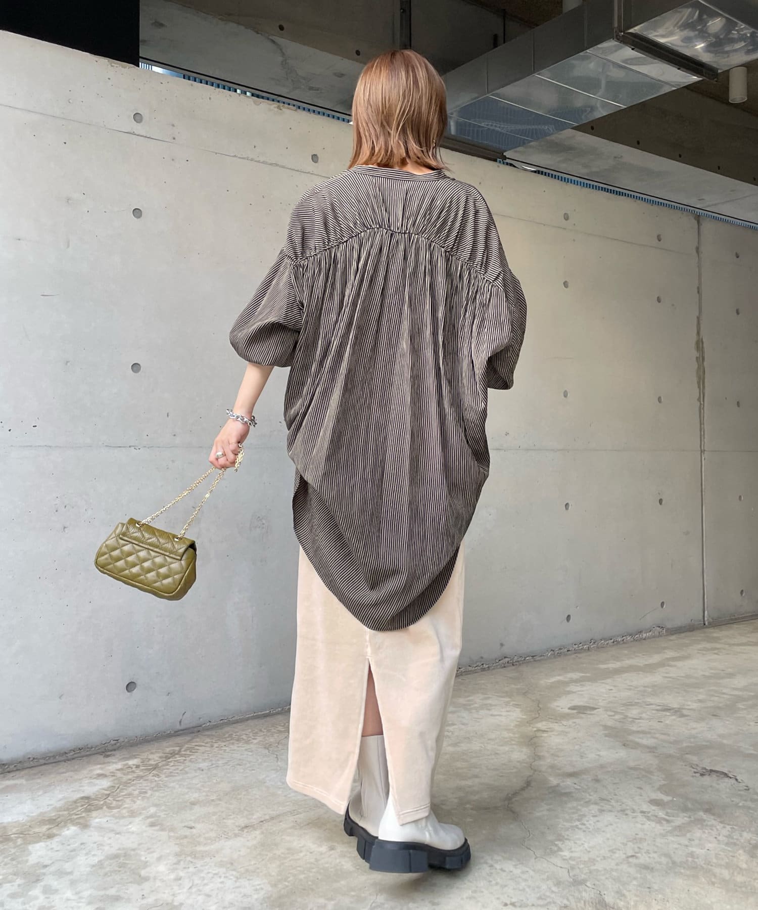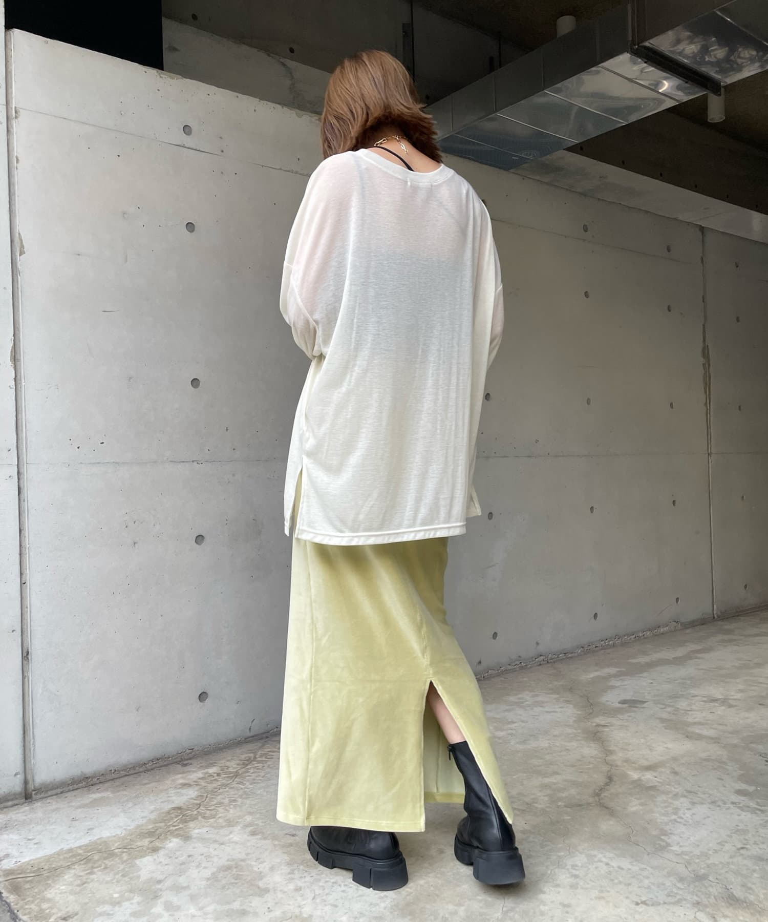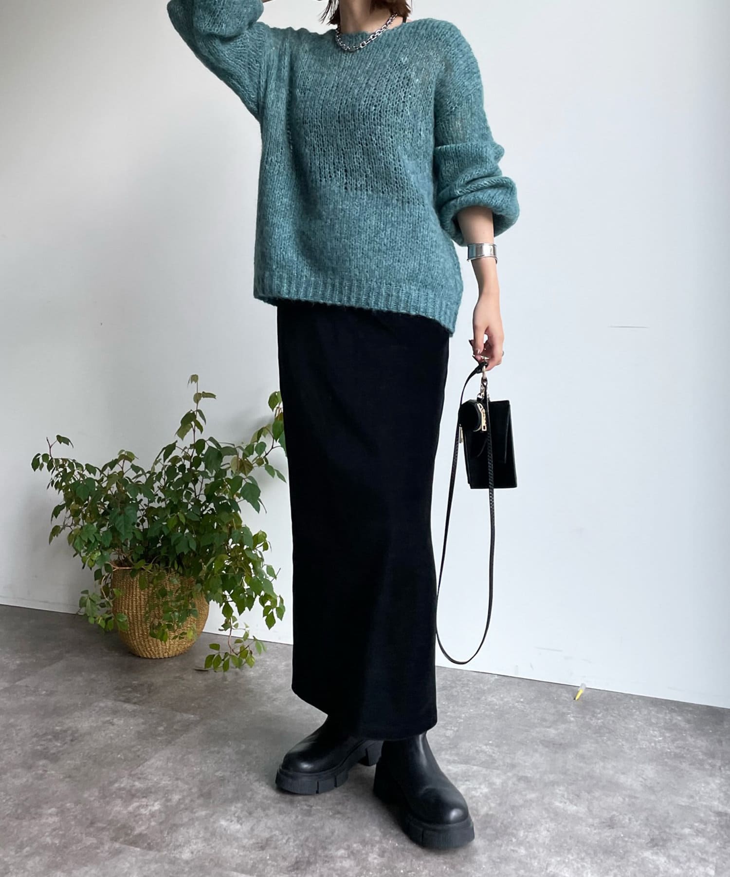 楽々な素材ですが、Iラインのシルエットに仕上げることですっきりとした印象をプラス。また、バックスリットをプラスすることで歩きやすさもアシストしてくれますよ◎