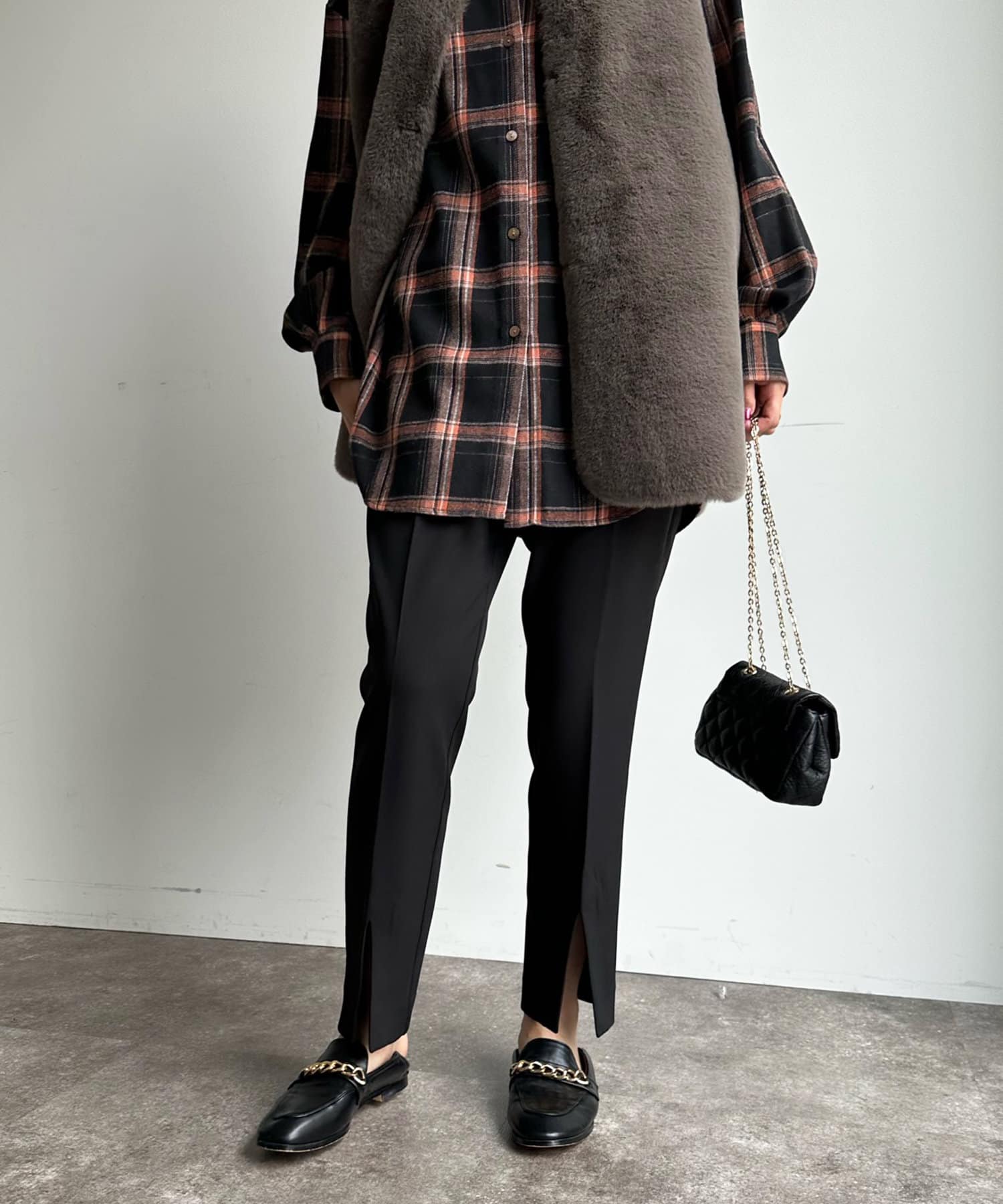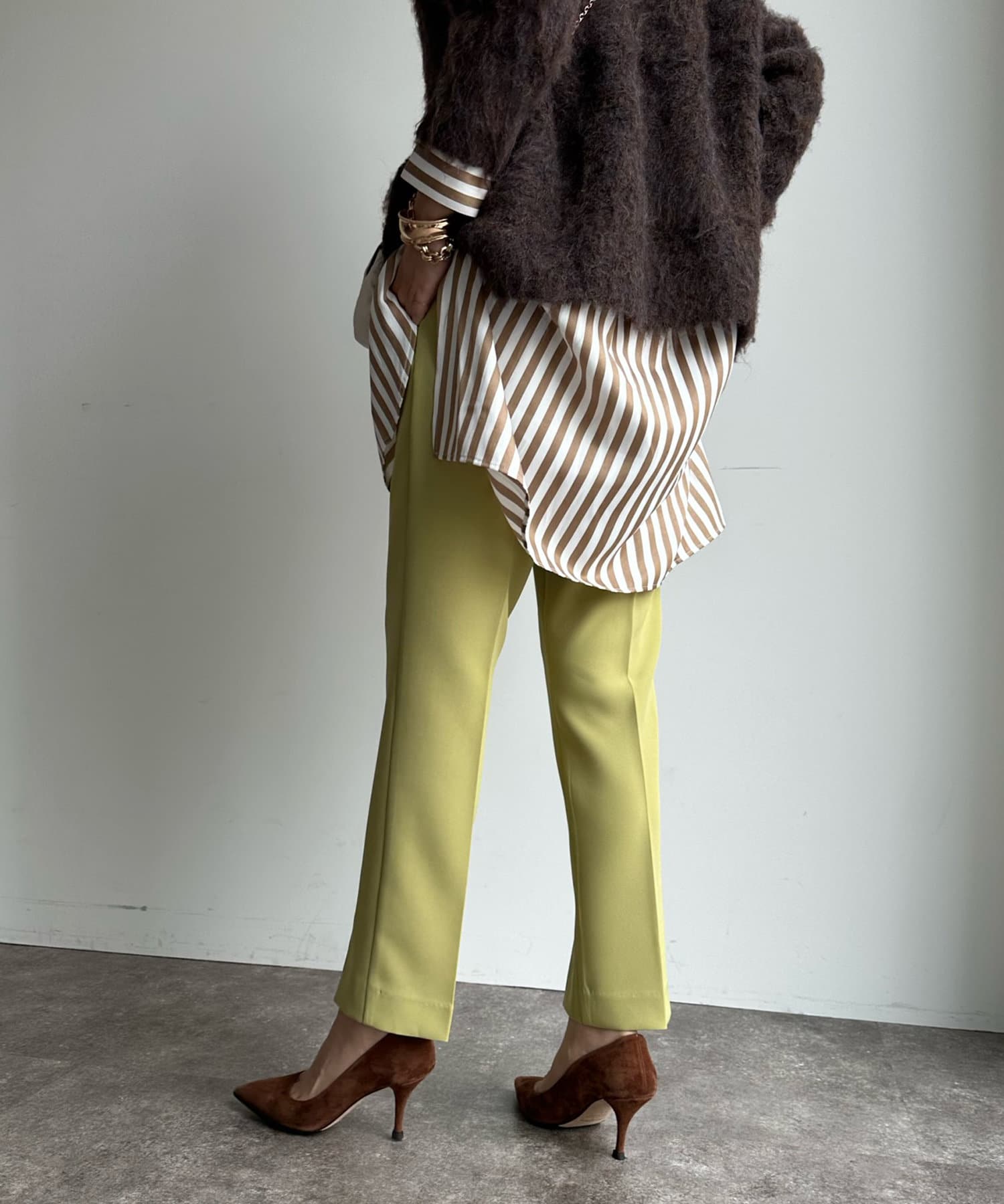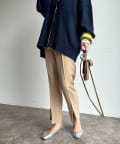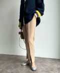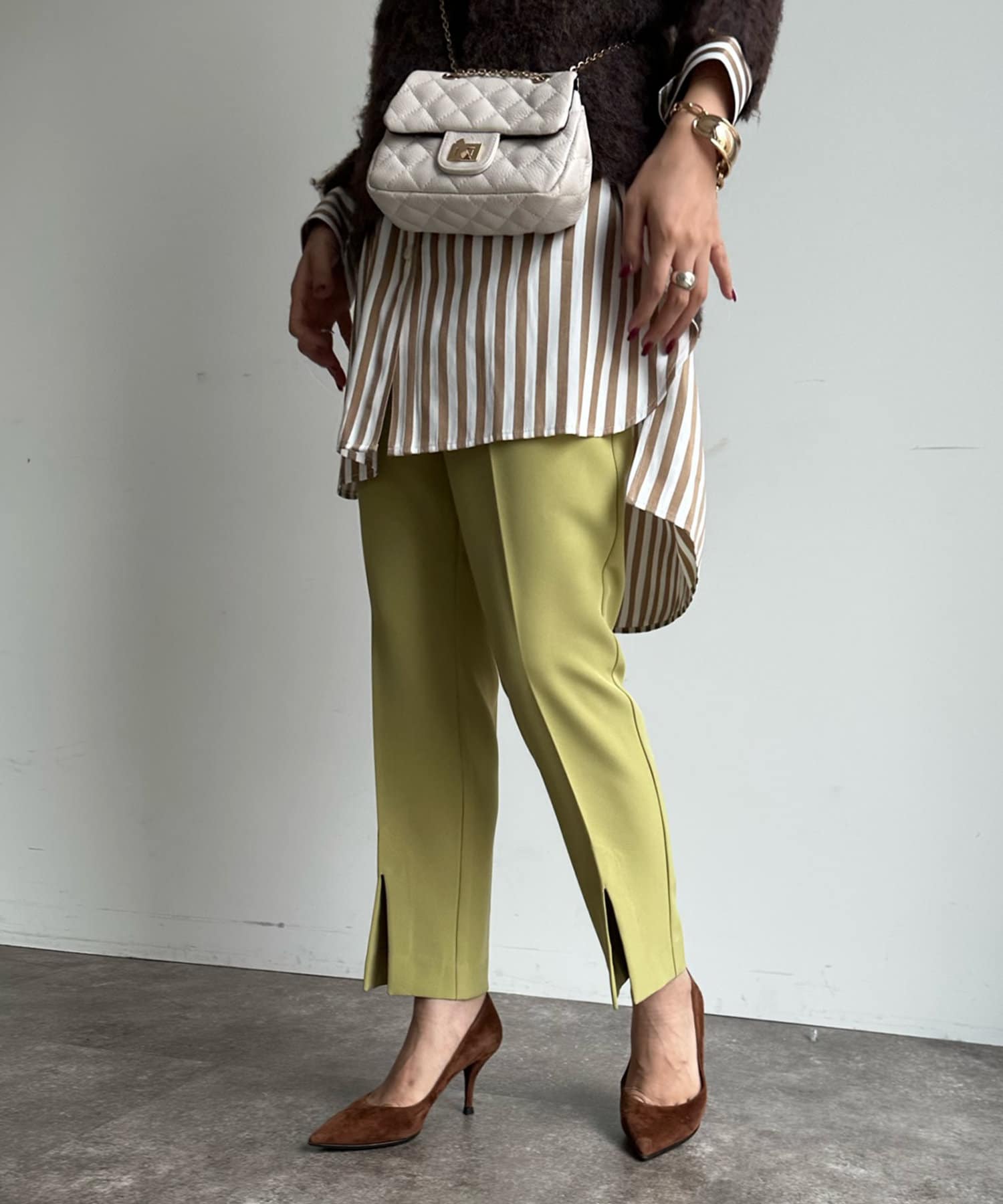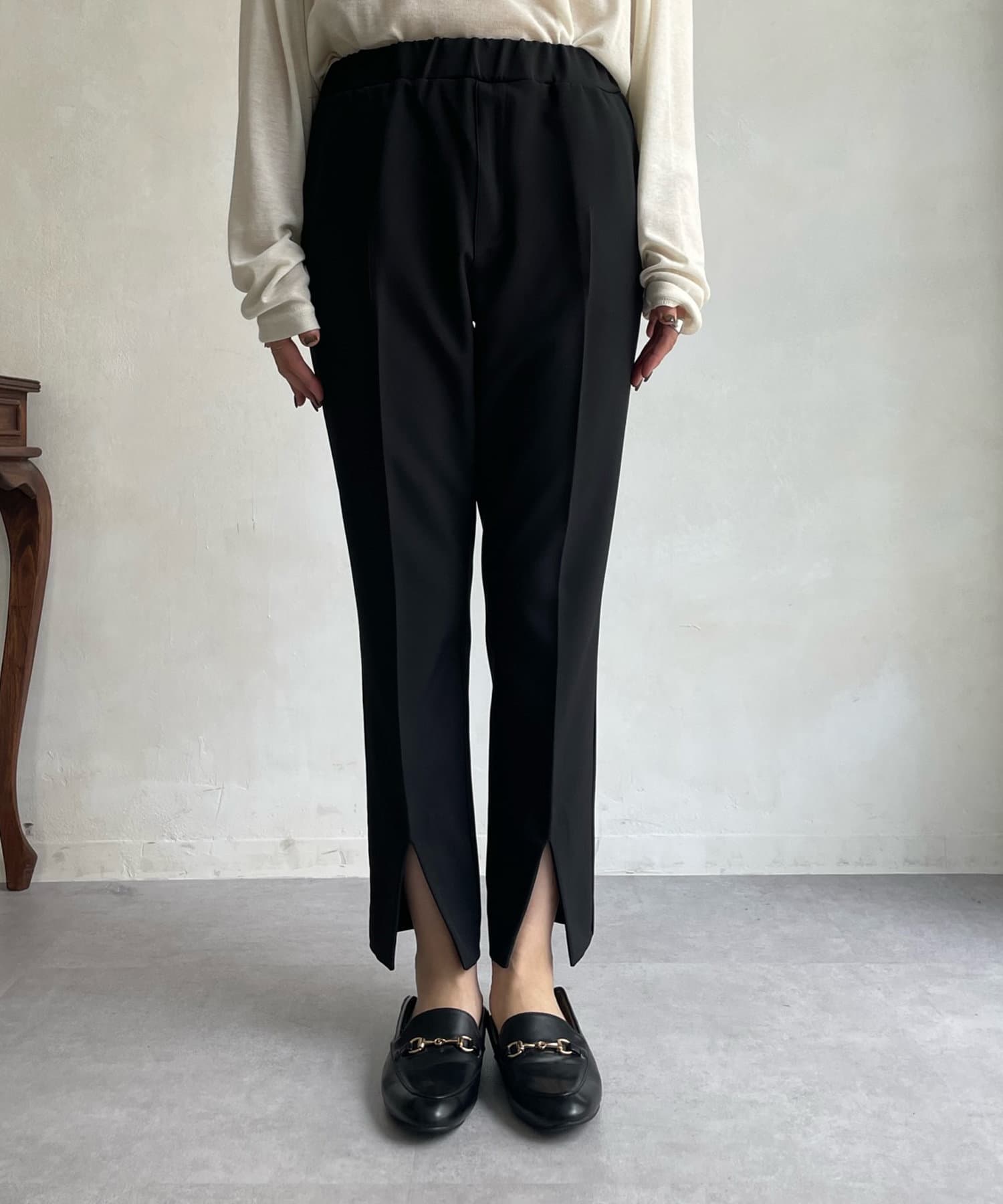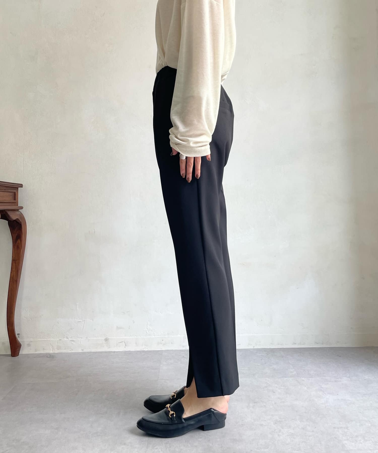 センタープレスと裾のスリットが脚のラインを強調し、足首をすっきりと見せてくれるパンツ。