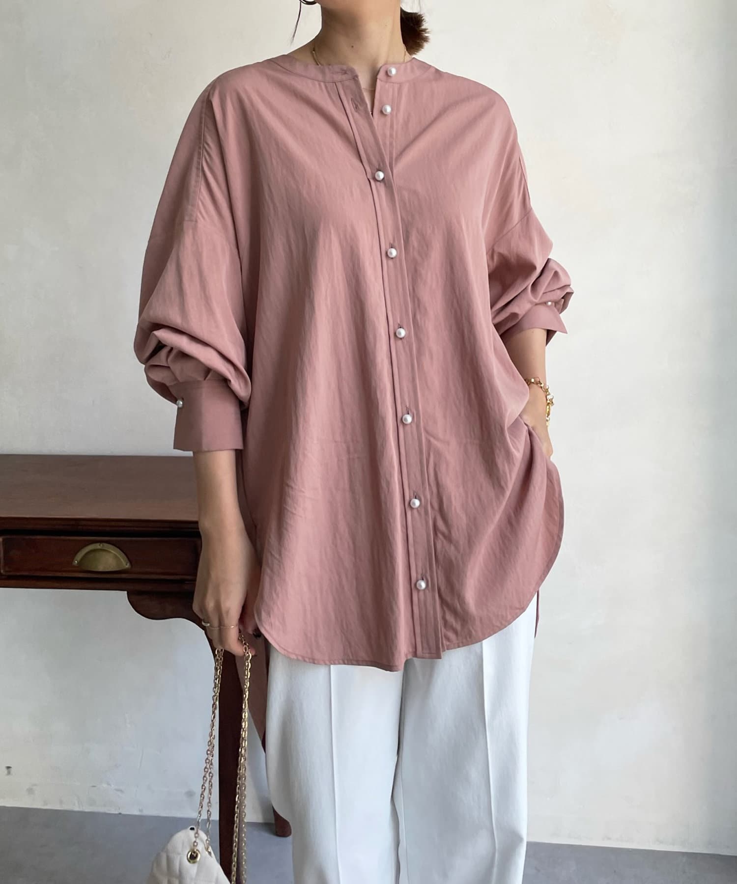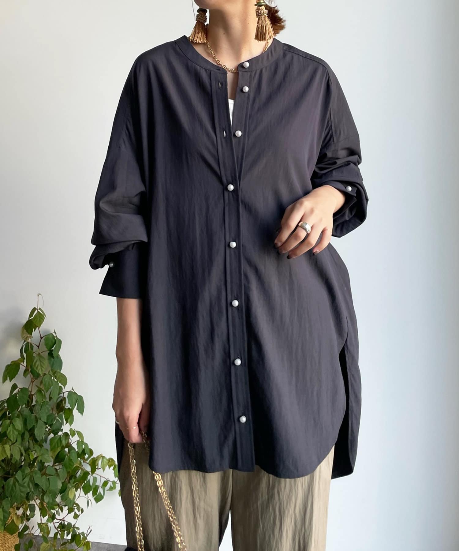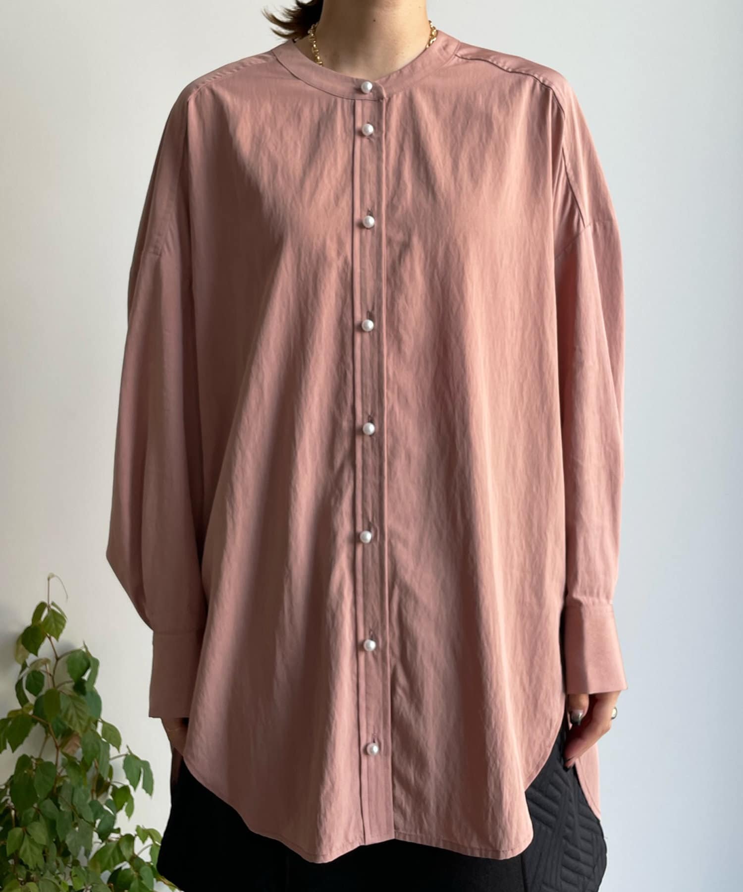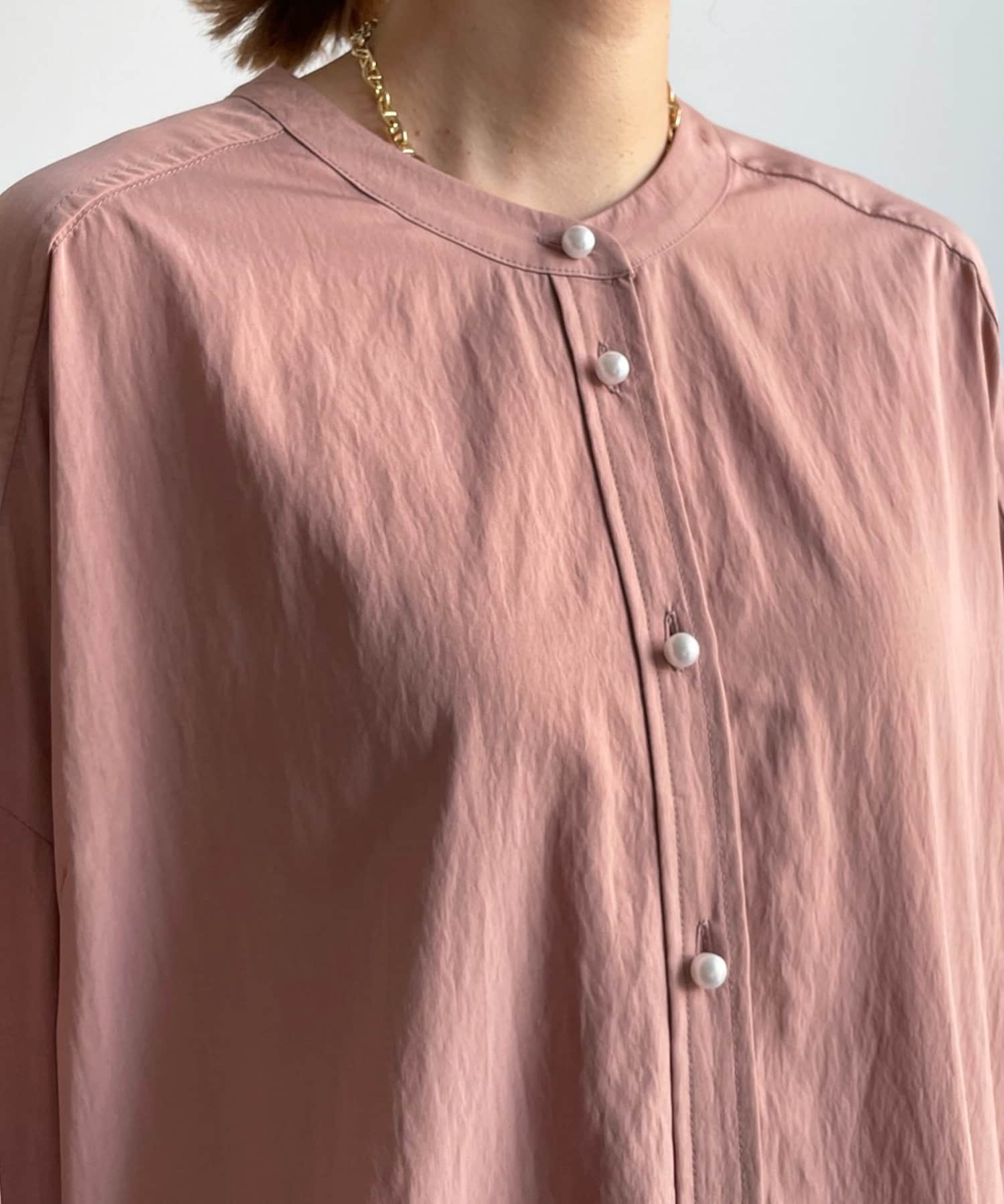親しみやすいワイドシルエットのノーカラーシャツに、程よくフェミニンな印象を与えるパールボタンをプラス。
