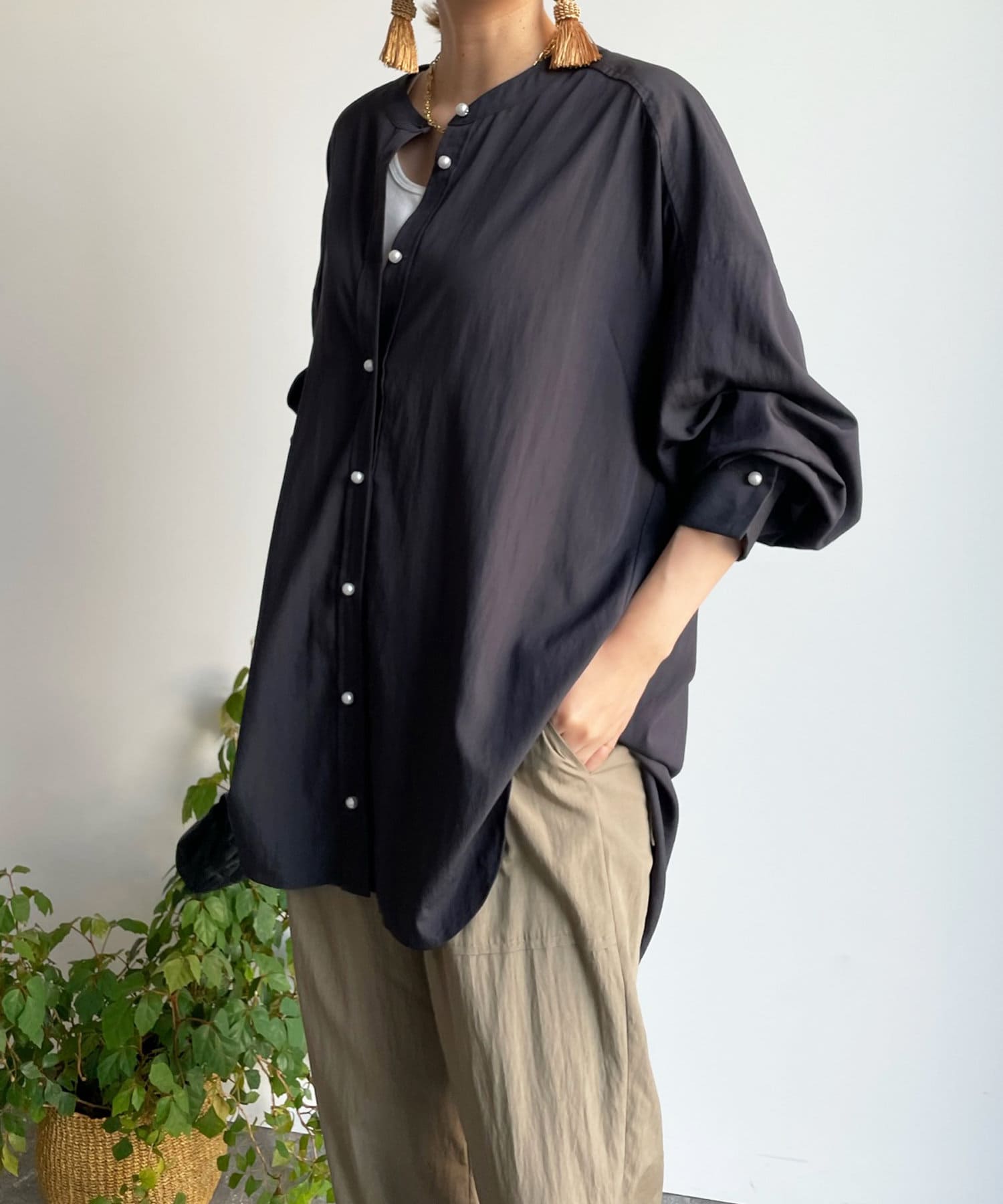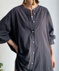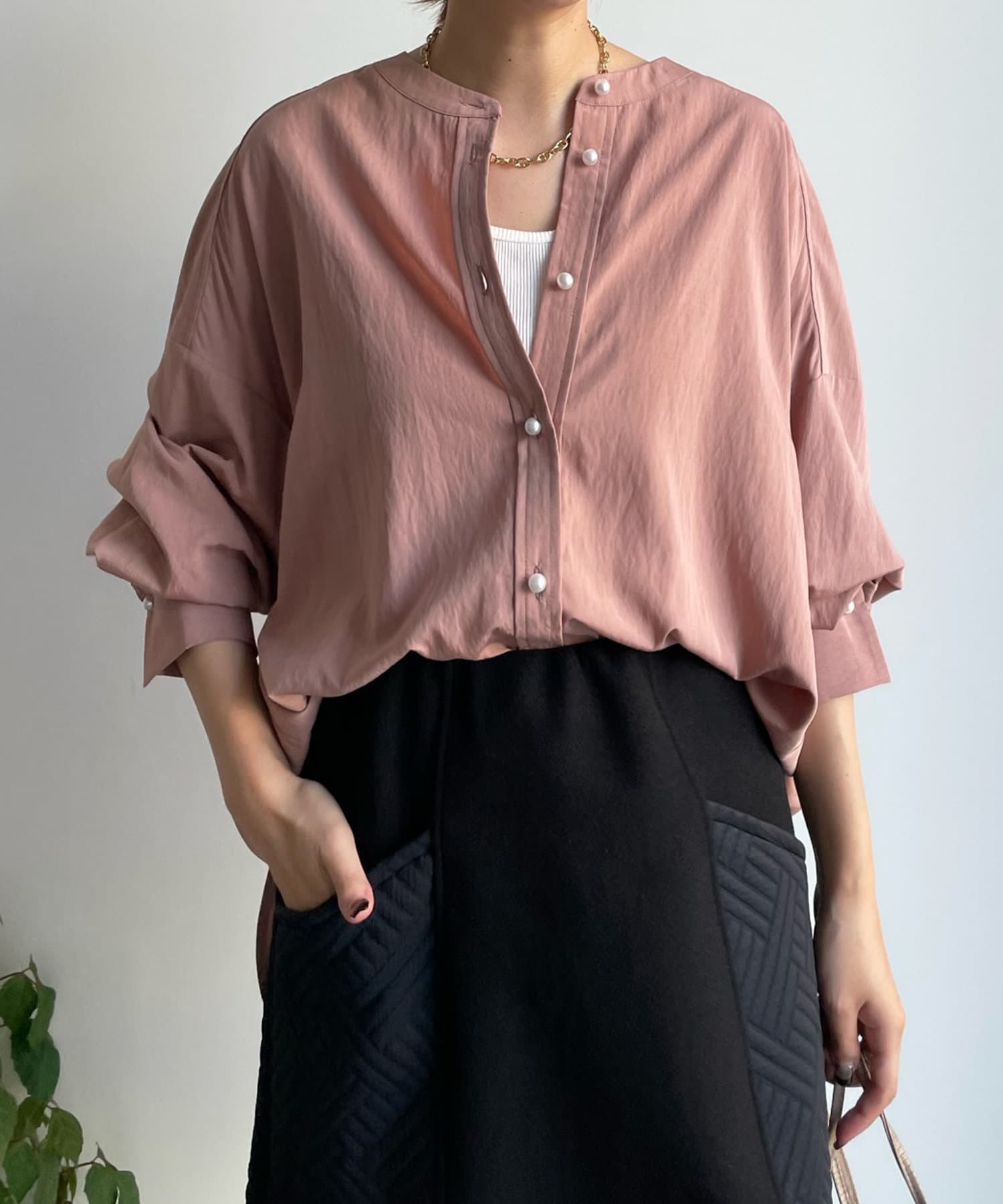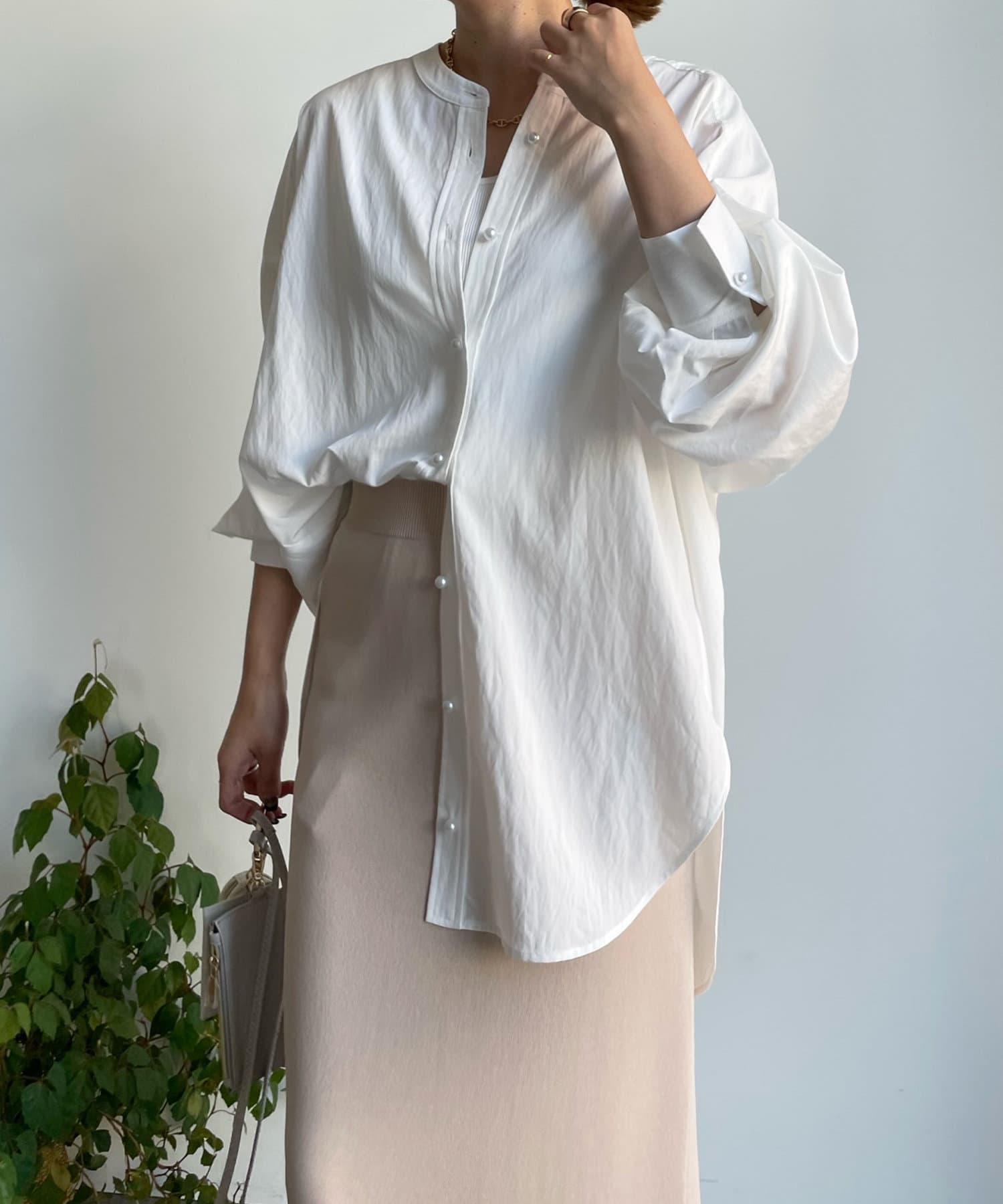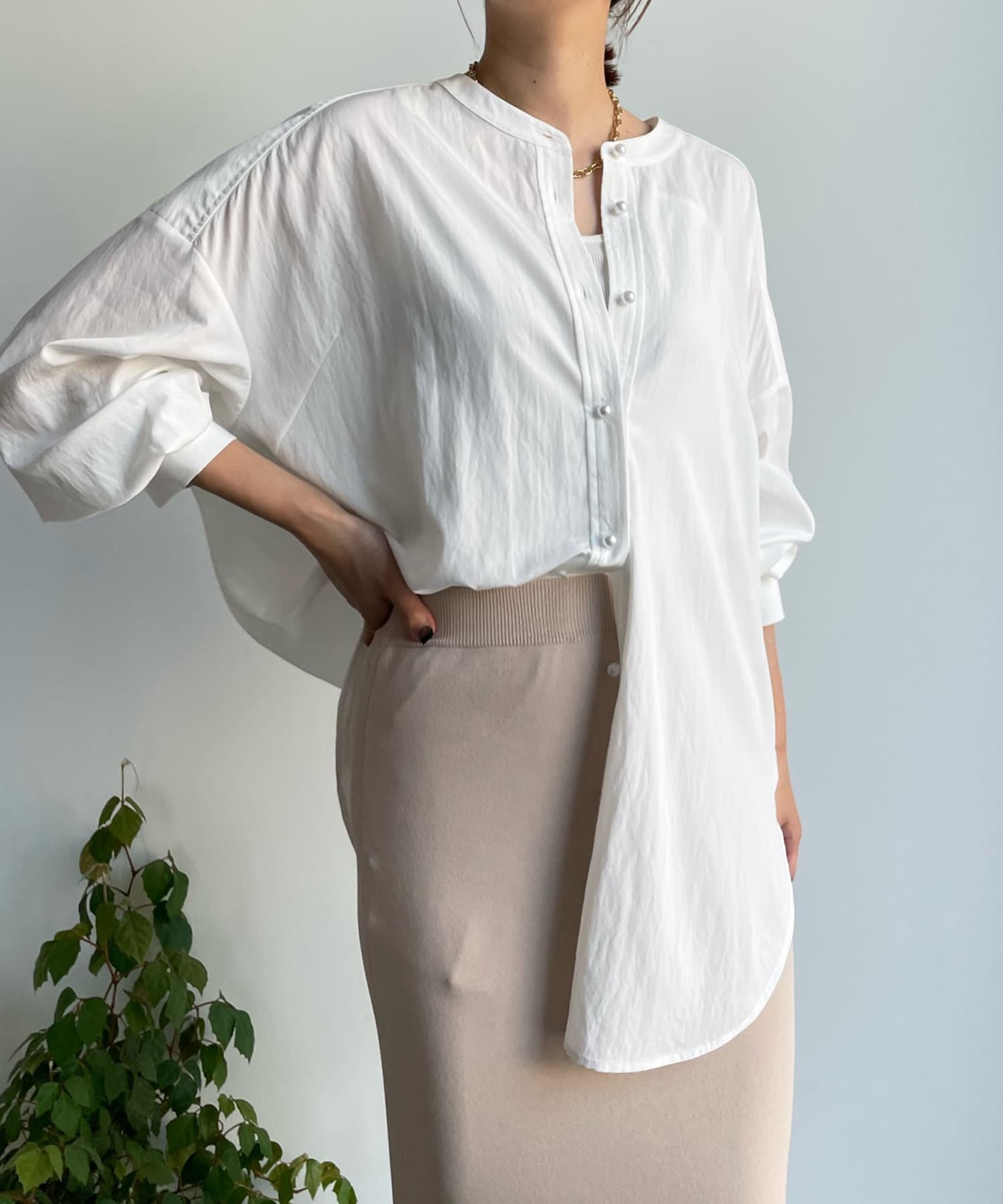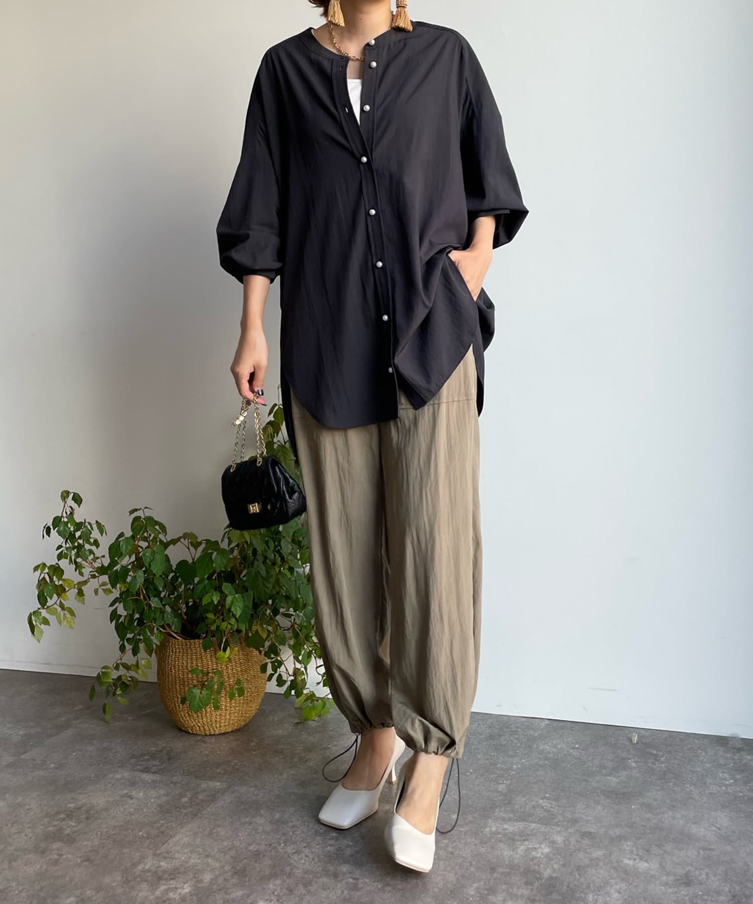 親しみやすいワイドシルエットのノーカラーシャツに、程よくフェミニンな印象を与えるパールボタンをプラス。