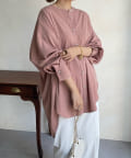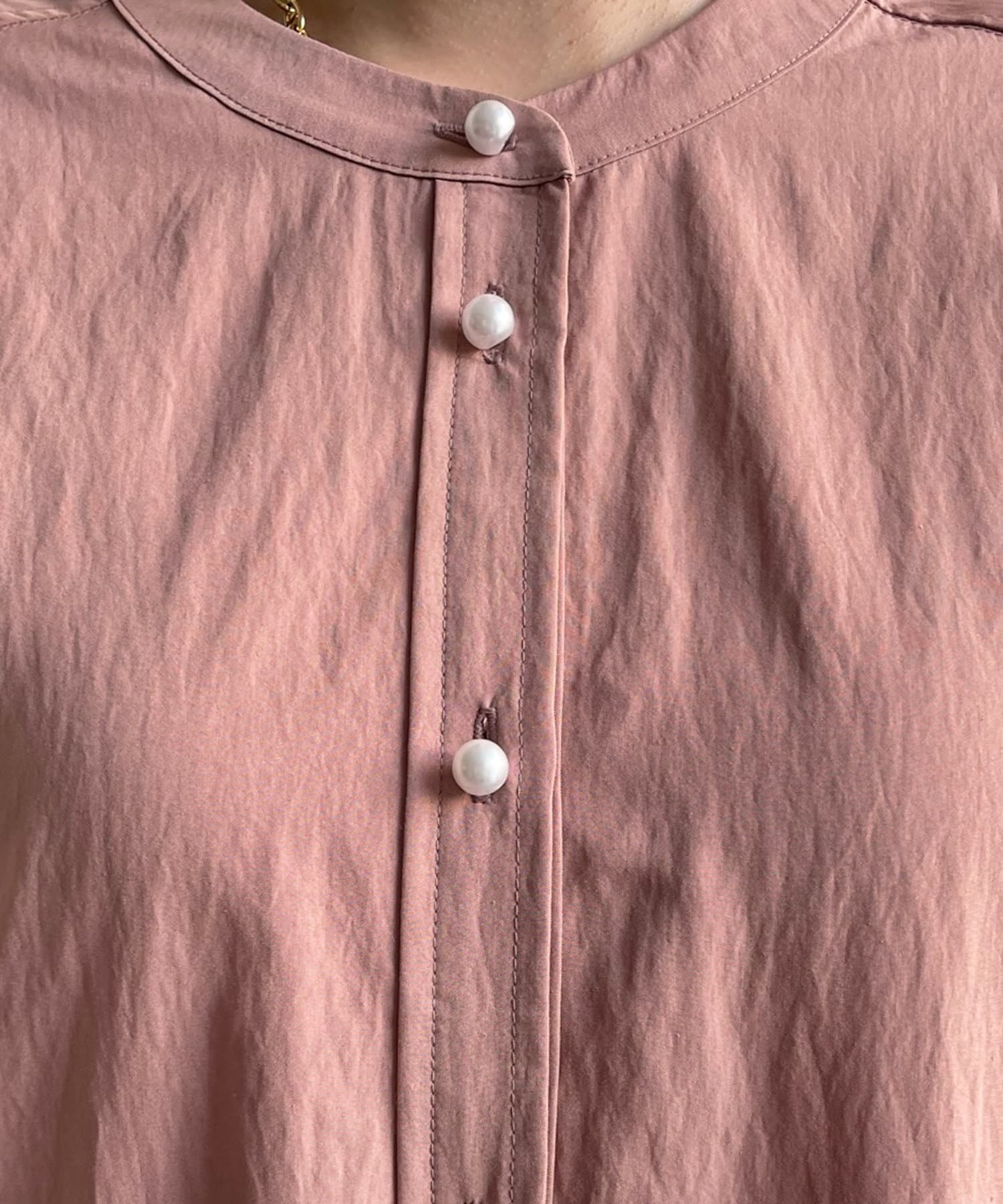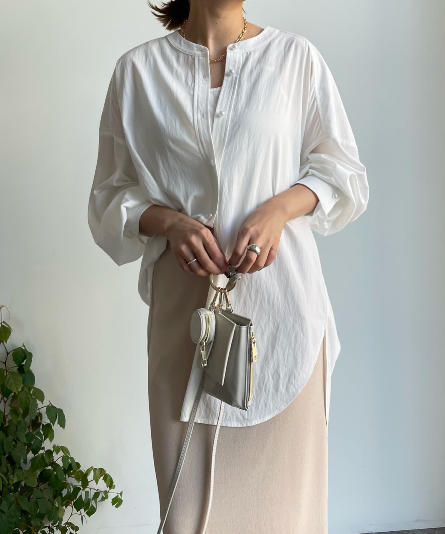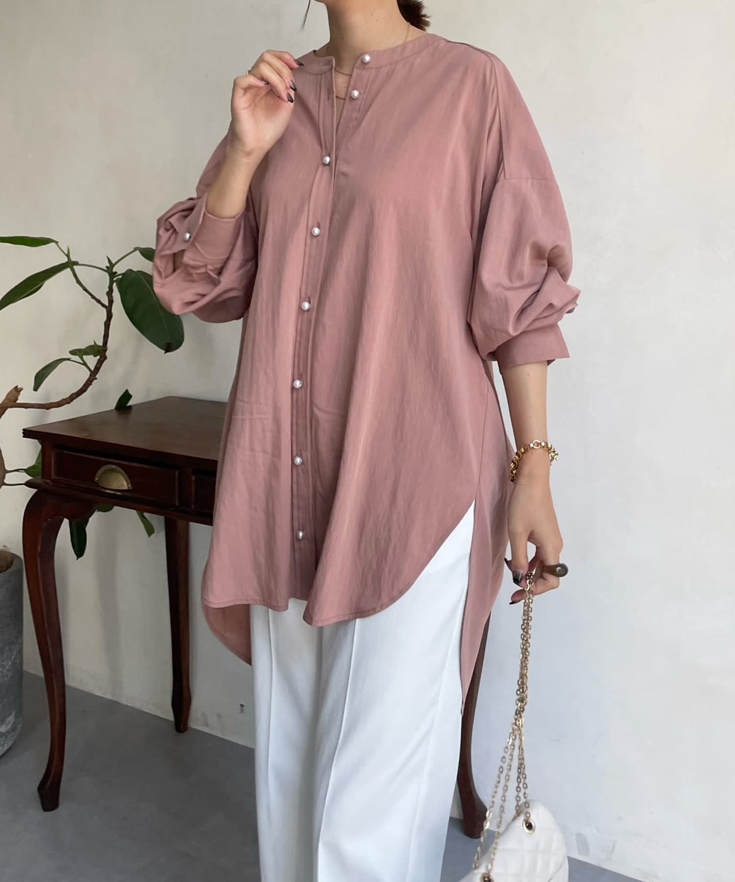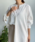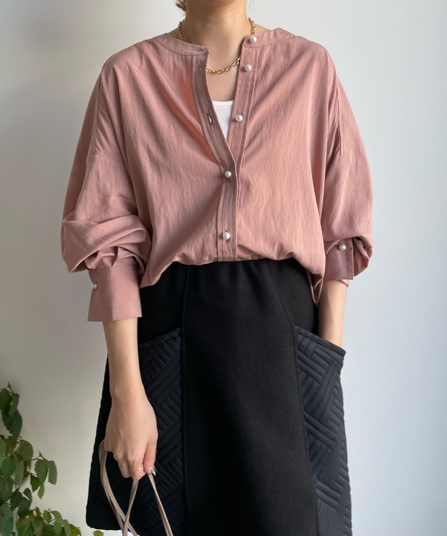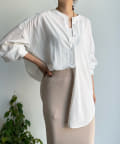 親しみやすいワイドシルエットのノーカラーシャツに、程よくフェミニンな印象を与えるパールボタンをプラス。