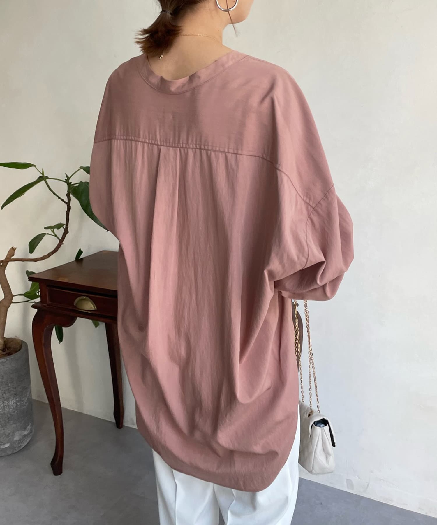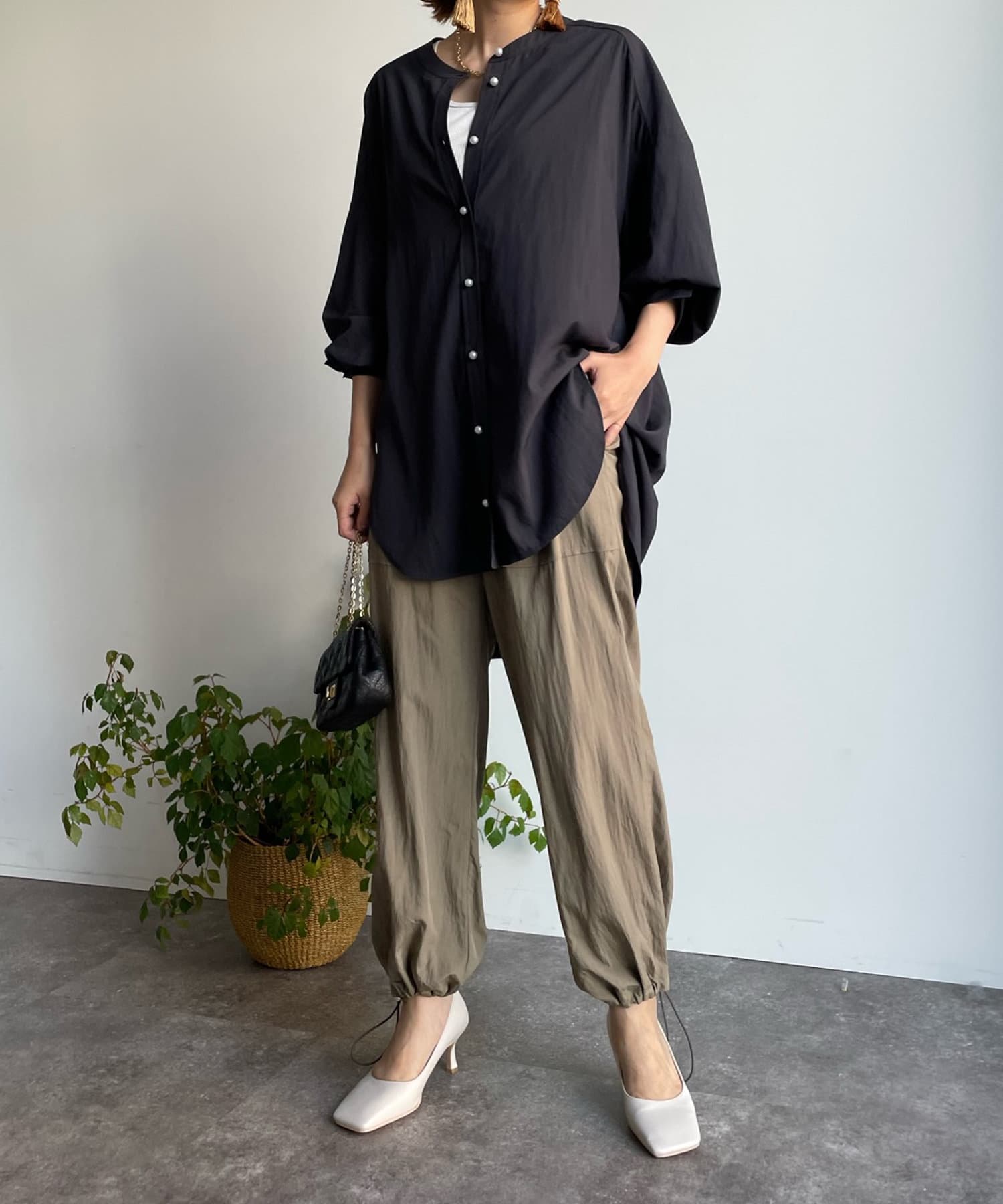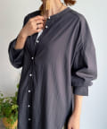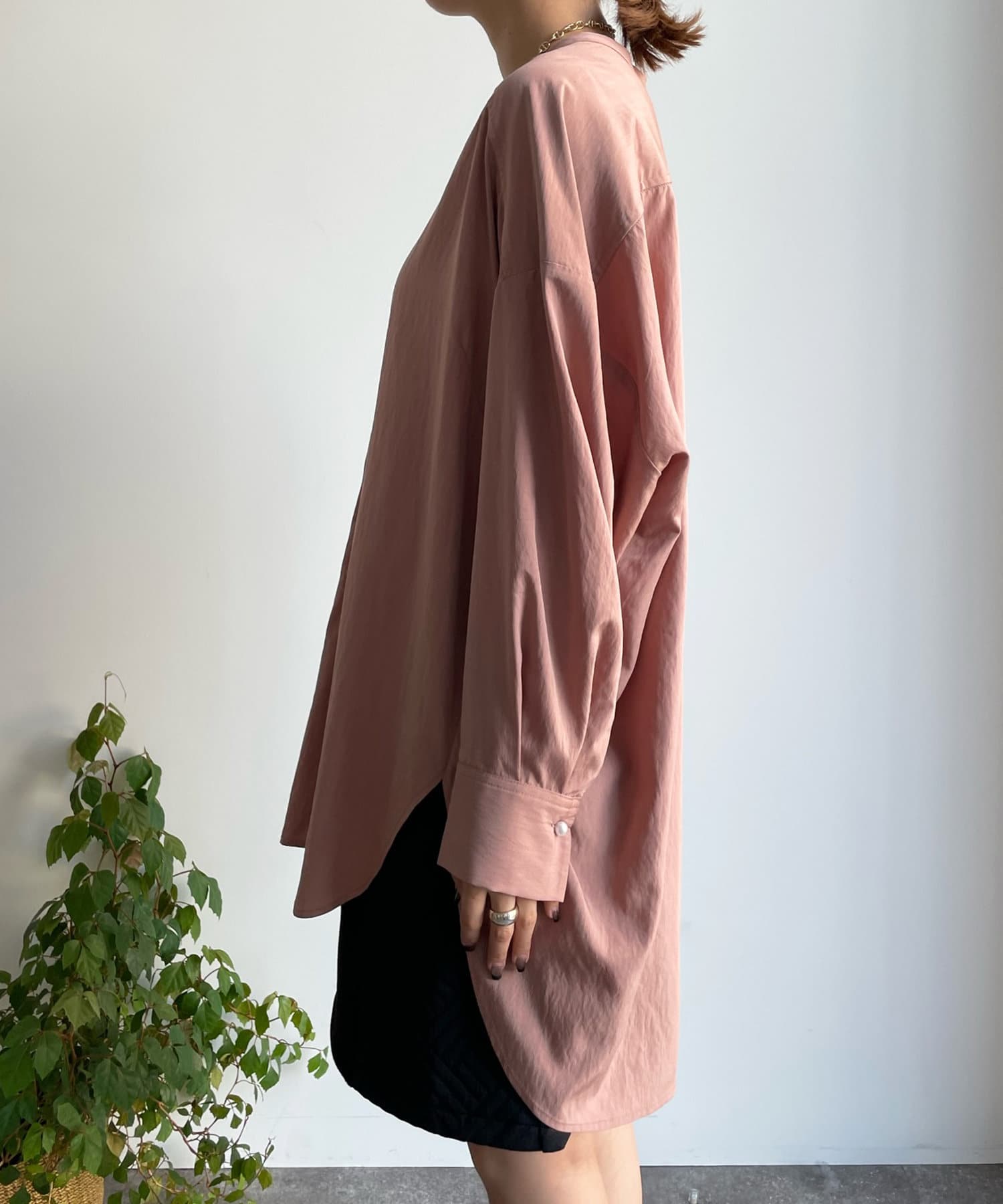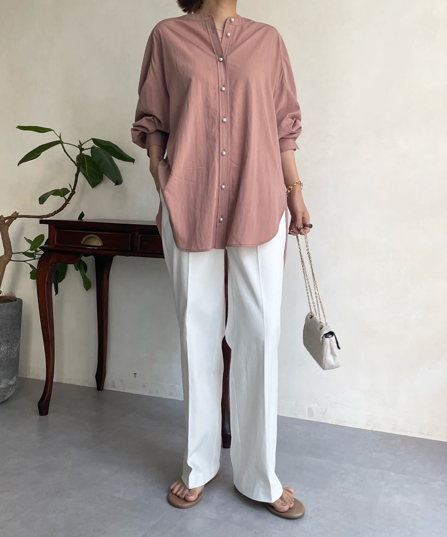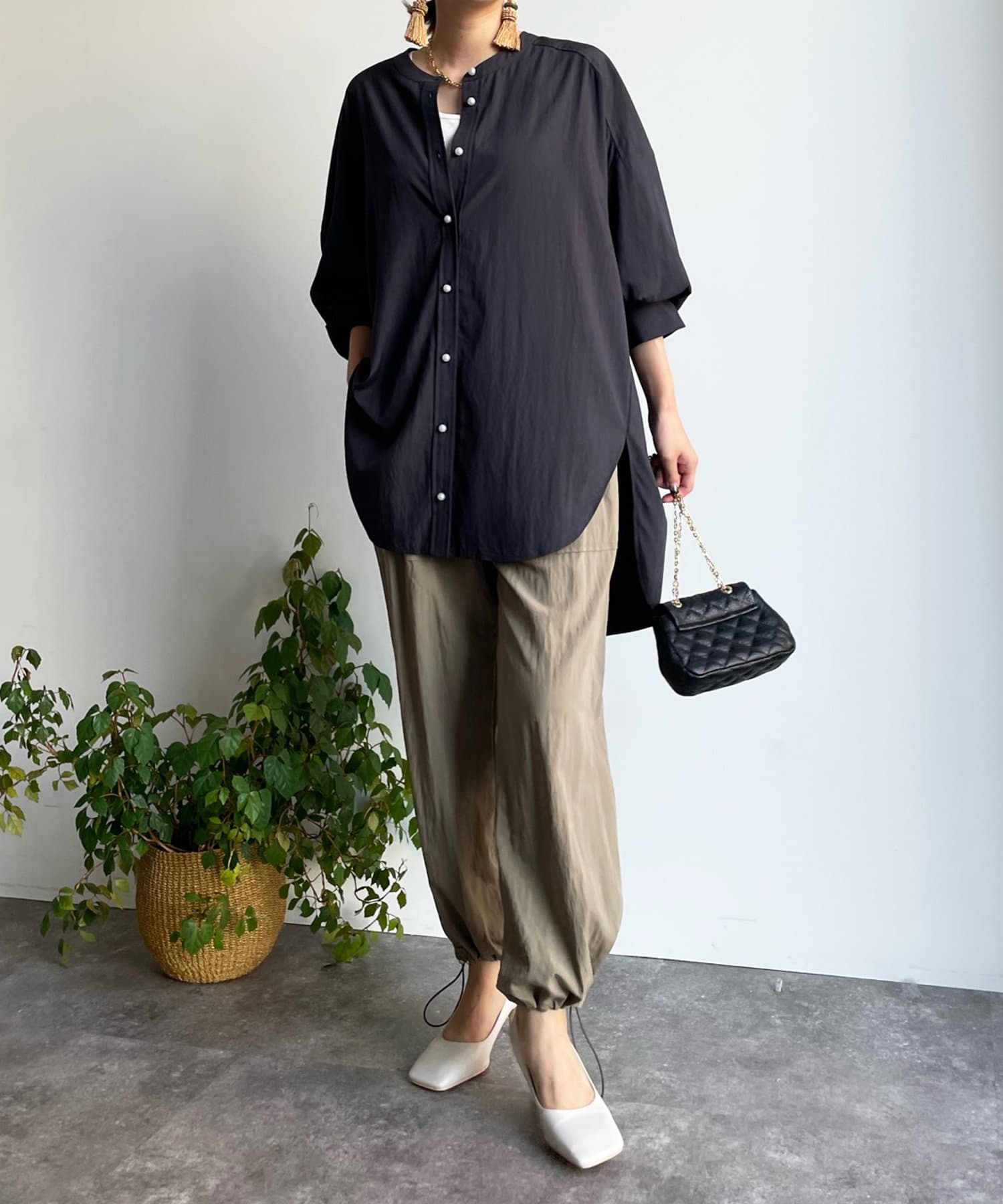 親しみやすいワイドシルエットのノーカラーシャツに、程よくフェミニンな印象を与えるパールボタンをプラス。