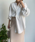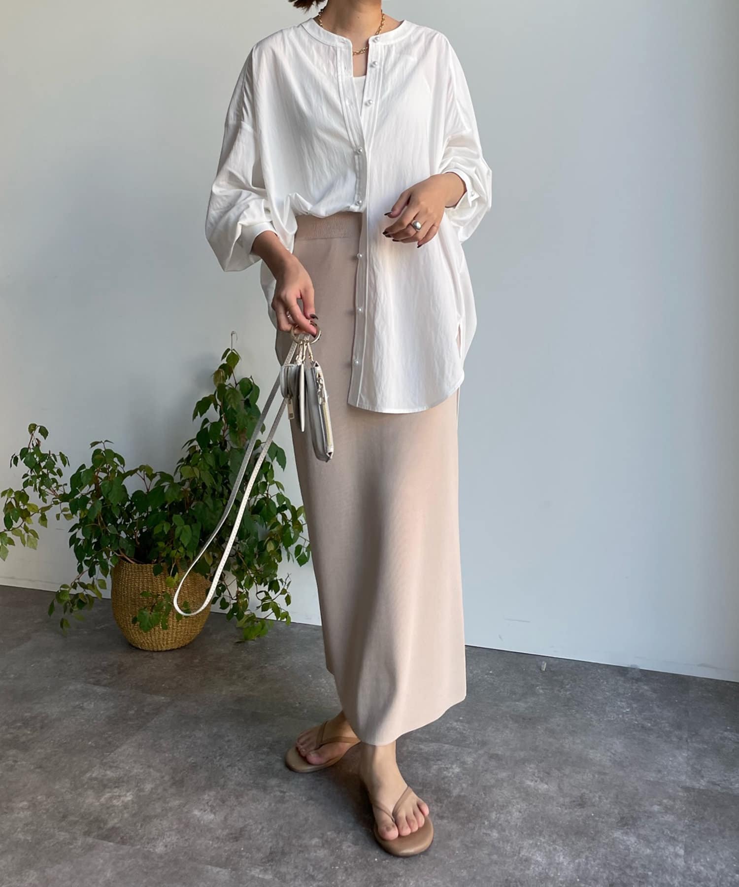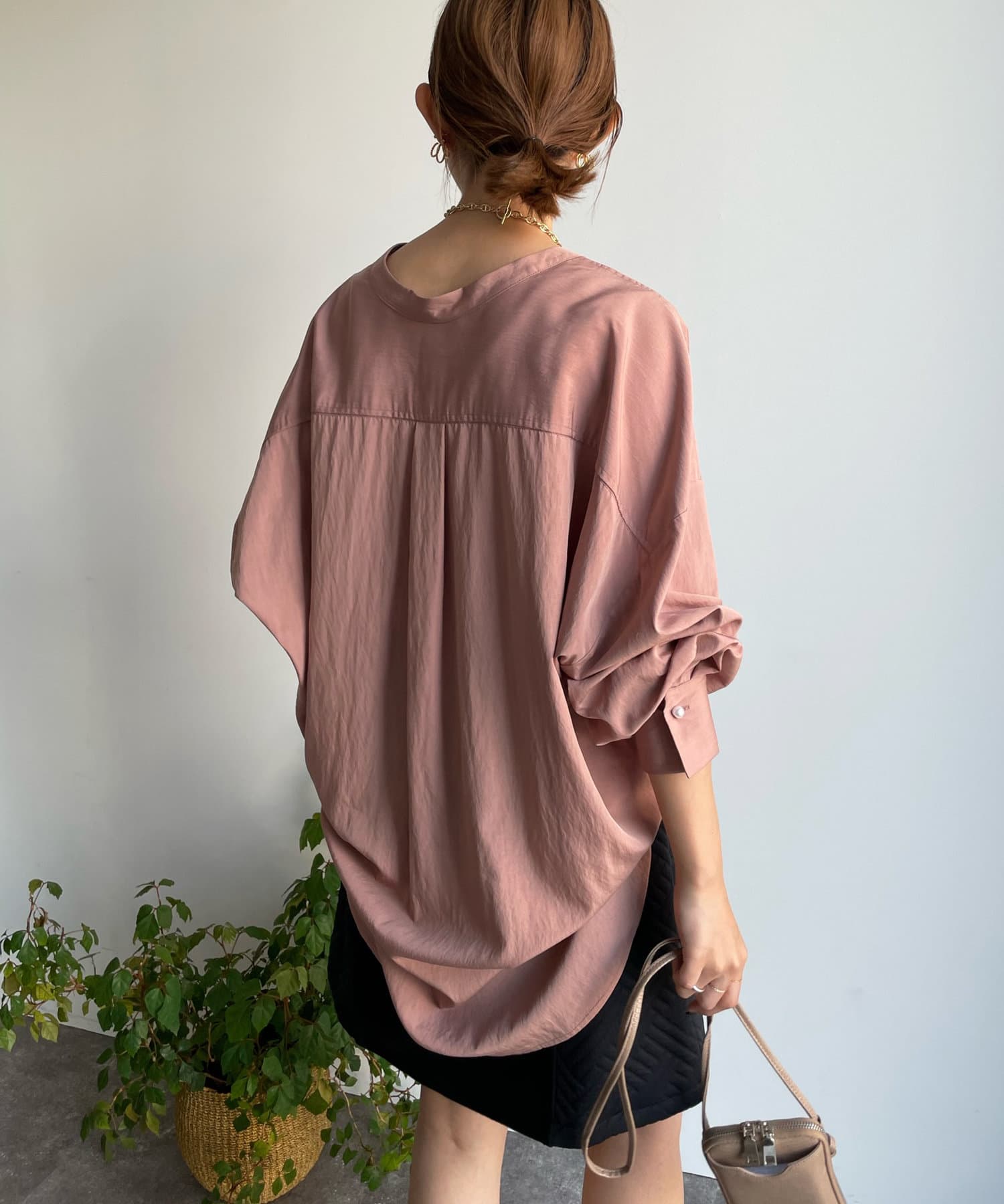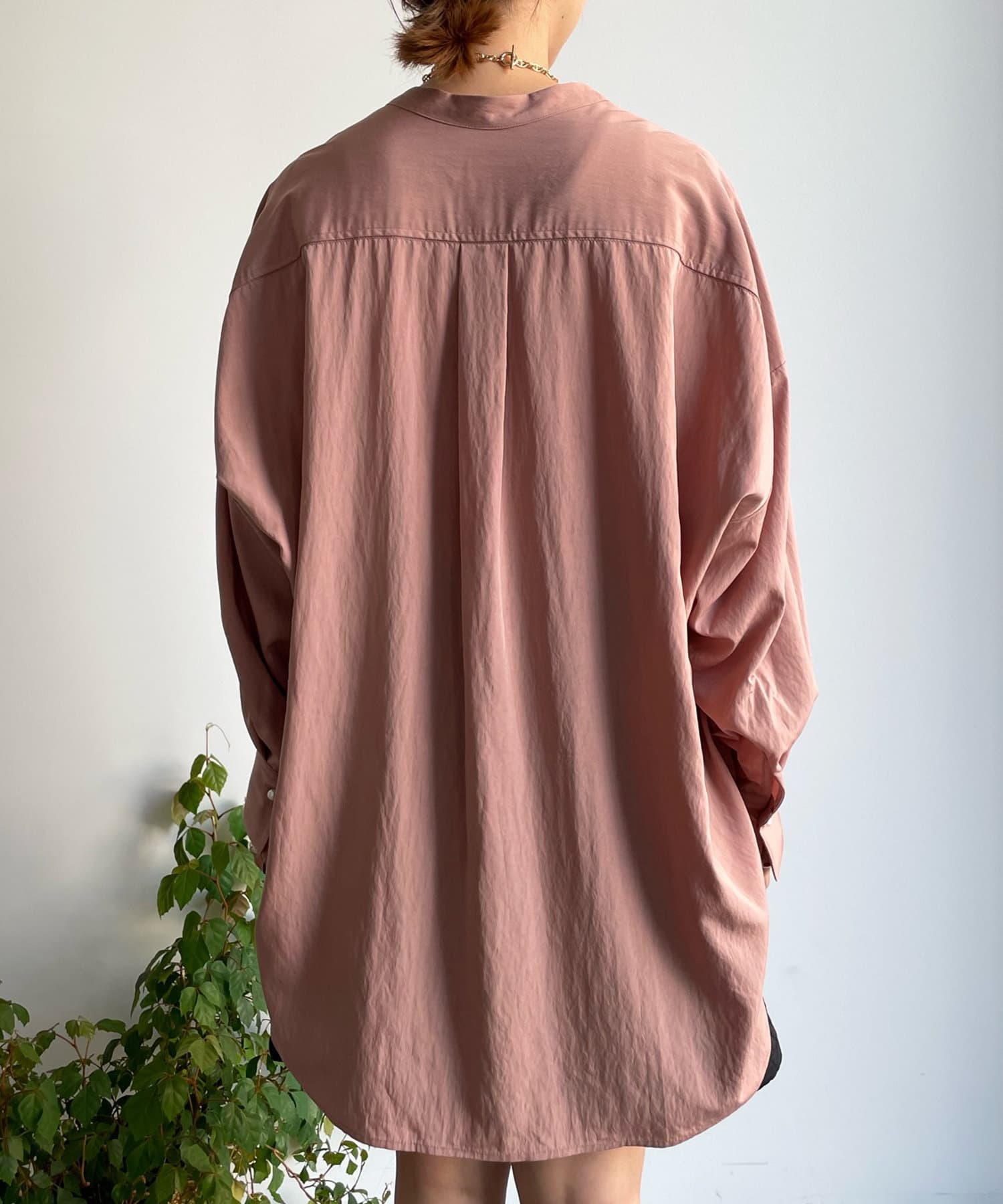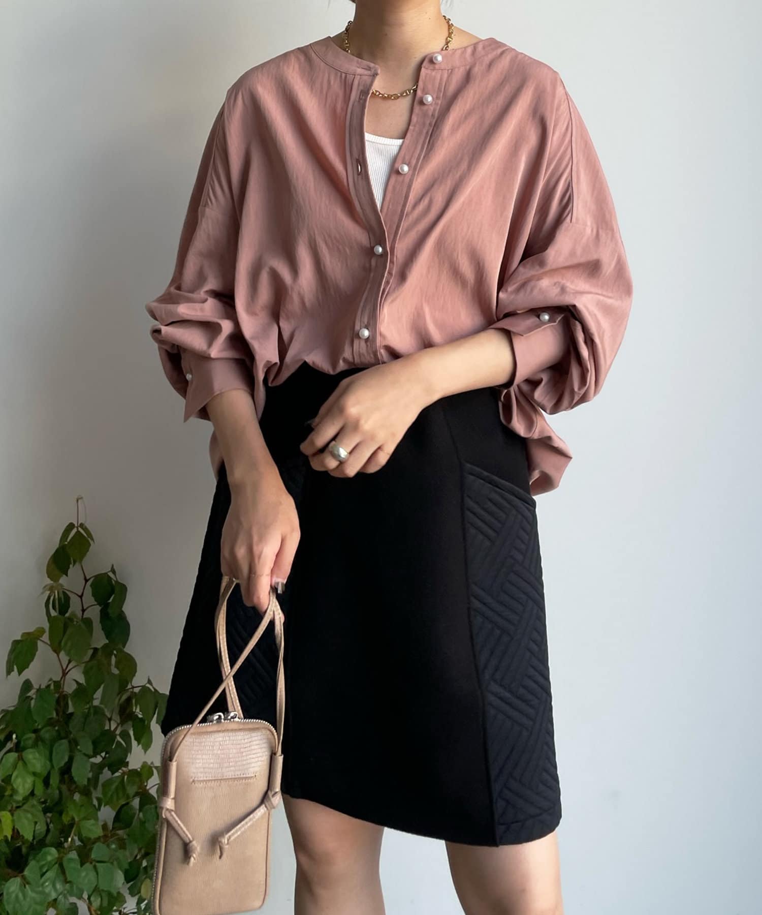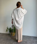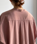 親しみやすいワイドシルエットのノーカラーシャツに、程よくフェミニンな印象を与えるパールボタンをプラス。