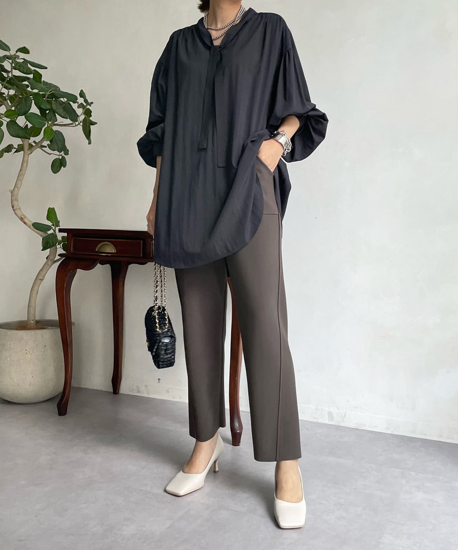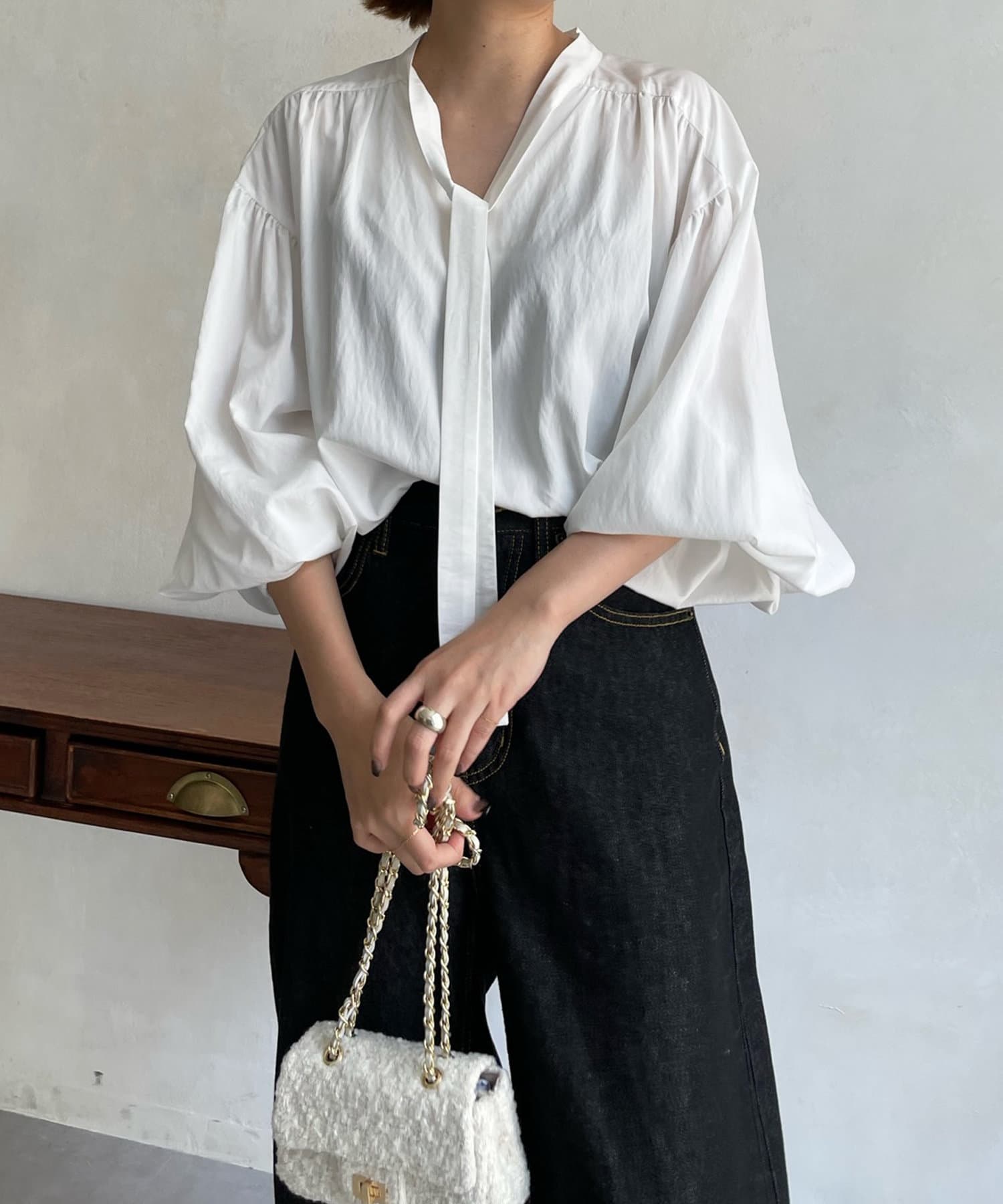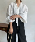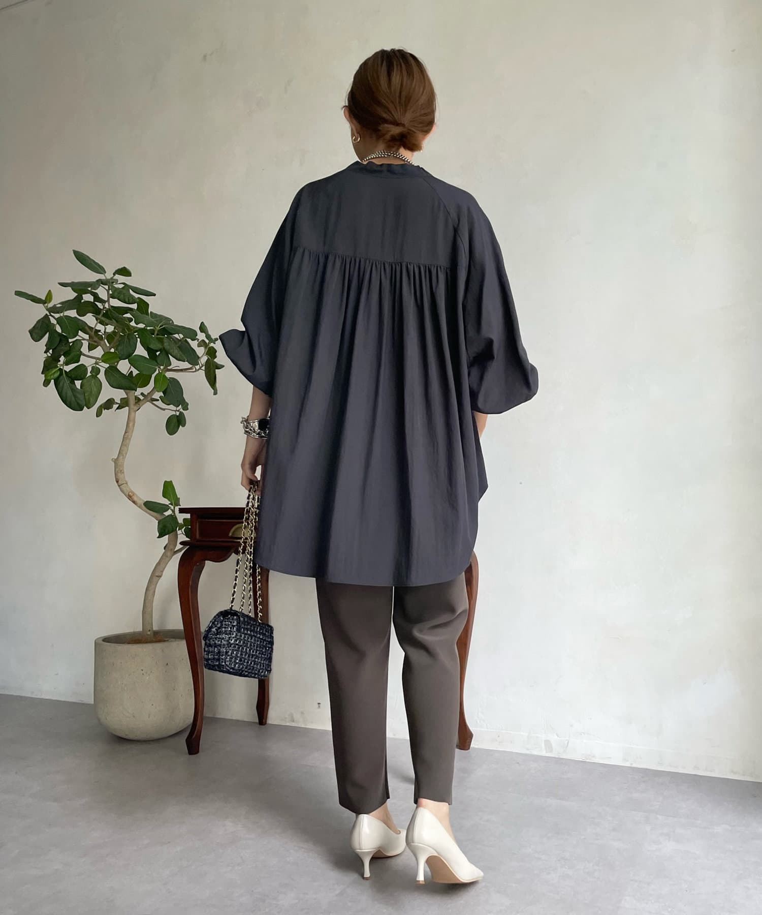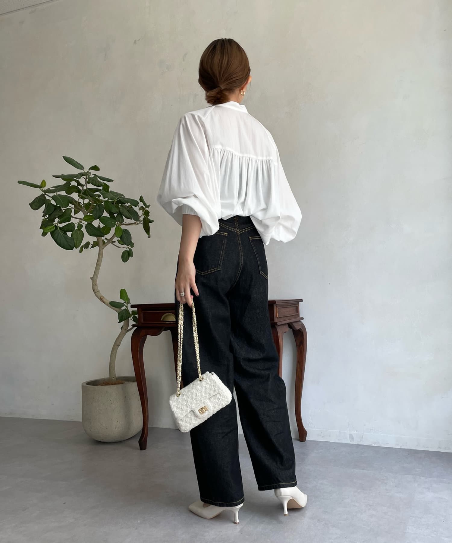 ボリューム感のあるスリーブや、ショルダー・バックのギャザーデザインなど、細かなディティールがおしゃれ感を与え、胸元はスキッパーデザインにすることで、甘くなりすぎずにすっきりとした印象をプラス。