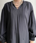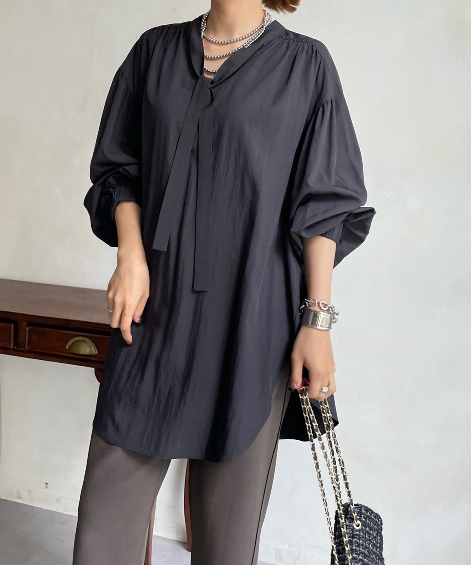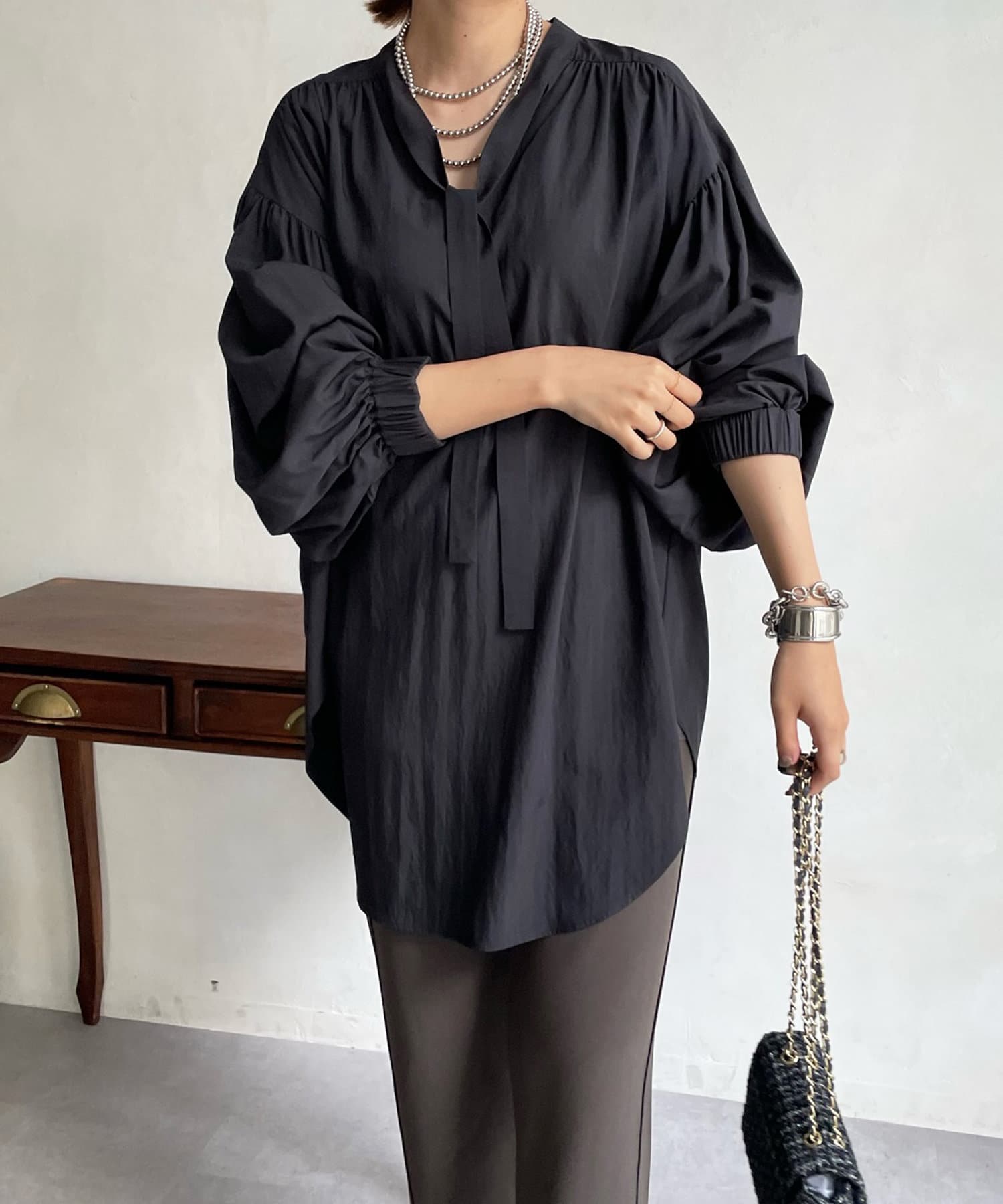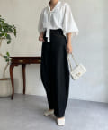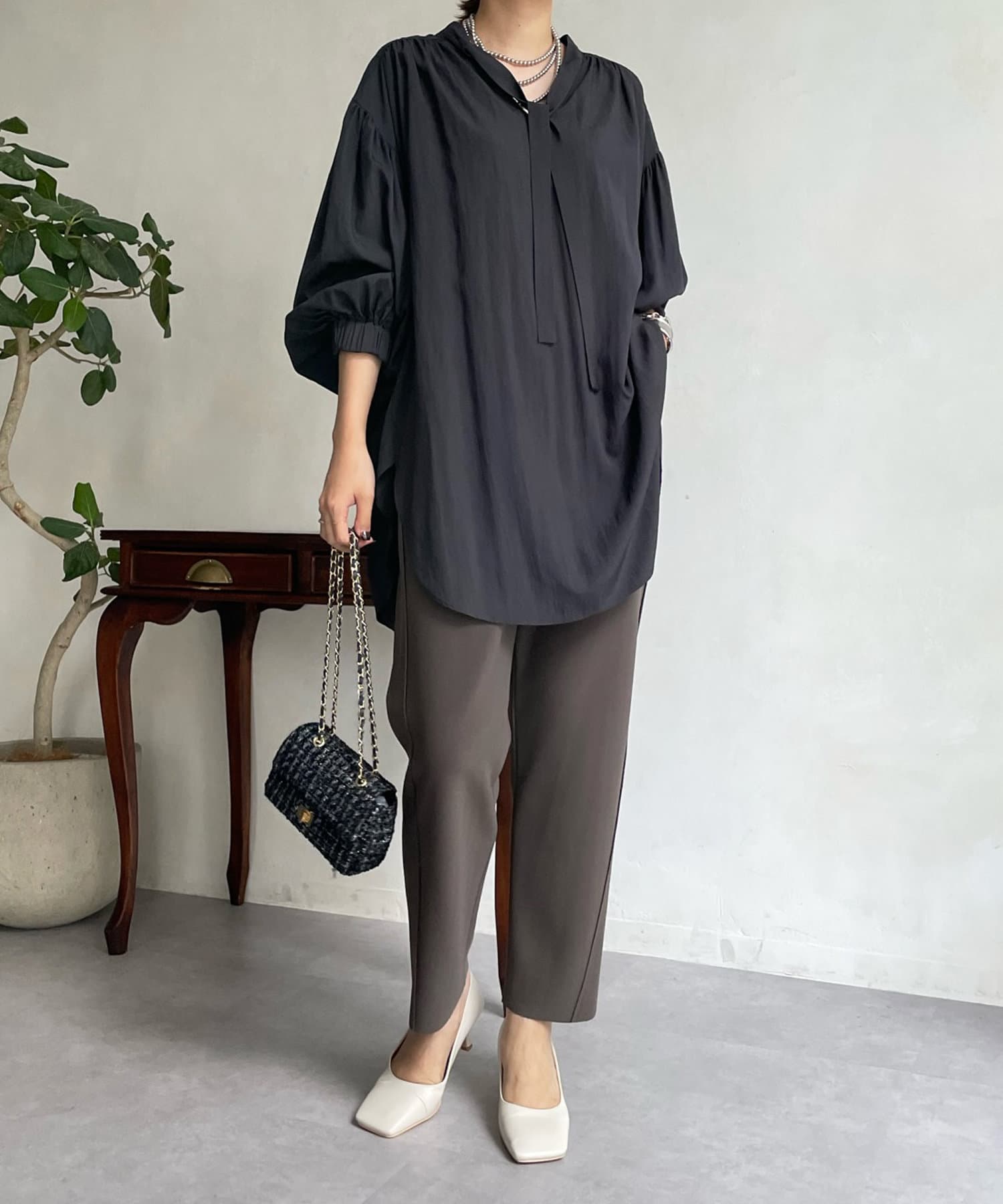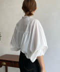 ボリューム感のあるスリーブや、ショルダー・バックのギャザーデザインなど、細かなディティールがおしゃれ感を与え、胸元はスキッパーデザインにすることで、甘くなりすぎずにすっきりとした印象をプラス。