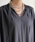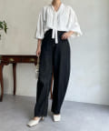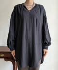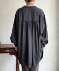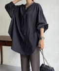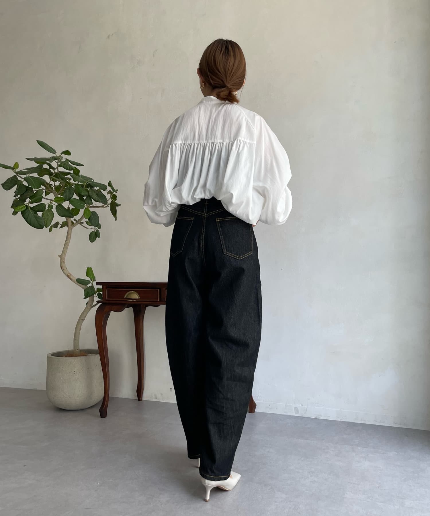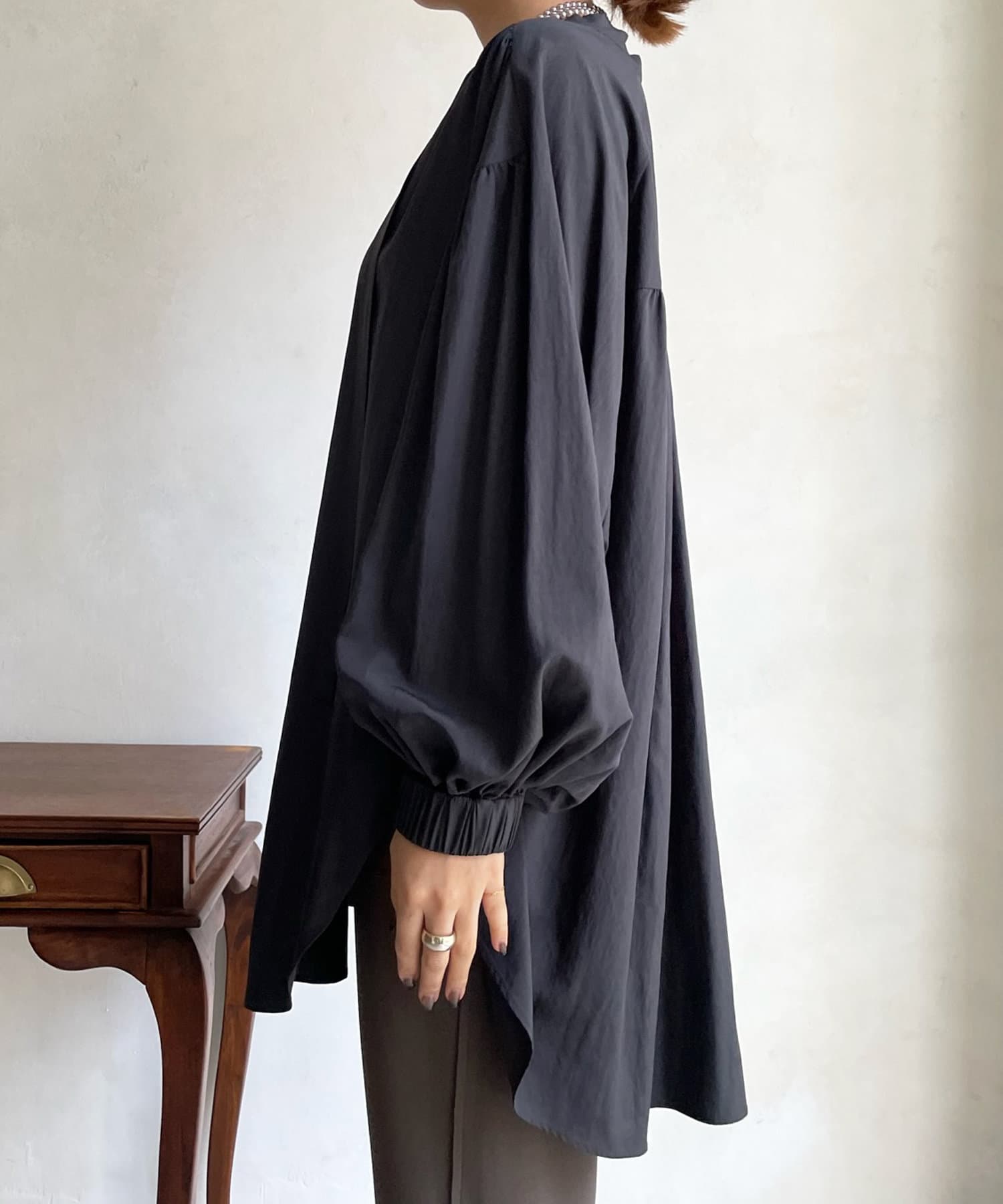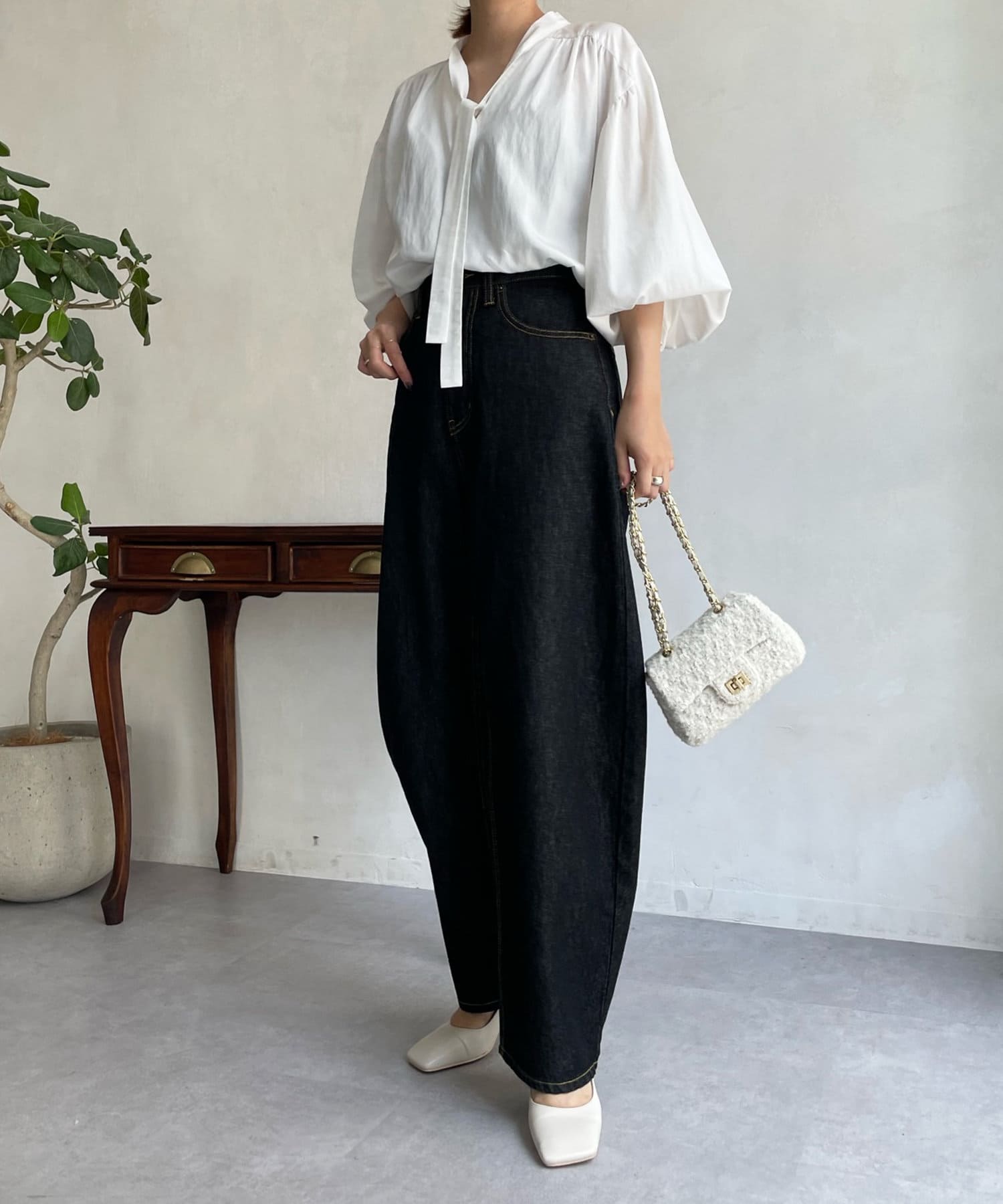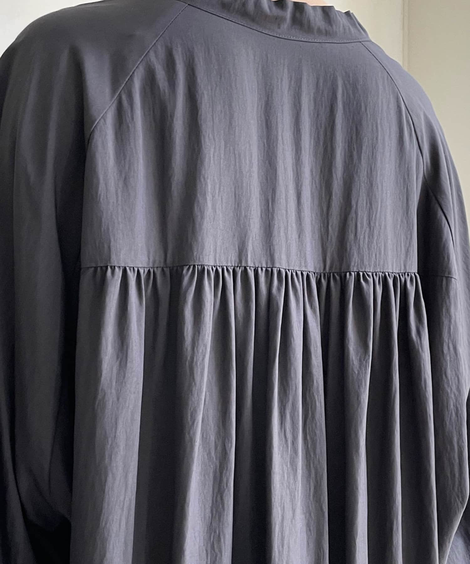 ボリューム感のあるスリーブや、ショルダー・バックのギャザーデザインなど、細かなディティールがおしゃれ感を与え、胸元はスキッパーデザインにすることで、甘くなりすぎずにすっきりとした印象をプラス。