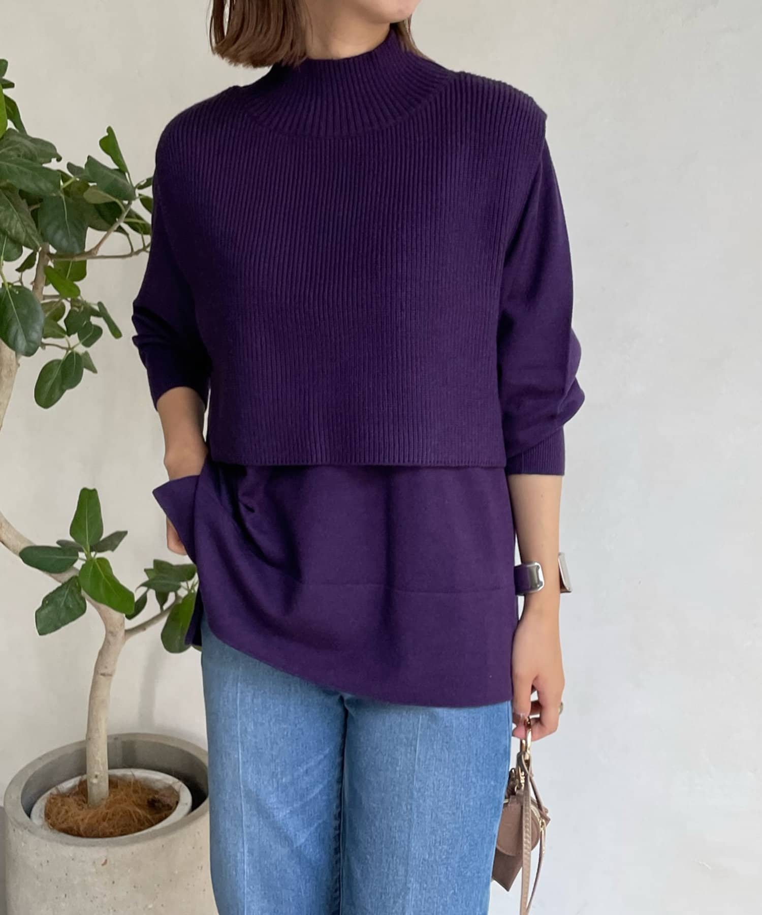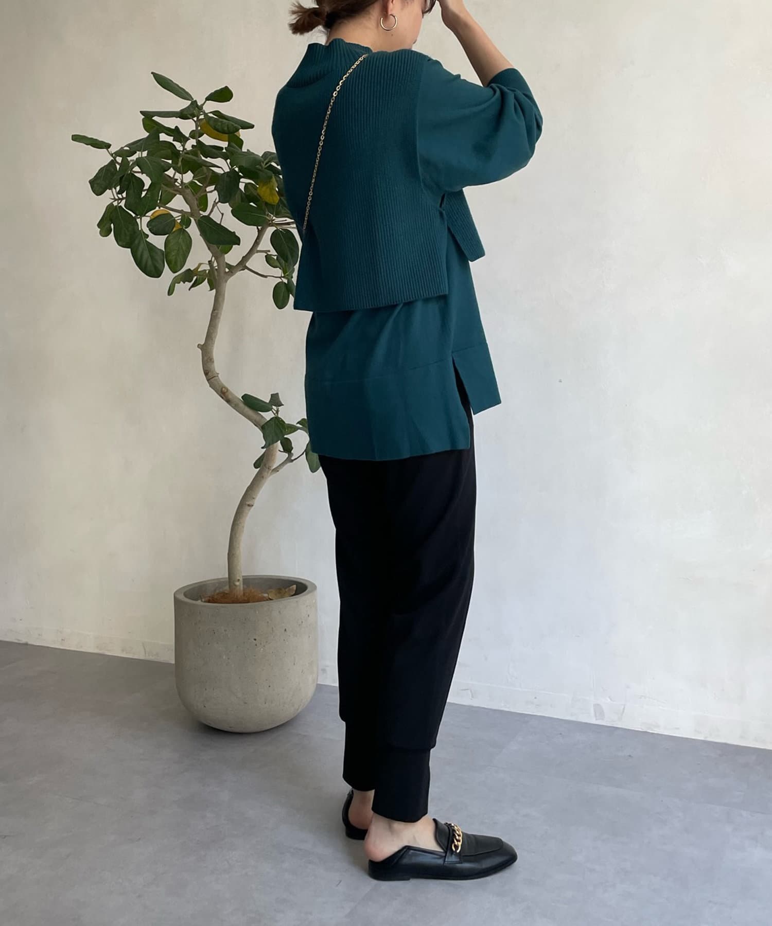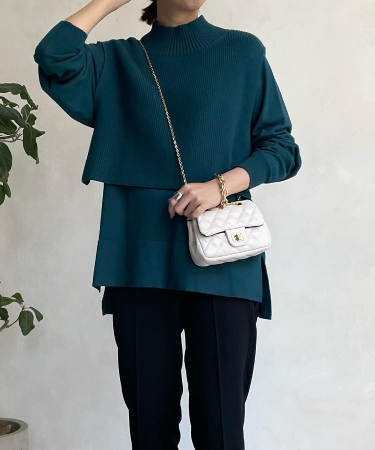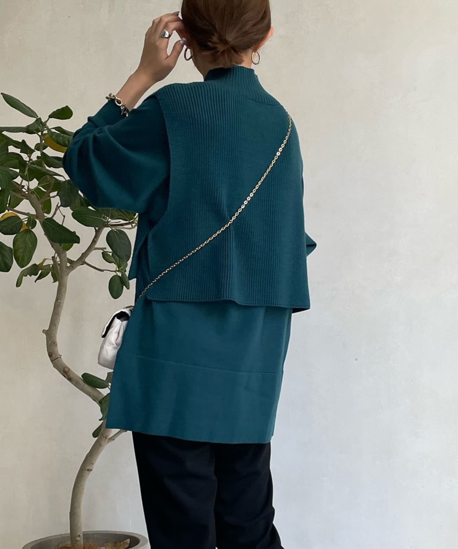 ハイゲージのシンプルニットに編地と長さの違うややハイネックのベストの組み合わせがとってもおしゃれ!