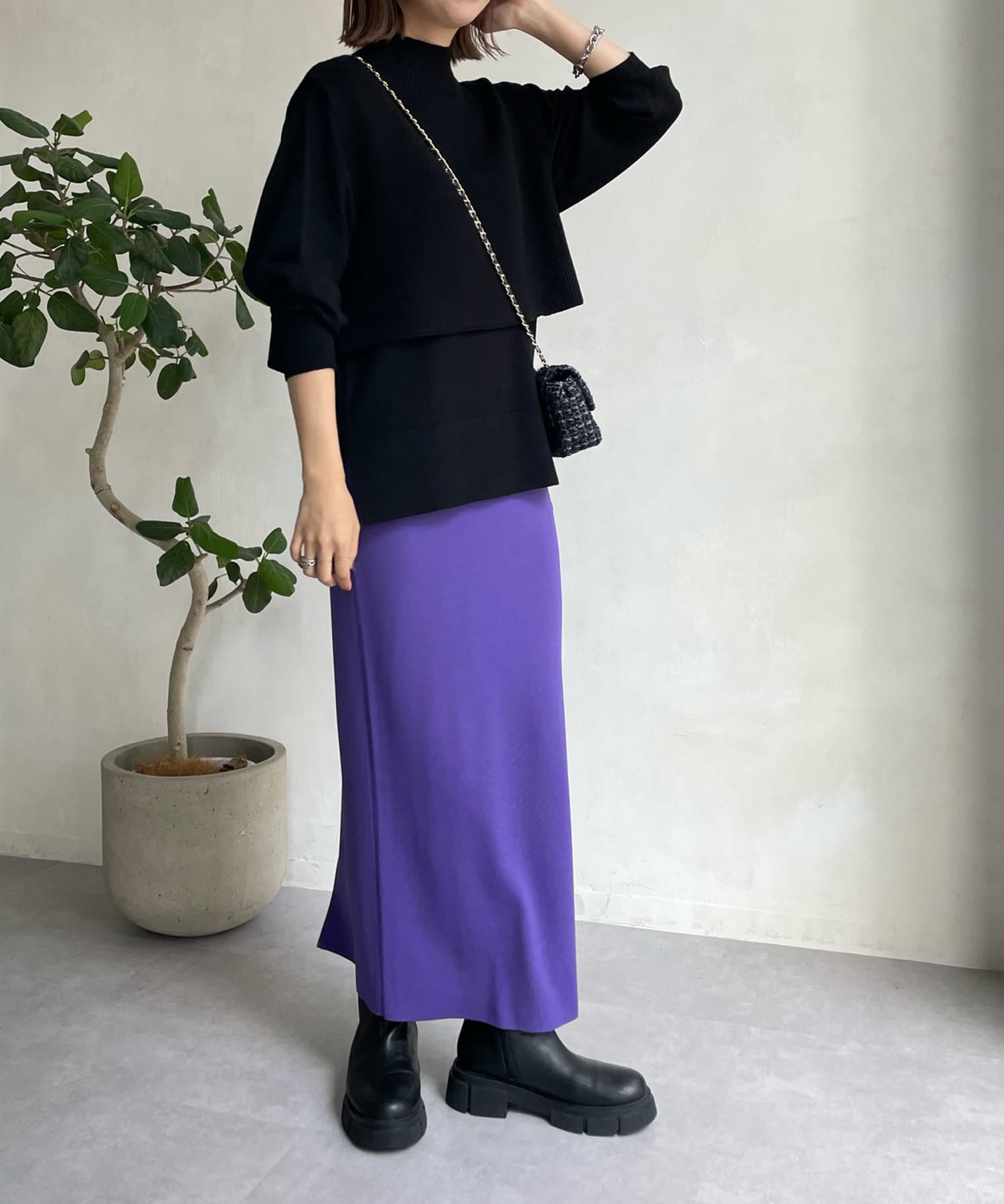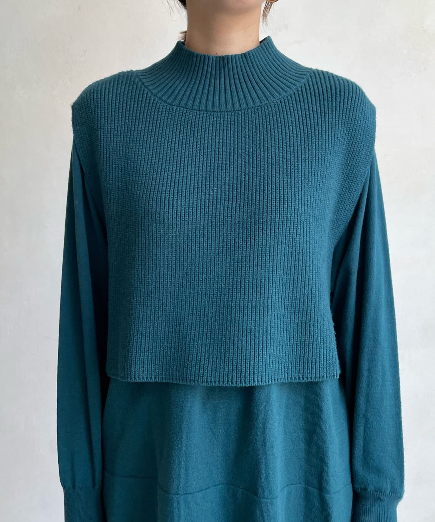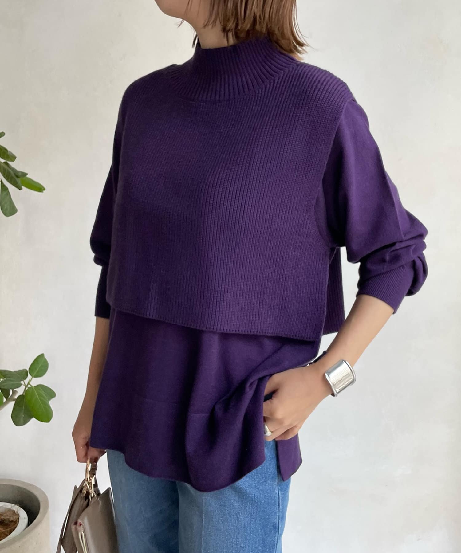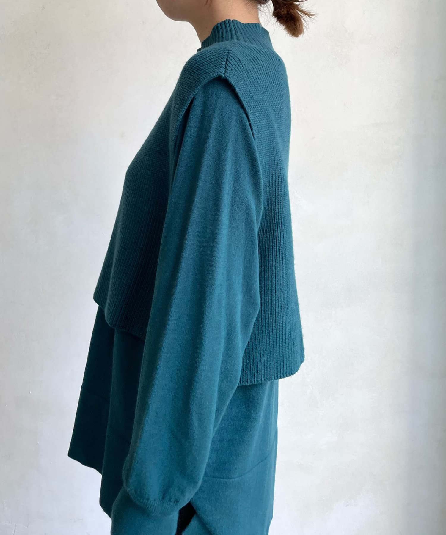 ハイゲージのシンプルニットに編地と長さの違うややハイネックのベストの組み合わせがとってもおしゃれ!